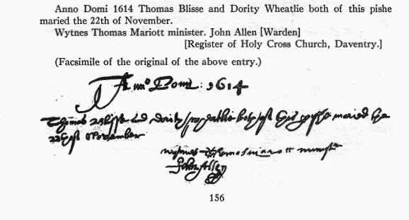 Church in Daventry by Thomas Marriott, minister, to Dorothy Wheatlie,
