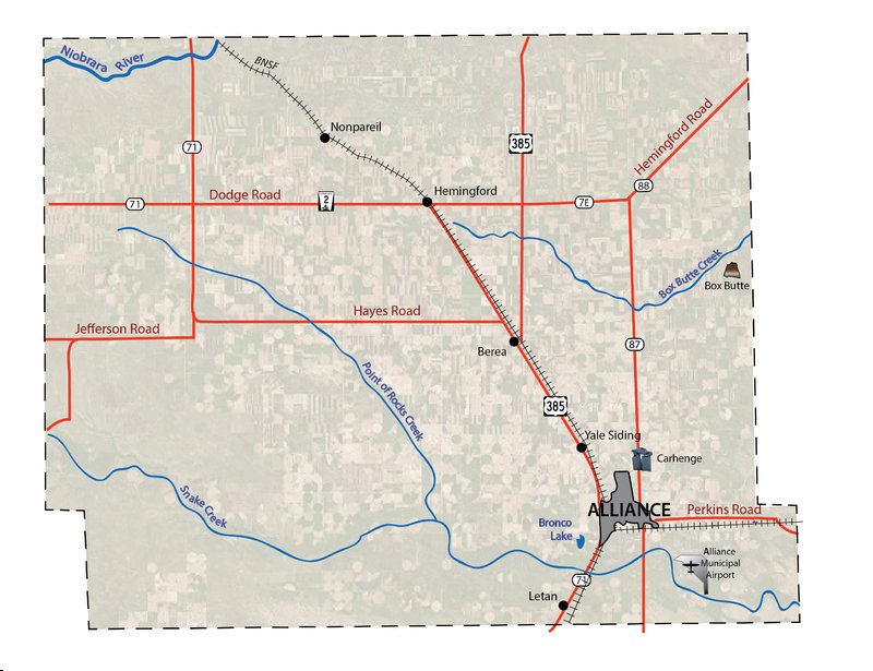 Alliance (County Seat) ![]() Downtown Alliance: Box Butte Avenue Alliance is a city in Box Butte County, in the northwestern part of the state of Nebraska and is located at the western edge of Nebraska's Sand Hills, in the Great Plains region of the United States. Its population was 8,491 at the 2010 census. It is the county seat of Box Butte County. The town was originally named Grand Lake. When the Chicago, Burlington and Quincy Railroad came to Grand Lake in 1888, the railroad superintendent, G.W. Holdrege, wanted to change it to a simple one-word name closer to the beginning of the alphabet, which he thought would be better for business.[7] The U.S. Post Office gave Holdrege permission, and he picked "Alliance" for the new name of the town. Alliance was incorporated as a city in 1891.[8] The Alliance Army Airfield was established in 1942. Construction was completed in August 1943 and the Army Air Corps used the facility as a training base until the end of World War II. The facility was transferred from the federal government to the City of Alliance in 1953 and is currently in use as the Alliance Municipal Airport. In the Lakota language, Alliance is known as chasmú oká?mi, meaning "Sand River Bend". According to the United States Census Bureau, the city has a total area of 4.73 square miles, of which, 4.72 square miles is land and 0.01 square miles is water. Located in the High Plains, Alliance's climate is rather typical of the surrounding region. Under the Köppen climate classification, the town features a BSk climate, commonly described as a "Cold Steppe", with winters just below the 26.6 degrees F threshold needed to be classified as a Continental climate, if it had enough precipitation to not be arid or semi-arid. The all-time record high for Alliance is 110 degrees F, set in 1983, and the all-time record low is -42 degrees F, set in 1989. Precipitation is significantly higher in summer than in winter, with the wettest month being June, and the driest month being January. The railway line from the northern exit of the Powder River Basin, one of the largest coal-mining areas of the world, to Alliance and the eastern United States, sees a rather large number of coal trains every day, to power plants in the Midwest and South. In the southern areas of Alliance there is a large train yard which hosts many of these coal trains. Links: City of Alliance - http://www.cityofalliance.net/ Alliance Chamber of Commerce - http://www.alliancechamber.com/ Alliance Times-Herald newspaper - http://alliancetimes.com/ Notable people: Helen Duhamel (1904–1991), Rapid City, South Dakota, businesswoman and broadcaster, attended St. Agnes Academy in Alliance James Emanuel (1921-2013), poet and critic LeRoy J. Louden, Nebraska legislator Moon Bloodgood (born 1975), actress/model, born in Alliance Luke Redfield (born 1983), singer/songwriter, spent a portion of his youth in Alliance David Bunnell (born 1947), publisher, writer, personal computer pioneer, born and raised in Alliance ~~~~~~~~~~ Berea Cluster of houses seen over railroad tracks occupied by train; metal grain elevator Berea, seen from the southeast across the BNSF tracks Berea is an unincorporated community and census-designated place in Box Butte County, in the northwestern part of the state of Nebraska in the Midwestern United States. It had a population of 41 at the 2010 census. Berea is about 10 miles northwest of Alliance, the county seat of Box Butte County. It lies along the west side of the BNSF Railway tracks, and of Nebraska Highway 2 near its junction with U.S. Highway 385. The Burlington Railroad reached the area of Berea in 1889, and railroad support facilities, including a water tower and section house, were built on the site. The town was founded by a group of settlers, originally from Ohio, who named their new home after Berea, Ohio. In 1890-91, the town had a population of 50, and a general store, newspaper, and post office; five years later, a school and community hall had been added. The population of Berea fluctuated over the next century. The town was of some local importance as a shipping stop along the railroad, although it never developed many commercial enterprises. A garage opened in 1921, repairing both automobiles and farm machinery. In 1925, when the population was estimated at 35, the post office was re-opened; it closed again a year later. A refinery was operated in the town in 1935 by the Utility Petroleum Company of Chadron. In 1960, a population of 75 was reported for Berea. The District 39 school was closed in 2007, at which time it had nine students enrolled. In 2009, the town's population was estimated to be 50. Berea has no commercial district. The Kelley Bean Company operates a grain elevator beside the railroad tracks; the elevator has a capacity of 633,000 US bushels, and the siding has space for nine railroad cars. In 2010, West Plains Grain Inc. announced plans to build a high-speed grain-loading facility with a capacity of 126 rail cars near Berea. ~~~~~~~~~~ Hemingford ![]() Box Butte County Fairgrounds in Hemingford Hemingford is a village in Box Butte County, Nebraska, United States. The population was 803 at the 2010 census Hemingford was incorporated as a village in 1886. The founder being a native of Hemmingford, Quebec, caused the name to be selected. As of the census of 2010, there were 803 people, 335 households, and 220 families residing in the village. Author Stephen King adapted Hemingford's name for the fictional town of Hemingford Home, Nebraska, which appears in several of his works. ~~~~~~~~~~ Letan Letan is an unincorporated community in Box Butte County, Nebraska, in the United States. Letan was a station on the Chicago, Burlington and Quincy Railroad. ~~~~~~~~~~ Nonpareil A post office was established at Nonpareil in 1886, closed in 1894, reopened in 1925 and reclosed in 1946. Nonpareil was named after the "Nonpareil type" because like the type, the settlement was very small