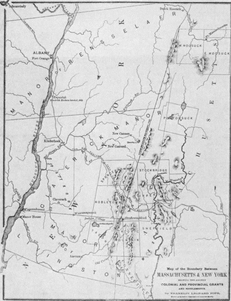 This map is the frontispiece of Franklin Leonard Pope's "The Western Boundary of Massachusetts," 1886