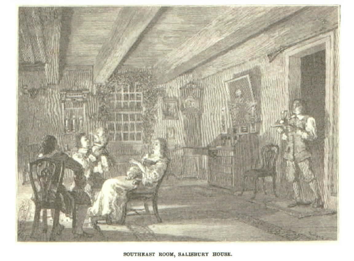 Upon the walls of the southeastern room, during Francis Salisbury's life, hung the precious heirlooms which his father, Silvester, brought with him from England--the coat of arms of the Welsh Salisburys, knights of Llewenny; a picture concerning which the tradition is that it is a portrait of Anne Boleyn by Holbein; two rapiers mounted in silver, of dainty workmanship, and stamped, one with the date 1544, the other with the date 1616.