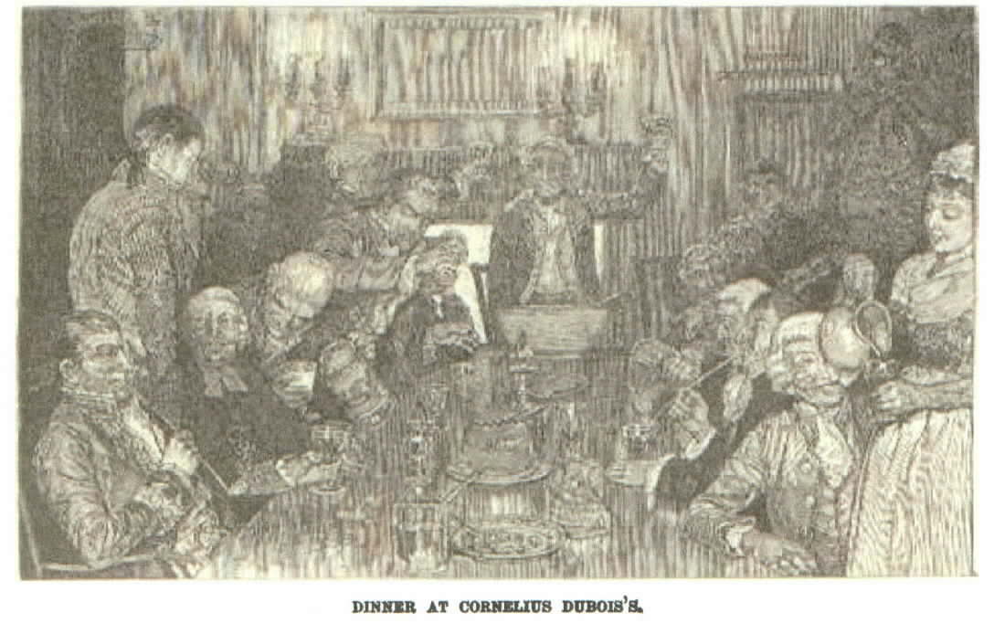 On special occasions a dinner or supper was given, and of one of these feasts the story has been handed down. The occasion was the surrender of Cornwallis; the giver was a stanch patriot and captain in the New York line, Cornelius Dubois; the place was his stone cottage on the right bank of the Catskill, near its mouth; the time was a Sunday afternoon, late in the autumn of 1781, after the chickens and the turkeys had been fattened, the hams cured, and the cider ripened. The house was filled; the sitting-room above with the Whigs of the neighborhood--with the Duboises, the Salisburys, the Van Ordens, and the Van Vechtens; the kitchen beneath with the uninvited but not unwelcome slaves of the yeomen. There was [page 826] loud and hearty talking; there was fiddling by the negroes; there was a long table covered with savory food; there was an abundance of flip and toddy in bockjes, or wooden bowls. A prominent figure in the assembled company was the figure of a repentant Tory, who went about with a large pitcher of milk punch, asking each guest to drink with him to the final success of the American arms. The party broke up late; and it is said that a venerable elder of the united churches of Catskill and Coxsackie went home, for the first time in his life, in a state of unnatural exhilaration.
