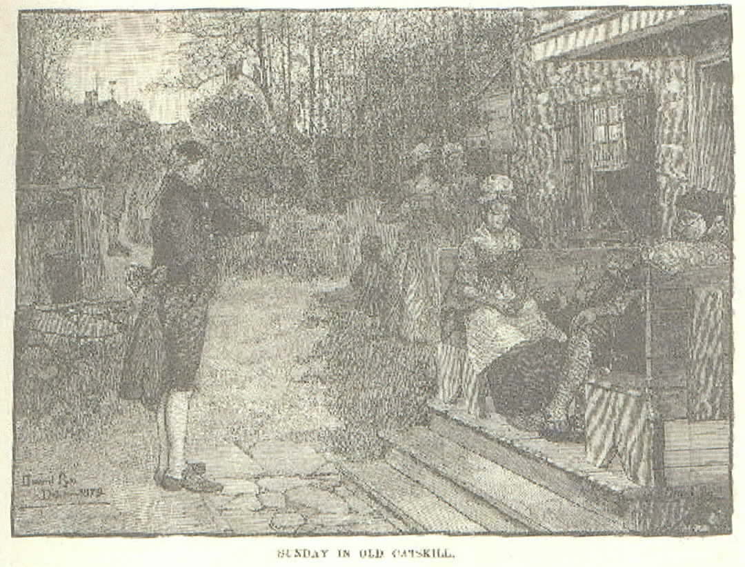 In 1732 the number of the members of the church at Catskill was about twenty-five; in 1780 the number was about one hundred. It was an orderly and God-fearing congregation. On every other Sunday morning they met together--the Salisburys and the Van Bergens from the neighborhood, the Van Vechtens and the Duboises from the banks of the Catskill, the Van Ordens and the Overbaghs from the Inbogt, and the Abeels from the Bak-Oven. Some came on horseback over the roads which had been cut through the forests, others in rude wagons. During the Revolution all were armed. The men wore queues and three-cornered hats of brown beaver; their knee-breeches and their long waistcoats were of homespun; their stockings, knit by their thrifty wives in the light of the open fire during the winter evenings, were of coarse blue yarn; their low shoes were of russet leather, and bore large buckles of brass or polished steel. The women were clothed in petticoats of heavy flannel, and in gowns of linsey-woolsey, short in the waist, scanty in circumference, reaching only to the ankle, and dyed black with logwood, or brown with butternut. A few of the richer maidens, Katharina Oothoudt, perhaps, Elizabeth Van Vechten, and Neelbje Van Bergen, wore strings of gold beads about their necks.