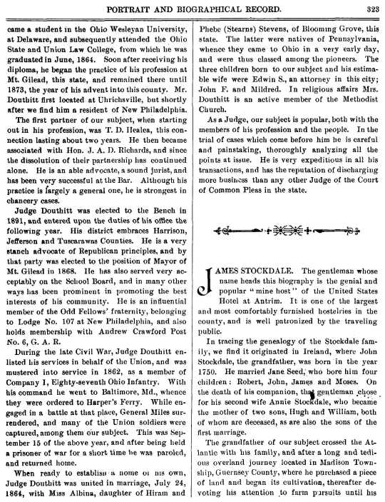 The first partner of our subject, when starting out in his profession, was T.D. Healea, this connection lasting about two years. He then became associated with Hon. J.A.D. Richards, and since the dissolution of their partnership has continued alone. He is an able advocate, a sound jurist, and has been very successful at the bar. Although his practice is largely a general one, he is strongest in chancery cases. Judge Douthitt was elected to the Bench in 1891, and entered upon the duties of his office the following year. His district embraces Harrison, Jefferson and Tuscarawas Counties. He is a very stanch advocate of Republican principles, and by that party was elected to the position of Mayor of Mt. Gilead in 1868. He has also served very acceptably on the School Board, and in many other ways has been prominent in promoting the best interests of his community. He is an influential member of the Odd Fellows' fraternity, belonging to Lodge No. 107 at New Philadelphia, and also holds membership with Andrew Crawford Post No. 6, G.A.R. During the late Civil War, Judge Douthitt enlisted his services in behalf of the Union, and was mustered into service in 1862, as a member of Company I, Eighty-seventh Ohio Infantry. With his command he went to Baltimore, Md., whence they were ordered to Harper's Ferry. While engaged in a battle at that place, General Miles surrendered, and many of the Union soldiers were captured, among them our subject. This was September 15 of the above year, and after being held a prisoner of war for a short time he was paroled, and returned home. When ready to establish a home of his own, Judge Douthitt was united in marriage, July 24, 186l, with Miss Albina, daughter of Hiram and |