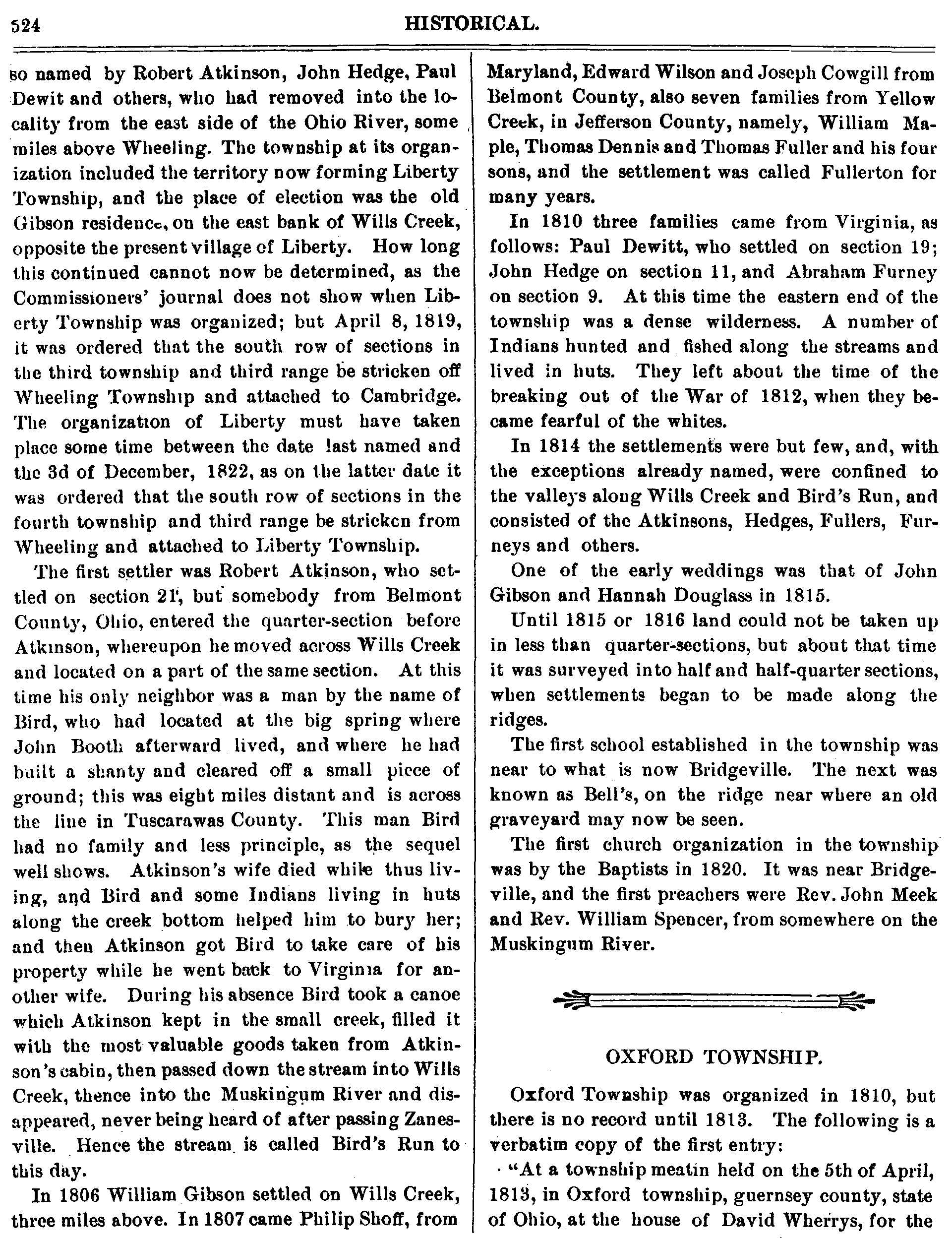 In 1810 three families came from Virginia, as follows: Paul Dewitt, who settled on section 19; John Hedge on section 11, and Abraham Furney on section 9. At this time the eastern end of the township was a dense wilderness. A number of Indians hunted and fished along the streams and lived in huts. They left about the time of the breaking out of the War of 1812, when they became fearful of the whites. In 1814 the settlements were but few, and, with the exceptions already named, were confined to the valleys along Wills Creek and Bird's Run, and consisted of the Atkinsons, Hedges, Fullers, Furneys and others. One of the early weddings was that of John Gibson and Hannah Douglass in 1815. Until 1815 or 1816 land could not be taken up in less than quarter-sections, but about that time it was surveyed into half and half-quarter sections, when settlements began to be made along the ridges. The first school established in the township was near to what is now Bridgeville. The next was known as Bell's, on the ridge near where an old graveyard may now be seen. The first church organization in the township was by the Baptists in 1820. It was near Bridgeville, and the first preachers were Rev. John Meek and Rev. William Spencer, from somewhere on the Muskingum River. ->)====================(<- Oxford Township was organized in 1810, but there is no record until 1813. The following is a verbatim copy of the first entry: "At a township meatin held on the 5th of April, 1813, in Oxford township, guernsey county, state of Ohio, at the house of David Wherrys, for the |