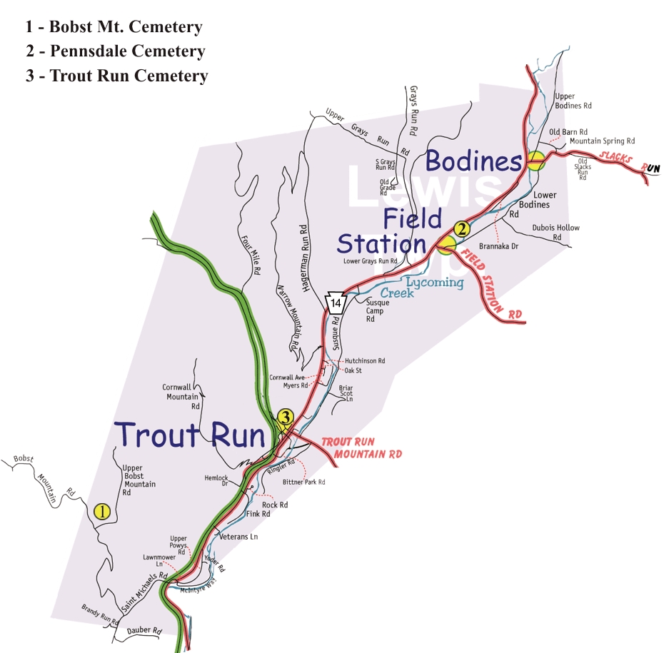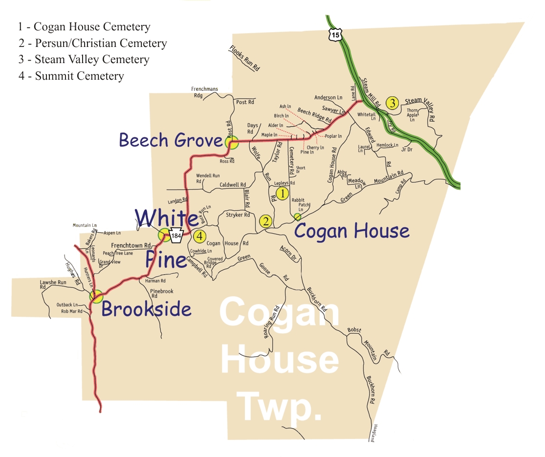 Maps are being added to assist in locating burial grounds. Click on the Township for a map of that township and burial locations.