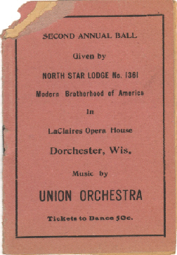 A copy of the Union Orchestra Program (ca. 1908) was found in the old Gutwasser home located on the South end of Main Street, Dorchester, Mayville Twp., Clark Co., WI.