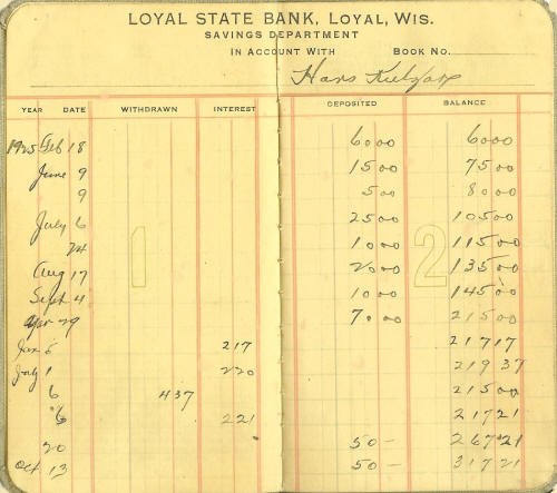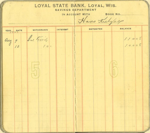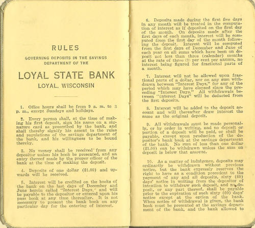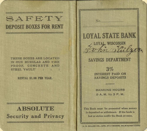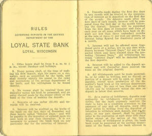 In 1917 the Loyal State Bank built the new building, "one of the finest and best in the county," with a front of Lake Superior brown stone and fireproof side walls. There were two vaults on the main floor and one in the basement. Finished in oak, with marble wainscot and floors, it was electrically lighted and heated with a hot water system. At this time A. A. Graves was president and R. M. Jenks cashier.