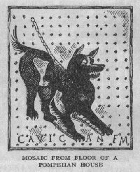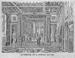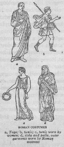 But one summer afternoon in the year 79 A.D. a strange thing happened. Over the mountain was seen a huge cloud, now bright, now black and misty in appearance. As it stretched out from the mountain top it looked to some like a huge pine tree. At first people wondered what this strange thing was; soon they were filled with terror. Ashes and stones began to fall; loud rumbling noises were heard; the earth shook, and seemed to rise up and push back the sea. It grew dark, and the air was filled with stifling odors. In their panic all who could fled, some even putting pillows or cushions on their heads. But in the darkness many lost their way, and all were calling out to each other in horror and despair. It seemed that the whole world was about to be destroyed. In truth, it was Mt. Vesuvius which had suddenly burst forth in so terrible an eruption that the entire top of the mountain was blown off by the explosion and the country for miles around buried beneath ashes and the streams of lava which rushed down the mountain slopes. How many people perished in this terrible event we shall never know. But since Vesuvius by its smoke and rumbling gave warning of what was to happen, it is clear that most of the population, though stricken with panic, had time to make their escape. The beautiful towns of Pompeii and Herculaneum were, however, overwhelmed and buried, and the slopes of the mountain, once green with orchard and vineyard, were now only wastes of smoking ashes. Yet for us to-day the destruction of Pompeii has given one good result. In recent times the ashes have Though all the other cities of the once great empire have fallen to hopeless ruin, the visitor to Pompeii can thus see just how the Romans lived and carried on their work and their play. 48. Roman Houses. A city like Pompeii was of course surrounded by a strong wall for defense. The houses were built very close together, and the streets were rather narrow. When crowded with people and carts it must have been a noisy place. The houses in Pompeii usually had no windows looking out on the street, except in the second story. The light and air came through openings in the roof or from the small courtyard, which every good house had. When the visitor entered the house of a well-to-do family he first passed through a small vestibule or open space. Sometimes a dog was kept here. One house at Pompeii has a picture of a fierce dog in the paved floor, with the warning words, "Cave canem," "Beware the dog." After passing through a short hail, the visitor entered a large room, the main living room of the house. If the owner were rich it was adorned with statues and carvings. In the center was always a large opening in the roof, and beneath it a basin or pool to catch the rain. Opening off the sides of this main room were little rooms and in some cases the stairway leading to the upper story. In the rear corner were two large alcoves, or sometimes rather large separate rooms. In one of these were kept the statues of the gods and of the ancestors of the family. In their honor the master of the house with his wife and children performed worship and offered sacrifices. The other corner room or alcove is thought to have been used as a dining room. Directly at the rear of the Passing through the master's room we come next to the most striking part of the whole building. This was the large court or garden open to the sky, beautified by flowers and statues, and surrounded by a colonnade Around this fine court were numerous rooms arranged according to the taste of the family. Here was the kitchen with dining rooms, storerooms, and private apartments. Though Roman houses differed sometimes in small ways, all were on the same general plan. Sometimes, if the family were very wealthy, there would be a larger garden, with rows of terraces behind the residence. On the outside of the house, along the busy street, there were little shops or stores. These were rented to people who sold different articles. But such shops opened off the street and never into the house. 49. How the Romans Lived. In such a dwelling a well-to-do Roman and his family lived, surrounded by their slaves, who did all the hard work. Here, too, came every morning the master's "clients," that is, poor men who had put themselves under his protection. They wished him good morning, and he greeted them cordially by name, and sometimes even kissed them. A Roman was proud The clothing worn by the Romans was not much like ours. Beneath the warm Italian sky close fitting garments such as we wear were not needed. Indoors, the only clothing worn by a Roman man or boy was the "tunic." This was merely a loose woolen shirt, with short sleeves, held up by a girdle at the waist. But when a Roman went forth in public he put on over this the famous "toga." This was a long and heavy white cloak wrapped about the body in such a way as to fall in graceful folds. The togas of men who held important offices were marked by a broad purple stripe on the border. Not until a boy was old enough to be a full Roman citizen could he wear the man's toga. When he first put it on there was an impressive ceremony, when he was taken before a public officer at Rome and introduced by his father. The Romans wore shoes and boots much like ours, but in the house they often used sandals. Hose or stockings they never wore. Workmen and sailors sometimes had caps or hats, but the wealthy usually went bareheaded, except when upon a journey. Roman women wore three garments instead of two. Over the inner tunic was a longer outer covering, and on the street Roman ladies had a graceful cloak or mantle much like the toga, though it was never called by that name. A Roman family generally rose very early in the morning, often about daylight. For breakfast they ate little, sometimes only bread and honey. The chief business of the day was done in the morning. About half-past eleven, as we reckon time, they had lunch. This, too, was a rather light