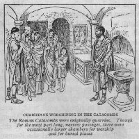 Nor was the message for the rich and great alone, for the new faith taught that all men are equal in the sight of God, and the poorest and humblest can share equally in the Christian's reward. At the head of the teachers of the new religion were Peter, a fisherman, 52. How the Early Christians Were Treated. At the beginning the Roman emperors cared little about the Christians. But when their numbers increased, trouble came. The Christians were suspected of forming a dangerous secret organization. When they met privately to celebrate the Lord’s Supper, it was thought that they plotted treason against Caesar. Under the laws of Rome people might believe what they liked about life and death, but all were required to worship the image of the emperor, head of the Roman state. This the Christians would not do. They thought it a sin to worship any one but God. From time to time terrible persecution fell upon them. Those who would not obey the emperor were condemned to most awful sufferings. Often their death occurred in the amphitheater, and the spectators saw groups of Christians, men and women, kneel in prayer until wild beasts released from their cages sprang forth and devoured them. The first terrible persecution was in the time of the brutal emperor Nero. This tyrant delighted the Roman mob by giving gladiatorial contests and games, but for his own entertainment and pleasure he committed awful crimes. According to a story which many people have believed, he cared so little for the welfare of the people that when the city of Rome caught fire he played and sang a poem that he had written about the destruction of Troy. When people cried out against his conduct, he cast the blame for the fire upon the Christians, and caused thousands to be put to death. He even lighted his gardens by having Christians bound to crosses and smeared with pitch, and then set on fire. Under Nero perished both St. Peter and St. Paul. No wonder then that the early Christians met in secret places like the famous Catacombs, a name given to the narrow and dark underground passages constructed beneath a part of the city as burial places for the dead. Many of these galleries were dug out by 53. Christianity Triumphs. But sword and fire could not crush the religion of Christ. An ever increasing number of men and women adopted the faith which taught the martyrs to die so bravely. Finally there came a great civil war in Rome, waged by a number of powerful men each of whom claimed to be There is a famous old story that as Constantine and his army were bravely marching against their enemies there was suddenly seen a cross blazing in the sky, and, underneath, the words, "In this sign thou shalt conquer." At any rate, Under it he overthrew and destroyed all his foes and then triumphantly established his power as Caesar. As a result he declared that Christians should be tolerated, and he was finally baptized a Christian himself. What a great change this was, when a supporter of the new faith occupied the imperial throne of the Caesars! Just as the Romans had formerly shown themselves able to organize their vast empire, now they showed themselves equally skillful in establishing the new religion. In each village and country district a priest or minister was placed to preach to the people and conduct service in the church. Every large city had its bishop, who had control over all the priests in the surrounding region. In the capital of each province was the archbishop, a still more dignified officer, and finally, in the greatest cities like Rome, Constantinople, and Alexandria, were the most powerful bishops, or "patriarchs," of all. Thus the Roman church was like another great Roman empire. But it was an empire of the souls of men rather than of their bodies.