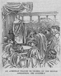 15. How the Greeks Governed Themselves. Though the Greeks lived in a small land and all spoke the same language, they had no single king or common government. They did, indeed, regard each other as brothers and called all who did not speak their tongue "barbarians." Yet their cities could seldom agree, and often fought against each other in savage wars. Since the people of each little plain were shut off from their neighbors by mountains they loved to rule themselves in their own way. On some central hill, easy of defense, they built shining temples to their protecting gods, and close under these clustered the white dwellings of the townsfolk. Round about, strong walls were set up to shield them from their enemies. Those who preferred to live on their little farms in the country, however, had also a share in the common life and might take refuge behind the fortifications when invaders appeared. Such a little state the Greeks called a "city." And to the Greek his city was his fatherland. In it he usually spent all his life. He knew all his fellow citizens well, and for his city and its gods he thought he ought to lay down his life if need came. Greece had many such cities, but the most famous are Athens and Sparta. In early times the Greek cities had kings. But later most of them got rid of their kings and became little republics. All the citizens met from time to time in public assemblies, where they chose their officers from year to year and where any one who wished could speak about public matters. But the Greeks always had trouble to keep their liberty. Often some rich or clever man would seize the power and compel his fellow citizens to obey him. The Greeks called such a man a "tyrant." By this word they did not mean a bad ruler, but one who had taken the government without proper authority. Some tyrants were wise and ruled well. Yet most of the Greeks did not like tyrants, and they tried hard to get rid of them. 16. Athenians and Spartans. The two greatest cities of Greece were not at all alike, and could seldom agree. The people of Athens loved new things; the people of Sparta loved old things. The Athenians loved what was beautiful; the Spartans only what had practical use. The Athenians excelled in music, in art, in learning; the Spartans.excelled in war, and thought everything else foolish. Athens always loved liberty. She was the first great republic in the world. In her assemblies all her citizens took part in making the laws. They met on a hill called the Pnyx near the center of the city and, sitting on the stone seats which probably rose one above the other in the form of a semicircle, listened to speeches on public questions. Any citizen could speak who wished, but before doing so he must put a wreath on his head and take his stand, facing the people, beside an altar. If he spoke well the Athenians gave him loud applause and were often persuaded to vote what he wished. Exciting indeed was the contest when great speakers took different sides of a question, and the feelings of the people were swayed by their stirring words now on this side, now on that. Because the laws of Athens were made by the Assembly, the Athenians greatly prized the power of speaking well. Every citizen was taught to speak in public and to take his share in the business of the city. But the best orators naturally had great influence. Carried away by their powerful appeals, the Athenians were often led to decide great questions rather suddenly. So it always meant much for Athens whether her most skillful speakers were wise statesmen or persons who tried to win applause by urging the people to do what was popular instead of what was best for the state. The Athenian must serve his city not only in the Assembly but also, if need came, on the field of battle, so he was trained to handle spear and shield and to be a soldier. In war the Athenians were always brave and quick. The little Atnenlan boy went to two schools,—the music school and the When the boys were fifteen they went to a higher kind of school for physical training called the gymnasium. Here they were taught to be athletes and to compete in the games. At eighteen the young Athenian was ready to become a citizen. Now came a great ceremony, when all the youth were brought to the public assembly and, before all the grown men of the city, given spear and shield. Raising their hands, they swore that they would never disgrace their arms or desert a companion in the ranks, that they would obey the laws of Athens and the religion of the city, and that when the time came they would give over Athens to their children greater than they had received it. The boys then marched away to be trained in arms and to servO as soldiers for two years. When they returned they were free to live as they pleased and to share in all the advantages and pleasures of their beautiful city. But though every citizen was thus ready to fight as a soldier, the Athenians cared for many other things besides war. As Athens was near the sea, many of her people became merchants and grew rich. Athenian sailors were But the Athenians had their faults. Too often they changed their minds. Then also, though they believed in liberty for themselves, their city was filled with slaves who had to do nearly all the hard work and had few rights. In this respect, however, the Athenians were only like all the other Greeks, and indeed like all other ancient peoples. Unlike the Athenians, the Spartans lived as if always at war. When the Spartan boy was only seven he was taken from home altogether and made to live in barracks. He was trained to run, to jump, to wrestle, but especially to carry arms and to use the spear and shield. Above all he was taught to endure fatigue, pain, and hunger, and never to cry out if hurt. The Spartan soldier must never run from the enemy, and if he lost his shield in battle he was disgraced for life. Of learning the Spartan youth was taught little. The Spartans despised u