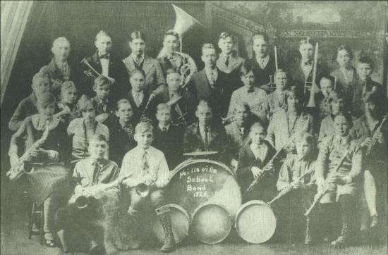 The 1928 Neillsville High School Band, shortly after girls could participate in the instrumental music department. (Left to right) front row: Buster Brown, Lowell Schoengarth, Robert Schiller, Robert Unger and Welton Brooks. Second row: Mary Neverman, Virginia Kleckner, Chester Wagner, Vernon Scholtz, Edward Frantz, Donald West, Marie Walk, Gertrude Walk, and Marion Huntley. Third row: Francis Welsch, Dale Herrian, Harold Frantz, William Gallagher, Herbert Kurth, Mr. O’Neil, Clarance Gangler, Henry Hauser, Lester Zaeske and Warren Hemp. Fourth row: Herbert Borde, Arthur Gress, Herbert Keller, Walter Weaver, Fredrick Anderson, Irving Gerhardt, Owen Higgins and Dale Schwienler. (Photo courtesy of Mary (Neverman) Lauer)