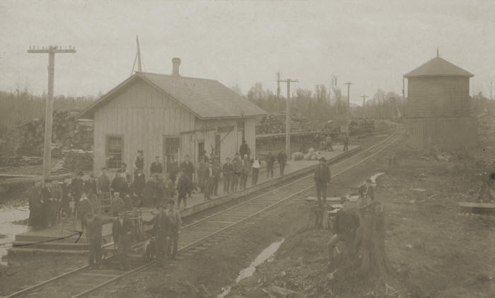 Train Station at Withee, WI (1892 ca.); The logs behind the station were logged by Funk and Louis Kreuger Sr. for ? and Hudson of Eidsvold.  ? Village postmater with a ? cb and mailbag over his shoulder, stands on the plaform.  Bill (the rest is unreadable).