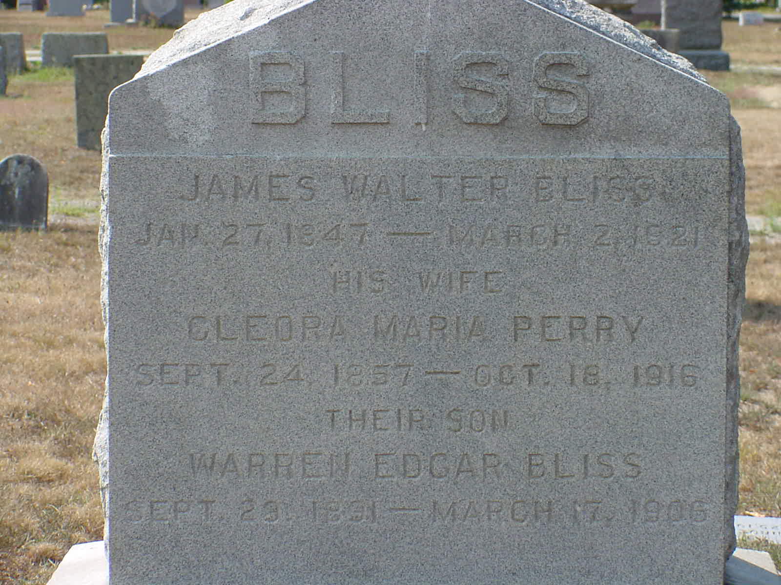Cleora Maria Perry. James W. Bliss died Mar 2, 1921 at Rehoboth.