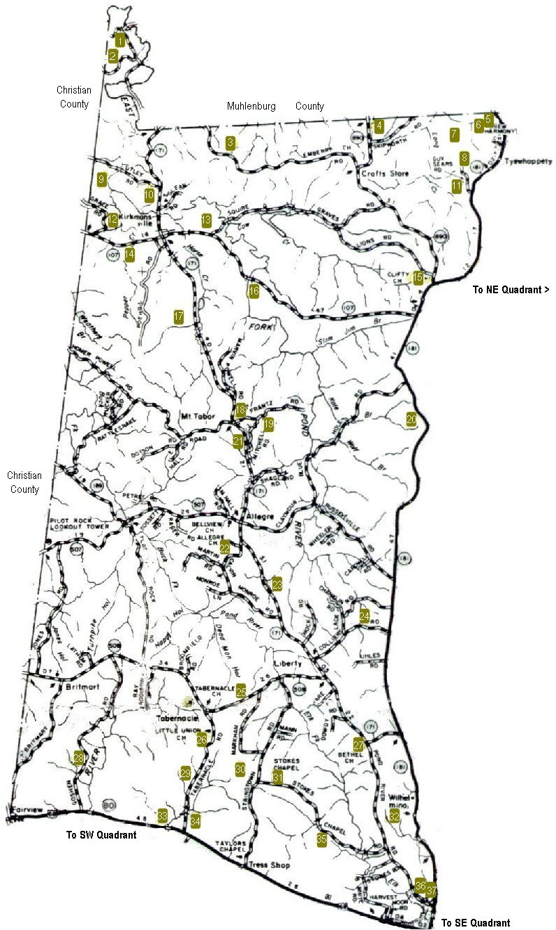 | 1. McKinney 2. Johnston #2 3. Emberry Cemetery 4. Joines Cemetery 5. Butler-McGehee Memorial Park 6. New Harmony-Bivins Cemetery 7. Lear Cemetery 8. Sears Family Cemetery (aka Guy Sears) 9. Spurlin Cemetery 10.Hale Cemetery 11.Blake Cemetery 12.Jenkins Grave 13.Johnston Cemetery 14.Pepper Cemetery aka Pepper Cemetery 15.Clifty Church Cemetery 16.Edwards Cemetery 17.Powell Cemetery 18.Mt. Tabor Cemetery 19. Francis Cemetery 20. Simons Cemetery 21. Kirkman (Old) Cemetery |