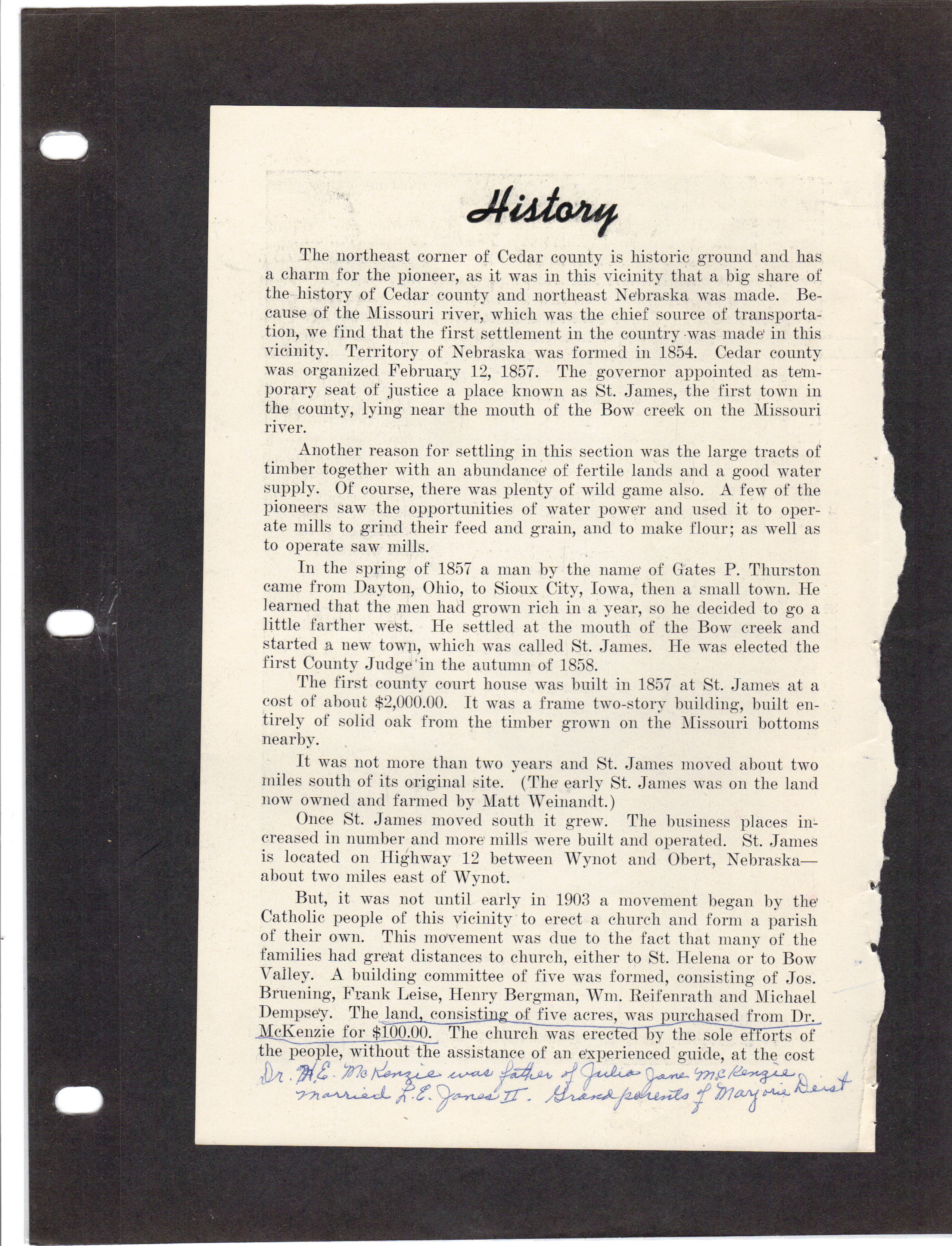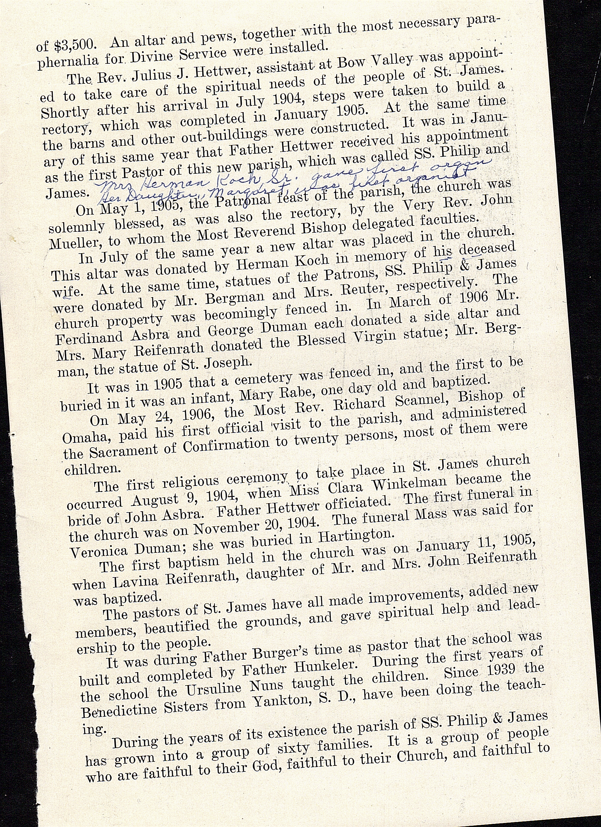 Church Histories Page 1 - Methodist Page 2 - Hope Reformed Page 3 - St. Mary's Catholic Page 4 - Union Presbyterian Page 5 - churches continued Page 6 - churches continued Coleridge Church Histories Pastors of Immanuel Lutheran Church Pastors of St. Michael's Catholic Church Hartington Church Histories Trinity Lutheran Church Pastors of Holy Trinity Catholic Church Paragon Church Histories Paragon Evangelical Lutheran Church Wynot Church Histories Wynot Lutheran Church aka. Our Saviors Lutheran; Bethany Lutheran; Faith Parish Church St. Philip & James Church History, St. James Page 1 - SS. Philip & James Page 2 - SS. Philip & James Can anyone tell us which publication this is from? Do you have the missing page(s)?? To submit additional church history items, please e-mail Cedar County Coordinators