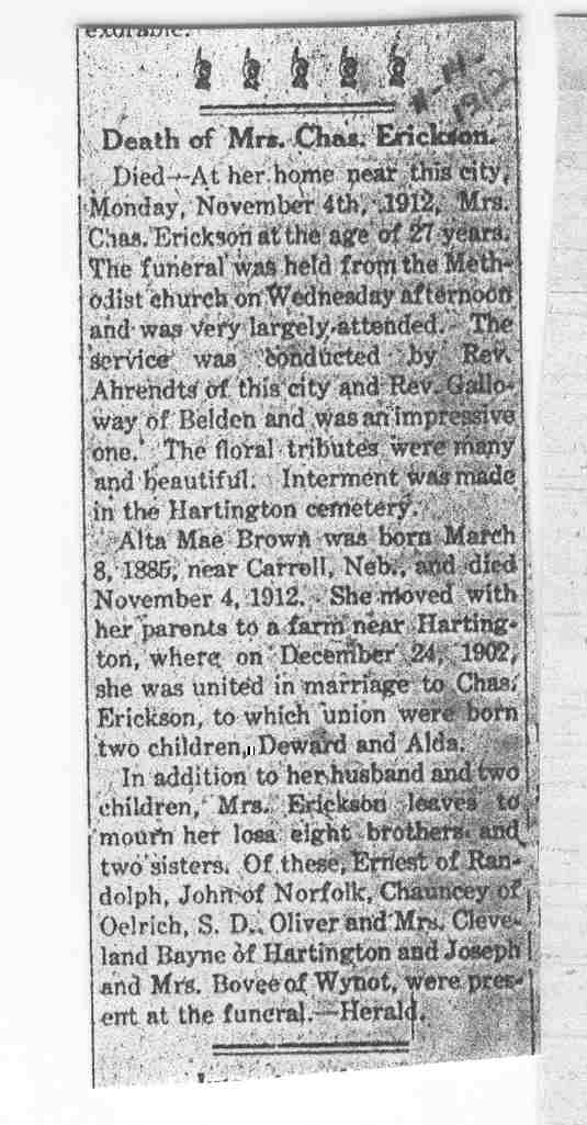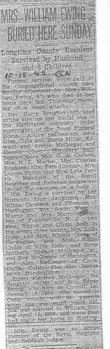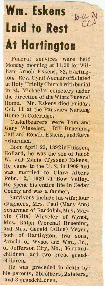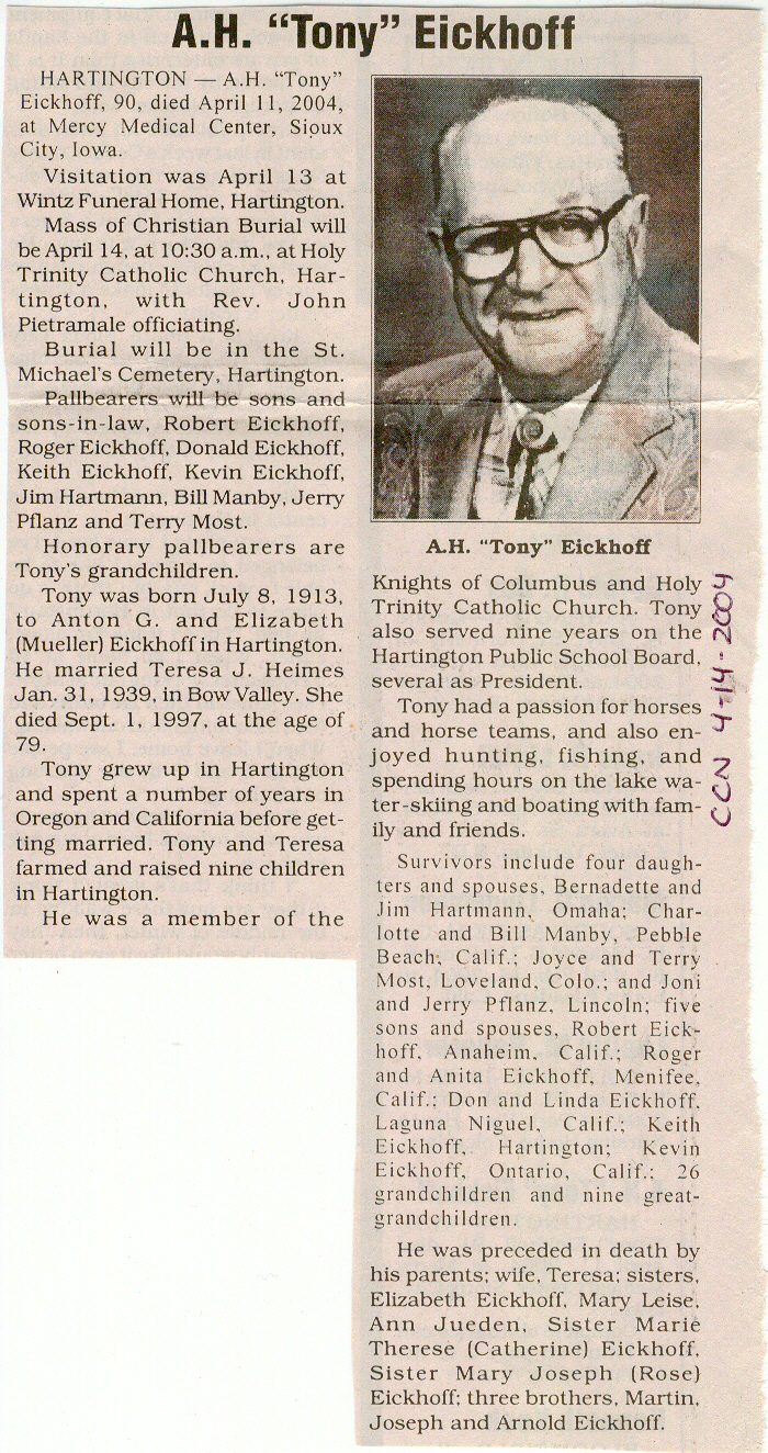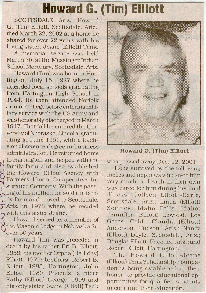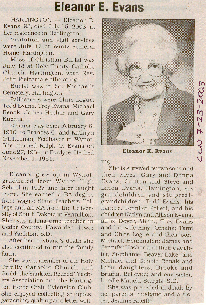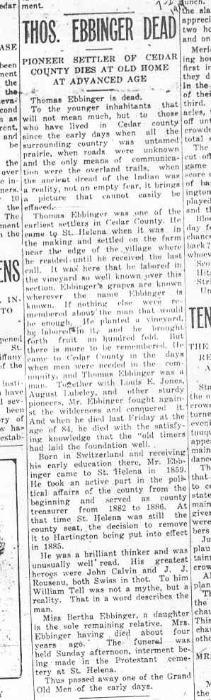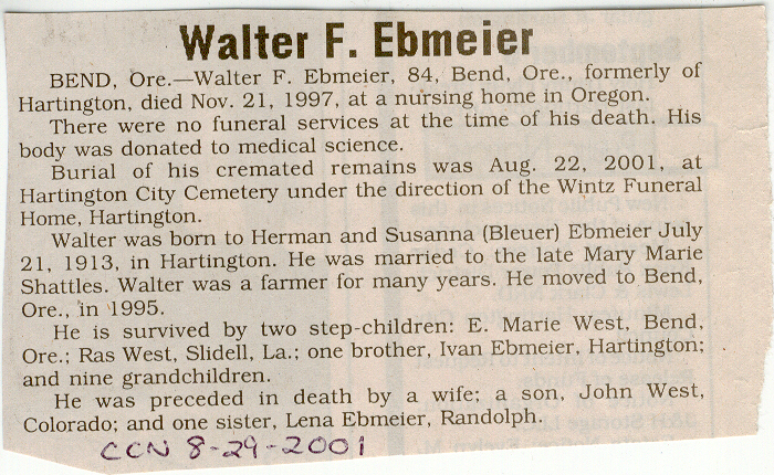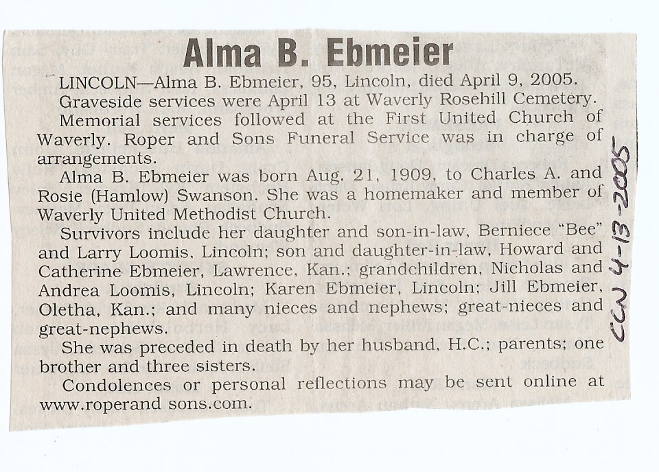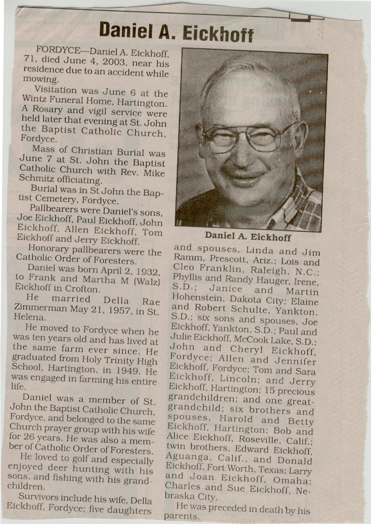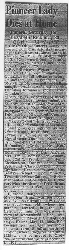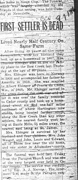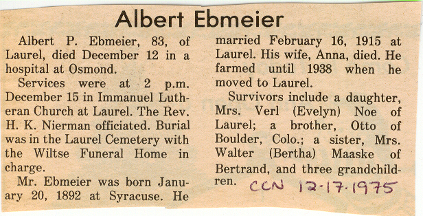Cedar County, Nebraska Jump ahead to surnames: EBBINGA Joan Marie DeBlauw Published in: Cedar County News on December 26, 2001 EBBINGER Thomas Published in: Cedar County News on July 24, 1919 EBINGER Mrs. Thurine Published in: Cedar County News on September 7, 1916 EBMEIER Albert P. Published in: Cedar County News on December 17, 1975 EBMEIER Alma B. Swanson Published in: Cedar County News on April 13, 2005 EBMEIER Ivan I. Published in: Cedar County News on March 23, 2005 EBMEIER Walter F. Published in: Cedar County News on August 29, 2001 EBY Hazel Jones Published in: Cedar County News on March 9, 1939 EBY Anna M. Duman Published in: Coleridge Blade in November 1957 EBY Levi Published in: Cedar County News on April 14, 2004 EICKHOFF A.H. "Tony" Published in: Cedar County News on April 14, 2004 EICKHOFF Arnold F. Published in: Cedar County News on March 16, 2000 EICKHOFF Daniel A. Published in: Cedar County News on June 11, 2003 EICKHOFF Elizabeth Bruns Published in: Cedar County News on December 7, 1950 EICKHOFF Elizabeth Hegge Published in: Cedar County News in April 2006 EICKHOFF Fred Published in: Cedar County News on February 4, 1976 ELLIOTT Howard G. "Tim" Published in: Cedar County News on April 3, 2002 EMERSON Baby Girl Published in: Wynot Tribune on October 2, 1908 ERDMANN Ariana Lea Published in: Cedar County News on May 1, 2002 ERICKSON Alta Mae Brown Published in: Wynot Tribune on November 14, 1912 ERICKSON Lloyd M. Published in: Cedar County News on Novmeber 14, 2001 ESKENS William Arnold Published in: Cedar County News on October 16, 1974 ESKINS Cynthia A. Schieffer Published in: Cedar County News on October 28, 1998 ESKINS Cynthia A. Schieffer Published in: Cedar County News on October 28, 1998 ETSCHEIDT Mary Pick Published in: Cedar County News on February 26, 1951 EVANS Doris L. Published in: Cedar County News on January 1, 2003 EVANS Eleanor E. Feelhaver Published in: Cedar County News on July 23, 2003 EVELETH Maggie Mae Puntney EVERS P.R. EVERS P.R. Died in January 1966 EWING Emma Florence McGregor Published in: Cedar County News on October 18, 1945 To submit an obituary, e-mail Carol Tramp,