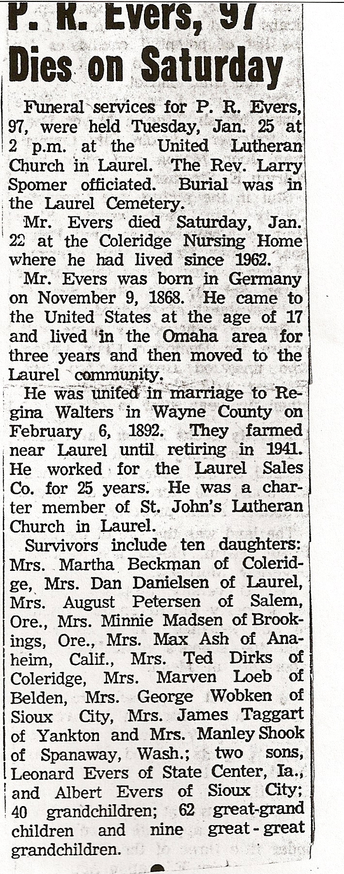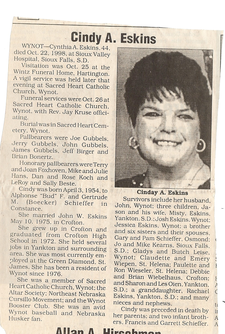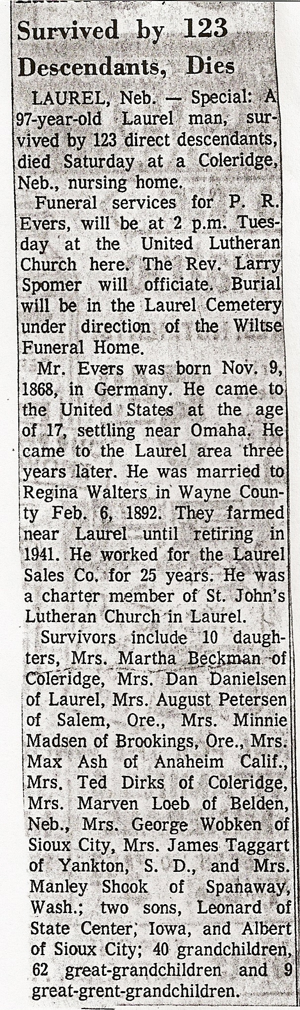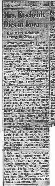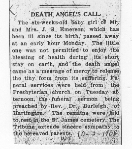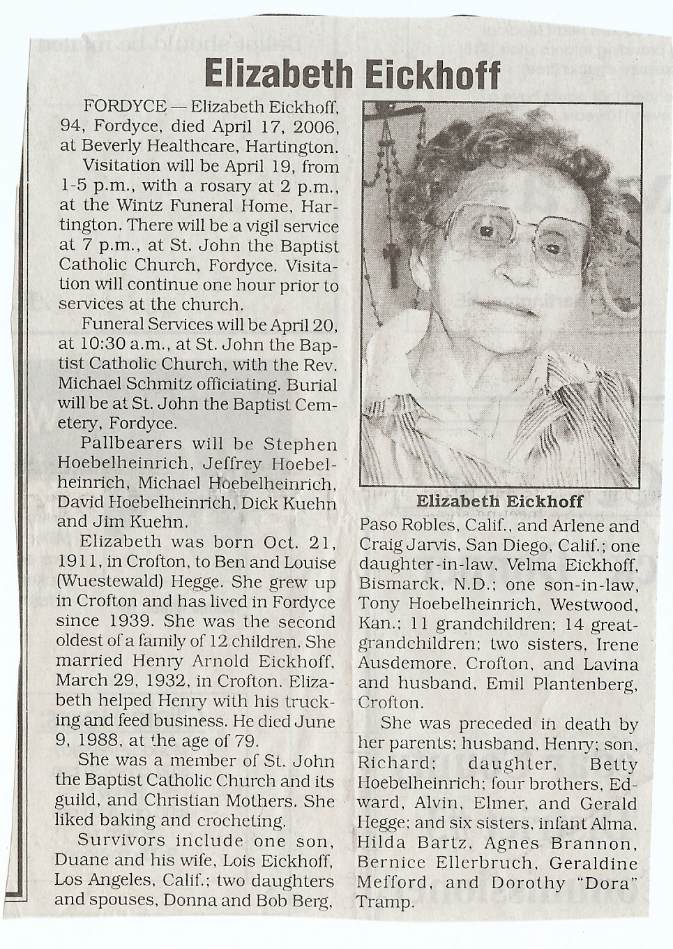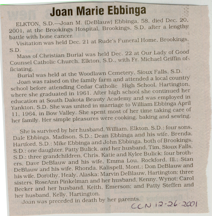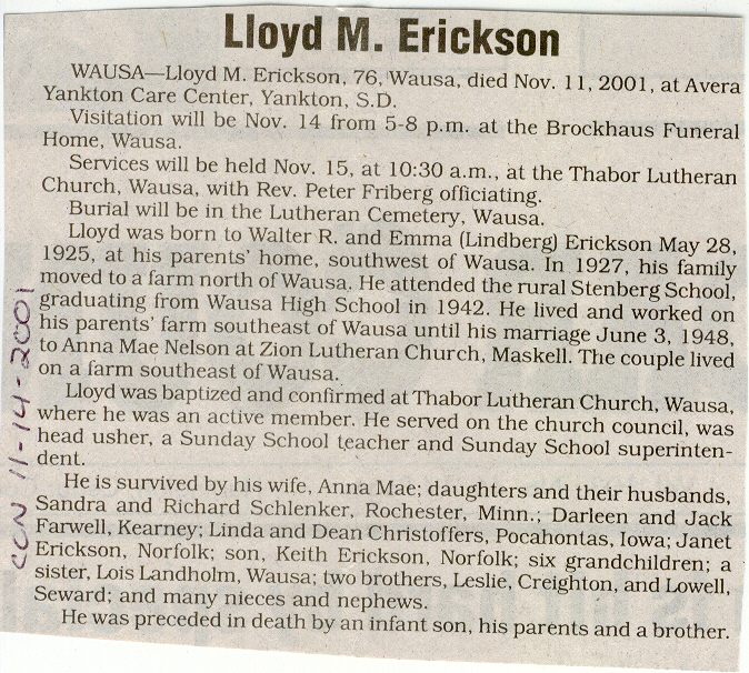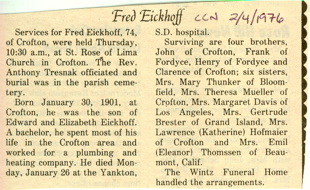 Cedar County, Nebraska Jump ahead to surnames: EBBINGA Joan Marie DeBlauw Published in: Cedar County News on December 26, 2001 EBBINGER Thomas Published in: Cedar County News on July 24, 1919 EBINGER Mrs. Thurine Published in: Cedar County News on September 7, 1916 EBMEIER Albert P. Published in: Cedar County News on December 17, 1975 EBMEIER Alma B. Swanson Published in: Cedar County News on April 13, 2005 EBMEIER Ivan I. Published in: Cedar County News on March 23, 2005 EBMEIER Walter F. Published in: Cedar County News on August 29, 2001 EBY Hazel Jones Published in: Cedar County News on March 9, 1939 EBY Anna M. Duman Published in: Coleridge Blade in November 1957 EBY Levi Published in: Cedar County News on April 14, 2004 EICKHOFF A.H. "Tony" Published in: Cedar County News on April 14, 2004 EICKHOFF Arnold F. Published in: Cedar County News on March 16, 2000 EICKHOFF Daniel A. Published in: Cedar County News on June 11, 2003 EICKHOFF Elizabeth Bruns Published in: Cedar County News on December 7, 1950 EICKHOFF Elizabeth Hegge Published in: Cedar County News in April 2006 EICKHOFF Fred Published in: Cedar County News on February 4, 1976 ELLIOTT Howard G. "Tim" Published in: Cedar County News on April 3, 2002 EMERSON Baby Girl Published in: Wynot Tribune on October 2, 1908 ERDMANN Ariana Lea Published in: Cedar County News on May 1, 2002 ERICKSON Alta Mae Brown Published in: Wynot Tribune on November 14, 1912 ERICKSON Lloyd M. Published in: Cedar County News on Novmeber 14, 2001 ESKENS William Arnold Published in: Cedar County News on October 16, 1974 ESKINS Cynthia A. Schieffer Published in: Cedar County News on October 28, 1998 ESKINS Cynthia A. Schieffer Published in: Cedar County News on October 28, 1998 ETSCHEIDT Mary Pick Published in: Cedar County News on February 26, 1951 EVANS Doris L. Published in: Cedar County News on January 1, 2003 EVANS Eleanor E. Feelhaver Published in: Cedar County News on July 23, 2003 EVELETH Maggie Mae Puntney EVERS P.R. EVERS P.R. Died in January 1966 EWING Emma Florence McGregor Published in: Cedar County News on October 18, 1945 To submit an obituary, e-mail Carol Tramp,