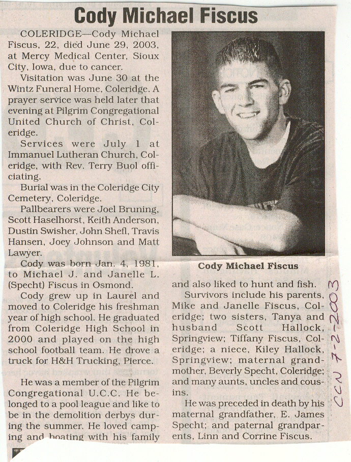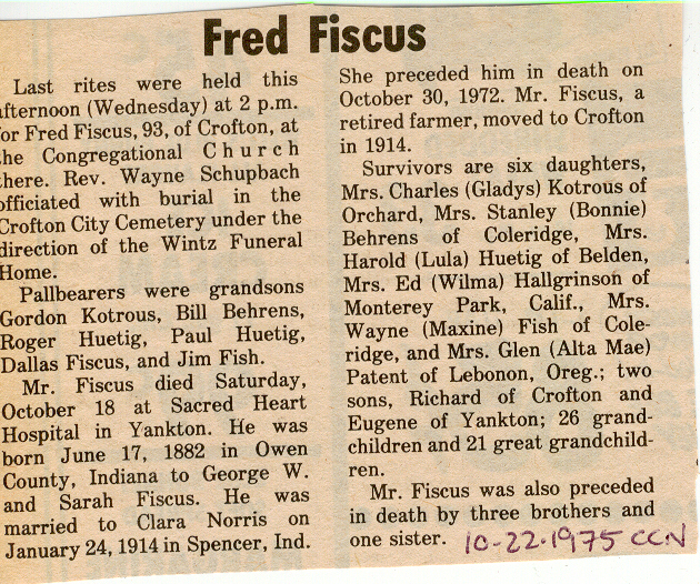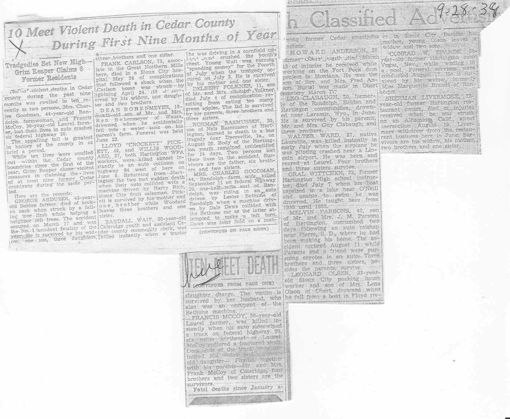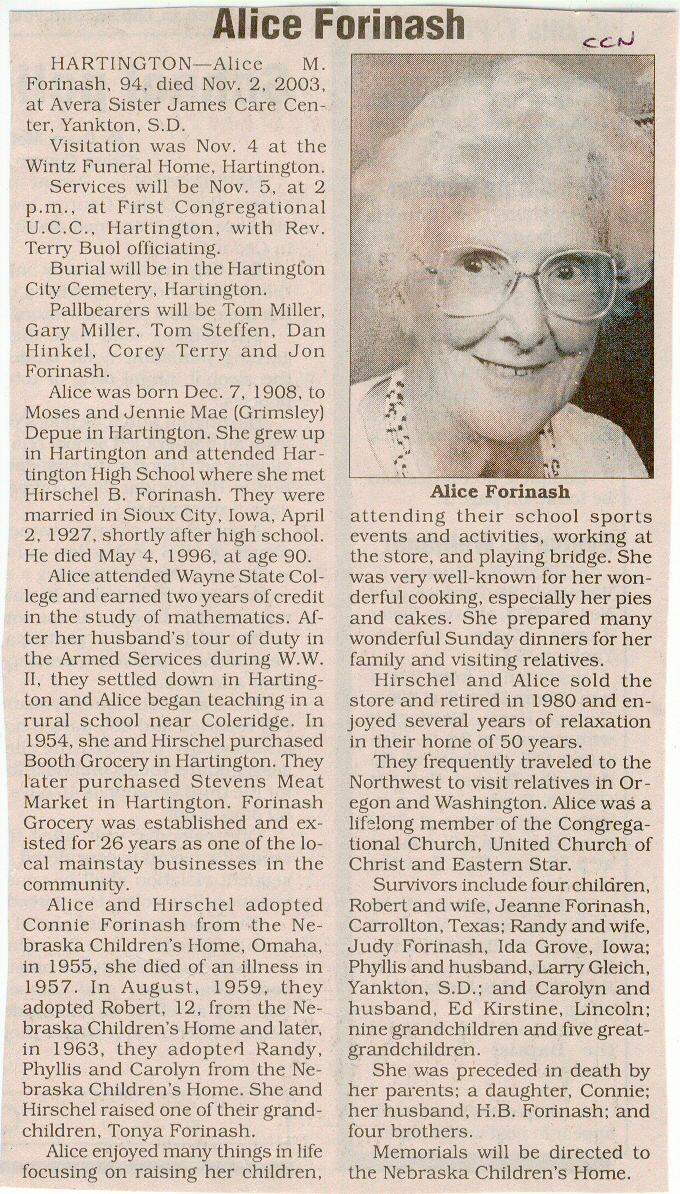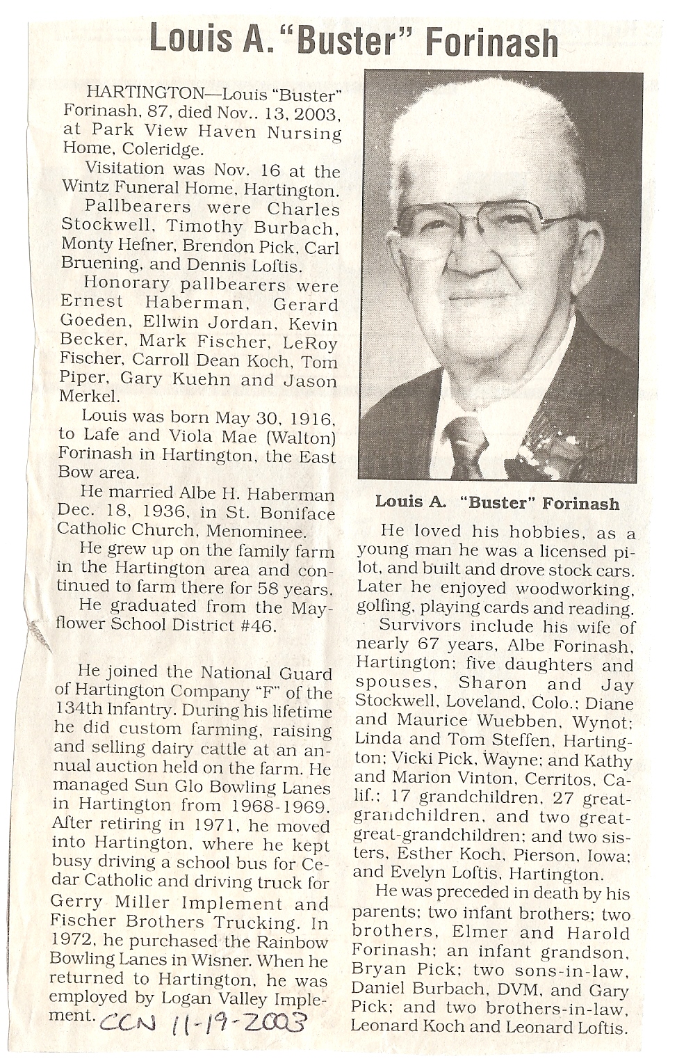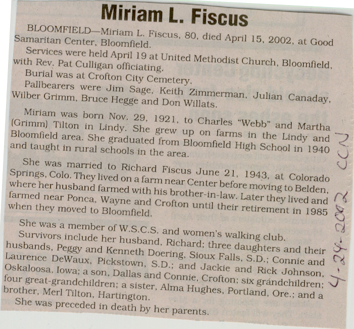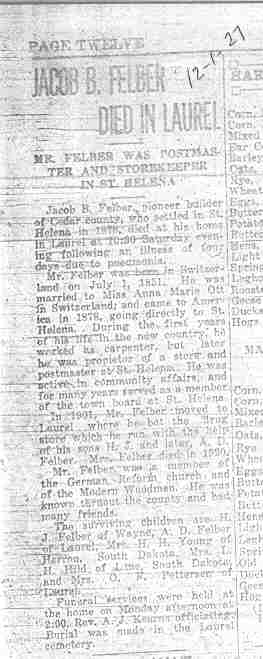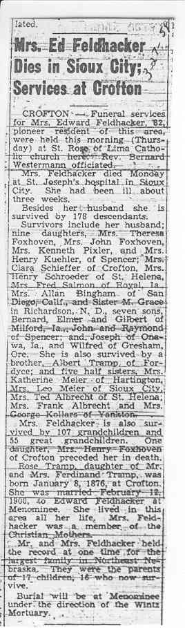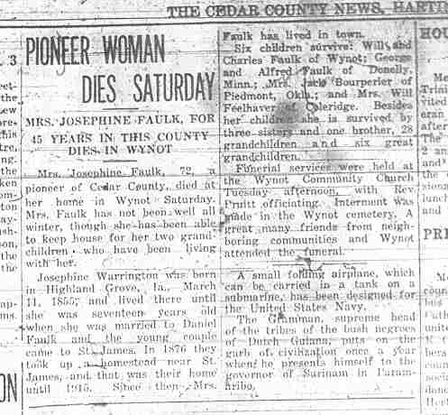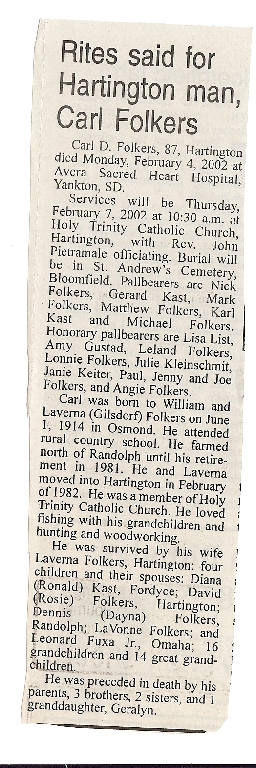 Cedar County, Nebraska Jump ahead to surnames: FAULK Josephine Warrington Published in: Cedar County News on February 24, 1927 FEAUTO Nelson Published in: Cedar County News on August 30, 1923 FEELHAVER Don Published in: Cedar County News on April 7, 2004 FEELHAVER Mrs. O.O. (nee Anderson) Published in: Cedar County News on October 18, 1918 FEELHAVER Mrs. William [Strobel] Published in: Cedar County News on March 27, 1927 FEELHAVER W.H. Published in: Cedar County News on January 7, 1929 FEILMEIER Justin Patrick Published in: Cedar County News in November 2003 FEILMEIER Rosemary C. Noecker Published in: Cedar County News on December 8, 2004 FEINER Anna Becker Published in: Cedar County News on April 11, 1958 FEINER William Published in: Cedar County News on February 23, 1939 FELBER Anna (Mrs.) Tribute A Tribute B Published in: Cedar County News on February 19, 1931 FELBER Anna Becker Died May 23, 1944 FELBER Daniel Published in: Cedar County News on December 22, 1910 FELBER Jacob Published in: Cedar County News on September 24, 1916 FELBER Jacob B. Published in: Cedar County News on December 1, 1927 FELDHACKER Barney A. Published in: Cedar County News in November 1998 FELDHACKER Pete E. Published in: Cedar County News on March 28, 1858 FELDHACKER Rose Tramp Published in: Cedar County News on March 27, 1958 FELDHACKER Theresa Ann Wubben Published in: Cedar County News on April 23, 2003 FERBER Charlotte Stuard Hay Hoover Published in: Cedar County News on May 31, 1923 FERBER Harry H. Published in: Cedar County News in March 1960 FERTIG Martha Griffith Published in: Wynot Tribune on September 11, 1955 FIELDING Sally Jeanne Fleury Published in: The Magnet Cemetery Directory by T. Korth FINLEY Lois Published in: Cedar County News on March 24, 1999 FINNEY Blanche S. Hirschman Published in: Cedar County News on March 24, 1999 FISCHER Bill Lee Published in: Cedar County News on October 20, 1999 FISCHER Edgar Fred Published in: Cedar County News on March 1, 2000 FISCHER Emery E. Published in: Cedar County News on February 9, 2000 FISCHER Fred Published in: Cedar County News on October 26, 1922 FISCHER Harold Published in: Wynot Tribune on June 1, 1950 Obit Image Published in: Wynot Tribune FISCHER Larry Dennis Published in: Cedar County News on October 22, 1975 FISCHER Ralph Joseph Published in: Cedar County News on March 9, 2005 FISCUS Cody Michael Published in: Cedar County News on July 2, 2003 FISCUS Fred Published in: Cedar County News on October 22, 1975 FISCUS Miriam L. Tilton Published in: Cedar County News on April 24, 2002 FISH Earl Published in: Cedar County News on November 10, 2004 FISH Robert D. Published in: Cedar County News on May 1, 2002 FISH Wayne L. Published in: Cedar County News on March 24, 1999 FISHER Louise Kramer Published in: Cedar County News on February 14, 1929 FLAUGH Douglas Verdel Published in: Cedar County News. Died: May 21, 2003 FLEGG William Henry Published in: Cedar County News on May 25, 1922 FLEMING Richard J. Published in: Cedar County News in July 2002 FLEURY G. Yvonne Chrisman "Sis" Published in: The Magnet Cemetery Directory by T. Korth FLEURY Leo Published in: The Magnet Cemetery Directory by T. Korth FLODEN Erika V. Nelson Published in: Cedar County News on March 9, 2005 FLORES Priscilla Ann Published in: Cedar County News on March 3, 2004 FLUENT Floyd E. Published in: Cedar County News on January 12, 2000 FOGELSONG Mrs. James [Riibe] Published in: Cedar County News on September 10, 1919 FOLKERS Carl D. Published in: Cedar County News in February 2002 FOLKERS Edna Viola Munds Published in: Cedar County News on May 25, 2005 FOLKNER Delbert Published in: Cedar County News on September 28, 1939 FORINASH Alice M. Depue Published in: Cedar County News in November 2003 FORINASH Louis "Buster" A. Published in: Cedar County News on November 19, 2003 FORINASH Viola Walton Published in: Cedar County News in January 1946 FOULK Daniel Published in: Hartington Herald on April 30, 1915 FOULK George E. Sr. Published in: Cedar County News on December 6, 1951 FOULK Harold Lester M. Published in: Cedar County News on October 10, 2001 FOULK Mary Published in: Cedar County News in May 1911 FOULKS Laura Josephine Kirk Published in: Cedar County News on October 1, 1975 FOX George M. Jr. Published in: Yankton Press & Dakotan on April 10, 2003 FOXHOVEN Alfred A. Published in: Cedar County News on April 5, 2000 FOXHOVEN Elmer Published in: Cedar County News in February 2003 FOXHOVEN Veronica Feldhacker Published in: Wynot Tribune on December 22, 1952 FRANKS Clara Porter Published in: Cedar County News on January 16, 1919 FRANZEN Meino L. Published in: Cedar County News on March 12, 2003 FRAZEE Richard Lyle Published in: Cedar County News on August 25, 2004 FREDERICKSON Clifford LeRoy Published in: Cedar County News on July 13, 2005 FRERICHS Minnie Harms Published in: Cedar County News on October 1, 1975 FRERICHS Verla Aagaard Published in: Cedar County News on November 13, 2002 FRIGGE Charlene Published in: Cedar County News in 1949 FRIGGE Frank Published in: Cedar County News on July 18, 1979 FRIGGE Joseph F. Published in: Cedar County News on April 21, 1976 FUELBERTH Eunice Luck Published in: Cedar County News on Novmeber 18, 1998 FUELBERTH Harold J. Published in: Cedar County News on October 23, 2002 FUESLER Janice Mainquist Published in: The Magnet Cemetery Directory by T. Korth FURNESS Geneva Black Published in: The Magnet Cemetery Directory by T. Korth FURNESS John W. Published in: The Magnet Cemetery Directory by T. Korth FURNESS John Wayne Published in: The Magnet Cemetery Directory by T. Korth FURNESS Lucinda Published in: The Magnet Cemetery Directory by T. Korth FURNESS Melvin Published in: The Magnet Cemetery Directory by T. Korth FURNESS Melvin J. Published in: The Magnet Cemetery Directory by T. Korth To submit an obituary, e-mail Carol Tramp,