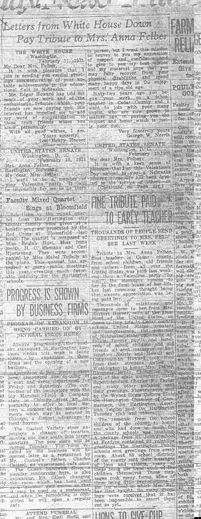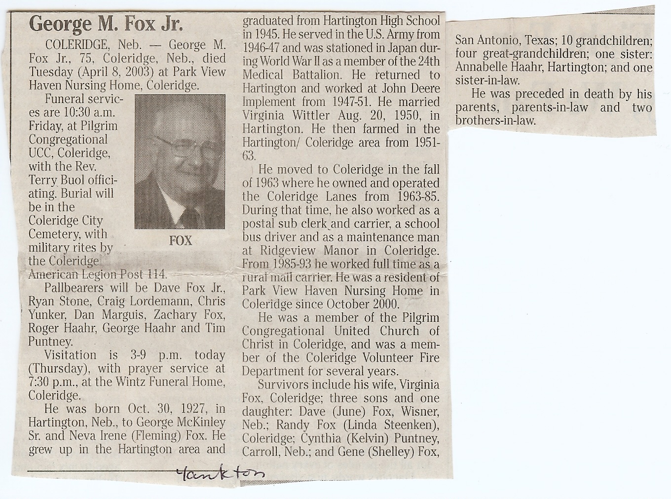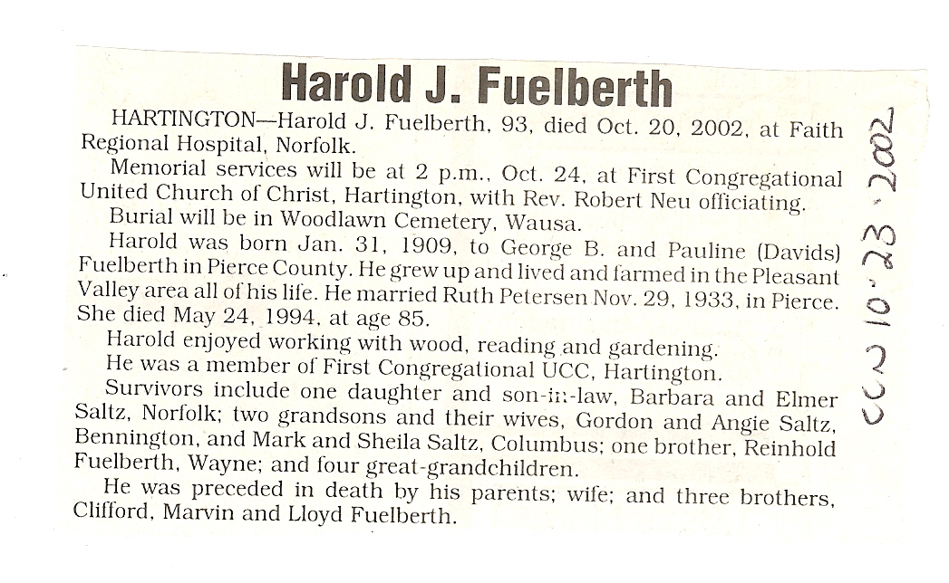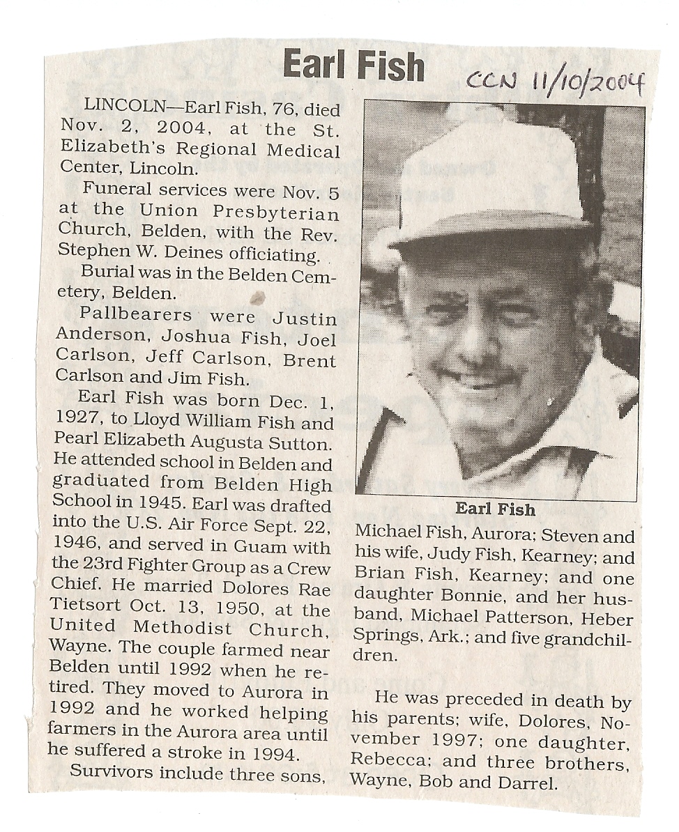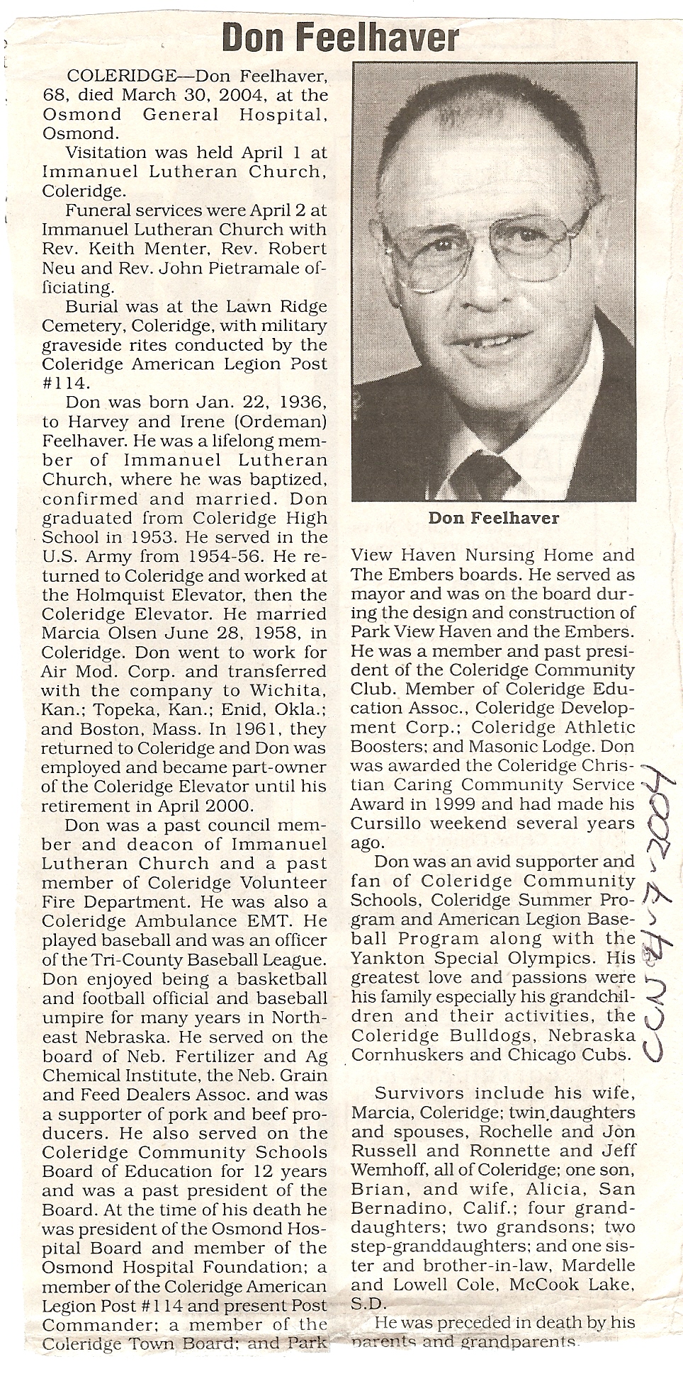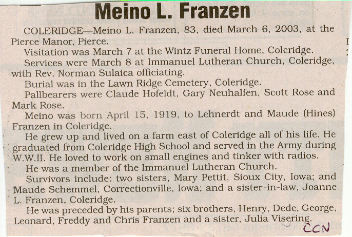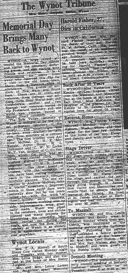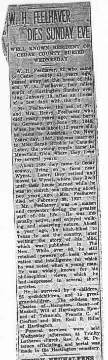 Cedar County, Nebraska Jump ahead to surnames: FAULK Josephine Warrington Published in: Cedar County News on February 24, 1927 FEAUTO Nelson Published in: Cedar County News on August 30, 1923 FEELHAVER Don Published in: Cedar County News on April 7, 2004 FEELHAVER Mrs. O.O. (nee Anderson) Published in: Cedar County News on October 18, 1918 FEELHAVER Mrs. William [Strobel] Published in: Cedar County News on March 27, 1927 FEELHAVER W.H. Published in: Cedar County News on January 7, 1929 FEILMEIER Justin Patrick Published in: Cedar County News in November 2003 FEILMEIER Rosemary C. Noecker Published in: Cedar County News on December 8, 2004 FEINER Anna Becker Published in: Cedar County News on April 11, 1958 FEINER William Published in: Cedar County News on February 23, 1939 FELBER Anna (Mrs.) Tribute A Tribute B Published in: Cedar County News on February 19, 1931 FELBER Anna Becker Died May 23, 1944 FELBER Daniel Published in: Cedar County News on December 22, 1910 FELBER Jacob Published in: Cedar County News on September 24, 1916 FELBER Jacob B. Published in: Cedar County News on December 1, 1927 FELDHACKER Barney A. Published in: Cedar County News in November 1998 FELDHACKER Pete E. Published in: Cedar County News on March 28, 1858 FELDHACKER Rose Tramp Published in: Cedar County News on March 27, 1958 FELDHACKER Theresa Ann Wubben Published in: Cedar County News on April 23, 2003 FERBER Charlotte Stuard Hay Hoover Published in: Cedar County News on May 31, 1923 FERBER Harry H. Published in: Cedar County News in March 1960 FERTIG Martha Griffith Published in: Wynot Tribune on September 11, 1955 FIELDING Sally Jeanne Fleury Published in: The Magnet Cemetery Directory by T. Korth FINLEY Lois Published in: Cedar County News on March 24, 1999 FINNEY Blanche S. Hirschman Published in: Cedar County News on March 24, 1999 FISCHER Bill Lee Published in: Cedar County News on October 20, 1999 FISCHER Edgar Fred Published in: Cedar County News on March 1, 2000 FISCHER Emery E. Published in: Cedar County News on February 9, 2000 FISCHER Fred Published in: Cedar County News on October 26, 1922 FISCHER Harold Published in: Wynot Tribune on June 1, 1950 Obit Image Published in: Wynot Tribune FISCHER Larry Dennis Published in: Cedar County News on October 22, 1975 FISCHER Ralph Joseph Published in: Cedar County News on March 9, 2005 FISCUS Cody Michael Published in: Cedar County News on July 2, 2003 FISCUS Fred Published in: Cedar County News on October 22, 1975 FISCUS Miriam L. Tilton Published in: Cedar County News on April 24, 2002 FISH Earl Published in: Cedar County News on November 10, 2004 FISH Robert D. Published in: Cedar County News on May 1, 2002 FISH Wayne L. Published in: Cedar County News on March 24, 1999 FISHER Louise Kramer Published in: Cedar County News on February 14, 1929 FLAUGH Douglas Verdel Published in: Cedar County News. Died: May 21, 2003 FLEGG William Henry Published in: Cedar County News on May 25, 1922 FLEMING Richard J. Published in: Cedar County News in July 2002 FLEURY G. Yvonne Chrisman "Sis" Published in: The Magnet Cemetery Directory by T. Korth FLEURY Leo Published in: The Magnet Cemetery Directory by T. Korth FLODEN Erika V. Nelson Published in: Cedar County News on March 9, 2005 FLORES Priscilla Ann Published in: Cedar County News on March 3, 2004 FLUENT Floyd E. Published in: Cedar County News on January 12, 2000 FOGELSONG Mrs. James [Riibe] Published in: Cedar County News on September 10, 1919 FOLKERS Carl D. Published in: Cedar County News in February 2002 FOLKERS Edna Viola Munds Published in: Cedar County News on May 25, 2005 FOLKNER Delbert Published in: Cedar County News on September 28, 1939 FORINASH Alice M. Depue Published in: Cedar County News in November 2003 FORINASH Louis "Buster" A. Published in: Cedar County News on November 19, 2003 FORINASH Viola Walton Published in: Cedar County News in January 1946 FOULK Daniel Published in: Hartington Herald on April 30, 1915 FOULK George E. Sr. Published in: Cedar County News on December 6, 1951 FOULK Harold Lester M. Published in: Cedar County News on October 10, 2001 FOULK Mary Published in: Cedar County News in May 1911 FOULKS Laura Josephine Kirk Published in: Cedar County News on October 1, 1975 FOX George M. Jr. Published in: Yankton Press & Dakotan on April 10, 2003 FOXHOVEN Alfred A. Published in: Cedar County News on April 5, 2000 FOXHOVEN Elmer Published in: Cedar County News in February 2003 FOXHOVEN Veronica Feldhacker Published in: Wynot Tribune on December 22, 1952 FRANKS Clara Porter Published in: Cedar County News on January 16, 1919 FRANZEN Meino L. Published in: Cedar County News on March 12, 2003 FRAZEE Richard Lyle Published in: Cedar County News on August 25, 2004 FREDERICKSON Clifford LeRoy Published in: Cedar County News on July 13, 2005 FRERICHS Minnie Harms Published in: Cedar County News on October 1, 1975 FRERICHS Verla Aagaard Published in: Cedar County News on November 13, 2002 FRIGGE Charlene Published in: Cedar County News in 1949 FRIGGE Frank Published in: Cedar County News on July 18, 1979 FRIGGE Joseph F. Published in: Cedar County News on April 21, 1976 FUELBERTH Eunice Luck Published in: Cedar County News on Novmeber 18, 1998 FUELBERTH Harold J. Published in: Cedar County News on October 23, 2002 FUESLER Janice Mainquist Published in: The Magnet Cemetery Directory by T. Korth FURNESS Geneva Black Published in: The Magnet Cemetery Directory by T. Korth FURNESS John W. Published in: The Magnet Cemetery Directory by T. Korth FURNESS John Wayne Published in: The Magnet Cemetery Directory by T. Korth FURNESS Lucinda Published in: The Magnet Cemetery Directory by T. Korth FURNESS Melvin Published in: The Magnet Cemetery Directory by T. Korth FURNESS Melvin J. Published in: The Magnet Cemetery Directory by T. Korth To submit an obituary, e-mail Carol Tramp,