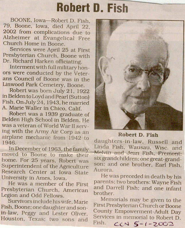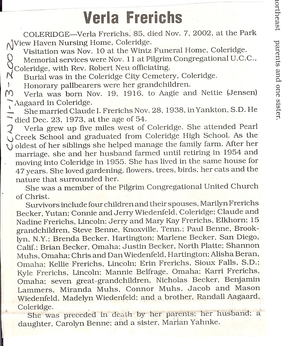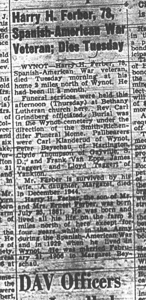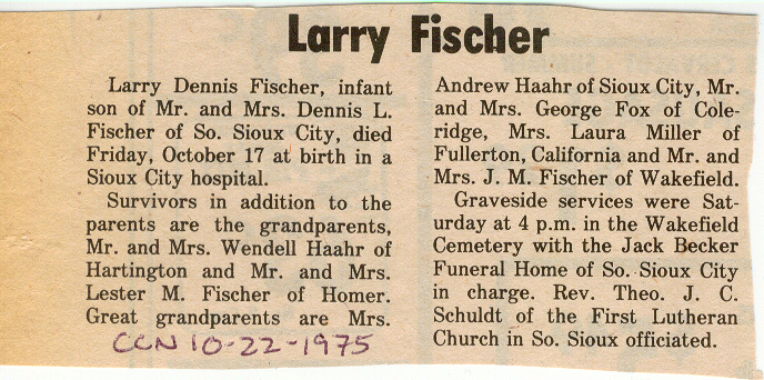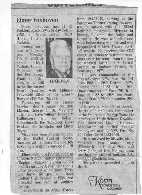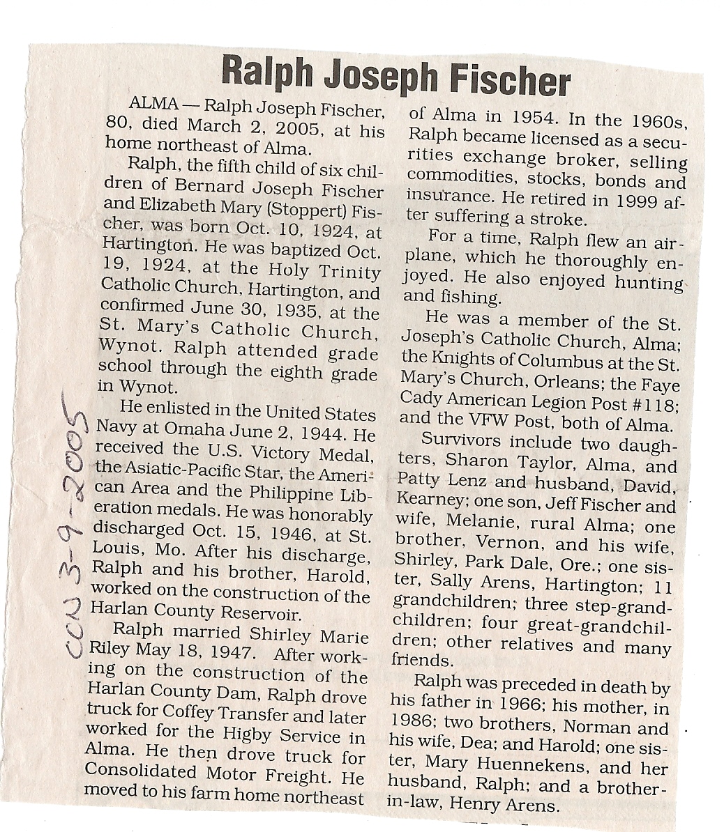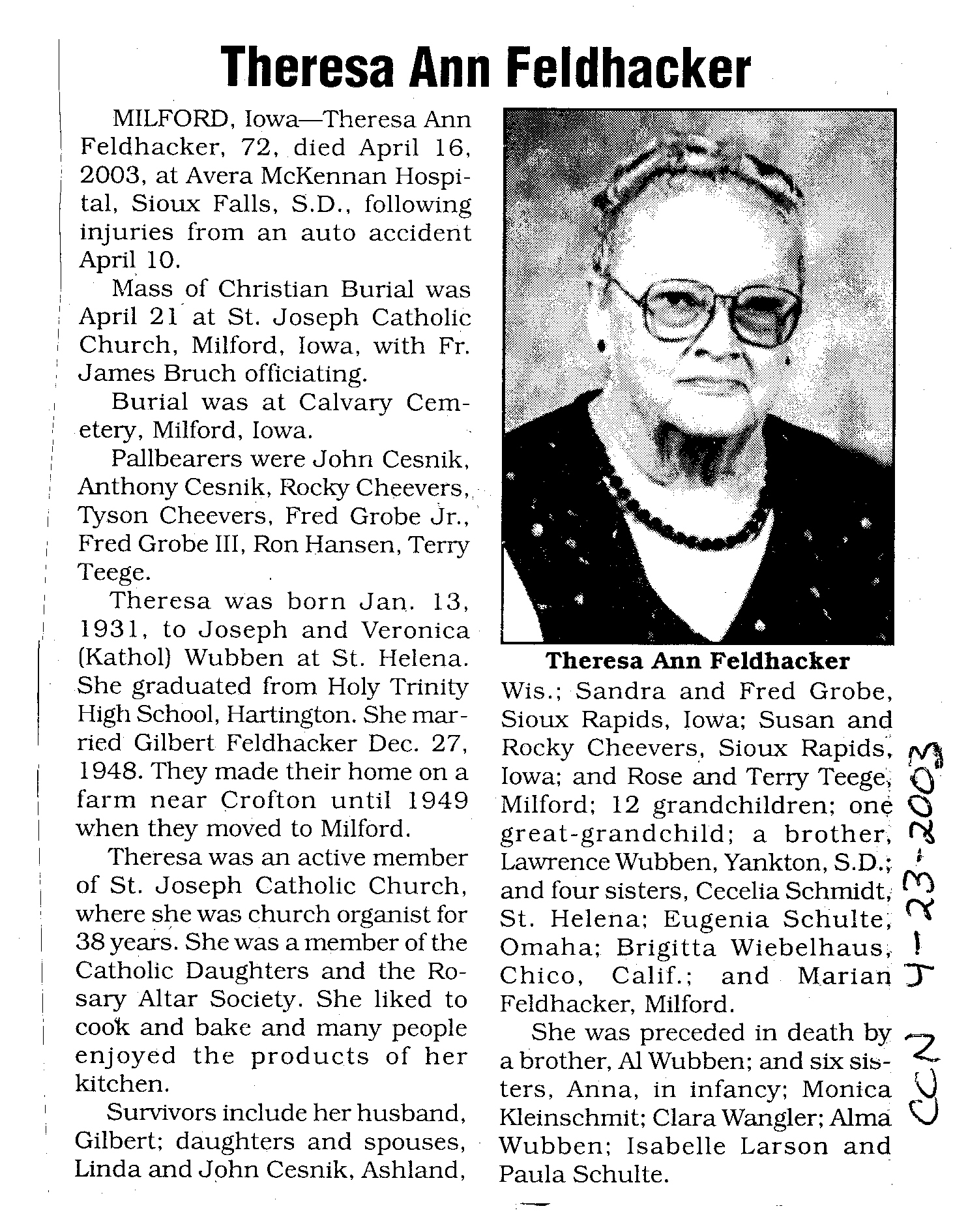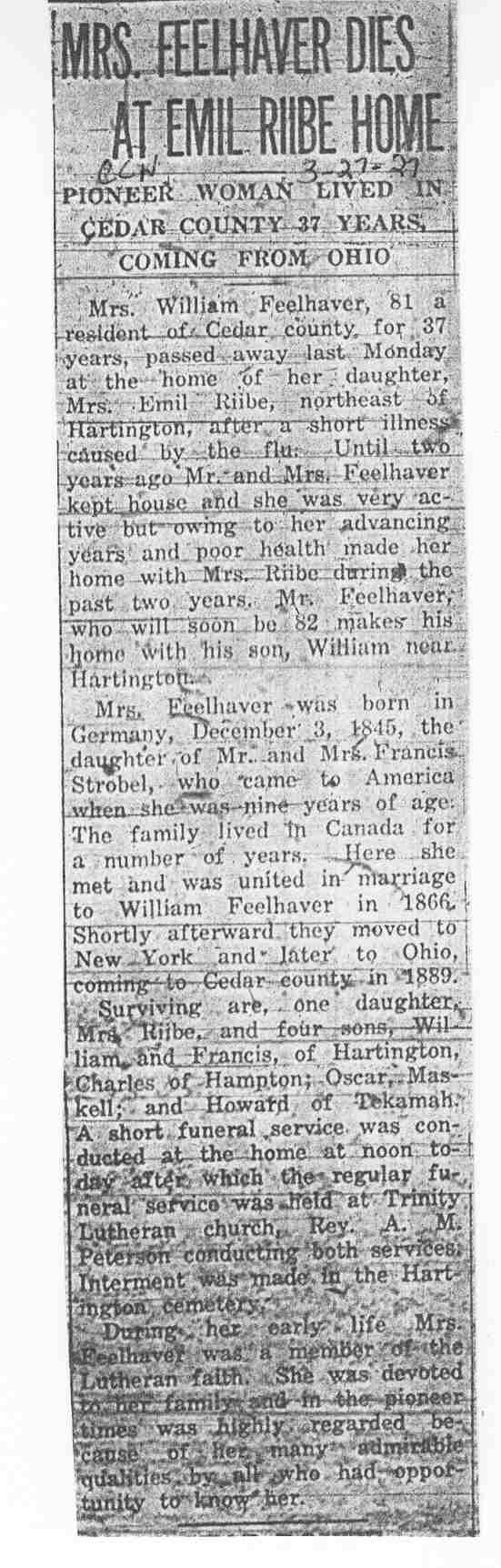 Cedar County, Nebraska Jump ahead to surnames: FAULK Josephine Warrington Published in: Cedar County News on February 24, 1927 FEAUTO Nelson Published in: Cedar County News on August 30, 1923 FEELHAVER Don Published in: Cedar County News on April 7, 2004 FEELHAVER Mrs. O.O. (nee Anderson) Published in: Cedar County News on October 18, 1918 FEELHAVER Mrs. William [Strobel] Published in: Cedar County News on March 27, 1927 FEELHAVER W.H. Published in: Cedar County News on January 7, 1929 FEILMEIER Justin Patrick Published in: Cedar County News in November 2003 FEILMEIER Rosemary C. Noecker Published in: Cedar County News on December 8, 2004 FEINER Anna Becker Published in: Cedar County News on April 11, 1958 FEINER William Published in: Cedar County News on February 23, 1939 FELBER Anna (Mrs.) Tribute A Tribute B Published in: Cedar County News on February 19, 1931 FELBER Anna Becker Died May 23, 1944 FELBER Daniel Published in: Cedar County News on December 22, 1910 FELBER Jacob Published in: Cedar County News on September 24, 1916 FELBER Jacob B. Published in: Cedar County News on December 1, 1927 FELDHACKER Barney A. Published in: Cedar County News in November 1998 FELDHACKER Pete E. Published in: Cedar County News on March 28, 1858 FELDHACKER Rose Tramp Published in: Cedar County News on March 27, 1958 FELDHACKER Theresa Ann Wubben Published in: Cedar County News on April 23, 2003 FERBER Charlotte Stuard Hay Hoover Published in: Cedar County News on May 31, 1923 FERBER Harry H. Published in: Cedar County News in March 1960 FERTIG Martha Griffith Published in: Wynot Tribune on September 11, 1955 FIELDING Sally Jeanne Fleury Published in: The Magnet Cemetery Directory by T. Korth FINLEY Lois Published in: Cedar County News on March 24, 1999 FINNEY Blanche S. Hirschman Published in: Cedar County News on March 24, 1999 FISCHER Bill Lee Published in: Cedar County News on October 20, 1999 FISCHER Edgar Fred Published in: Cedar County News on March 1, 2000 FISCHER Emery E. Published in: Cedar County News on February 9, 2000 FISCHER Fred Published in: Cedar County News on October 26, 1922 FISCHER Harold Published in: Wynot Tribune on June 1, 1950 Obit Image Published in: Wynot Tribune FISCHER Larry Dennis Published in: Cedar County News on October 22, 1975 FISCHER Ralph Joseph Published in: Cedar County News on March 9, 2005 FISCUS Cody Michael Published in: Cedar County News on July 2, 2003 FISCUS Fred Published in: Cedar County News on October 22, 1975 FISCUS Miriam L. Tilton Published in: Cedar County News on April 24, 2002 FISH Earl Published in: Cedar County News on November 10, 2004 FISH Robert D. Published in: Cedar County News on May 1, 2002 FISH Wayne L. Published in: Cedar County News on March 24, 1999 FISHER Louise Kramer Published in: Cedar County News on February 14, 1929 FLAUGH Douglas Verdel Published in: Cedar County News. Died: May 21, 2003 FLEGG William Henry Published in: Cedar County News on May 25, 1922 FLEMING Richard J. Published in: Cedar County News in July 2002 FLEURY G. Yvonne Chrisman "Sis" Published in: The Magnet Cemetery Directory by T. Korth FLEURY Leo Published in: The Magnet Cemetery Directory by T. Korth FLODEN Erika V. Nelson Published in: Cedar County News on March 9, 2005 FLORES Priscilla Ann Published in: Cedar County News on March 3, 2004 FLUENT Floyd E. Published in: Cedar County News on January 12, 2000 FOGELSONG Mrs. James [Riibe] Published in: Cedar County News on September 10, 1919 FOLKERS Carl D. Published in: Cedar County News in February 2002 FOLKERS Edna Viola Munds Published in: Cedar County News on May 25, 2005 FOLKNER Delbert Published in: Cedar County News on September 28, 1939 FORINASH Alice M. Depue Published in: Cedar County News in November 2003 FORINASH Louis "Buster" A. Published in: Cedar County News on November 19, 2003 FORINASH Viola Walton Published in: Cedar County News in January 1946 FOULK Daniel Published in: Hartington Herald on April 30, 1915 FOULK George E. Sr. Published in: Cedar County News on December 6, 1951 FOULK Harold Lester M. Published in: Cedar County News on October 10, 2001 FOULK Mary Published in: Cedar County News in May 1911 FOULKS Laura Josephine Kirk Published in: Cedar County News on October 1, 1975 FOX George M. Jr. Published in: Yankton Press & Dakotan on April 10, 2003 FOXHOVEN Alfred A. Published in: Cedar County News on April 5, 2000 FOXHOVEN Elmer Published in: Cedar County News in February 2003 FOXHOVEN Veronica Feldhacker Published in: Wynot Tribune on December 22, 1952 FRANKS Clara Porter Published in: Cedar County News on January 16, 1919 FRANZEN Meino L. Published in: Cedar County News on March 12, 2003 FRAZEE Richard Lyle Published in: Cedar County News on August 25, 2004 FREDERICKSON Clifford LeRoy Published in: Cedar County News on July 13, 2005 FRERICHS Minnie Harms Published in: Cedar County News on October 1, 1975 FRERICHS Verla Aagaard Published in: Cedar County News on November 13, 2002 FRIGGE Charlene Published in: Cedar County News in 1949 FRIGGE Frank Published in: Cedar County News on July 18, 1979 FRIGGE Joseph F. Published in: Cedar County News on April 21, 1976 FUELBERTH Eunice Luck Published in: Cedar County News on Novmeber 18, 1998 FUELBERTH Harold J. Published in: Cedar County News on October 23, 2002 FUESLER Janice Mainquist Published in: The Magnet Cemetery Directory by T. Korth FURNESS Geneva Black Published in: The Magnet Cemetery Directory by T. Korth FURNESS John W. Published in: The Magnet Cemetery Directory by T. Korth FURNESS John Wayne Published in: The Magnet Cemetery Directory by T. Korth FURNESS Lucinda Published in: The Magnet Cemetery Directory by T. Korth FURNESS Melvin Published in: The Magnet Cemetery Directory by T. Korth FURNESS Melvin J. Published in: The Magnet Cemetery Directory by T. Korth To submit an obituary, e-mail Carol Tramp,