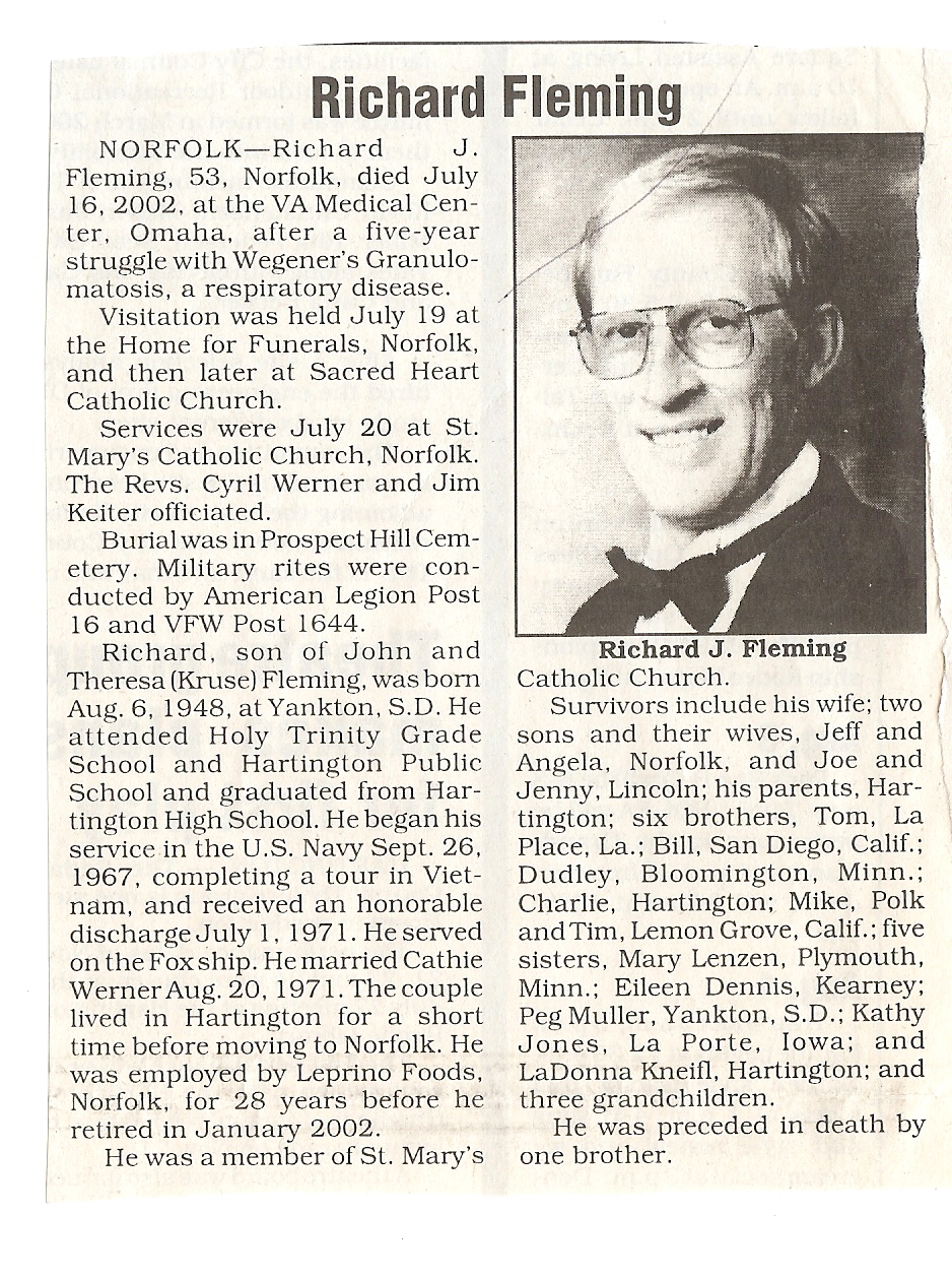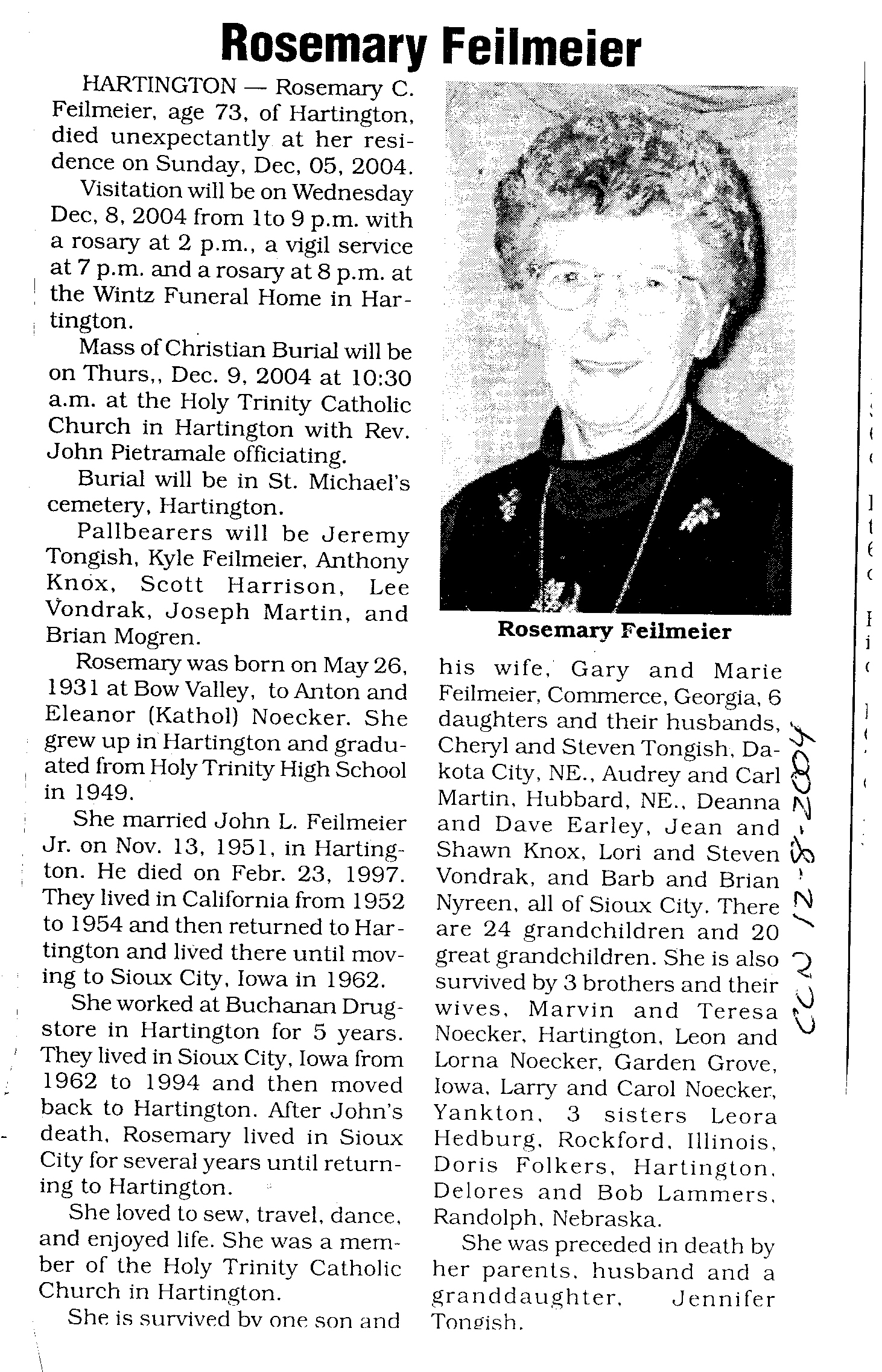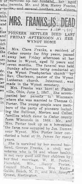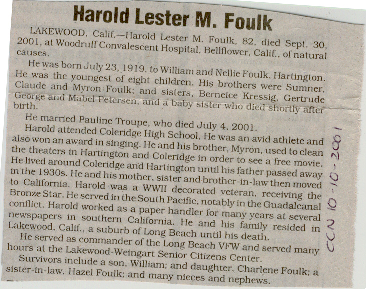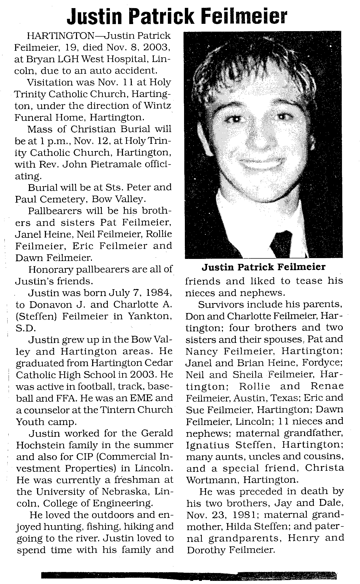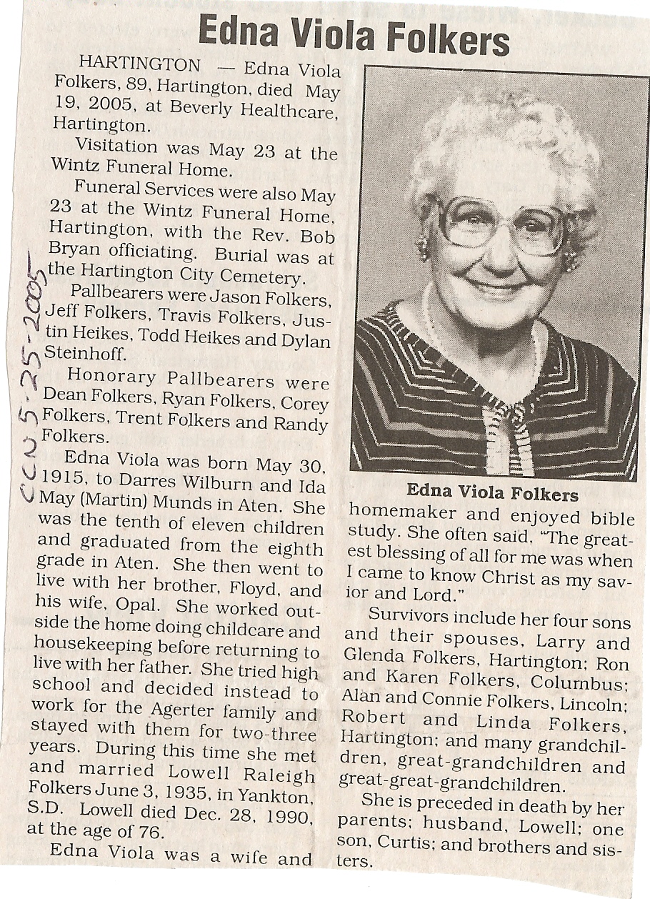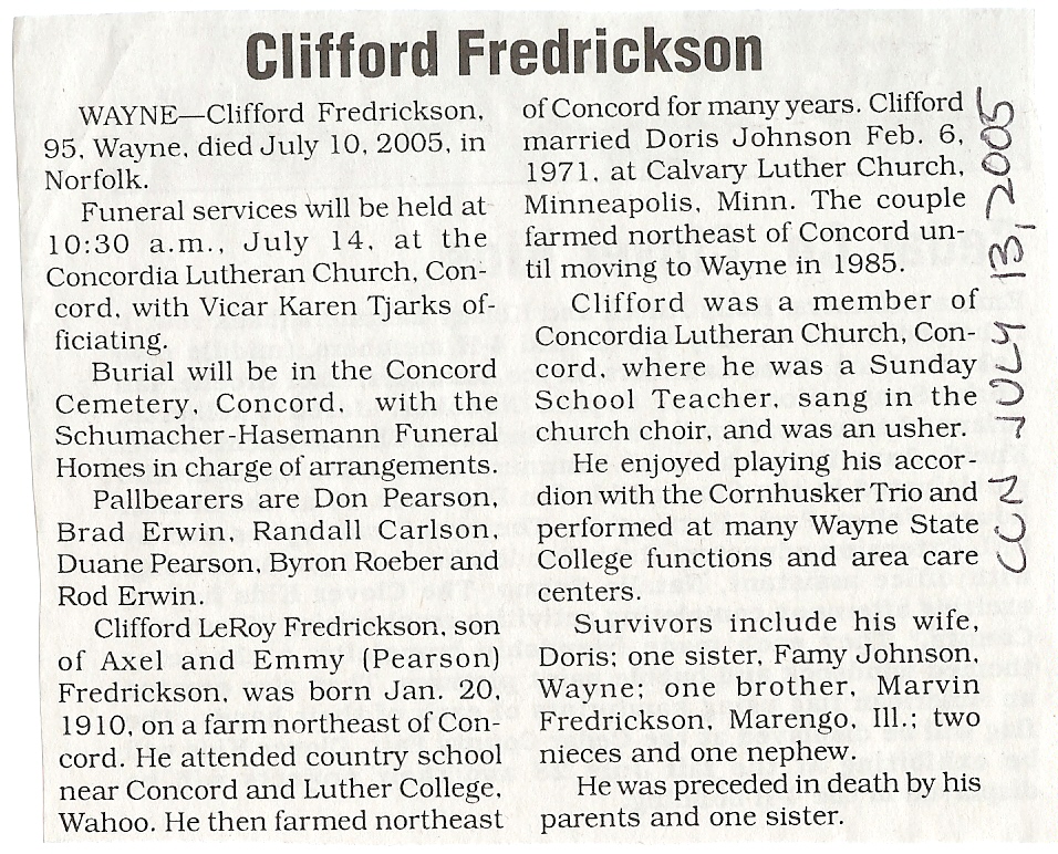 Cedar County, Nebraska Jump ahead to surnames: FAULK Josephine Warrington Published in: Cedar County News on February 24, 1927 FEAUTO Nelson Published in: Cedar County News on August 30, 1923 FEELHAVER Don Published in: Cedar County News on April 7, 2004 FEELHAVER Mrs. O.O. (nee Anderson) Published in: Cedar County News on October 18, 1918 FEELHAVER Mrs. William [Strobel] Published in: Cedar County News on March 27, 1927 FEELHAVER W.H. Published in: Cedar County News on January 7, 1929 FEILMEIER Justin Patrick Published in: Cedar County News in November 2003 FEILMEIER Rosemary C. Noecker Published in: Cedar County News on December 8, 2004 FEINER Anna Becker Published in: Cedar County News on April 11, 1958 FEINER William Published in: Cedar County News on February 23, 1939 FELBER Anna (Mrs.) Tribute A Tribute B Published in: Cedar County News on February 19, 1931 FELBER Anna Becker Died May 23, 1944 FELBER Daniel Published in: Cedar County News on December 22, 1910 FELBER Jacob Published in: Cedar County News on September 24, 1916 FELBER Jacob B. Published in: Cedar County News on December 1, 1927 FELDHACKER Barney A. Published in: Cedar County News in November 1998 FELDHACKER Pete E. Published in: Cedar County News on March 28, 1858 FELDHACKER Rose Tramp Published in: Cedar County News on March 27, 1958 FELDHACKER Theresa Ann Wubben Published in: Cedar County News on April 23, 2003 FERBER Charlotte Stuard Hay Hoover Published in: Cedar County News on May 31, 1923 FERBER Harry H. Published in: Cedar County News in March 1960 FERTIG Martha Griffith Published in: Wynot Tribune on September 11, 1955 FIELDING Sally Jeanne Fleury Published in: The Magnet Cemetery Directory by T. Korth FINLEY Lois Published in: Cedar County News on March 24, 1999 FINNEY Blanche S. Hirschman Published in: Cedar County News on March 24, 1999 FISCHER Bill Lee Published in: Cedar County News on October 20, 1999 FISCHER Edgar Fred Published in: Cedar County News on March 1, 2000 FISCHER Emery E. Published in: Cedar County News on February 9, 2000 FISCHER Fred Published in: Cedar County News on October 26, 1922 FISCHER Harold Published in: Wynot Tribune on June 1, 1950 Obit Image Published in: Wynot Tribune FISCHER Larry Dennis Published in: Cedar County News on October 22, 1975 FISCHER Ralph Joseph Published in: Cedar County News on March 9, 2005 FISCUS Cody Michael Published in: Cedar County News on July 2, 2003 FISCUS Fred Published in: Cedar County News on October 22, 1975 FISCUS Miriam L. Tilton Published in: Cedar County News on April 24, 2002 FISH Earl Published in: Cedar County News on November 10, 2004 FISH Robert D. Published in: Cedar County News on May 1, 2002 FISH Wayne L. Published in: Cedar County News on March 24, 1999 FISHER Louise Kramer Published in: Cedar County News on February 14, 1929 FLAUGH Douglas Verdel Published in: Cedar County News. Died: May 21, 2003 FLEGG William Henry Published in: Cedar County News on May 25, 1922 FLEMING Richard J. Published in: Cedar County News in July 2002 FLEURY G. Yvonne Chrisman "Sis" Published in: The Magnet Cemetery Directory by T. Korth FLEURY Leo Published in: The Magnet Cemetery Directory by T. Korth FLODEN Erika V. Nelson Published in: Cedar County News on March 9, 2005 FLORES Priscilla Ann Published in: Cedar County News on March 3, 2004 FLUENT Floyd E. Published in: Cedar County News on January 12, 2000 FOGELSONG Mrs. James [Riibe] Published in: Cedar County News on September 10, 1919 FOLKERS Carl D. Published in: Cedar County News in February 2002 FOLKERS Edna Viola Munds Published in: Cedar County News on May 25, 2005 FOLKNER Delbert Published in: Cedar County News on September 28, 1939 FORINASH Alice M. Depue Published in: Cedar County News in November 2003 FORINASH Louis "Buster" A. Published in: Cedar County News on November 19, 2003 FORINASH Viola Walton Published in: Cedar County News in January 1946 FOULK Daniel Published in: Hartington Herald on April 30, 1915 FOULK George E. Sr. Published in: Cedar County News on December 6, 1951 FOULK Harold Lester M. Published in: Cedar County News on October 10, 2001 FOULK Mary Published in: Cedar County News in May 1911 FOULKS Laura Josephine Kirk Published in: Cedar County News on October 1, 1975 FOX George M. Jr. Published in: Yankton Press & Dakotan on April 10, 2003 FOXHOVEN Alfred A. Published in: Cedar County News on April 5, 2000 FOXHOVEN Elmer Published in: Cedar County News in February 2003 FOXHOVEN Veronica Feldhacker Published in: Wynot Tribune on December 22, 1952 FRANKS Clara Porter Published in: Cedar County News on January 16, 1919 FRANZEN Meino L. Published in: Cedar County News on March 12, 2003 FRAZEE Richard Lyle Published in: Cedar County News on August 25, 2004 FREDERICKSON Clifford LeRoy Published in: Cedar County News on July 13, 2005 FRERICHS Minnie Harms Published in: Cedar County News on October 1, 1975 FRERICHS Verla Aagaard Published in: Cedar County News on November 13, 2002 FRIGGE Charlene Published in: Cedar County News in 1949 FRIGGE Frank Published in: Cedar County News on July 18, 1979 FRIGGE Joseph F. Published in: Cedar County News on April 21, 1976 FUELBERTH Eunice Luck Published in: Cedar County News on Novmeber 18, 1998 FUELBERTH Harold J. Published in: Cedar County News on October 23, 2002 FUESLER Janice Mainquist Published in: The Magnet Cemetery Directory by T. Korth FURNESS Geneva Black Published in: The Magnet Cemetery Directory by T. Korth FURNESS John W. Published in: The Magnet Cemetery Directory by T. Korth FURNESS John Wayne Published in: The Magnet Cemetery Directory by T. Korth FURNESS Lucinda Published in: The Magnet Cemetery Directory by T. Korth FURNESS Melvin Published in: The Magnet Cemetery Directory by T. Korth FURNESS Melvin J. Published in: The Magnet Cemetery Directory by T. Korth To submit an obituary, e-mail Carol Tramp,