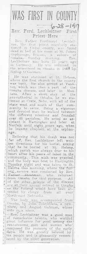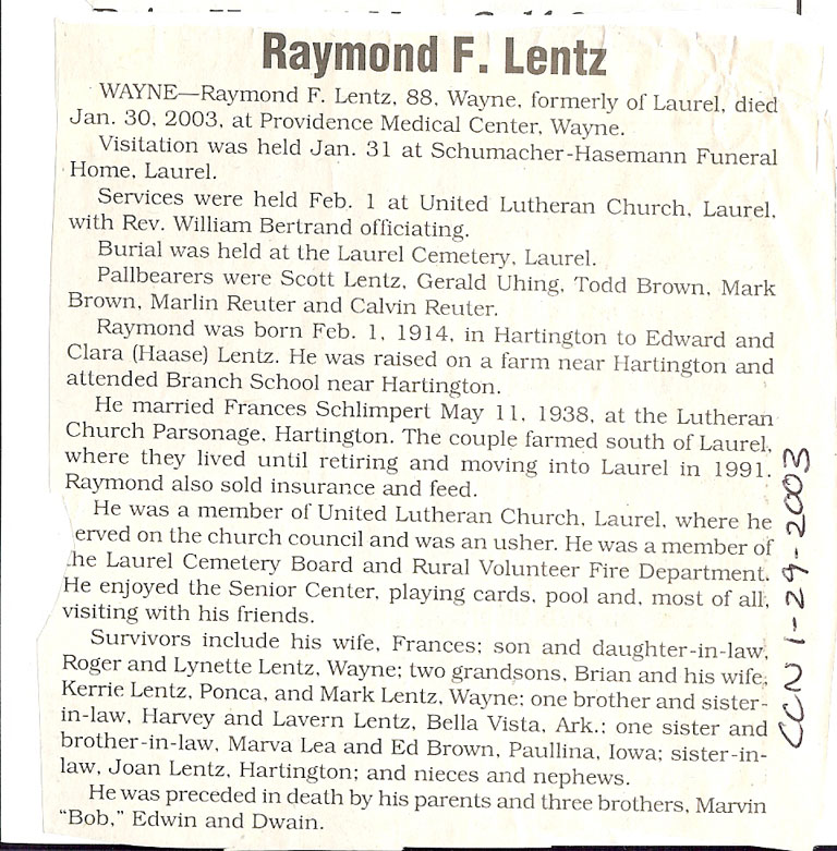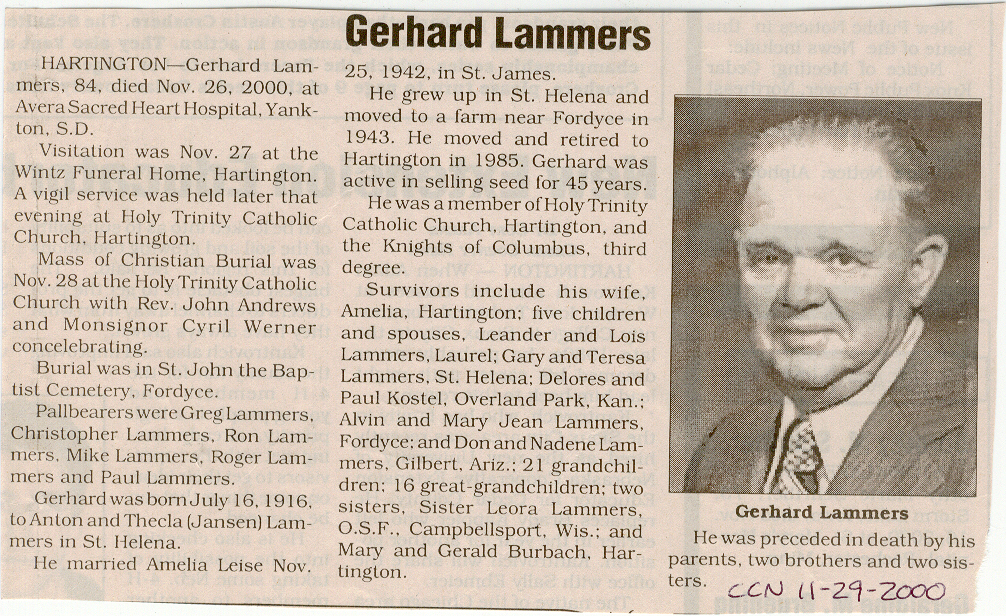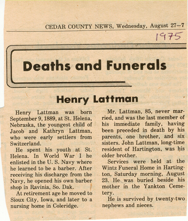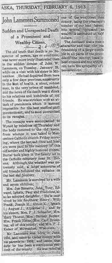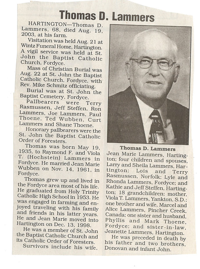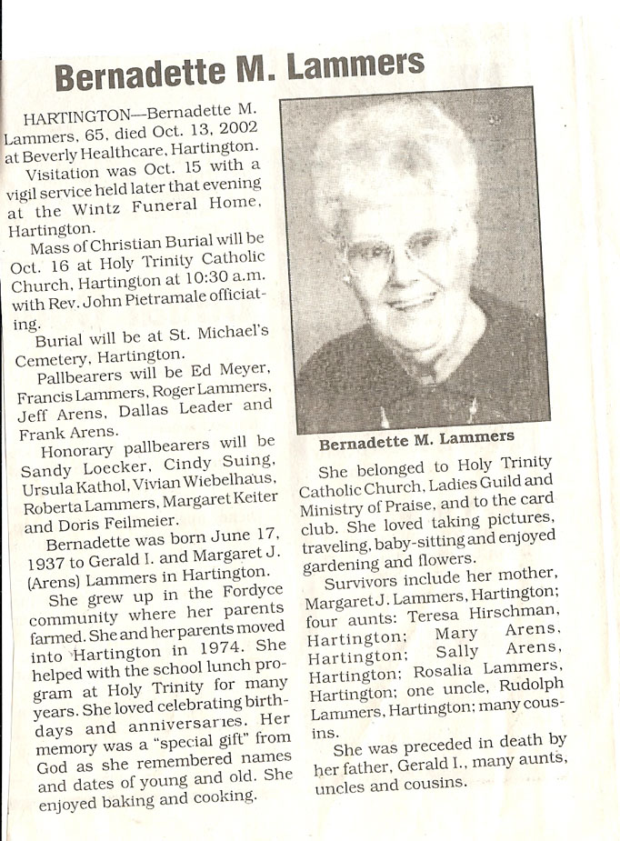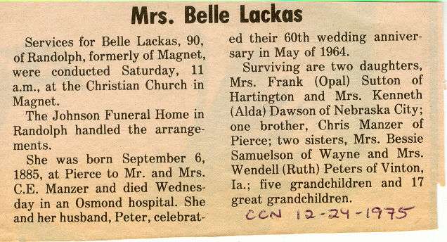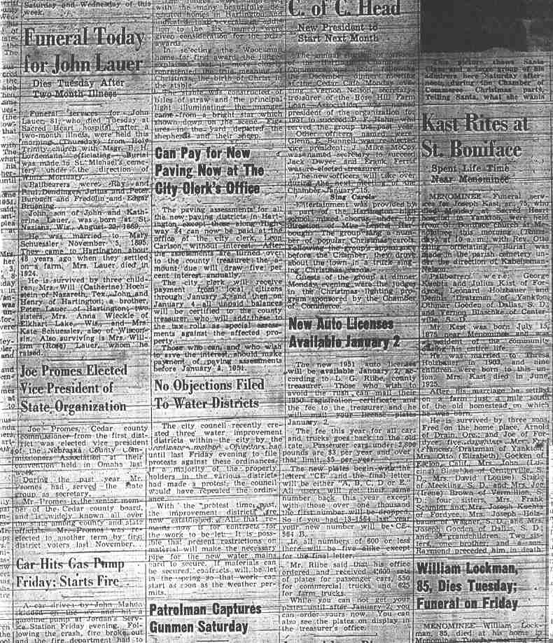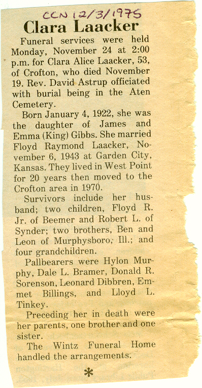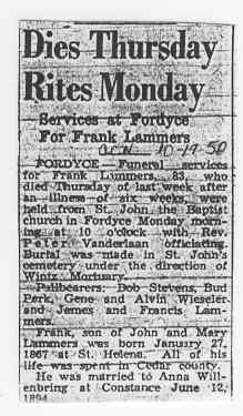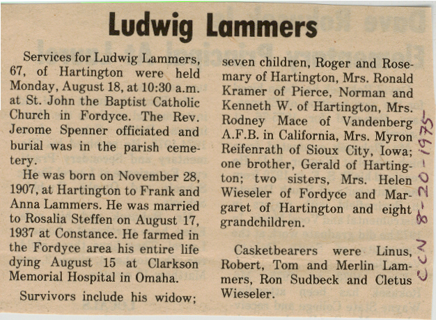 Cedar County, Nebraska Jump ahead to surnames: LAACKER Clara Alice Gibbs Published in: Cedar County News on December 3, 1975 LACKAS Belle Manzer Published in: Cedar County News on December 24, 1975 LACKAS Belle Manzer Published in: The Magnet Cemetery Directory by T. Korth LACKAS Monty G. Published in: The Magnet Cemetery Directory by T. Korth LACKAS Peter R. Published in: The Magnet Cemetery Directory by T. Korth LACKAS Wayne K. Published in: The Magnet Cemetery Directory by T. Korth LaCROIX Mervin L. Published in: Cedar County News on August 6, 1975 LAMBING Hazel M. Slagle Published in: The Magnet Cemetery Directory by T. Korth LAMMERS Bernadette M. Published in: Cedar County News in October 2002 LAMMERS Bob Published in: Cedar County News on March 2, 2005 LAMMERS Charles F. Published in: Cedar County News on August 26, 1998 LAMMERS Edward Published in: Cedar County News on January 16, 1919 LAMMERS Frank Published in: Cedar County News on October 19, 1950 LAMMERS Frederick William Published in: Cedar County News on March 31, 1965 LAMMERS Gerhard Published in: Cedar County News on November 29, 2000 LAMMERS Gertrude Published in: Cedar County News on March 10, 1976 LAMMERS Gertrude E. Walz Published in: Cedar County News on October 30, 1974 LAMMERS Hildegarde T. Arens Published in: Cedar County News on November 17, 2004 LAMMERS Howard D. Published in: Cedar County News on May 22, 2002 LAMMERS John M. Published in: Cedar County News on October 6, 1999 LAMMERS John W. Published in: Wynot Tribune on February 6, 1913 LAMMERS Kate Killcullen Obit Image Published in: Cedar County News on September 29, 1910 LAMMERS Ludwig Published in: Cedar County News on August 20, 1975 LAMMERS Nancy J. Olson Published in: Cedar County News in July 2000 LAMMERS Thomas D. Published in: Cedar County News in August 2003 LAMMERS Viola T. Hochstein Published in: Cedar County News on February 9, 2005 LAND Jean Robacker O'Meara Published in: Cedar County News on December 26, 2001 LANDGREN Mark T. Published in: Cedar County News on June 16, 2004 LANE Baby Boy Published in: The Magnet Cemetery Directory by T. Korth LANE Hannah Newton Published in: Cedar County News on April 9, 2009 LANE Irene A. Pibal Published in: Cedar County News on June 18, 2003 LANE Jessie Patterson Published in: Cedar County News on January 3, 1952 LANG Lawrence Published in: Cedar County News on December 28, 1916 LANGE Christina Foecke Published in: Cedar County News in February 1934 LANGE Edward J. Published in: Cedar County News on March 10, 1960 LANGE Elizabeth Published in: Cedar County News on January 31, 1924 LANGE Elizabeth Heimes Published in: Cedar County News on May 26, 1948 LANGE Henry Published in: Cedar County News on May 3, 1913 LANGE Louis H. Published in: Cedar County News in December 1964 LANGE Rose Bernadette Meirose Published in: Cedar County News in December 1951 LANGEMEIER James LeRoy Published in: Cedar County News on December 31, 2003 LANGFERMAN Bernard Published in: Cedar County News. Date of Publication/Death: Mar. 29, 1928 LANGFERMAN Martha Elizabeth Sudbeck Published in: Cedar County News on January 7, 1976 LANGFERMAN Rose Marie Thoene Published in: Cedar County News on March 24, 2004 LANPHEAR Charles E. Published in: Hartington Herald on May 10, 1928 LANPHEAR Emaline Winterringer Published in: Cedar County News on February 18, 1937 LANSER Frank L. Published in: Cedar County News on July 7, 2004 LARSEN Laura M. Published in: The Magnet Cemetery Directory by T. Korth LARSON William R. Published in: Cedar County News on November 24, 2004 LATTMAN Henry Published in: Cedar County News on August 27, 1975 LATTMAN Jacob Published in: Wynot Tribune on November 23, 1914 LAUER Donald H. Published in: Cedar County News on July 4, 2001 LAUER Grace Published in: Cedar County News on September 13, 1930 LAUER John Published in: Cedar County News. LAUER Rose Doherty Published in: Cedar County News in July 2002 LAUVER Judge Ephraim Published in: Cedar County News on April 22, 1926 LAWSON Christopher Published in: Cedar County News on August 23, 1923 LEADER John Published in: Cedar County News on January 28, 1926 LEADER Marjorie A. Kuehn Obit Image Published in: Cedar County News on January 31, 2001 LEADER Marjorie A. Kuehn Published in: Crofton Journal on February 1, 2001 LEAMY Shirley Hassmann Published in: Cedar County News on June 29, 2005 LEAPLEY Richard H. "Rick" Published in: Cedar County News on November 18, 1998 LECHLEITNER Ferdinand (Reverend) Published in: Cedar County News on June 28, 1917 LECKLER Arley Frederick Published in: The Magnet Cemetery Directory by T. Korth LECKLER Ethel Baker Published in: The Magnet Cemetery Directory by T. Korth LECKLER Fred Published in: The Magnet Cemetery Directory by T. Korth LECKLER Irma Dora Published in: The Magnet Cemetery Directory by T. Korth LECKLER Virgie Mae Published in: The Magnet Cemetery Directory by T. Korth LeCLAIR Dolores Veronica Koch Published in: Cedar County News on October 3, 2001 LEENER Charles J. Published in: The Magnet Cemetery Directory by T. Korth LEISE Bernadine Peitz Published in: Cedar County News on November 20, 1952 LEISE Julia M. Uhing Published in: Cedar County News on November 28, 2001 LEISE Marvin D. "Butch" Published in: Cedar County News on December 21, 2001 LENIHAN Hannah McDevitt Published in: Cedar County News on May 3, 1923 LENTZ Marvin "Bob" Obit Image Published in: Cedar County News on January 31, 2001 LENTZ Raymond F. Published in: Cedar County News on January 29, 2003 LENZEN Anna Marie Published in: Cedar County News on October 16, 1919 LENZEN Mary Weibel Published in: Cedar County News on January 8, 1953 LEVY Billie B. Clausen Published in: The Magnet Cemetery Directory by T. Korth LEWIS Harry A. "Hal" Jr. Published in: Cedar County News on February 18, 2004 LEWIS Madelaine "BooBoo" Published in: Cedar County News on August 24, 2005 LEWIS Michael Published in: Cedar County News on December 24, 1975 LIENEMANN Baby Published in: The Magnet Cemet