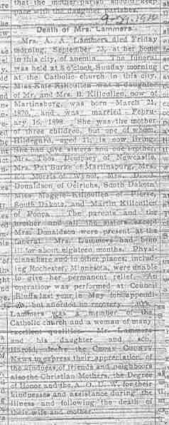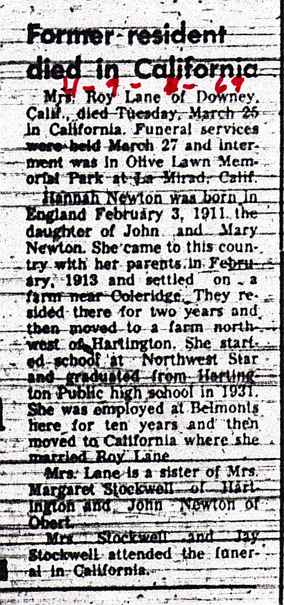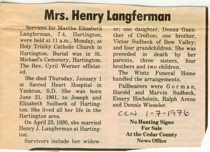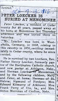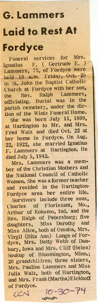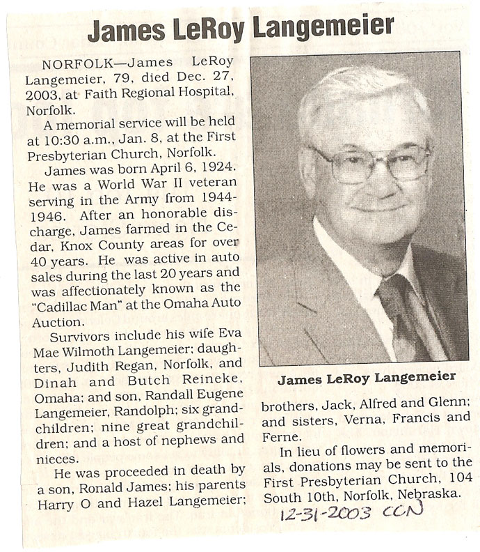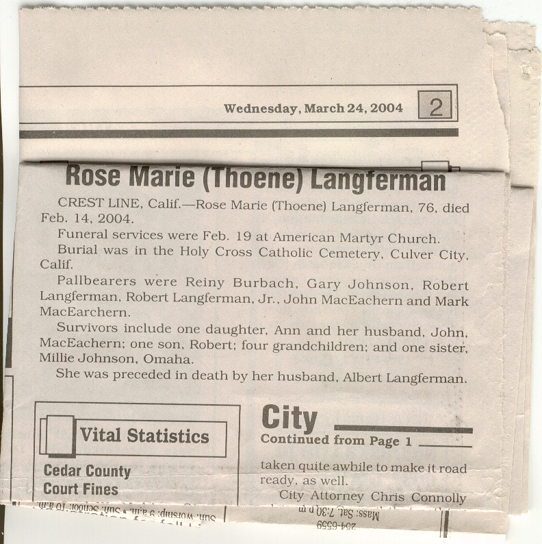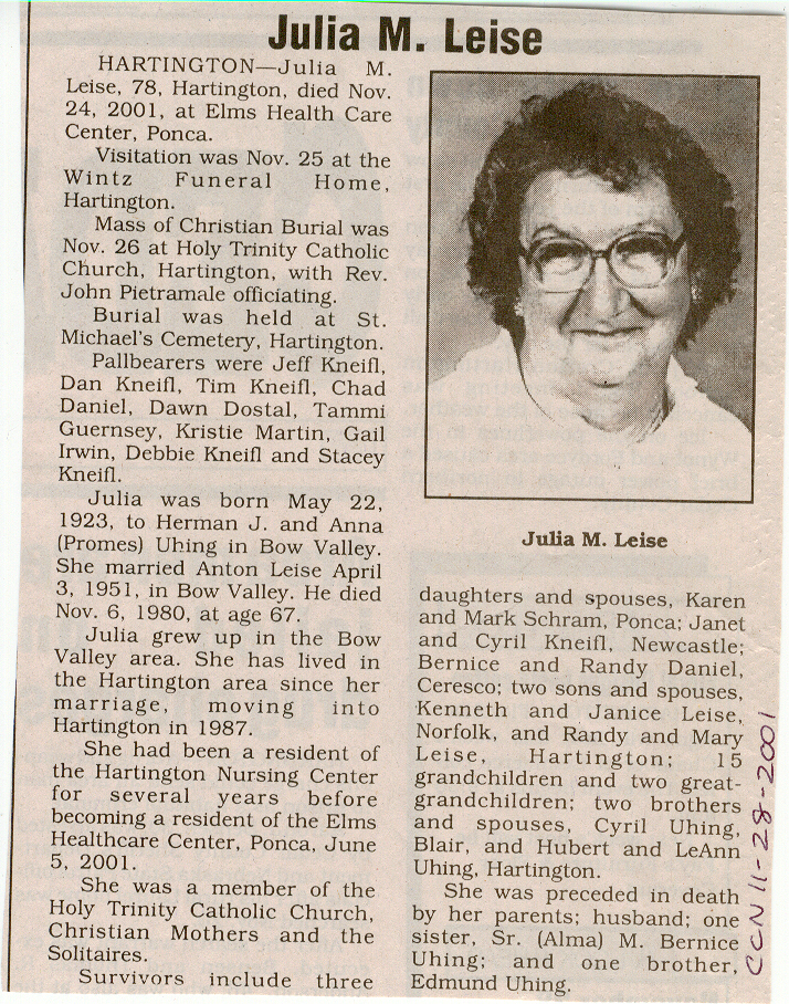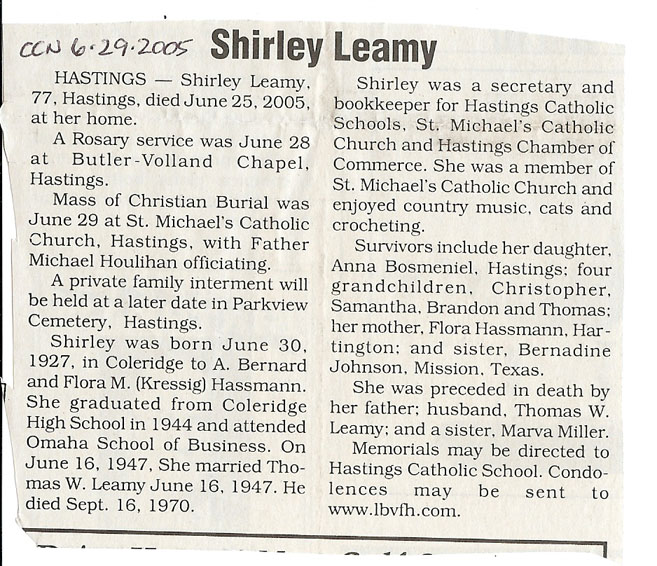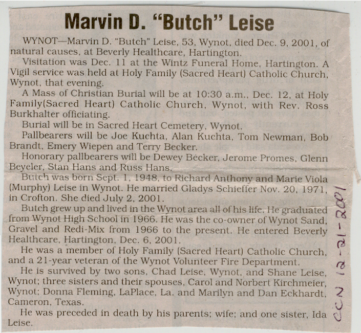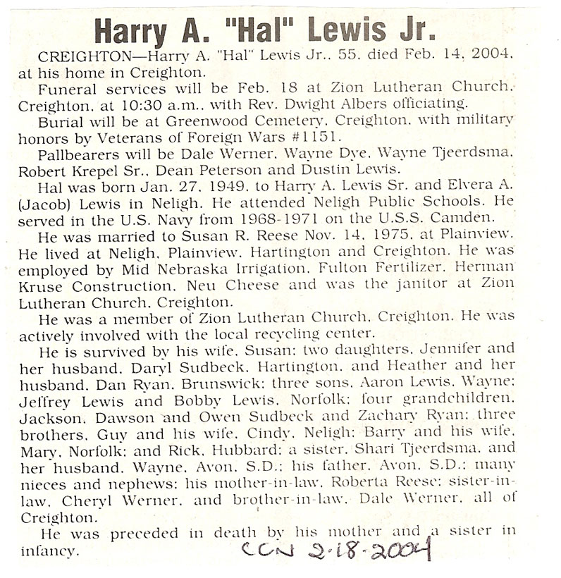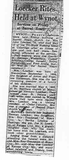 Cedar County, Nebraska Jump ahead to surnames: LAACKER Clara Alice Gibbs Published in: Cedar County News on December 3, 1975 LACKAS Belle Manzer Published in: Cedar County News on December 24, 1975 LACKAS Belle Manzer Published in: The Magnet Cemetery Directory by T. Korth LACKAS Monty G. Published in: The Magnet Cemetery Directory by T. Korth LACKAS Peter R. Published in: The Magnet Cemetery Directory by T. Korth LACKAS Wayne K. Published in: The Magnet Cemetery Directory by T. Korth LaCROIX Mervin L. Published in: Cedar County News on August 6, 1975 LAMBING Hazel M. Slagle Published in: The Magnet Cemetery Directory by T. Korth LAMMERS Bernadette M. Published in: Cedar County News in October 2002 LAMMERS Bob Published in: Cedar County News on March 2, 2005 LAMMERS Charles F. Published in: Cedar County News on August 26, 1998 LAMMERS Edward Published in: Cedar County News on January 16, 1919 LAMMERS Frank Published in: Cedar County News on October 19, 1950 LAMMERS Frederick William Published in: Cedar County News on March 31, 1965 LAMMERS Gerhard Published in: Cedar County News on November 29, 2000 LAMMERS Gertrude Published in: Cedar County News on March 10, 1976 LAMMERS Gertrude E. Walz Published in: Cedar County News on October 30, 1974 LAMMERS Hildegarde T. Arens Published in: Cedar County News on November 17, 2004 LAMMERS Howard D. Published in: Cedar County News on May 22, 2002 LAMMERS John M. Published in: Cedar County News on October 6, 1999 LAMMERS John W. Published in: Wynot Tribune on February 6, 1913 LAMMERS Kate Killcullen Obit Image Published in: Cedar County News on September 29, 1910 LAMMERS Ludwig Published in: Cedar County News on August 20, 1975 LAMMERS Nancy J. Olson Published in: Cedar County News in July 2000 LAMMERS Thomas D. Published in: Cedar County News in August 2003 LAMMERS Viola T. Hochstein Published in: Cedar County News on February 9, 2005 LAND Jean Robacker O'Meara Published in: Cedar County News on December 26, 2001 LANDGREN Mark T. Published in: Cedar County News on June 16, 2004 LANE Baby Boy Published in: The Magnet Cemetery Directory by T. Korth LANE Hannah Newton Published in: Cedar County News on April 9, 2009 LANE Irene A. Pibal Published in: Cedar County News on June 18, 2003 LANE Jessie Patterson Published in: Cedar County News on January 3, 1952 LANG Lawrence Published in: Cedar County News on December 28, 1916 LANGE Christina Foecke Published in: Cedar County News in February 1934 LANGE Edward J. Published in: Cedar County News on March 10, 1960 LANGE Elizabeth Published in: Cedar County News on January 31, 1924 LANGE Elizabeth Heimes Published in: Cedar County News on May 26, 1948 LANGE Henry Published in: Cedar County News on May 3, 1913 LANGE Louis H. Published in: Cedar County News in December 1964 LANGE Rose Bernadette Meirose Published in: Cedar County News in December 1951 LANGEMEIER James LeRoy Published in: Cedar County News on December 31, 2003 LANGFERMAN Bernard Published in: Cedar County News. Date of Publication/Death: Mar. 29, 1928 LANGFERMAN Martha Elizabeth Sudbeck Published in: Cedar County News on January 7, 1976 LANGFERMAN Rose Marie Thoene Published in: Cedar County News on March 24, 2004 LANPHEAR Charles E. Published in: Hartington Herald on May 10, 1928 LANPHEAR Emaline Winterringer Published in: Cedar County News on February 18, 1937 LANSER Frank L. Published in: Cedar County News on July 7, 2004 LARSEN Laura M. Published in: The Magnet Cemetery Directory by T. Korth LARSON William R. Published in: Cedar County News on November 24, 2004 LATTMAN Henry Published in: Cedar County News on August 27, 1975 LATTMAN Jacob Published in: Wynot Tribune on November 23, 1914 LAUER Donald H. Published in: Cedar County News on July 4, 2001 LAUER Grace Published in: Cedar County News on September 13, 1930 LAUER John Published in: Cedar County News. LAUER Rose Doherty Published in: Cedar County News in July 2002 LAUVER Judge Ephraim Published in: Cedar County News on April 22, 1926 LAWSON Christopher Published in: Cedar County News on August 23, 1923 LEADER John Published in: Cedar County News on January 28, 1926 LEADER Marjorie A. Kuehn Obit Image Published in: Cedar County News on January 31, 2001 LEADER Marjorie A. Kuehn Published in: Crofton Journal on February 1, 2001 LEAMY Shirley Hassmann Published in: Cedar County News on June 29, 2005 LEAPLEY Richard H. "Rick" Published in: Cedar County News on November 18, 1998 LECHLEITNER Ferdinand (Reverend) Published in: Cedar County News on June 28, 1917 LECKLER Arley Frederick Published in: The Magnet Cemetery Directory by T. Korth LECKLER Ethel Baker Published in: The Magnet Cemetery Directory by T. Korth LECKLER Fred Published in: The Magnet Cemetery Directory by T. Korth LECKLER Irma Dora Published in: The Magnet Cemetery Directory by T. Korth LECKLER Virgie Mae Published in: The Magnet Cemetery Directory by T. Korth LeCLAIR Dolores Veronica Koch Published in: Cedar County News on October 3, 2001 LEENER Charles J. Published in: The Magnet Cemetery Directory by T. Korth LEISE Bernadine Peitz Published in: Cedar County News on November 20, 1952 LEISE Julia M. Uhing Published in: Cedar County News on November 28, 2001 LEISE Marvin D. "Butch" Published in: Cedar County News on December 21, 2001 LENIHAN Hannah McDevitt Published in: Cedar County News on May 3, 1923 LENTZ Marvin "Bob" Obit Image Published in: Cedar County News on January 31, 2001 LENTZ Raymond F. Published in: Cedar County News on January 29, 2003 LENZEN Anna Marie Published in: Cedar County News on October 16, 1919 LENZEN Mary Weibel Published in: Cedar County News on January 8, 1953 LEVY Billie B. Clausen Published in: The Magnet Cemetery Directory by T. Korth LEWIS Harry A. "Hal" Jr. Published in: Cedar County News on February 18, 2004 LEWIS Madelaine "BooBoo" Published in: Cedar County News on August 24, 2005 LEWIS Michael Published in: Cedar County News on December 24, 1975 LIENEMANN Baby Published in: The Magnet Cemet