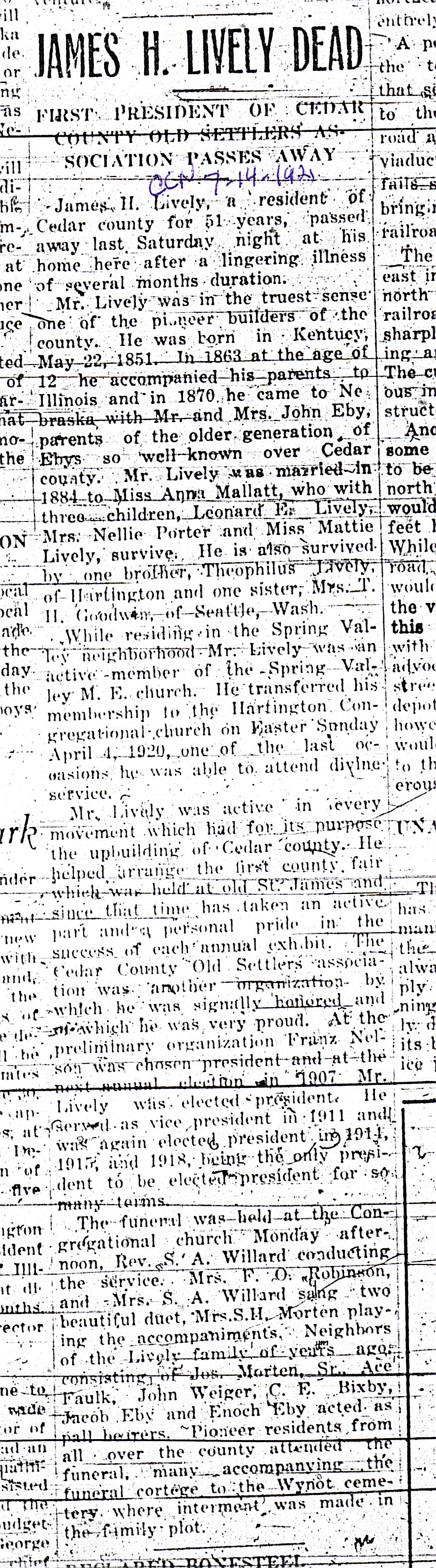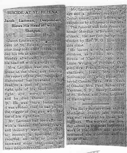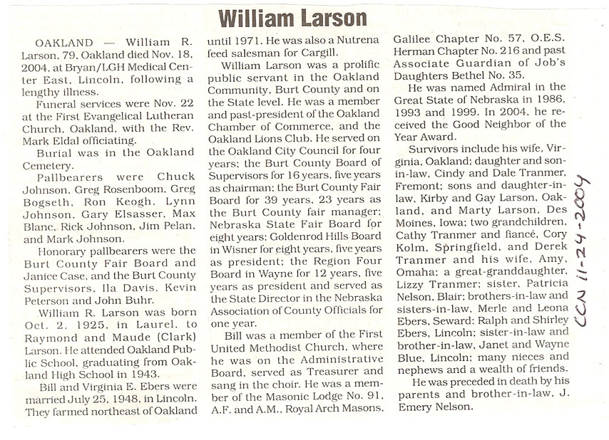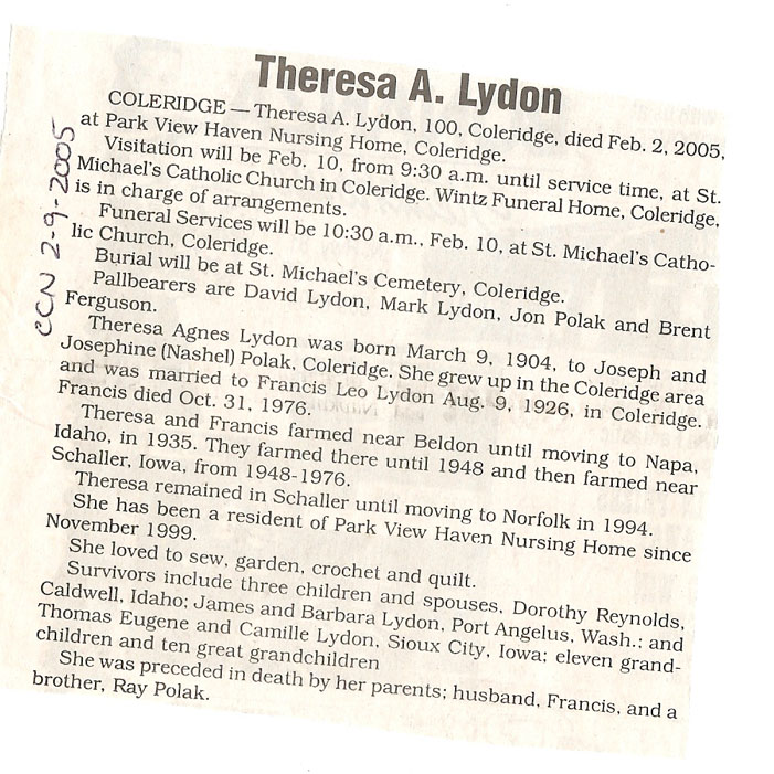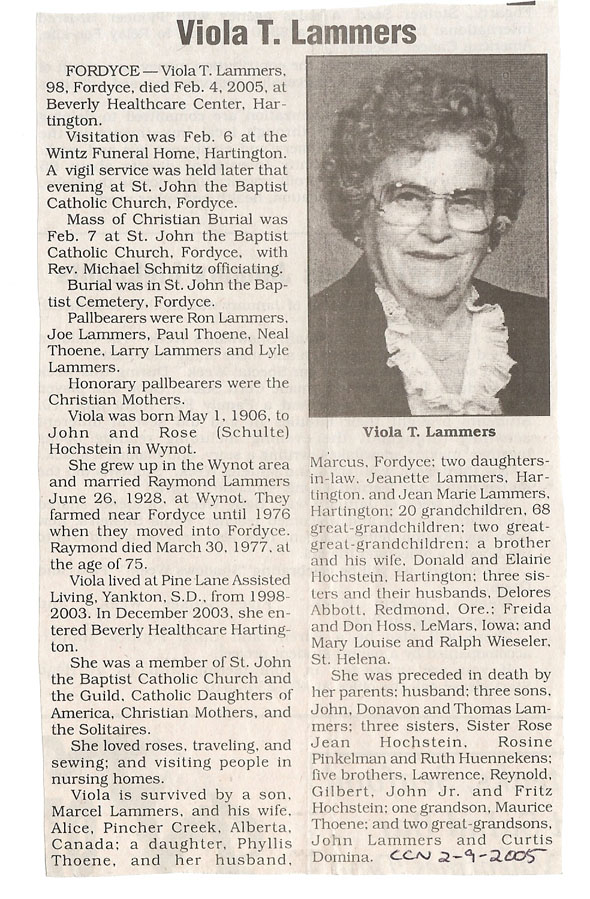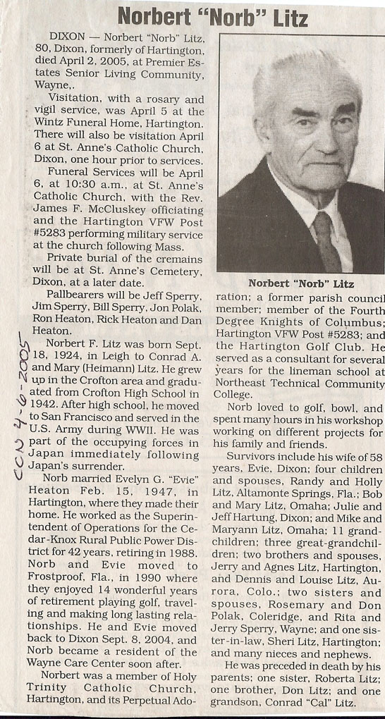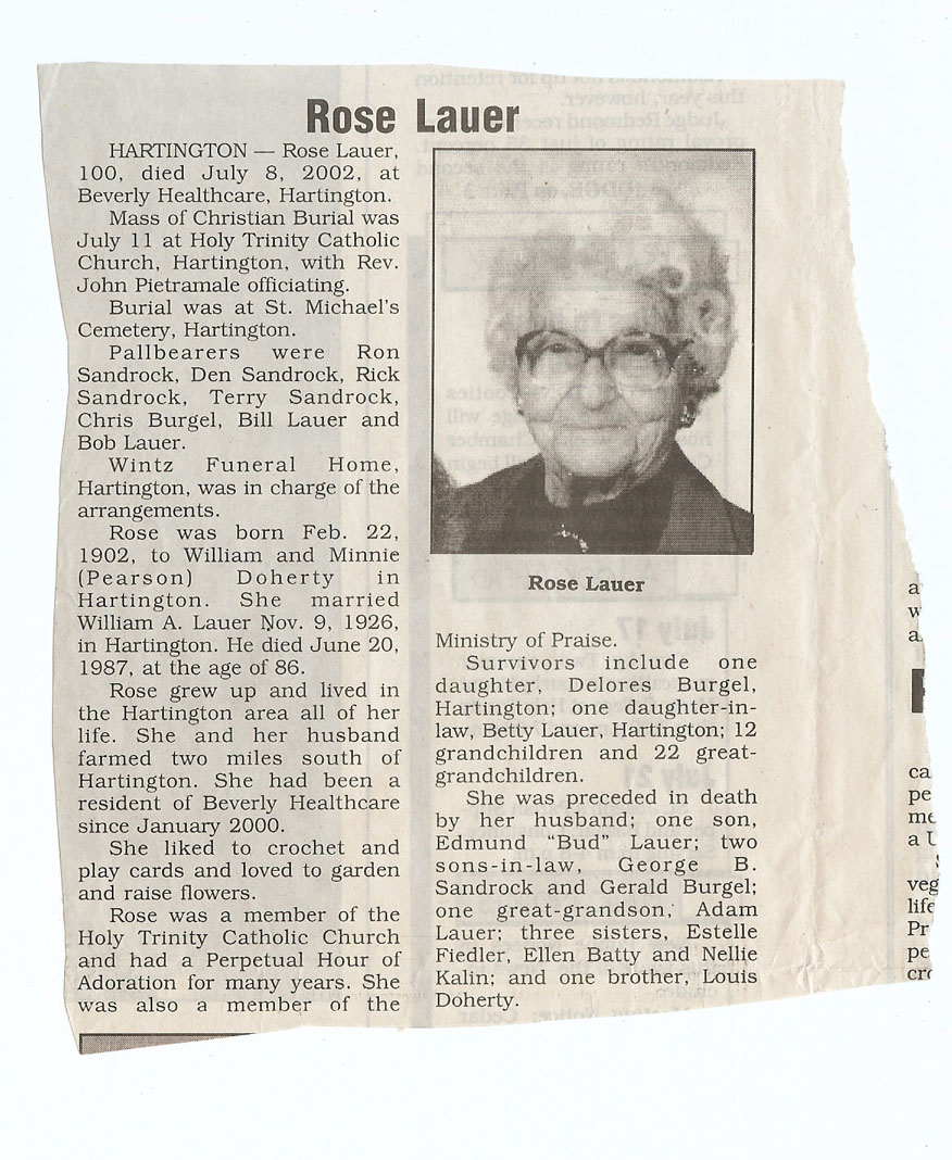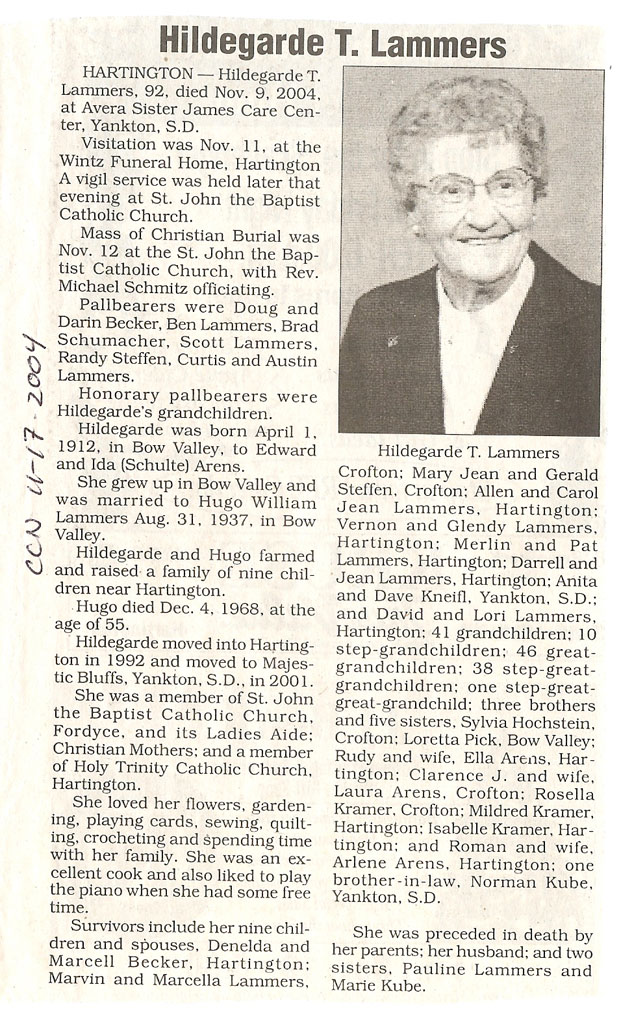 Cedar County, Nebraska Jump ahead to surnames: LAACKER Clara Alice Gibbs Published in: Cedar County News on December 3, 1975 LACKAS Belle Manzer Published in: Cedar County News on December 24, 1975 LACKAS Belle Manzer Published in: The Magnet Cemetery Directory by T. Korth LACKAS Monty G. Published in: The Magnet Cemetery Directory by T. Korth LACKAS Peter R. Published in: The Magnet Cemetery Directory by T. Korth LACKAS Wayne K. Published in: The Magnet Cemetery Directory by T. Korth LaCROIX Mervin L. Published in: Cedar County News on August 6, 1975 LAMBING Hazel M. Slagle Published in: The Magnet Cemetery Directory by T. Korth LAMMERS Bernadette M. Published in: Cedar County News in October 2002 LAMMERS Bob Published in: Cedar County News on March 2, 2005 LAMMERS Charles F. Published in: Cedar County News on August 26, 1998 LAMMERS Edward Published in: Cedar County News on January 16, 1919 LAMMERS Frank Published in: Cedar County News on October 19, 1950 LAMMERS Frederick William Published in: Cedar County News on March 31, 1965 LAMMERS Gerhard Published in: Cedar County News on November 29, 2000 LAMMERS Gertrude Published in: Cedar County News on March 10, 1976 LAMMERS Gertrude E. Walz Published in: Cedar County News on October 30, 1974 LAMMERS Hildegarde T. Arens Published in: Cedar County News on November 17, 2004 LAMMERS Howard D. Published in: Cedar County News on May 22, 2002 LAMMERS John M. Published in: Cedar County News on October 6, 1999 LAMMERS John W. Published in: Wynot Tribune on February 6, 1913 LAMMERS Kate Killcullen Obit Image Published in: Cedar County News on September 29, 1910 LAMMERS Ludwig Published in: Cedar County News on August 20, 1975 LAMMERS Nancy J. Olson Published in: Cedar County News in July 2000 LAMMERS Thomas D. Published in: Cedar County News in August 2003 LAMMERS Viola T. Hochstein Published in: Cedar County News on February 9, 2005 LAND Jean Robacker O'Meara Published in: Cedar County News on December 26, 2001 LANDGREN Mark T. Published in: Cedar County News on June 16, 2004 LANE Baby Boy Published in: The Magnet Cemetery Directory by T. Korth LANE Hannah Newton Published in: Cedar County News on April 9, 2009 LANE Irene A. Pibal Published in: Cedar County News on June 18, 2003 LANE Jessie Patterson Published in: Cedar County News on January 3, 1952 LANG Lawrence Published in: Cedar County News on December 28, 1916 LANGE Christina Foecke Published in: Cedar County News in February 1934 LANGE Edward J. Published in: Cedar County News on March 10, 1960 LANGE Elizabeth Published in: Cedar County News on January 31, 1924 LANGE Elizabeth Heimes Published in: Cedar County News on May 26, 1948 LANGE Henry Published in: Cedar County News on May 3, 1913 LANGE Louis H. Published in: Cedar County News in December 1964 LANGE Rose Bernadette Meirose Published in: Cedar County News in December 1951 LANGEMEIER James LeRoy Published in: Cedar County News on December 31, 2003 LANGFERMAN Bernard Published in: Cedar County News. Date of Publication/Death: Mar. 29, 1928 LANGFERMAN Martha Elizabeth Sudbeck Published in: Cedar County News on January 7, 1976 LANGFERMAN Rose Marie Thoene Published in: Cedar County News on March 24, 2004 LANPHEAR Charles E. Published in: Hartington Herald on May 10, 1928 LANPHEAR Emaline Winterringer Published in: Cedar County News on February 18, 1937 LANSER Frank L. Published in: Cedar County News on July 7, 2004 LARSEN Laura M. Published in: The Magnet Cemetery Directory by T. Korth LARSON William R. Published in: Cedar County News on November 24, 2004 LATTMAN Henry Published in: Cedar County News on August 27, 1975 LATTMAN Jacob Published in: Wynot Tribune on November 23, 1914 LAUER Donald H. Published in: Cedar County News on July 4, 2001 LAUER Grace Published in: Cedar County News on September 13, 1930 LAUER John Published in: Cedar County News. LAUER Rose Doherty Published in: Cedar County News in July 2002 LAUVER Judge Ephraim Published in: Cedar County News on April 22, 1926 LAWSON Christopher Published in: Cedar County News on August 23, 1923 LEADER John Published in: Cedar County News on January 28, 1926 LEADER Marjorie A. Kuehn Obit Image Published in: Cedar County News on January 31, 2001 LEADER Marjorie A. Kuehn Published in: Crofton Journal on February 1, 2001 LEAMY Shirley Hassmann Published in: Cedar County News on June 29, 2005 LEAPLEY Richard H. "Rick" Published in: Cedar County News on November 18, 1998 LECHLEITNER Ferdinand (Reverend) Published in: Cedar County News on June 28, 1917 LECKLER Arley Frederick Published in: The Magnet Cemetery Directory by T. Korth LECKLER Ethel Baker Published in: The Magnet Cemetery Directory by T. Korth LECKLER Fred Published in: The Magnet Cemetery Directory by T. Korth LECKLER Irma Dora Published in: The Magnet Cemetery Directory by T. Korth LECKLER Virgie Mae Published in: The Magnet Cemetery Directory by T. Korth LeCLAIR Dolores Veronica Koch Published in: Cedar County News on October 3, 2001 LEENER Charles J. Published in: The Magnet Cemetery Directory by T. Korth LEISE Bernadine Peitz Published in: Cedar County News on November 20, 1952 LEISE Julia M. Uhing Published in: Cedar County News on November 28, 2001 LEISE Marvin D. "Butch" Published in: Cedar County News on December 21, 2001 LENIHAN Hannah McDevitt Published in: Cedar County News on May 3, 1923 LENTZ Marvin "Bob" Obit Image Published in: Cedar County News on January 31, 2001 LENTZ Raymond F. Published in: Cedar County News on January 29, 2003 LENZEN Anna Marie Published in: Cedar County News on October 16, 1919 LENZEN Mary Weibel Published in: Cedar County News on January 8, 1953 LEVY Billie B. Clausen Published in: The Magnet Cemetery Directory by T. Korth LEWIS Harry A. "Hal" Jr. Published in: Cedar County News on February 18, 2004 LEWIS Madelaine "BooBoo" Published in: Cedar County News on August 24, 2005 LEWIS Michael Published in: Cedar County News on December 24, 1975 LIENEMANN Baby Published in: The Magnet Cemet