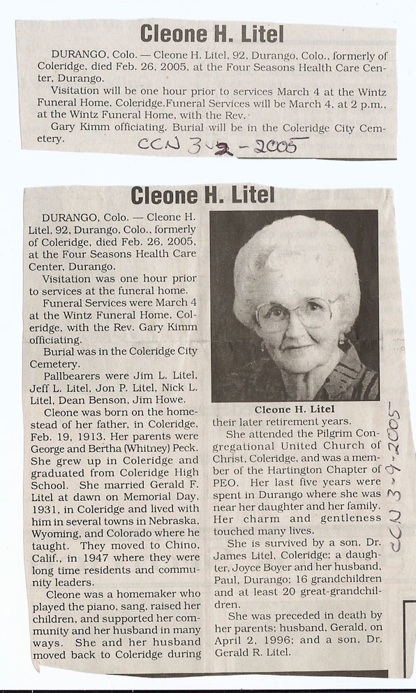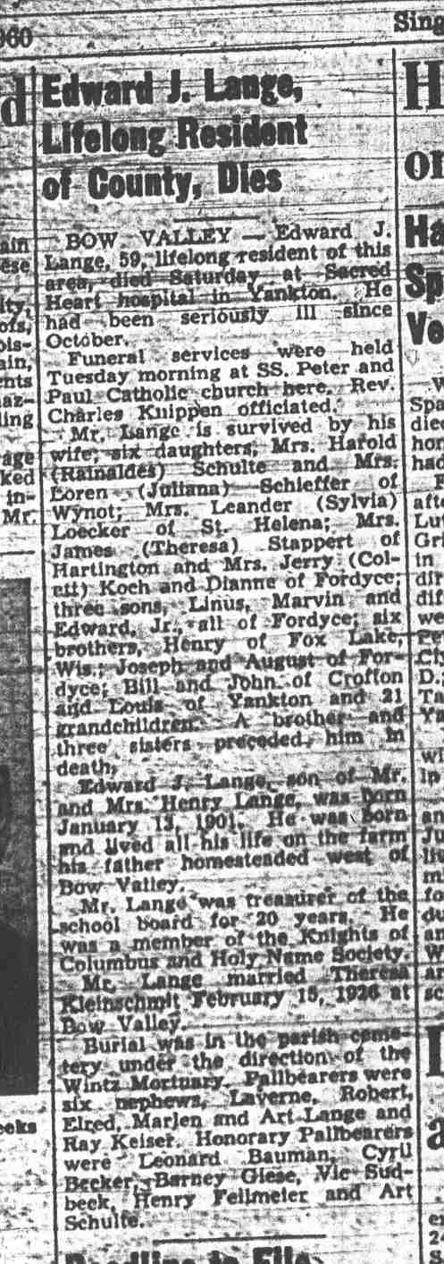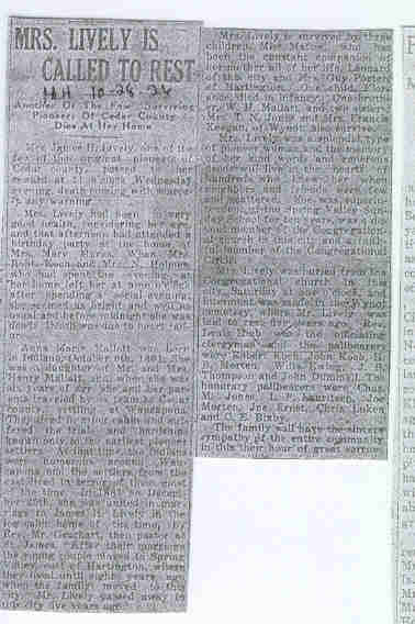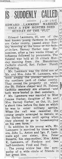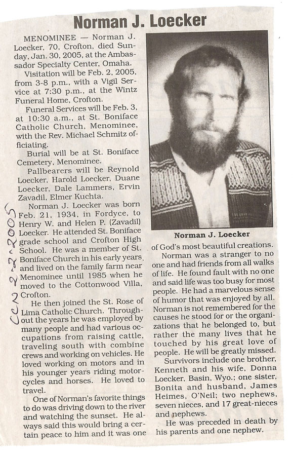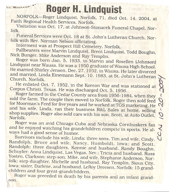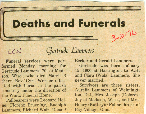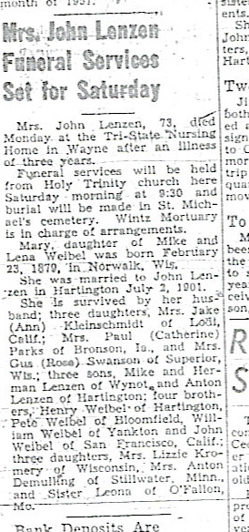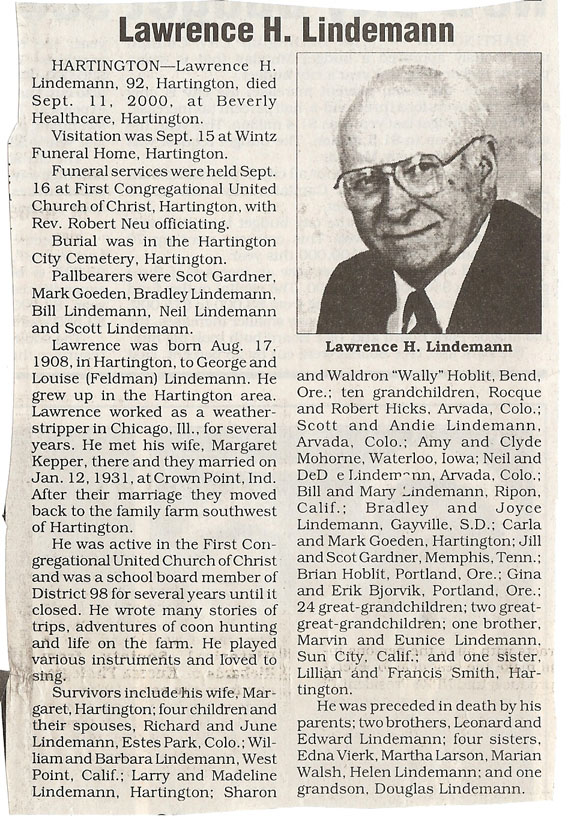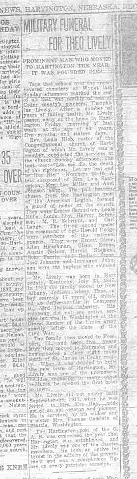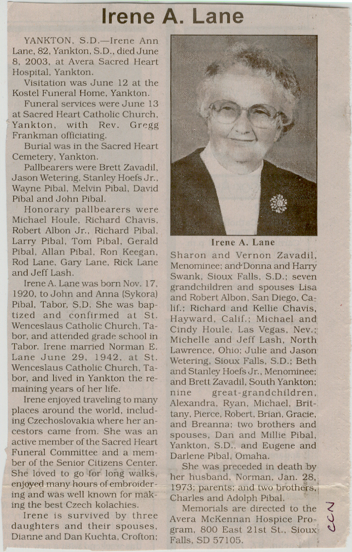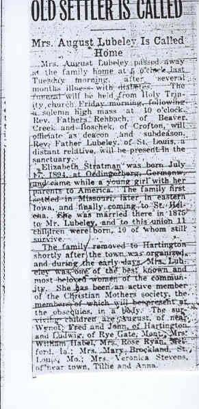 Cedar County, Nebraska Jump ahead to surnames: LAACKER Clara Alice Gibbs Published in: Cedar County News on December 3, 1975 LACKAS Belle Manzer Published in: Cedar County News on December 24, 1975 LACKAS Belle Manzer Published in: The Magnet Cemetery Directory by T. Korth LACKAS Monty G. Published in: The Magnet Cemetery Directory by T. Korth LACKAS Peter R. Published in: The Magnet Cemetery Directory by T. Korth LACKAS Wayne K. Published in: The Magnet Cemetery Directory by T. Korth LaCROIX Mervin L. Published in: Cedar County News on August 6, 1975 LAMBING Hazel M. Slagle Published in: The Magnet Cemetery Directory by T. Korth LAMMERS Bernadette M. Published in: Cedar County News in October 2002 LAMMERS Bob Published in: Cedar County News on March 2, 2005 LAMMERS Charles F. Published in: Cedar County News on August 26, 1998 LAMMERS Edward Published in: Cedar County News on January 16, 1919 LAMMERS Frank Published in: Cedar County News on October 19, 1950 LAMMERS Frederick William Published in: Cedar County News on March 31, 1965 LAMMERS Gerhard Published in: Cedar County News on November 29, 2000 LAMMERS Gertrude Published in: Cedar County News on March 10, 1976 LAMMERS Gertrude E. Walz Published in: Cedar County News on October 30, 1974 LAMMERS Hildegarde T. Arens Published in: Cedar County News on November 17, 2004 LAMMERS Howard D. Published in: Cedar County News on May 22, 2002 LAMMERS John M. Published in: Cedar County News on October 6, 1999 LAMMERS John W. Published in: Wynot Tribune on February 6, 1913 LAMMERS Kate Killcullen Obit Image Published in: Cedar County News on September 29, 1910 LAMMERS Ludwig Published in: Cedar County News on August 20, 1975 LAMMERS Nancy J. Olson Published in: Cedar County News in July 2000 LAMMERS Thomas D. Published in: Cedar County News in August 2003 LAMMERS Viola T. Hochstein Published in: Cedar County News on February 9, 2005 LAND Jean Robacker O'Meara Published in: Cedar County News on December 26, 2001 LANDGREN Mark T. Published in: Cedar County News on June 16, 2004 LANE Baby Boy Published in: The Magnet Cemetery Directory by T. Korth LANE Hannah Newton Published in: Cedar County News on April 9, 2009 LANE Irene A. Pibal Published in: Cedar County News on June 18, 2003 LANE Jessie Patterson Published in: Cedar County News on January 3, 1952 LANG Lawrence Published in: Cedar County News on December 28, 1916 LANGE Christina Foecke Published in: Cedar County News in February 1934 LANGE Edward J. Published in: Cedar County News on March 10, 1960 LANGE Elizabeth Published in: Cedar County News on January 31, 1924 LANGE Elizabeth Heimes Published in: Cedar County News on May 26, 1948 LANGE Henry Published in: Cedar County News on May 3, 1913 LANGE Louis H. Published in: Cedar County News in December 1964 LANGE Rose Bernadette Meirose Published in: Cedar County News in December 1951 LANGEMEIER James LeRoy Published in: Cedar County News on December 31, 2003 LANGFERMAN Bernard Published in: Cedar County News. Date of Publication/Death: Mar. 29, 1928 LANGFERMAN Martha Elizabeth Sudbeck Published in: Cedar County News on January 7, 1976 LANGFERMAN Rose Marie Thoene Published in: Cedar County News on March 24, 2004 LANPHEAR Charles E. Published in: Hartington Herald on May 10, 1928 LANPHEAR Emaline Winterringer Published in: Cedar County News on February 18, 1937 LANSER Frank L. Published in: Cedar County News on July 7, 2004 LARSEN Laura M. Published in: The Magnet Cemetery Directory by T. Korth LARSON William R. Published in: Cedar County News on November 24, 2004 LATTMAN Henry Published in: Cedar County News on August 27, 1975 LATTMAN Jacob Published in: Wynot Tribune on November 23, 1914 LAUER Donald H. Published in: Cedar County News on July 4, 2001 LAUER Grace Published in: Cedar County News on September 13, 1930 LAUER John Published in: Cedar County News. LAUER Rose Doherty Published in: Cedar County News in July 2002 LAUVER Judge Ephraim Published in: Cedar County News on April 22, 1926 LAWSON Christopher Published in: Cedar County News on August 23, 1923 LEADER John Published in: Cedar County News on January 28, 1926 LEADER Marjorie A. Kuehn Obit Image Published in: Cedar County News on January 31, 2001 LEADER Marjorie A. Kuehn Published in: Crofton Journal on February 1, 2001 LEAMY Shirley Hassmann Published in: Cedar County News on June 29, 2005 LEAPLEY Richard H. "Rick" Published in: Cedar County News on November 18, 1998 LECHLEITNER Ferdinand (Reverend) Published in: Cedar County News on June 28, 1917 LECKLER Arley Frederick Published in: The Magnet Cemetery Directory by T. Korth LECKLER Ethel Baker Published in: The Magnet Cemetery Directory by T. Korth LECKLER Fred Published in: The Magnet Cemetery Directory by T. Korth LECKLER Irma Dora Published in: The Magnet Cemetery Directory by T. Korth LECKLER Virgie Mae Published in: The Magnet Cemetery Directory by T. Korth LeCLAIR Dolores Veronica Koch Published in: Cedar County News on October 3, 2001 LEENER Charles J. Published in: The Magnet Cemetery Directory by T. Korth LEISE Bernadine Peitz Published in: Cedar County News on November 20, 1952 LEISE Julia M. Uhing Published in: Cedar County News on November 28, 2001 LEISE Marvin D. "Butch" Published in: Cedar County News on December 21, 2001 LENIHAN Hannah McDevitt Published in: Cedar County News on May 3, 1923 LENTZ Marvin "Bob" Obit Image Published in: Cedar County News on January 31, 2001 LENTZ Raymond F. Published in: Cedar County News on January 29, 2003 LENZEN Anna Marie Published in: Cedar County News on October 16, 1919 LENZEN Mary Weibel Published in: Cedar County News on January 8, 1953 LEVY Billie B. Clausen Published in: The Magnet Cemetery Directory by T. Korth LEWIS Harry A. "Hal" Jr. Published in: Cedar County News on February 18, 2004 LEWIS Madelaine "BooBoo" Published in: Cedar County News on August 24, 2005 LEWIS Michael Published in: Cedar County News on December 24, 1975 LIENEMANN Baby Published in: The Magnet Cemet