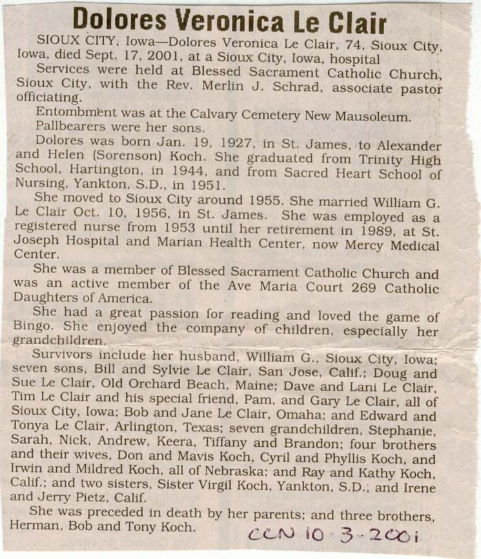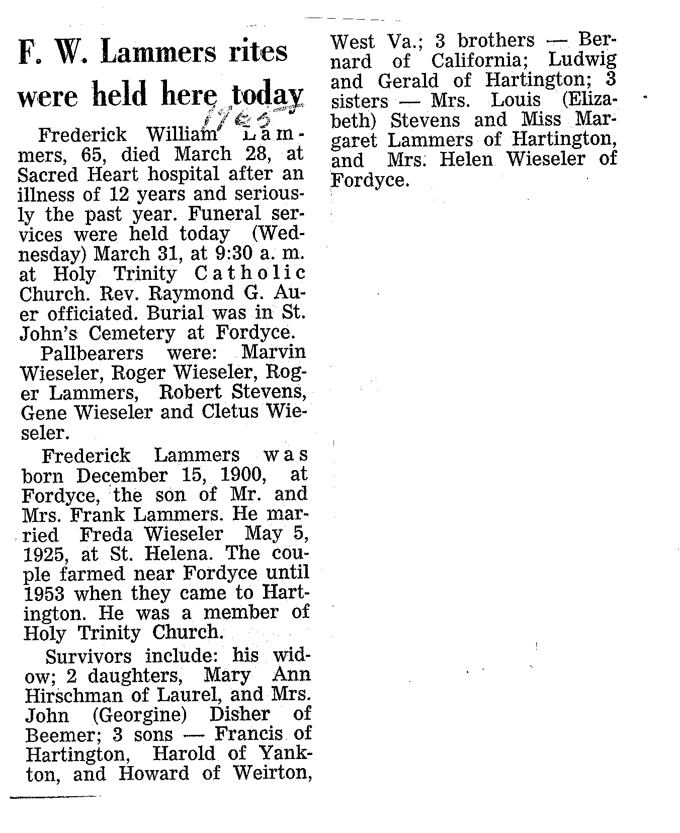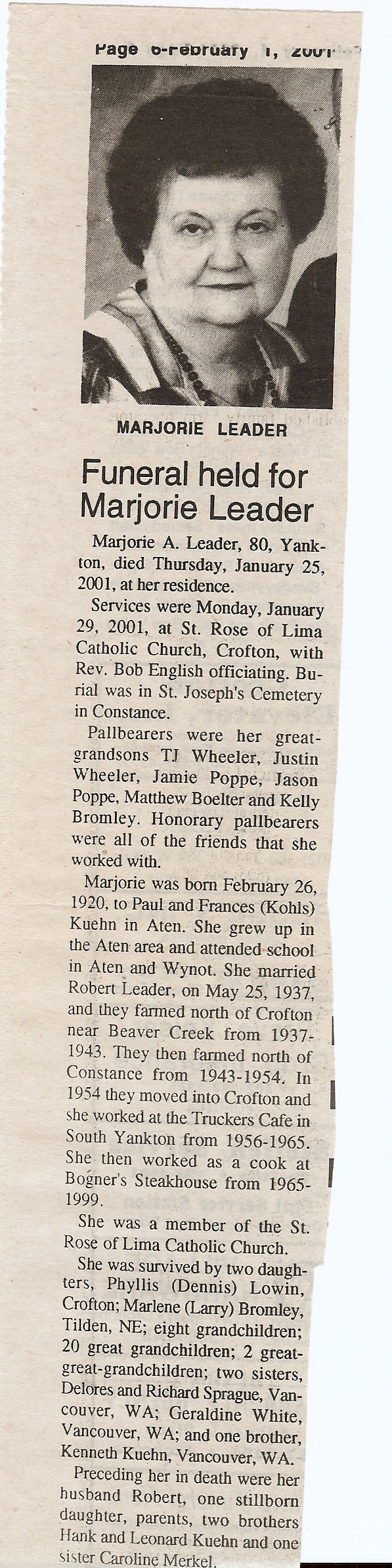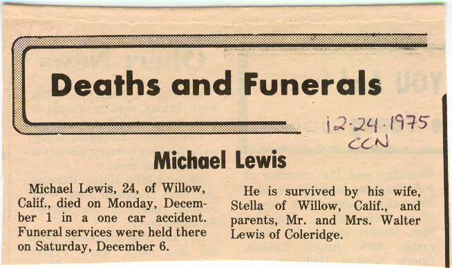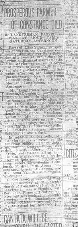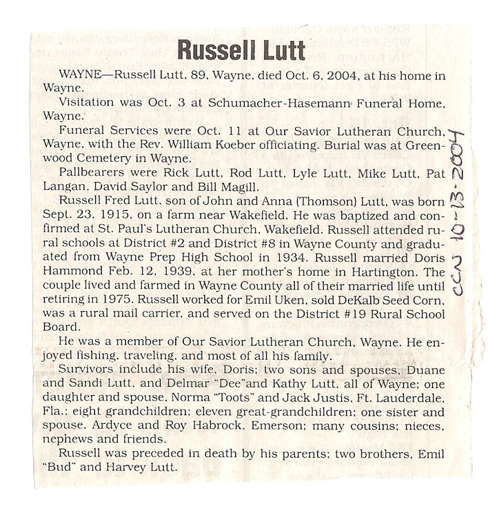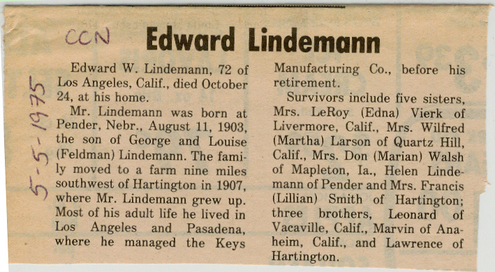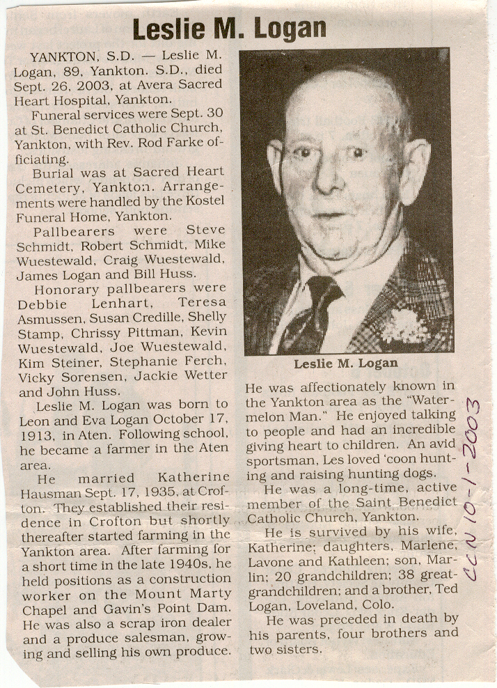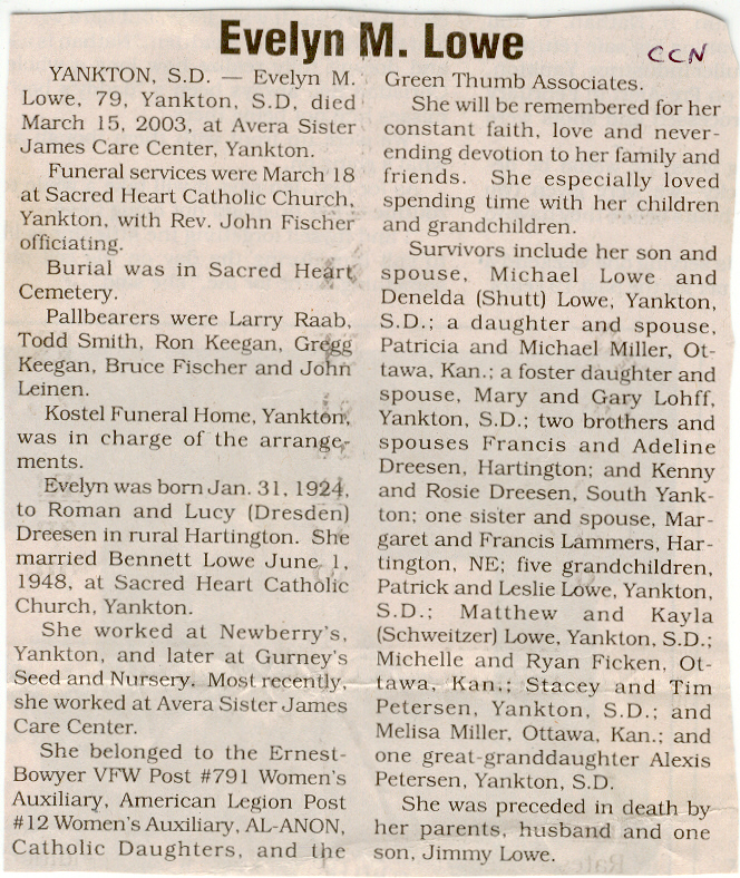 Cedar County, Nebraska Jump ahead to surnames: LAACKER Clara Alice Gibbs Published in: Cedar County News on December 3, 1975 LACKAS Belle Manzer Published in: Cedar County News on December 24, 1975 LACKAS Belle Manzer Published in: The Magnet Cemetery Directory by T. Korth LACKAS Monty G. Published in: The Magnet Cemetery Directory by T. Korth LACKAS Peter R. Published in: The Magnet Cemetery Directory by T. Korth LACKAS Wayne K. Published in: The Magnet Cemetery Directory by T. Korth LaCROIX Mervin L. Published in: Cedar County News on August 6, 1975 LAMBING Hazel M. Slagle Published in: The Magnet Cemetery Directory by T. Korth LAMMERS Bernadette M. Published in: Cedar County News in October 2002 LAMMERS Bob Published in: Cedar County News on March 2, 2005 LAMMERS Charles F. Published in: Cedar County News on August 26, 1998 LAMMERS Edward Published in: Cedar County News on January 16, 1919 LAMMERS Frank Published in: Cedar County News on October 19, 1950 LAMMERS Frederick William Published in: Cedar County News on March 31, 1965 LAMMERS Gerhard Published in: Cedar County News on November 29, 2000 LAMMERS Gertrude Published in: Cedar County News on March 10, 1976 LAMMERS Gertrude E. Walz Published in: Cedar County News on October 30, 1974 LAMMERS Hildegarde T. Arens Published in: Cedar County News on November 17, 2004 LAMMERS Howard D. Published in: Cedar County News on May 22, 2002 LAMMERS John M. Published in: Cedar County News on October 6, 1999 LAMMERS John W. Published in: Wynot Tribune on February 6, 1913 LAMMERS Kate Killcullen Obit Image Published in: Cedar County News on September 29, 1910 LAMMERS Ludwig Published in: Cedar County News on August 20, 1975 LAMMERS Nancy J. Olson Published in: Cedar County News in July 2000 LAMMERS Thomas D. Published in: Cedar County News in August 2003 LAMMERS Viola T. Hochstein Published in: Cedar County News on February 9, 2005 LAND Jean Robacker O'Meara Published in: Cedar County News on December 26, 2001 LANDGREN Mark T. Published in: Cedar County News on June 16, 2004 LANE Baby Boy Published in: The Magnet Cemetery Directory by T. Korth LANE Hannah Newton Published in: Cedar County News on April 9, 2009 LANE Irene A. Pibal Published in: Cedar County News on June 18, 2003 LANE Jessie Patterson Published in: Cedar County News on January 3, 1952 LANG Lawrence Published in: Cedar County News on December 28, 1916 LANGE Christina Foecke Published in: Cedar County News in February 1934 LANGE Edward J. Published in: Cedar County News on March 10, 1960 LANGE Elizabeth Published in: Cedar County News on January 31, 1924 LANGE Elizabeth Heimes Published in: Cedar County News on May 26, 1948 LANGE Henry Published in: Cedar County News on May 3, 1913 LANGE Louis H. Published in: Cedar County News in December 1964 LANGE Rose Bernadette Meirose Published in: Cedar County News in December 1951 LANGEMEIER James LeRoy Published in: Cedar County News on December 31, 2003 LANGFERMAN Bernard Published in: Cedar County News. Date of Publication/Death: Mar. 29, 1928 LANGFERMAN Martha Elizabeth Sudbeck Published in: Cedar County News on January 7, 1976 LANGFERMAN Rose Marie Thoene Published in: Cedar County News on March 24, 2004 LANPHEAR Charles E. Published in: Hartington Herald on May 10, 1928 LANPHEAR Emaline Winterringer Published in: Cedar County News on February 18, 1937 LANSER Frank L. Published in: Cedar County News on July 7, 2004 LARSEN Laura M. Published in: The Magnet Cemetery Directory by T. Korth LARSON William R. Published in: Cedar County News on November 24, 2004 LATTMAN Henry Published in: Cedar County News on August 27, 1975 LATTMAN Jacob Published in: Wynot Tribune on November 23, 1914 LAUER Donald H. Published in: Cedar County News on July 4, 2001 LAUER Grace Published in: Cedar County News on September 13, 1930 LAUER John Published in: Cedar County News. LAUER Rose Doherty Published in: Cedar County News in July 2002 LAUVER Judge Ephraim Published in: Cedar County News on April 22, 1926 LAWSON Christopher Published in: Cedar County News on August 23, 1923 LEADER John Published in: Cedar County News on January 28, 1926 LEADER Marjorie A. Kuehn Obit Image Published in: Cedar County News on January 31, 2001 LEADER Marjorie A. Kuehn Published in: Crofton Journal on February 1, 2001 LEAMY Shirley Hassmann Published in: Cedar County News on June 29, 2005 LEAPLEY Richard H. "Rick" Published in: Cedar County News on November 18, 1998 LECHLEITNER Ferdinand (Reverend) Published in: Cedar County News on June 28, 1917 LECKLER Arley Frederick Published in: The Magnet Cemetery Directory by T. Korth LECKLER Ethel Baker Published in: The Magnet Cemetery Directory by T. Korth LECKLER Fred Published in: The Magnet Cemetery Directory by T. Korth LECKLER Irma Dora Published in: The Magnet Cemetery Directory by T. Korth LECKLER Virgie Mae Published in: The Magnet Cemetery Directory by T. Korth LeCLAIR Dolores Veronica Koch Published in: Cedar County News on October 3, 2001 LEENER Charles J. Published in: The Magnet Cemetery Directory by T. Korth LEISE Bernadine Peitz Published in: Cedar County News on November 20, 1952 LEISE Julia M. Uhing Published in: Cedar County News on November 28, 2001 LEISE Marvin D. "Butch" Published in: Cedar County News on December 21, 2001 LENIHAN Hannah McDevitt Published in: Cedar County News on May 3, 1923 LENTZ Marvin "Bob" Obit Image Published in: Cedar County News on January 31, 2001 LENTZ Raymond F. Published in: Cedar County News on January 29, 2003 LENZEN Anna Marie Published in: Cedar County News on October 16, 1919 LENZEN Mary Weibel Published in: Cedar County News on January 8, 1953 LEVY Billie B. Clausen Published in: The Magnet Cemetery Directory by T. Korth LEWIS Harry A. "Hal" Jr. Published in: Cedar County News on February 18, 2004 LEWIS Madelaine "BooBoo" Published in: Cedar County News on August 24, 2005 LEWIS Michael Published in: Cedar County News on December 24, 1975 LIENEMANN Baby Published in: The Magnet Cemet