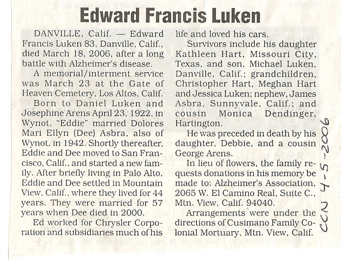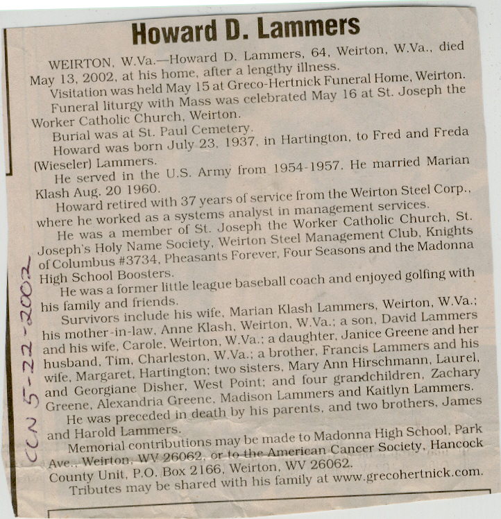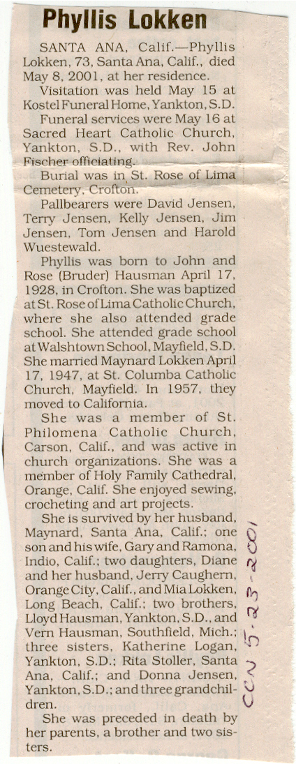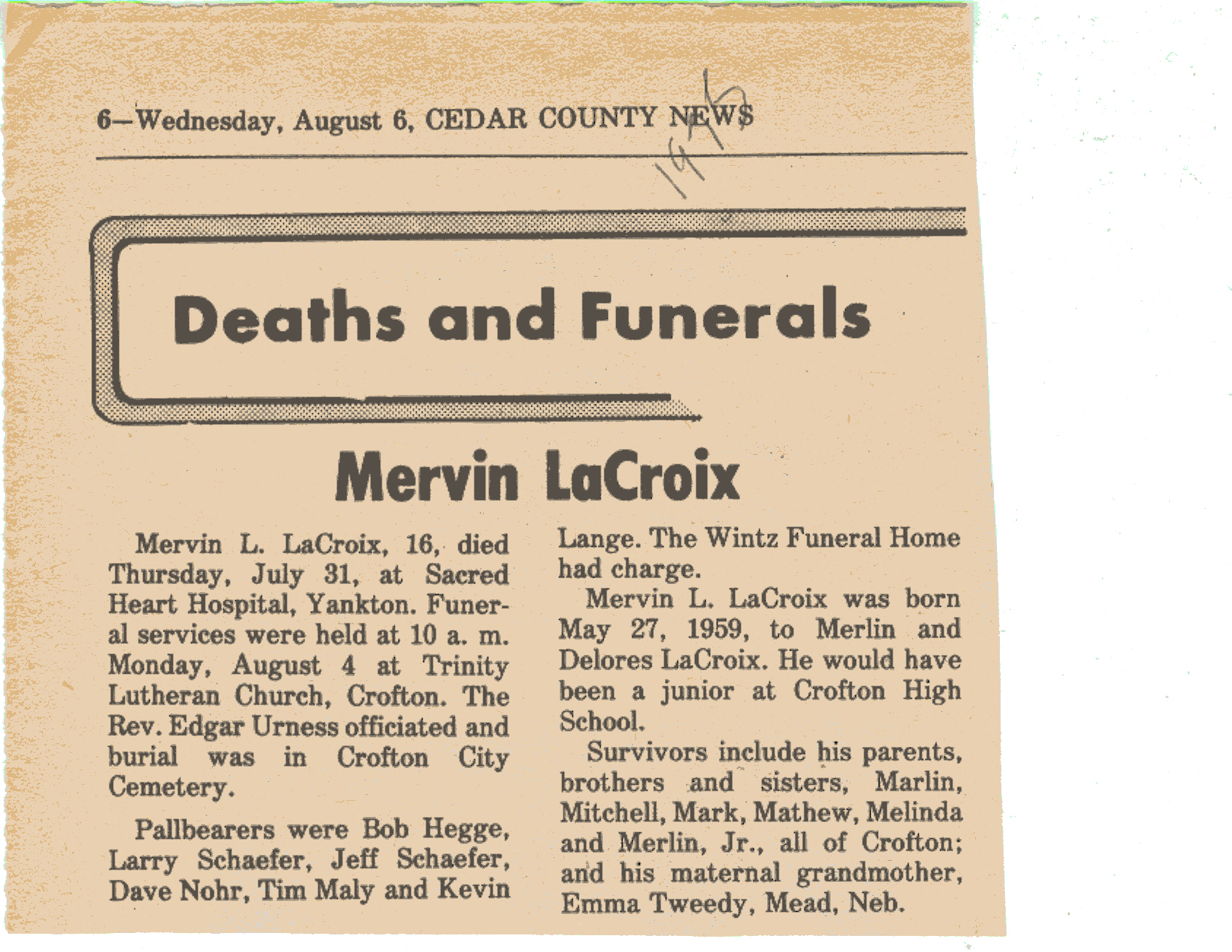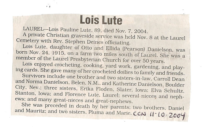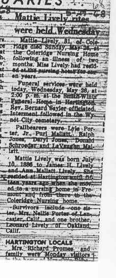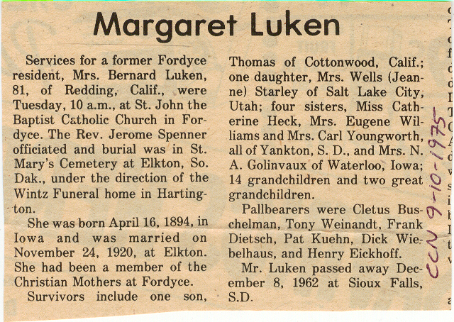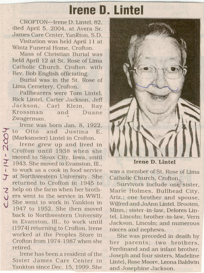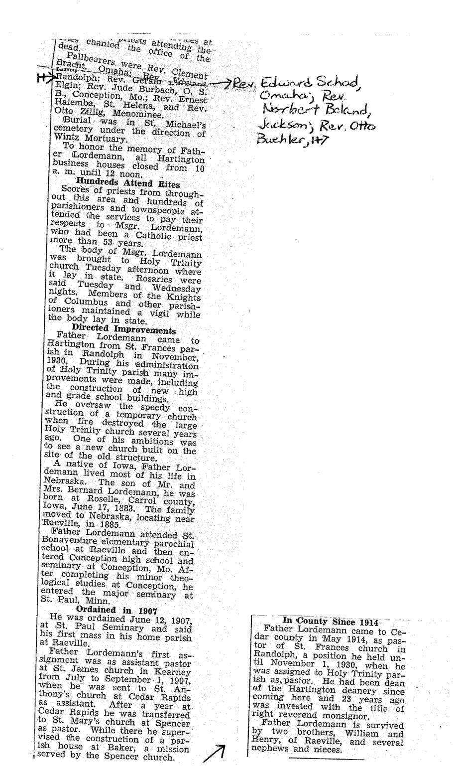 Cedar County, Nebraska Jump ahead to surnames: LAACKER Clara Alice Gibbs Published in: Cedar County News on December 3, 1975 LACKAS Belle Manzer Published in: Cedar County News on December 24, 1975 LACKAS Belle Manzer Published in: The Magnet Cemetery Directory by T. Korth LACKAS Monty G. Published in: The Magnet Cemetery Directory by T. Korth LACKAS Peter R. Published in: The Magnet Cemetery Directory by T. Korth LACKAS Wayne K. Published in: The Magnet Cemetery Directory by T. Korth LaCROIX Mervin L. Published in: Cedar County News on August 6, 1975 LAMBING Hazel M. Slagle Published in: The Magnet Cemetery Directory by T. Korth LAMMERS Bernadette M. Published in: Cedar County News in October 2002 LAMMERS Bob Published in: Cedar County News on March 2, 2005 LAMMERS Charles F. Published in: Cedar County News on August 26, 1998 LAMMERS Edward Published in: Cedar County News on January 16, 1919 LAMMERS Frank Published in: Cedar County News on October 19, 1950 LAMMERS Frederick William Published in: Cedar County News on March 31, 1965 LAMMERS Gerhard Published in: Cedar County News on November 29, 2000 LAMMERS Gertrude Published in: Cedar County News on March 10, 1976 LAMMERS Gertrude E. Walz Published in: Cedar County News on October 30, 1974 LAMMERS Hildegarde T. Arens Published in: Cedar County News on November 17, 2004 LAMMERS Howard D. Published in: Cedar County News on May 22, 2002 LAMMERS John M. Published in: Cedar County News on October 6, 1999 LAMMERS John W. Published in: Wynot Tribune on February 6, 1913 LAMMERS Kate Killcullen Obit Image Published in: Cedar County News on September 29, 1910 LAMMERS Ludwig Published in: Cedar County News on August 20, 1975 LAMMERS Nancy J. Olson Published in: Cedar County News in July 2000 LAMMERS Thomas D. Published in: Cedar County News in August 2003 LAMMERS Viola T. Hochstein Published in: Cedar County News on February 9, 2005 LAND Jean Robacker O'Meara Published in: Cedar County News on December 26, 2001 LANDGREN Mark T. Published in: Cedar County News on June 16, 2004 LANE Baby Boy Published in: The Magnet Cemetery Directory by T. Korth LANE Hannah Newton Published in: Cedar County News on April 9, 2009 LANE Irene A. Pibal Published in: Cedar County News on June 18, 2003 LANE Jessie Patterson Published in: Cedar County News on January 3, 1952 LANG Lawrence Published in: Cedar County News on December 28, 1916 LANGE Christina Foecke Published in: Cedar County News in February 1934 LANGE Edward J. Published in: Cedar County News on March 10, 1960 LANGE Elizabeth Published in: Cedar County News on January 31, 1924 LANGE Elizabeth Heimes Published in: Cedar County News on May 26, 1948 LANGE Henry Published in: Cedar County News on May 3, 1913 LANGE Louis H. Published in: Cedar County News in December 1964 LANGE Rose Bernadette Meirose Published in: Cedar County News in December 1951 LANGEMEIER James LeRoy Published in: Cedar County News on December 31, 2003 LANGFERMAN Bernard Published in: Cedar County News. Date of Publication/Death: Mar. 29, 1928 LANGFERMAN Martha Elizabeth Sudbeck Published in: Cedar County News on January 7, 1976 LANGFERMAN Rose Marie Thoene Published in: Cedar County News on March 24, 2004 LANPHEAR Charles E. Published in: Hartington Herald on May 10, 1928 LANPHEAR Emaline Winterringer Published in: Cedar County News on February 18, 1937 LANSER Frank L. Published in: Cedar County News on July 7, 2004 LARSEN Laura M. Published in: The Magnet Cemetery Directory by T. Korth LARSON William R. Published in: Cedar County News on November 24, 2004 LATTMAN Henry Published in: Cedar County News on August 27, 1975 LATTMAN Jacob Published in: Wynot Tribune on November 23, 1914 LAUER Donald H. Published in: Cedar County News on July 4, 2001 LAUER Grace Published in: Cedar County News on September 13, 1930 LAUER John Published in: Cedar County News. LAUER Rose Doherty Published in: Cedar County News in July 2002 LAUVER Judge Ephraim Published in: Cedar County News on April 22, 1926 LAWSON Christopher Published in: Cedar County News on August 23, 1923 LEADER John Published in: Cedar County News on January 28, 1926 LEADER Marjorie A. Kuehn Obit Image Published in: Cedar County News on January 31, 2001 LEADER Marjorie A. Kuehn Published in: Crofton Journal on February 1, 2001 LEAMY Shirley Hassmann Published in: Cedar County News on June 29, 2005 LEAPLEY Richard H. "Rick" Published in: Cedar County News on November 18, 1998 LECHLEITNER Ferdinand (Reverend) Published in: Cedar County News on June 28, 1917 LECKLER Arley Frederick Published in: The Magnet Cemetery Directory by T. Korth LECKLER Ethel Baker Published in: The Magnet Cemetery Directory by T. Korth LECKLER Fred Published in: The Magnet Cemetery Directory by T. Korth LECKLER Irma Dora Published in: The Magnet Cemetery Directory by T. Korth LECKLER Virgie Mae Published in: The Magnet Cemetery Directory by T. Korth LeCLAIR Dolores Veronica Koch Published in: Cedar County News on October 3, 2001 LEENER Charles J. Published in: The Magnet Cemetery Directory by T. Korth LEISE Bernadine Peitz Published in: Cedar County News on November 20, 1952 LEISE Julia M. Uhing Published in: Cedar County News on November 28, 2001 LEISE Marvin D. "Butch" Published in: Cedar County News on December 21, 2001 LENIHAN Hannah McDevitt Published in: Cedar County News on May 3, 1923 LENTZ Marvin "Bob" Obit Image Published in: Cedar County News on January 31, 2001 LENTZ Raymond F. Published in: Cedar County News on January 29, 2003 LENZEN Anna Marie Published in: Cedar County News on October 16, 1919 LENZEN Mary Weibel Published in: Cedar County News on January 8, 1953 LEVY Billie B. Clausen Published in: The Magnet Cemetery Directory by T. Korth LEWIS Harry A. "Hal" Jr. Published in: Cedar County News on February 18, 2004 LEWIS Madelaine "BooBoo" Published in: Cedar County News on August 24, 2005 LEWIS Michael Published in: Cedar County News on December 24, 1975 LIENEMANN Baby Published in: The Magnet Cemet