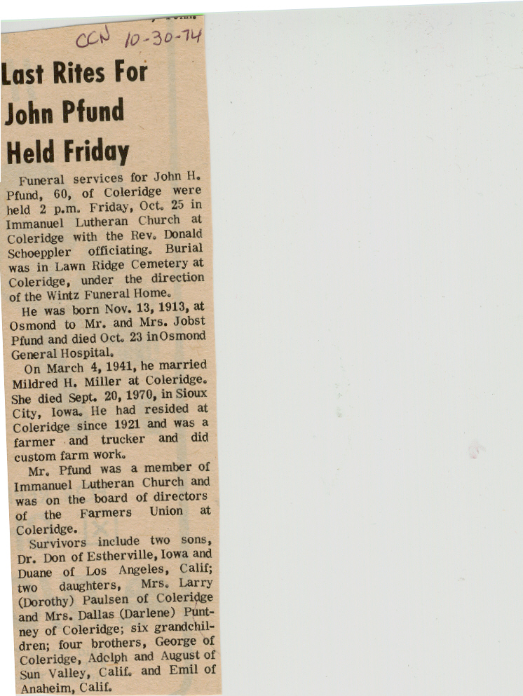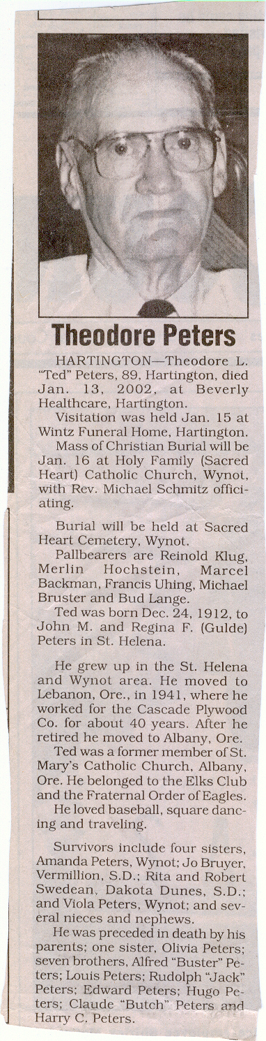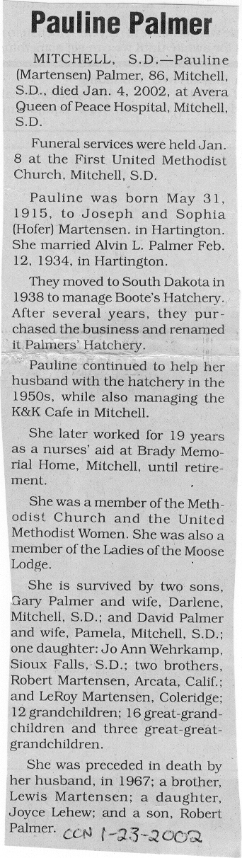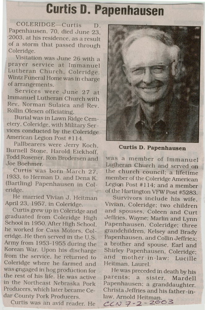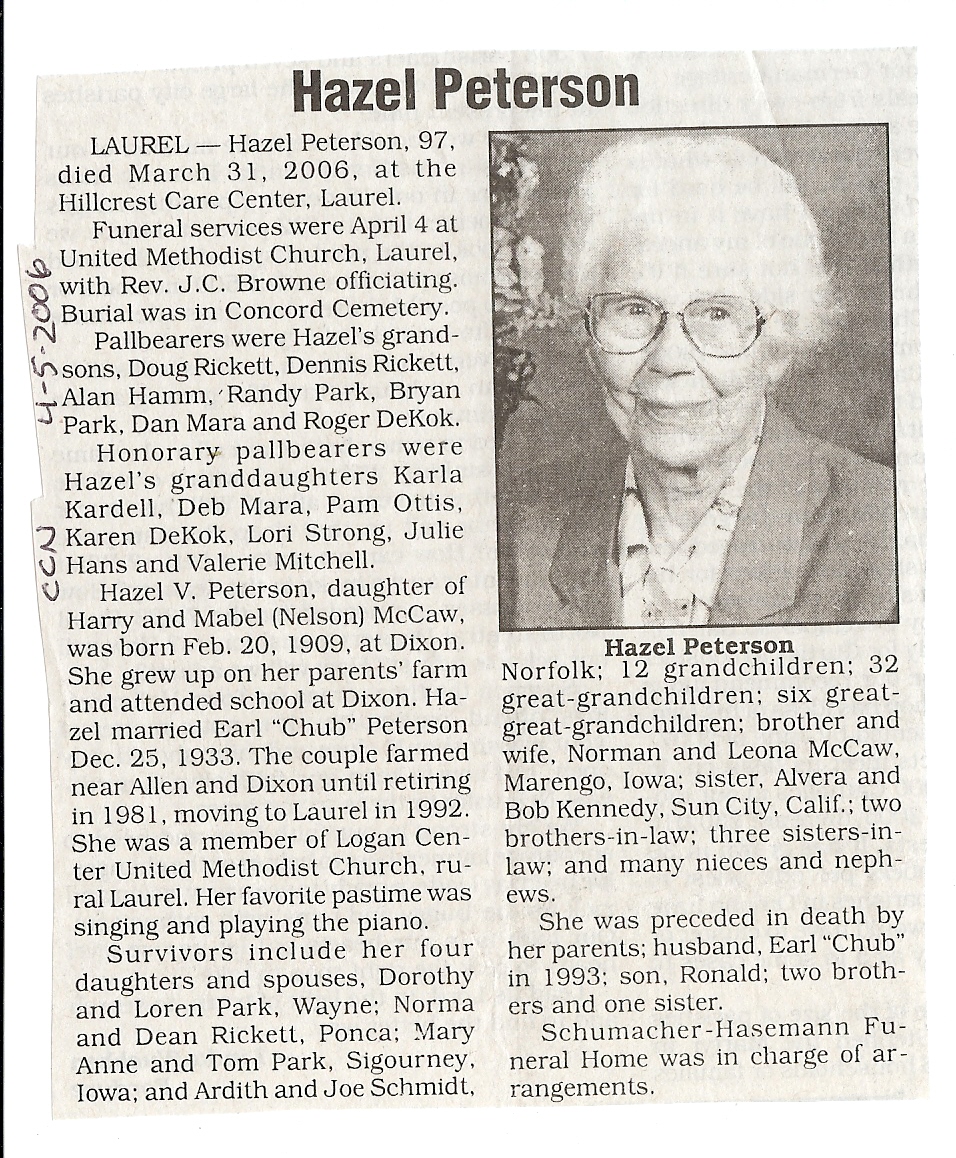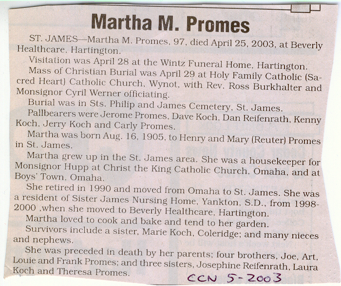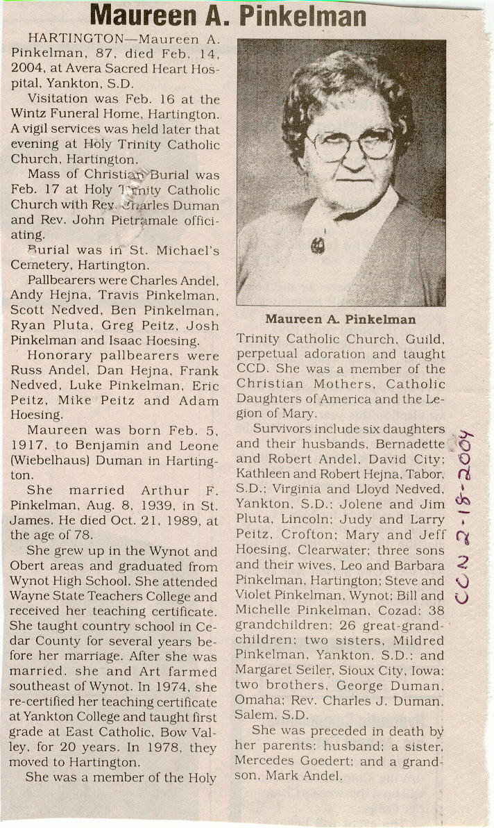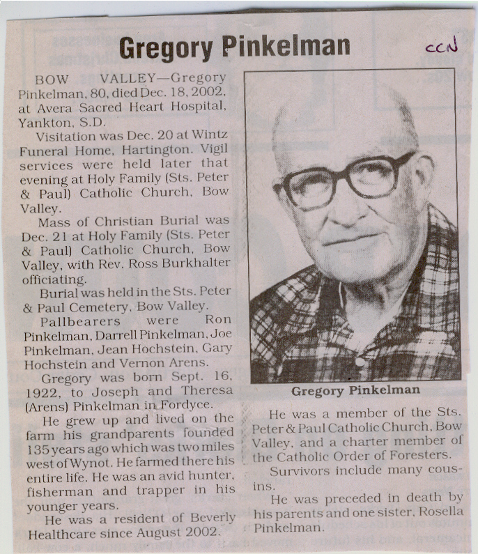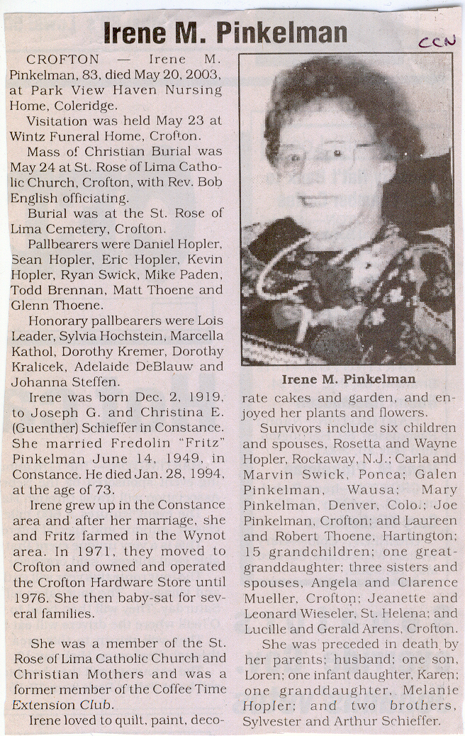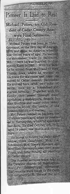 Cedar County, Nebraska Jump ahead to surnames: PANTOJA Marcelino "Marshall" H. Published in: Cedar County News on August 19, 1998 PALMER Pauline Martensen Published in: Cedar County News on January 23, 2002 PALTZ Theresa M. Hausman Published in: Cedar County News on December 23, 1998 PAPENHAUSEN Curtis D. Published in: Cedar County News on July 2, 2003 PARKER Amos S. Published in: Cedar County News on October 16, 1916 PARKER Doris Falk Published in: Cedar County News on March 24, 1999 PARKER Orville Edward Published in: Cedar County News on February 23, 2000 PARKER Theresa Frances Potts Published in: Cedar County News on February 23, 2000 PARSONS Melvin Published in: Cedar County News on September 28, 1939 PAULSEN Chris Published in: The Magnet Cemetery Directory by T. Korth PAULSEN Hannah Andersen Published in: The Magnet Cemetery Directory by T. Korth PAULSEN Sena Published in: Cedar County News on October 30, 1974 PAULSEN Sena Thompson Published in: Cedar County News on November 6, 1974 PAULSON Alma Carlson Published in: The Magnet Cemetery Directory by T. Korth PAULSON Paul Edwin "Ed" Published in: The Magnet Cemetery Directory by T. Korth PAULSON Wayne Gaylord Published in: The Magnet Cemetery Directory by T. Korth PEARSON Ralph Published in: Cedar County News in October 1949 PECK Eugene Published in: Cedar County News on February 10, 1965 PECK Julia Wohlman Merrick Published in: Cedar County News on March 17, 1932 PECK Julia Wohlman Merrick Published in: Cedar County News on March 24, 1932 PECK Truman H. Published in: Cedar County News in September 1954 PEDERSEN Richard Published in: Cedar County News on October 29, 1953 PEITZ Anna Noecker Published in: Hartington Herald on October 30, 1952 PENTICOFF Samuel Published in: Wynot Tribune on January 28, 1910 PERRY Frances Leo Published in: Wynot Tribune on May 18, 1916 PERSON Albert Published in: The Magnet Cemetery Directory by T. Korth PERSON Nellie A. Chrisman Published in: The Magnet Cemetery Directory by T. Korth PETERS Amanda I. Published in: Cedar County News on July 16, 2003 PETERS John M. Published in: Cedar County News on June 10, 1954 PETERS Josephine Koch Published in: Wynot Tribune on March 23, 1916 PETERS Michael Published in: Wynot Tribune on October 10, 1912 PETERS Theodore l. "Ted" Published in: Cedar County News in January 2002 PETERS Twilla Jeannine Beaudette White Published in: The Magnet Cemetery Directory by T. Korth PETERSEN Pete Published in: The Magnet Cemetery Directory by T. Korth PETERSEN Phyllis J. Nordby Published in: Cedar County News on September 12, 2001 PETERSEN Sena Published in: The Magnet Cemetery Directory by T. Korth PETERSON Charley Published in: Cedar County News on July 12, 1951 PETERSON Clinton "Pete" Published in: The Magnet Cemetery Directory by T. Korth PETERSON Hazel V. McCaw Published in: Cedar County News on April 5, 2006 PETERSON Robert L. "Bob" Published in: Cedar County News on May 12, 2004 PETRONELLA Sister M. Published in: Cedar County News on February 24, 1927 PFUND John H. Published in: Cedar County News on October 30, 1974 PICK Cody Dean Published in: Cedar County News on November 3, 1999 PICK David C. Published in: Cedar County News in November 2003 PICK Herbert H. Published in: Cedar County News on May 1, 2002 PICK Theodore F. "Ted" Died November 18, 2000 PICK William H. Jr. Published in: Cedar County News on June 16, 1999 PICKERING Theo. O., Dr. Published in: Randolph Times on January 2, 1930 PICKETT Lloyd "Crockett" Published in: Cedar County News on September 28, 1939 PIEKENBROCK Helen M. Hesse Published in: Cedar County News on March 17, 2004 PIKE Mary Cullen Published in: Wynot Tribune on June 30, 1955 PINKELMAN Alfred A. "Abbey" Published in: Cedar County News in November 2003 PINKELMAN Alphons J. Published in: Cedar County News on May 3, 2000 PINKELMAN August M. Published in: Cedar County News on May 15, 1913 PINKELMAN Ben PINKELMAN Benjamin Louis Published in: Cedar County News on March 10, 1999 PINKELMAN Cecilia Theresa Published in: Cedar County News in November 2003 PINKELMAN Edwin A. Published in: Cedar County News on August 18, 1999 PINKELMAN Gregory Published in: Cedar County News in December 2002 (Vol 105 No 52) PINKELMAN Harold J. Published in: Cedar County News on September 26, 2001 PINKELMAN Irene M. Schieffer Published in: Cedar County News in May 2003 PINKELMAN Irene M. Schieffer Published in: Yankton Press & Dakotan in May 2003 PINKELMAN John C. Published in: Cedar County News on January 28, 1954 PINKELMAN Julius F. Published in: Cedar County News on March 1, 2000 PINKELMAN Lawrence Published in: Cedar County News on January 12, 2000 Obituary Published in: Cedar County News on January 19, 2000 PINKELMAN Lorraine F. Wuebben Published in: Cedar County News on March 13, 2002 PINKELMAN Lyle J. Published in: Cedar County News in December 2002 PINKELMAN Maureen A. Duman Published in: Cedar County News on February 18, 2004 PINKELMAN Mildred Veronica Duman Published in: Cedar County News in April 2007 PINKELMAN Ralph F. Published in: Cedar County News on January 7, 2004 PINKELMAN Rose H. Imoehl Published in: Cedar County News on September 1, 1999 PINKELMAN Rosine C. Hochstein Published in: Cedar County News on October 23, 1974 PINKELMAN Teresa D. Burbach Published in: Cedar County News in May 2002 PINKELMAN Theresa Potberg Published in: Cedar County News on April 6, 1916 PINKLEMEN Cyrus Published in: Cedar County News on October 30, 1919 PLANTENBERG Donovan P. "Donny" Published in: Cedar County News in May 2001 PLOHN Christina Published in: Cedar County News on October 23, 1974 POKORNEY Brian F. Published in: Cedar County News on May 26, 2004 POLLOCK Montgomery K. "Gum" Published in: Cedar County News on May 25, 1939 POPPE Shirley Claussen Published in: The Magnet Cemetery Directory by T. Korth PORTER Ellen F. Liviley Published in: Cedar County News on January 22, 1969 PORTER Elvina Niece Parks Published in: Wynot Tribune on June 6, 1940 PORTER Thomas C. Published 