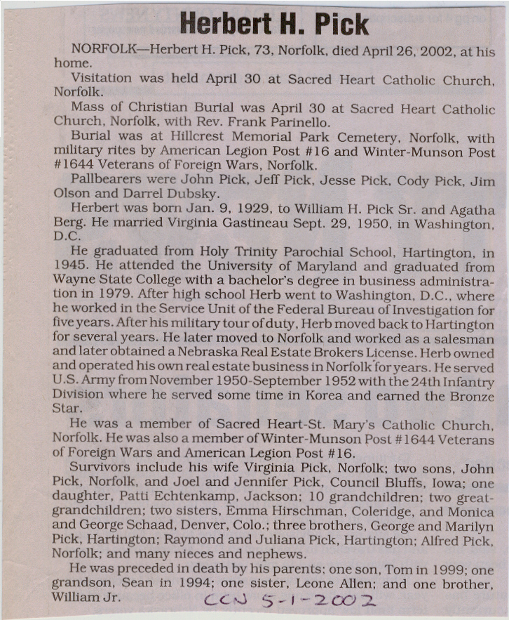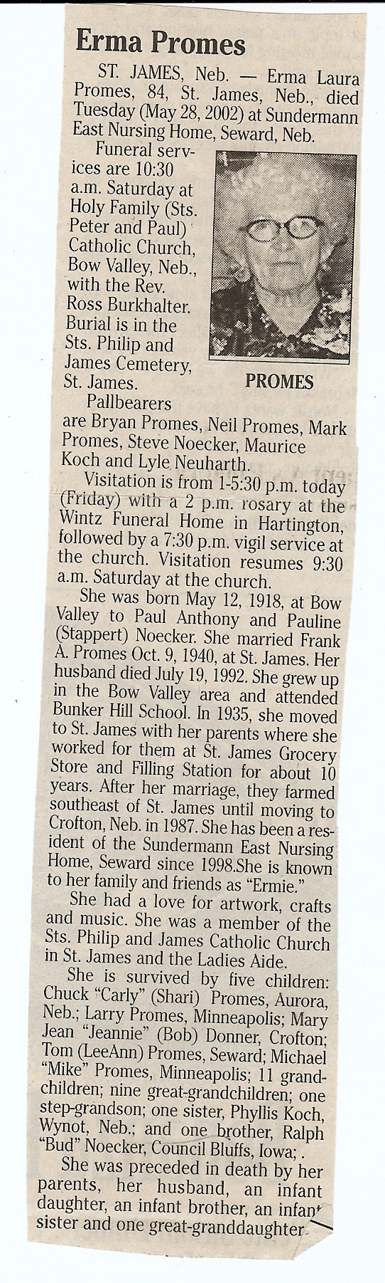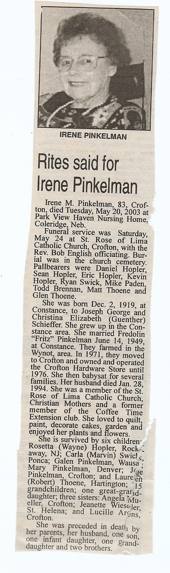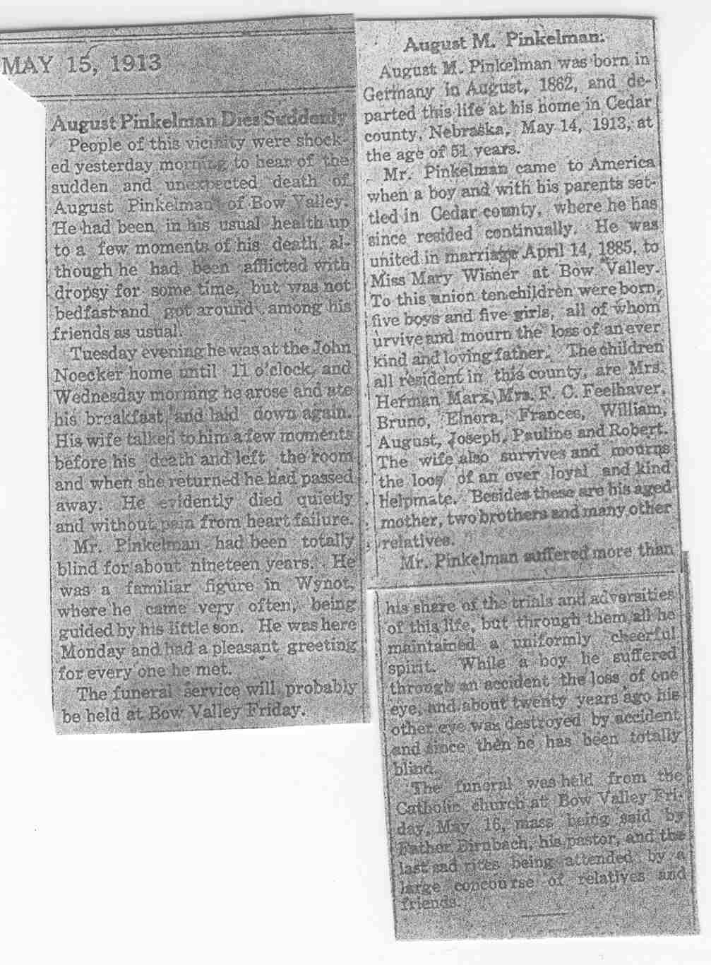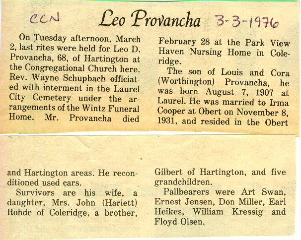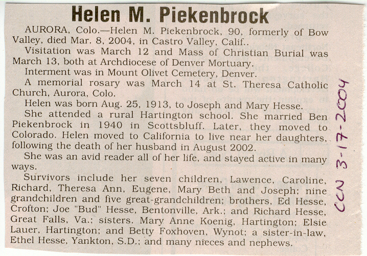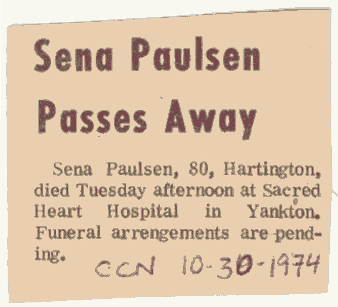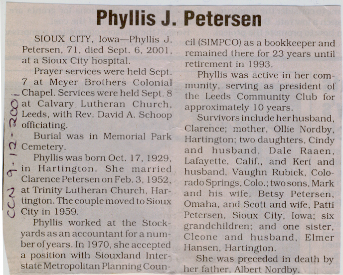 Cedar County, Nebraska Jump ahead to surnames: PANTOJA Marcelino "Marshall" H. Published in: Cedar County News on August 19, 1998 PALMER Pauline Martensen Published in: Cedar County News on January 23, 2002 PALTZ Theresa M. Hausman Published in: Cedar County News on December 23, 1998 PAPENHAUSEN Curtis D. Published in: Cedar County News on July 2, 2003 PARKER Amos S. Published in: Cedar County News on October 16, 1916 PARKER Doris Falk Published in: Cedar County News on March 24, 1999 PARKER Orville Edward Published in: Cedar County News on February 23, 2000 PARKER Theresa Frances Potts Published in: Cedar County News on February 23, 2000 PARSONS Melvin Published in: Cedar County News on September 28, 1939 PAULSEN Chris Published in: The Magnet Cemetery Directory by T. Korth PAULSEN Hannah Andersen Published in: The Magnet Cemetery Directory by T. Korth PAULSEN Sena Published in: Cedar County News on October 30, 1974 PAULSEN Sena Thompson Published in: Cedar County News on November 6, 1974 PAULSON Alma Carlson Published in: The Magnet Cemetery Directory by T. Korth PAULSON Paul Edwin "Ed" Published in: The Magnet Cemetery Directory by T. Korth PAULSON Wayne Gaylord Published in: The Magnet Cemetery Directory by T. Korth PEARSON Ralph Published in: Cedar County News in October 1949 PECK Eugene Published in: Cedar County News on February 10, 1965 PECK Julia Wohlman Merrick Published in: Cedar County News on March 17, 1932 PECK Julia Wohlman Merrick Published in: Cedar County News on March 24, 1932 PECK Truman H. Published in: Cedar County News in September 1954 PEDERSEN Richard Published in: Cedar County News on October 29, 1953 PEITZ Anna Noecker Published in: Hartington Herald on October 30, 1952 PENTICOFF Samuel Published in: Wynot Tribune on January 28, 1910 PERRY Frances Leo Published in: Wynot Tribune on May 18, 1916 PERSON Albert Published in: The Magnet Cemetery Directory by T. Korth PERSON Nellie A. Chrisman Published in: The Magnet Cemetery Directory by T. Korth PETERS Amanda I. Published in: Cedar County News on July 16, 2003 PETERS John M. Published in: Cedar County News on June 10, 1954 PETERS Josephine Koch Published in: Wynot Tribune on March 23, 1916 PETERS Michael Published in: Wynot Tribune on October 10, 1912 PETERS Theodore l. "Ted" Published in: Cedar County News in January 2002 PETERS Twilla Jeannine Beaudette White Published in: The Magnet Cemetery Directory by T. Korth PETERSEN Pete Published in: The Magnet Cemetery Directory by T. Korth PETERSEN Phyllis J. Nordby Published in: Cedar County News on September 12, 2001 PETERSEN Sena Published in: The Magnet Cemetery Directory by T. Korth PETERSON Charley Published in: Cedar County News on July 12, 1951 PETERSON Clinton "Pete" Published in: The Magnet Cemetery Directory by T. Korth PETERSON Hazel V. McCaw Published in: Cedar County News on April 5, 2006 PETERSON Robert L. "Bob" Published in: Cedar County News on May 12, 2004 PETRONELLA Sister M. Published in: Cedar County News on February 24, 1927 PFUND John H. Published in: Cedar County News on October 30, 1974 PICK Cody Dean Published in: Cedar County News on November 3, 1999 PICK David C. Published in: Cedar County News in November 2003 PICK Herbert H. Published in: Cedar County News on May 1, 2002 PICK Theodore F. "Ted" Died November 18, 2000 PICK William H. Jr. Published in: Cedar County News on June 16, 1999 PICKERING Theo. O., Dr. Published in: Randolph Times on January 2, 1930 PICKETT Lloyd "Crockett" Published in: Cedar County News on September 28, 1939 PIEKENBROCK Helen M. Hesse Published in: Cedar County News on March 17, 2004 PIKE Mary Cullen Published in: Wynot Tribune on June 30, 1955 PINKELMAN Alfred A. "Abbey" Published in: Cedar County News in November 2003 PINKELMAN Alphons J. Published in: Cedar County News on May 3, 2000 PINKELMAN August M. Published in: Cedar County News on May 15, 1913 PINKELMAN Ben PINKELMAN Benjamin Louis Published in: Cedar County News on March 10, 1999 PINKELMAN Cecilia Theresa Published in: Cedar County News in November 2003 PINKELMAN Edwin A. Published in: Cedar County News on August 18, 1999 PINKELMAN Gregory Published in: Cedar County News in December 2002 (Vol 105 No 52) PINKELMAN Harold J. Published in: Cedar County News on September 26, 2001 PINKELMAN Irene M. Schieffer Published in: Cedar County News in May 2003 PINKELMAN Irene M. Schieffer Published in: Yankton Press & Dakotan in May 2003 PINKELMAN John C. Published in: Cedar County News on January 28, 1954 PINKELMAN Julius F. Published in: Cedar County News on March 1, 2000 PINKELMAN Lawrence Published in: Cedar County News on January 12, 2000 Obituary Published in: Cedar County News on January 19, 2000 PINKELMAN Lorraine F. Wuebben Published in: Cedar County News on March 13, 2002 PINKELMAN Lyle J. Published in: Cedar County News in December 2002 PINKELMAN Maureen A. Duman Published in: Cedar County News on February 18, 2004 PINKELMAN Mildred Veronica Duman Published in: Cedar County News in April 2007 PINKELMAN Ralph F. Published in: Cedar County News on January 7, 2004 PINKELMAN Rose H. Imoehl Published in: Cedar County News on September 1, 1999 PINKELMAN Rosine C. Hochstein Published in: Cedar County News on October 23, 1974 PINKELMAN Teresa D. Burbach Published in: Cedar County News in May 2002 PINKELMAN Theresa Potberg Published in: Cedar County News on April 6, 1916 PINKLEMEN Cyrus Published in: Cedar County News on October 30, 1919 PLANTENBERG Donovan P. "Donny" Published in: Cedar County News in May 2001 PLOHN Christina Published in: Cedar County News on October 23, 1974 POKORNEY Brian F. Published in: Cedar County News on May 26, 2004 POLLOCK Montgomery K. "Gum" Published in: Cedar County News on May 25, 1939 POPPE Shirley Claussen Published in: The Magnet Cemetery Directory by T. Korth PORTER Ellen F. Liviley Published in: Cedar County News on January 22, 1969 PORTER Elvina Niece Parks Published in: Wynot Tribune on June 6, 1940 PORTER Thomas C. Published 
