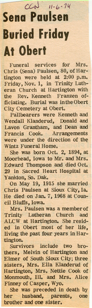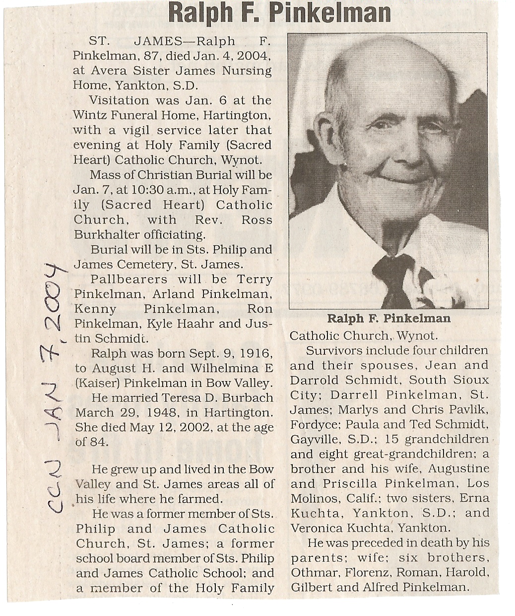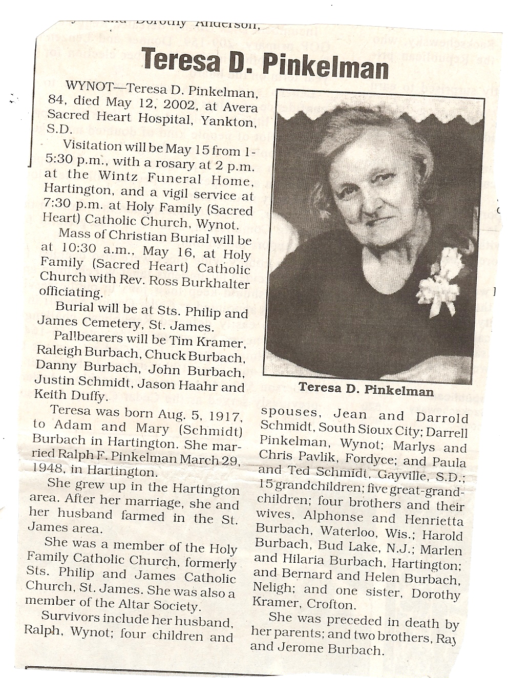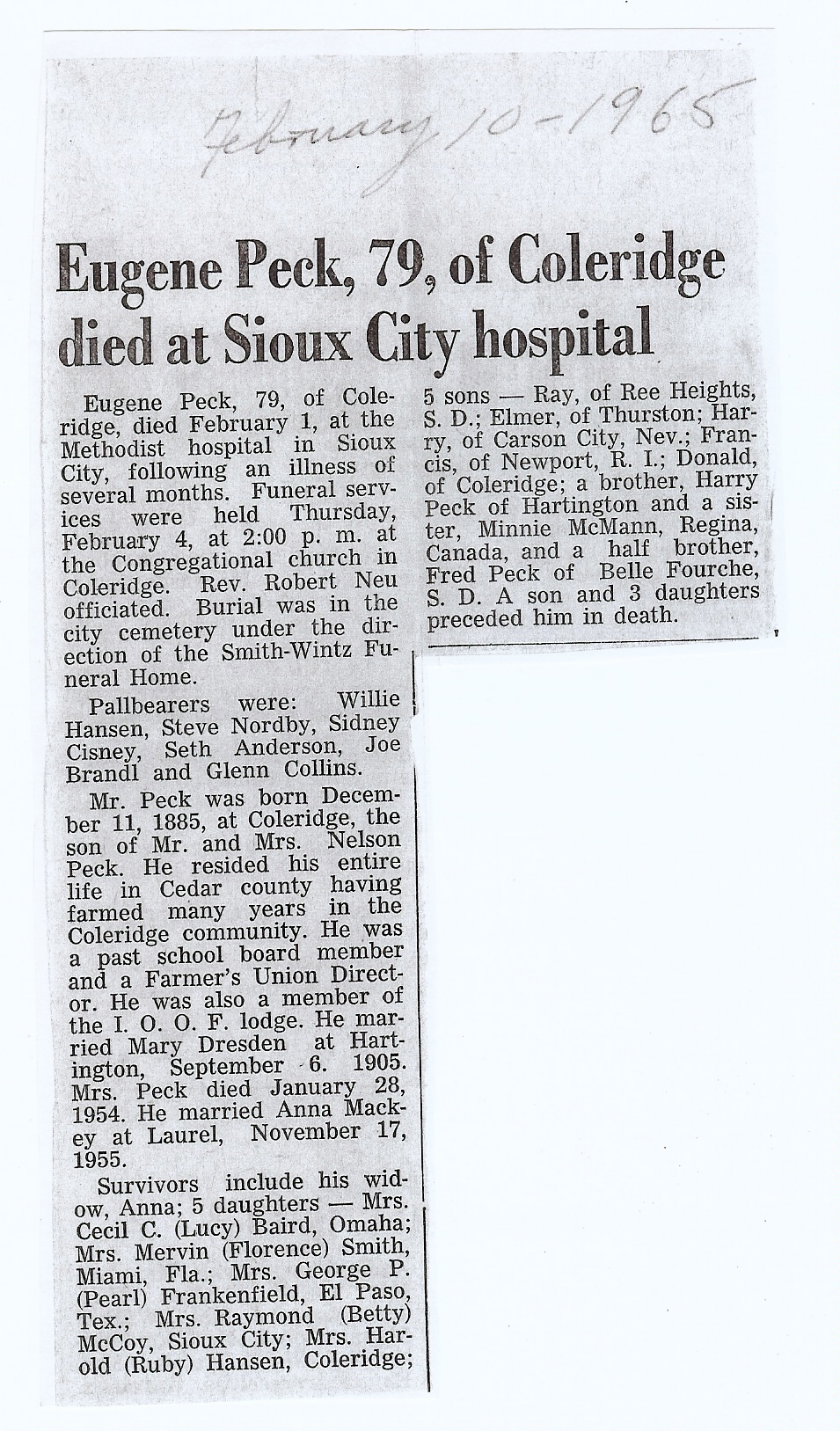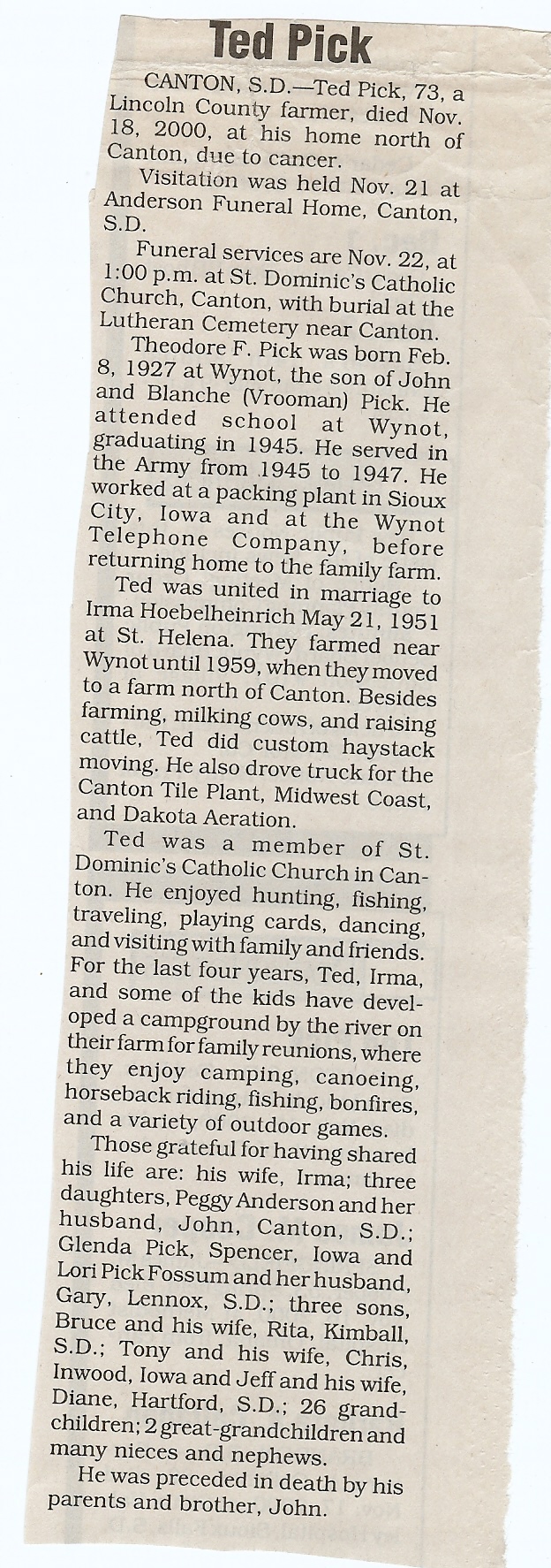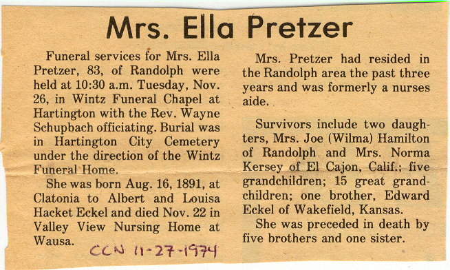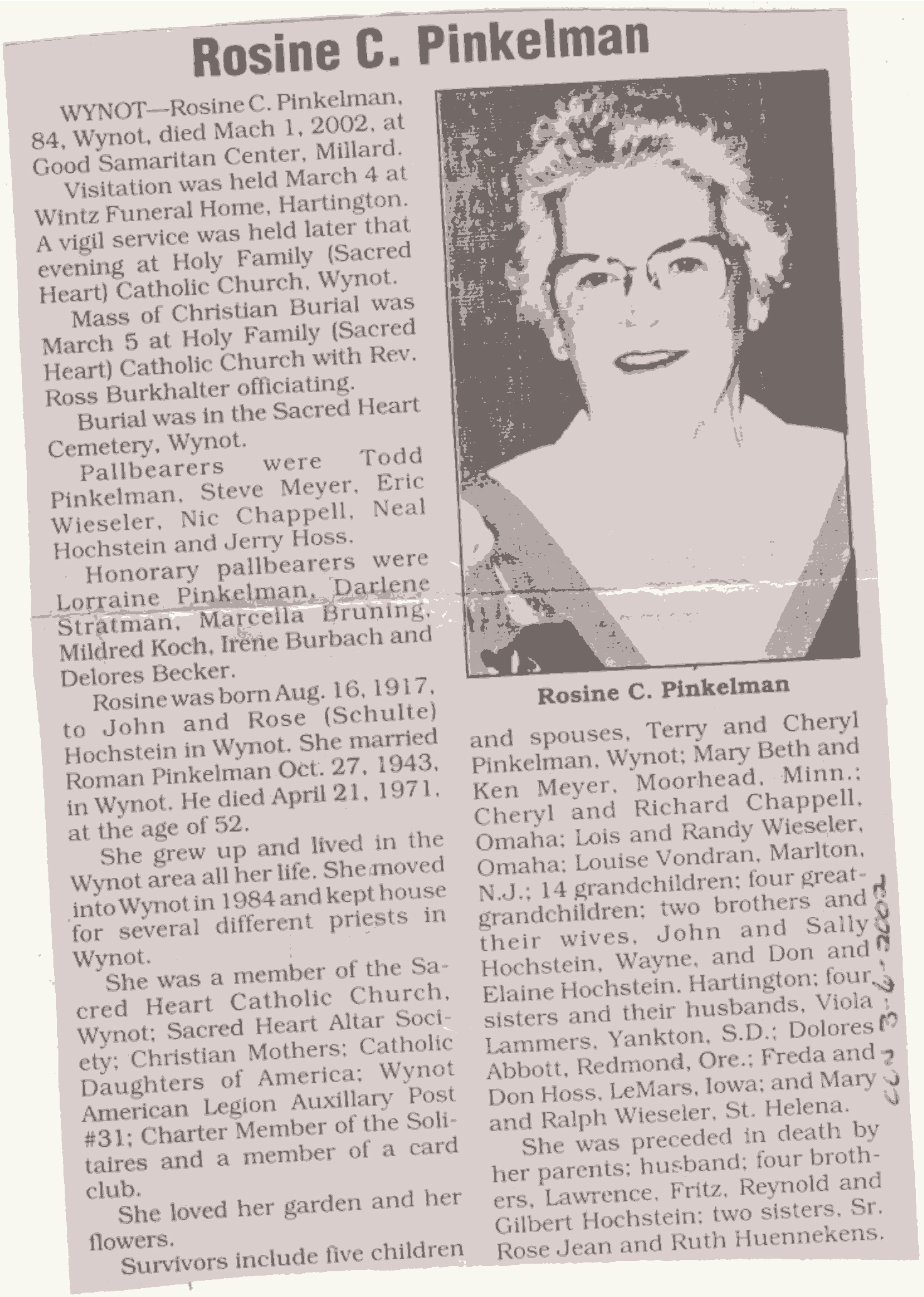 Cedar County, Nebraska Jump ahead to surnames: PANTOJA Marcelino "Marshall" H. Published in: Cedar County News on August 19, 1998 PALMER Pauline Martensen Published in: Cedar County News on January 23, 2002 PALTZ Theresa M. Hausman Published in: Cedar County News on December 23, 1998 PAPENHAUSEN Curtis D. Published in: Cedar County News on July 2, 2003 PARKER Amos S. Published in: Cedar County News on October 16, 1916 PARKER Doris Falk Published in: Cedar County News on March 24, 1999 PARKER Orville Edward Published in: Cedar County News on February 23, 2000 PARKER Theresa Frances Potts Published in: Cedar County News on February 23, 2000 PARSONS Melvin Published in: Cedar County News on September 28, 1939 PAULSEN Chris Published in: The Magnet Cemetery Directory by T. Korth PAULSEN Hannah Andersen Published in: The Magnet Cemetery Directory by T. Korth PAULSEN Sena Published in: Cedar County News on October 30, 1974 PAULSEN Sena Thompson Published in: Cedar County News on November 6, 1974 PAULSON Alma Carlson Published in: The Magnet Cemetery Directory by T. Korth PAULSON Paul Edwin "Ed" Published in: The Magnet Cemetery Directory by T. Korth PAULSON Wayne Gaylord Published in: The Magnet Cemetery Directory by T. Korth PEARSON Ralph Published in: Cedar County News in October 1949 PECK Eugene Published in: Cedar County News on February 10, 1965 PECK Julia Wohlman Merrick Published in: Cedar County News on March 17, 1932 PECK Julia Wohlman Merrick Published in: Cedar County News on March 24, 1932 PECK Truman H. Published in: Cedar County News in September 1954 PEDERSEN Richard Published in: Cedar County News on October 29, 1953 PEITZ Anna Noecker Published in: Hartington Herald on October 30, 1952 PENTICOFF Samuel Published in: Wynot Tribune on January 28, 1910 PERRY Frances Leo Published in: Wynot Tribune on May 18, 1916 PERSON Albert Published in: The Magnet Cemetery Directory by T. Korth PERSON Nellie A. Chrisman Published in: The Magnet Cemetery Directory by T. Korth PETERS Amanda I. Published in: Cedar County News on July 16, 2003 PETERS John M. Published in: Cedar County News on June 10, 1954 PETERS Josephine Koch Published in: Wynot Tribune on March 23, 1916 PETERS Michael Published in: Wynot Tribune on October 10, 1912 PETERS Theodore l. "Ted" Published in: Cedar County News in January 2002 PETERS Twilla Jeannine Beaudette White Published in: The Magnet Cemetery Directory by T. Korth PETERSEN Pete Published in: The Magnet Cemetery Directory by T. Korth PETERSEN Phyllis J. Nordby Published in: Cedar County News on September 12, 2001 PETERSEN Sena Published in: The Magnet Cemetery Directory by T. Korth PETERSON Charley Published in: Cedar County News on July 12, 1951 PETERSON Clinton "Pete" Published in: The Magnet Cemetery Directory by T. Korth PETERSON Hazel V. McCaw Published in: Cedar County News on April 5, 2006 PETERSON Robert L. "Bob" Published in: Cedar County News on May 12, 2004 PETRONELLA Sister M. Published in: Cedar County News on February 24, 1927 PFUND John H. Published in: Cedar County News on October 30, 1974 PICK Cody Dean Published in: Cedar County News on November 3, 1999 PICK David C. Published in: Cedar County News in November 2003 PICK Herbert H. Published in: Cedar County News on May 1, 2002 PICK Theodore F. "Ted" Died November 18, 2000 PICK William H. Jr. Published in: Cedar County News on June 16, 1999 PICKERING Theo. O., Dr. Published in: Randolph Times on January 2, 1930 PICKETT Lloyd "Crockett" Published in: Cedar County News on September 28, 1939 PIEKENBROCK Helen M. Hesse Published in: Cedar County News on March 17, 2004 PIKE Mary Cullen Published in: Wynot Tribune on June 30, 1955 PINKELMAN Alfred A. "Abbey" Published in: Cedar County News in November 2003 PINKELMAN Alphons J. Published in: Cedar County News on May 3, 2000 PINKELMAN August M. Published in: Cedar County News on May 15, 1913 PINKELMAN Ben PINKELMAN Benjamin Louis Published in: Cedar County News on March 10, 1999 PINKELMAN Cecilia Theresa Published in: Cedar County News in November 2003 PINKELMAN Edwin A. Published in: Cedar County News on August 18, 1999 PINKELMAN Gregory Published in: Cedar County News in December 2002 (Vol 105 No 52) PINKELMAN Harold J. Published in: Cedar County News on September 26, 2001 PINKELMAN Irene M. Schieffer Published in: Cedar County News in May 2003 PINKELMAN Irene M. Schieffer Published in: Yankton Press & Dakotan in May 2003 PINKELMAN John C. Published in: Cedar County News on January 28, 1954 PINKELMAN Julius F. Published in: Cedar County News on March 1, 2000 PINKELMAN Lawrence Published in: Cedar County News on January 12, 2000 Obituary Published in: Cedar County News on January 19, 2000 PINKELMAN Lorraine F. Wuebben Published in: Cedar County News on March 13, 2002 PINKELMAN Lyle J. Published in: Cedar County News in December 2002 PINKELMAN Maureen A. Duman Published in: Cedar County News on February 18, 2004 PINKELMAN Mildred Veronica Duman Published in: Cedar County News in April 2007 PINKELMAN Ralph F. Published in: Cedar County News on January 7, 2004 PINKELMAN Rose H. Imoehl Published in: Cedar County News on September 1, 1999 PINKELMAN Rosine C. Hochstein Published in: Cedar County News on October 23, 1974 PINKELMAN Teresa D. Burbach Published in: Cedar County News in May 2002 PINKELMAN Theresa Potberg Published in: Cedar County News on April 6, 1916 PINKLEMEN Cyrus Published in: Cedar County News on October 30, 1919 PLANTENBERG Donovan P. "Donny" Published in: Cedar County News in May 2001 PLOHN Christina Published in: Cedar County News on October 23, 1974 POKORNEY Brian F. Published in: Cedar County News on May 26, 2004 POLLOCK Montgomery K. "Gum" Published in: Cedar County News on May 25, 1939 POPPE Shirley Claussen Published in: The Magnet Cemetery Directory by T. Korth PORTER Ellen F. Liviley Published in: Cedar County News on January 22, 1969 PORTER Elvina Niece Parks Published in: Wynot Tribune on June 6, 1940 PORTER Thomas C. Published 
