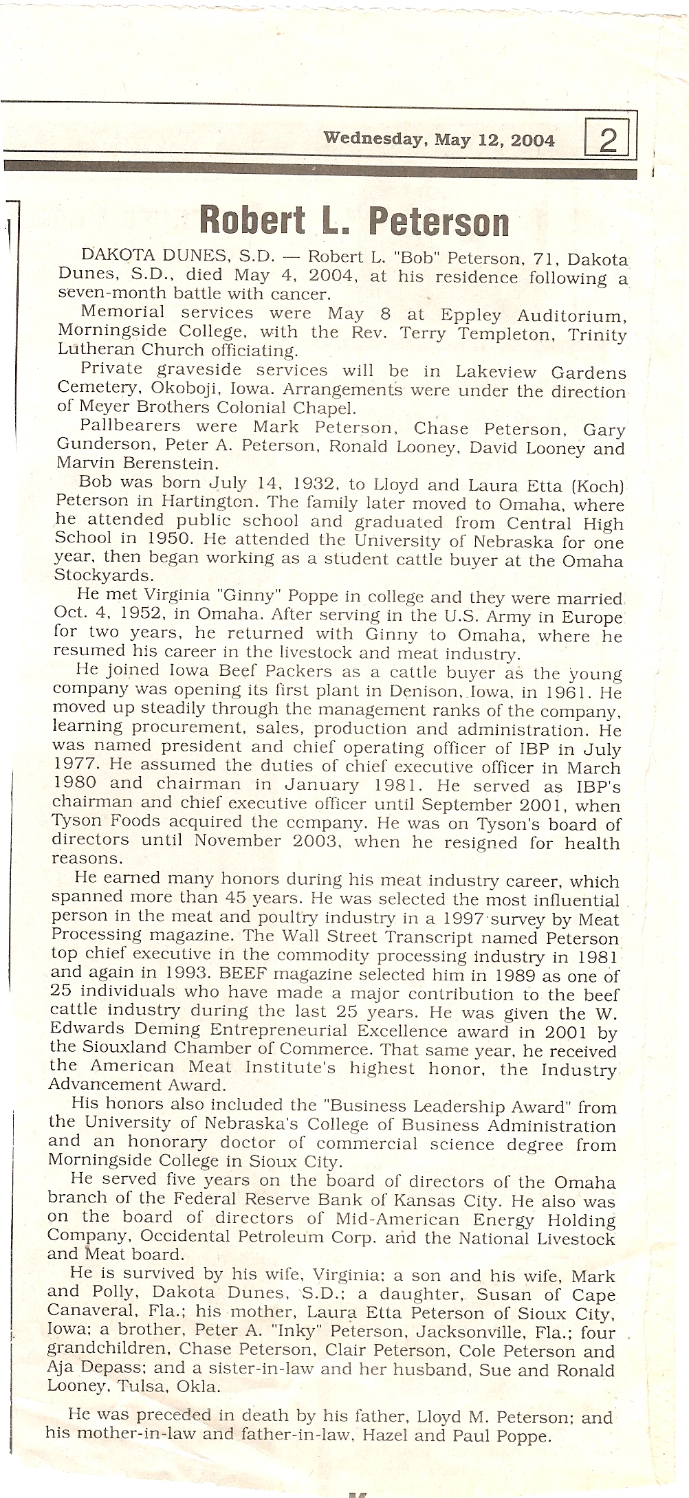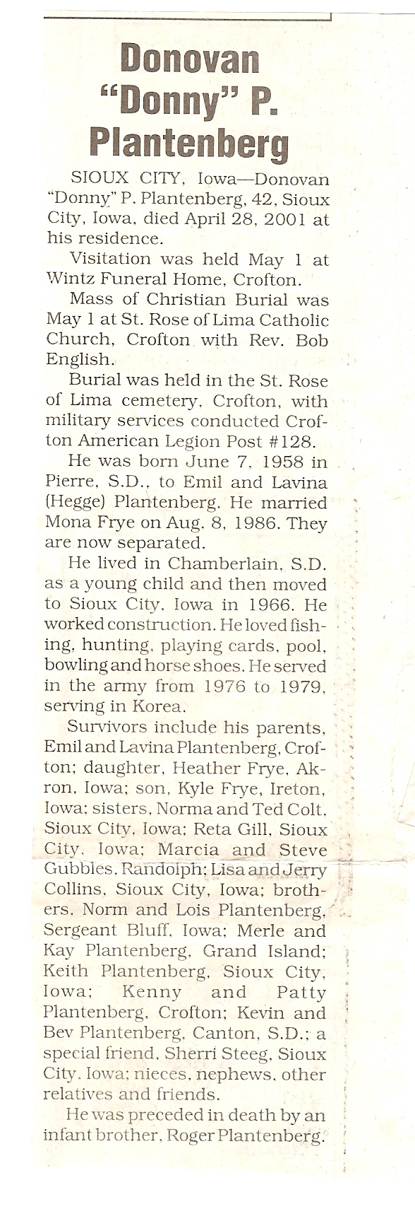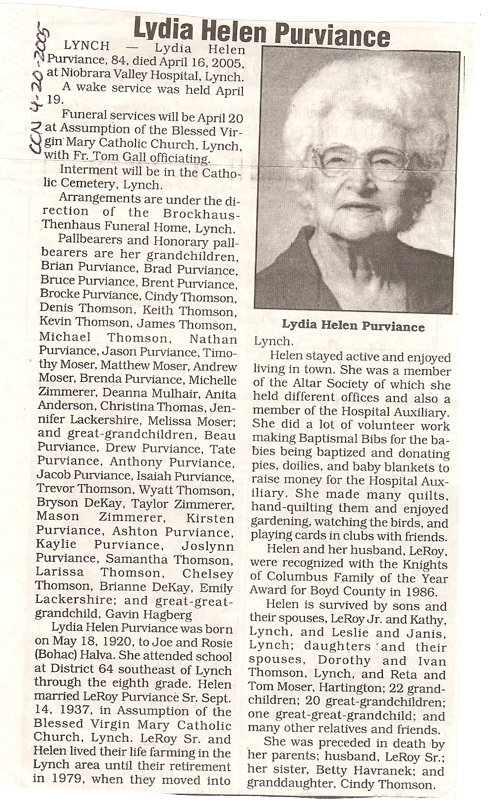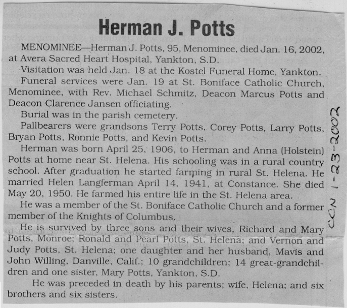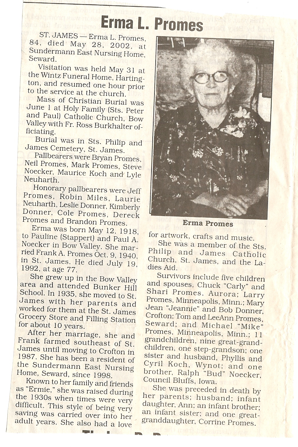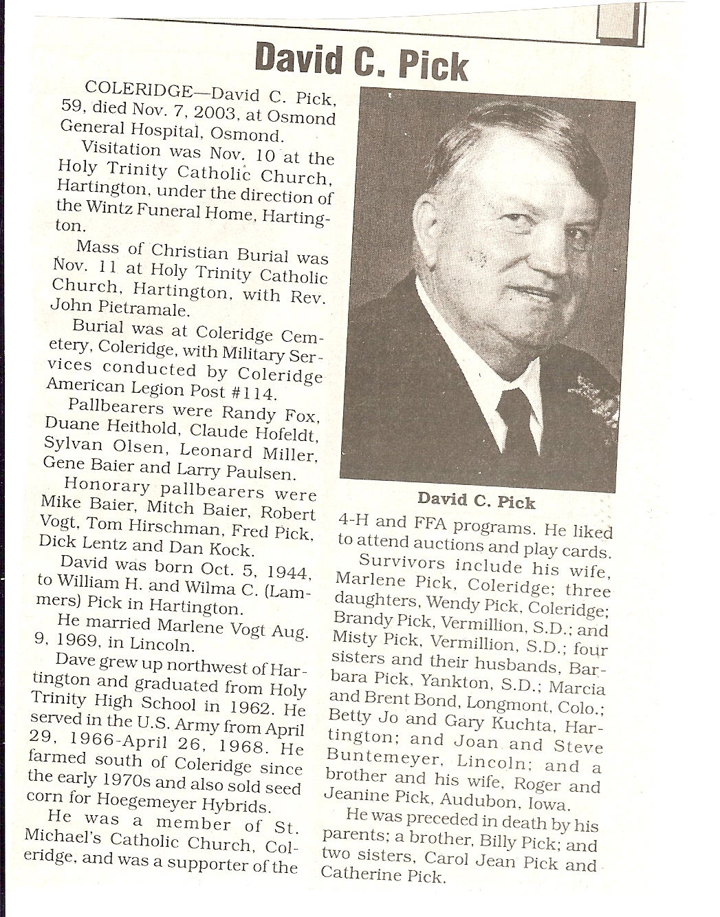 Cedar County, Nebraska Jump ahead to surnames: PANTOJA Marcelino "Marshall" H. Published in: Cedar County News on August 19, 1998 PALMER Pauline Martensen Published in: Cedar County News on January 23, 2002 PALTZ Theresa M. Hausman Published in: Cedar County News on December 23, 1998 PAPENHAUSEN Curtis D. Published in: Cedar County News on July 2, 2003 PARKER Amos S. Published in: Cedar County News on October 16, 1916 PARKER Doris Falk Published in: Cedar County News on March 24, 1999 PARKER Orville Edward Published in: Cedar County News on February 23, 2000 PARKER Theresa Frances Potts Published in: Cedar County News on February 23, 2000 PARSONS Melvin Published in: Cedar County News on September 28, 1939 PAULSEN Chris Published in: The Magnet Cemetery Directory by T. Korth PAULSEN Hannah Andersen Published in: The Magnet Cemetery Directory by T. Korth PAULSEN Sena Published in: Cedar County News on October 30, 1974 PAULSEN Sena Thompson Published in: Cedar County News on November 6, 1974 PAULSON Alma Carlson Published in: The Magnet Cemetery Directory by T. Korth PAULSON Paul Edwin "Ed" Published in: The Magnet Cemetery Directory by T. Korth PAULSON Wayne Gaylord Published in: The Magnet Cemetery Directory by T. Korth PEARSON Ralph Published in: Cedar County News in October 1949 PECK Eugene Published in: Cedar County News on February 10, 1965 PECK Julia Wohlman Merrick Published in: Cedar County News on March 17, 1932 PECK Julia Wohlman Merrick Published in: Cedar County News on March 24, 1932 PECK Truman H. Published in: Cedar County News in September 1954 PEDERSEN Richard Published in: Cedar County News on October 29, 1953 PEITZ Anna Noecker Published in: Hartington Herald on October 30, 1952 PENTICOFF Samuel Published in: Wynot Tribune on January 28, 1910 PERRY Frances Leo Published in: Wynot Tribune on May 18, 1916 PERSON Albert Published in: The Magnet Cemetery Directory by T. Korth PERSON Nellie A. Chrisman Published in: The Magnet Cemetery Directory by T. Korth PETERS Amanda I. Published in: Cedar County News on July 16, 2003 PETERS John M. Published in: Cedar County News on June 10, 1954 PETERS Josephine Koch Published in: Wynot Tribune on March 23, 1916 PETERS Michael Published in: Wynot Tribune on October 10, 1912 PETERS Theodore l. "Ted" Published in: Cedar County News in January 2002 PETERS Twilla Jeannine Beaudette White Published in: The Magnet Cemetery Directory by T. Korth PETERSEN Pete Published in: The Magnet Cemetery Directory by T. Korth PETERSEN Phyllis J. Nordby Published in: Cedar County News on September 12, 2001 PETERSEN Sena Published in: The Magnet Cemetery Directory by T. Korth PETERSON Charley Published in: Cedar County News on July 12, 1951 PETERSON Clinton "Pete" Published in: The Magnet Cemetery Directory by T. Korth PETERSON Hazel V. McCaw Published in: Cedar County News on April 5, 2006 PETERSON Robert L. "Bob" Published in: Cedar County News on May 12, 2004 PETRONELLA Sister M. Published in: Cedar County News on February 24, 1927 PFUND John H. Published in: Cedar County News on October 30, 1974 PICK Cody Dean Published in: Cedar County News on November 3, 1999 PICK David C. Published in: Cedar County News in November 2003 PICK Herbert H. Published in: Cedar County News on May 1, 2002 PICK Theodore F. "Ted" Died November 18, 2000 PICK William H. Jr. Published in: Cedar County News on June 16, 1999 PICKERING Theo. O., Dr. Published in: Randolph Times on January 2, 1930 PICKETT Lloyd "Crockett" Published in: Cedar County News on September 28, 1939 PIEKENBROCK Helen M. Hesse Published in: Cedar County News on March 17, 2004 PIKE Mary Cullen Published in: Wynot Tribune on June 30, 1955 PINKELMAN Alfred A. "Abbey" Published in: Cedar County News in November 2003 PINKELMAN Alphons J. Published in: Cedar County News on May 3, 2000 PINKELMAN August M. Published in: Cedar County News on May 15, 1913 PINKELMAN Ben PINKELMAN Benjamin Louis Published in: Cedar County News on March 10, 1999 PINKELMAN Cecilia Theresa Published in: Cedar County News in November 2003 PINKELMAN Edwin A. Published in: Cedar County News on August 18, 1999 PINKELMAN Gregory Published in: Cedar County News in December 2002 (Vol 105 No 52) PINKELMAN Harold J. Published in: Cedar County News on September 26, 2001 PINKELMAN Irene M. Schieffer Published in: Cedar County News in May 2003 PINKELMAN Irene M. Schieffer Published in: Yankton Press & Dakotan in May 2003 PINKELMAN John C. Published in: Cedar County News on January 28, 1954 PINKELMAN Julius F. Published in: Cedar County News on March 1, 2000 PINKELMAN Lawrence Published in: Cedar County News on January 12, 2000 Obituary Published in: Cedar County News on January 19, 2000 PINKELMAN Lorraine F. Wuebben Published in: Cedar County News on March 13, 2002 PINKELMAN Lyle J. Published in: Cedar County News in December 2002 PINKELMAN Maureen A. Duman Published in: Cedar County News on February 18, 2004 PINKELMAN Mildred Veronica Duman Published in: Cedar County News in April 2007 PINKELMAN Ralph F. Published in: Cedar County News on January 7, 2004 PINKELMAN Rose H. Imoehl Published in: Cedar County News on September 1, 1999 PINKELMAN Rosine C. Hochstein Published in: Cedar County News on October 23, 1974 PINKELMAN Teresa D. Burbach Published in: Cedar County News in May 2002 PINKELMAN Theresa Potberg Published in: Cedar County News on April 6, 1916 PINKLEMEN Cyrus Published in: Cedar County News on October 30, 1919 PLANTENBERG Donovan P. "Donny" Published in: Cedar County News in May 2001 PLOHN Christina Published in: Cedar County News on October 23, 1974 POKORNEY Brian F. Published in: Cedar County News on May 26, 2004 POLLOCK Montgomery K. "Gum" Published in: Cedar County News on May 25, 1939 POPPE Shirley Claussen Published in: The Magnet Cemetery Directory by T. Korth PORTER Ellen F. Liviley Published in: Cedar County News on January 22, 1969 PORTER Elvina Niece Parks Published in: Wynot Tribune on June 6, 1940 PORTER Thomas C. Published 