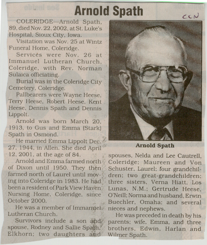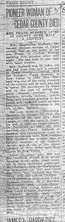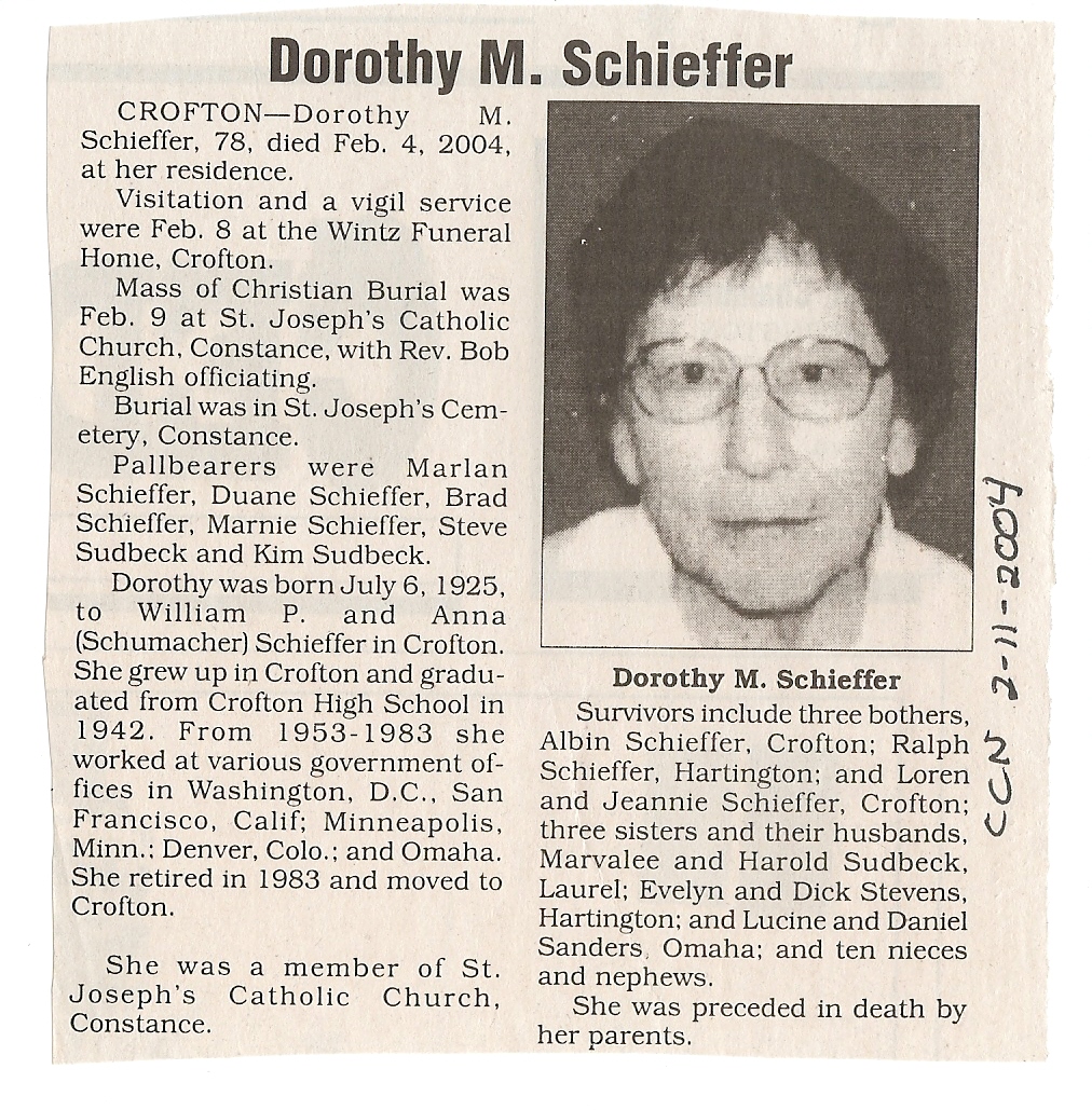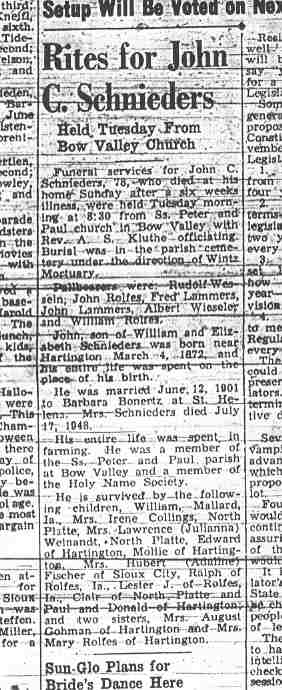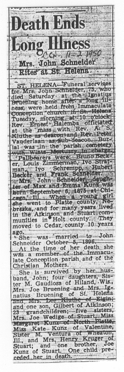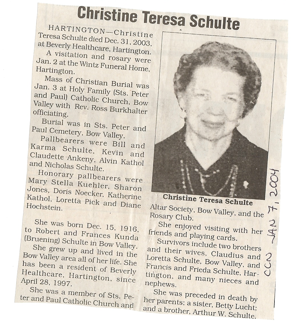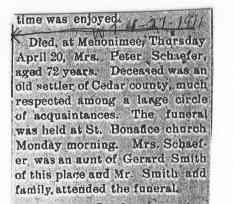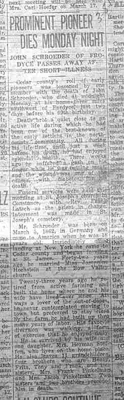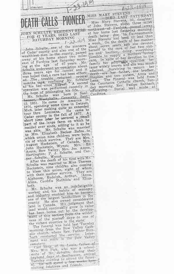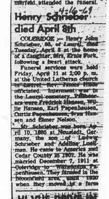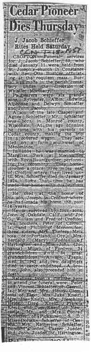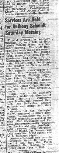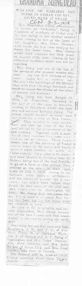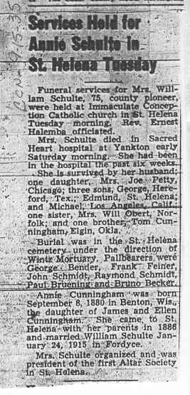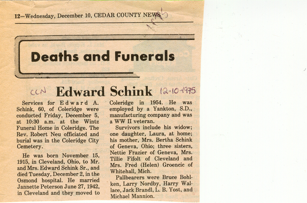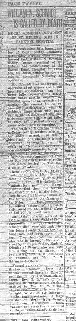Cedar County, Nebraska Jump ahead to surnames: SAGE Betty J. Hill Published in: Cedar County News on October 13, 2004 SAGE Doris E. Trombley Published in: Cedar County News on April 17, 1999 SAGE George "June" Published in: Cedar County News on September 29, 1999 SAGE Lawrence Wilfred Published in: Cedar County News on September 29, 1999 SAHS Warren W., Dr. Published in: Cedar County News on December 24, 2003 SALA Eva Pearl Hintz Published in: Cedar County News on March 2, 2005 SALOMA Sister M. Eickleman Published in: Wynot Tribune on March 9, 1939 SALVATORI Theresa M. Schroeder Published in: Cedar County News on January 5, 2000 SAMELSON Jack W. Published in: Cedar County News on March 23, 2003 SAMELSON Lola N. Nelson Published in: Cedar County News on October 1, 1975 SANDBERG Baby Published in: The Magnet Cemetery Directory by T. Korth SANDIDGE Louis L. Published in: Cedar County News on August 31, 2005 SASSAMAN Kathryn Marie Tower Published in: Cedar County News in July 2002 SASSEN William K. Published in: Cedar County News on February 25, 2004 SATORIUS Christian Published in: Cedar County News in January 1944 SATORIUS Katherine Bergman Obit Image Published in: Cedar County News on May 13, 1954 Published in Sioux City Journal on May 9, 1954 SAWATZKE Elizabeth Eggers Published in: Cedar County News on November 10, 1975 SAYLOR Ann Marie Bracht Published in: Cedar County News on December 6, 2000 SCHAECHER Terrance Arthur "Terry" Published in: Cedar County News on April 20, 2005 SCHAEFER Mary Published in: Cedar County News on May 25, 1922 SCHAEFER Mrs. Peter Published in: Wynot Tribune on April 27, 1911 SCHAEFER Peter Published in: Cedar County News on March 4, 1920 SCHAEGER Henry "Bob" Published in: Cedar County News on February 25, 1960 SCHAGER Mrs. Christine Published in: Cedar County News on July 5, 1922 SCHAGER Larry D. Published in: Cedar County News on March 7, 2001 SCHAGER Lloyd Published in: Cedar County News on November 28, 1940 SCHALLER Harry Published in: Wynot Tribune on February 28, 1952 SCHALLERT William L. Sr. Published in: Cedar County News on March 14, 2001 SCHIEFFER Christina Elizabeth Guenther Published in: Cedar County News on January 7, 1976 SCHIEFFER Dorothy M. Published in: Cedar County News on February 11, 2004 SCHIEFFER J. Jacob Published in: Cedar County News on January 18, 1951 SCHIEFFER John Published in: Cedar County News on February 1, 1923 SCHIEFFER Joseph W. Published in: Cedar County News on December 21, 2000 SCHIEFFER Joseph W. Published in: Cedar County News on December 21, 2000 SCHIEFFER Mrs. Jacob Published in: Cedar County News on January 24, 1924 SCHIEFFER Peter J. Jr. Published in: Cedar County News on January 24, 2001 SCHINDLER Elda E. Published in: Cedar County News on January 2003 SCHINDLER Pearl Iva Carpenter Published in: Cedar County News on November 6, 1974 SCHINK Edward A. Published in: Cedar County News on December 10, 1975 SCHMECKPEPER Garron L. Published in: Cedar County News on December 20, 2000 SCHMIDT Agnes Betz Published in: Yankton Daily Press & Dakotan in October 1990 SCHMIDT Anna Hoese Published in: Wynot Tribune on November 12, 1914 SCHMIDT Anthony Published in: Cedar County News on October 13, 1955 SCHMIDT Frank Published in: Cedar County News on February 18, 1925 SCHMIDT Gerald Jr. Published in: Cedar County News on June 21, 1923 SCHMIDT Irene M. Lechner Published in: Cedar County News on May 9, 2001 SCHMIDT Kenneth Leonard Published in: Cedar County News on February 12, 2003 SCHMIDT Laurence Howard Published in: Wynot Tribune on October 9, 1913 SCHMIDT Lewis Published in: Yankton Press & Dakotan on February 15, 2001 SCHMIDT Sharon K. Mann Published in: Cedar County News on January 30, 2002 SCHMIDT Stanley N. Published in: Cedar County News on November 3, 1999 SCHMIDT Verna E. Hoesing Published in: Cedar County News in July 2000 SCHMIDT William N. Published in: Cedar County News on February 5, 1931 SCHMIT Jamie Published in: Cedar County News on October 15, 2003 SCHNEIDER Muriel Vivian Gowery Kelley Published in: Cedar County News in April 2003 SCHNEIDER Theresa Wuebben Published in: Cedar County News on July 18, 1979 SCHNEIDER Mrs. John [nee Kunz] Published in: Cedar County News on November 2, 1950 SCHNIEDERS Herman Bernard Published in: Cedar County News on July 16, 2003 SCHNIEDERS John C. Obit Image Published in: Cedar County News. SCHNIEDERS Ralph Published in: Cedar County News in December 2005 SCHOENBERNER Iven L. Published in: Cedar County News on July 26, 2000 SCHOLL Elizabeth Alvina Published in: Cedar County News on January 2?, 1951 SCHRIEBER Henry Published in: Cedar County News on April 16, 1969 SCHREINER John Published in: Cedar County News on March 1, 2000 SCHREMPP Carl Published in: Cedar County News on October 22, 1975 SCHREMPP Fred Published in: Cedar County News on October 1, 1975 SCHREMPP Mrs. Joseph (nee PETERS) Published in: Cedar County News on Oct. 22, 1915 SCHREMPP Joseph Published in: Cedar County News on March 12, 1921 SCHRIBER Dorothy Marie Kalin Published in: Cedar County News on November 29, 2000 SCHROEDER Dina Published in: Cedar County News on October 16, 1908 SCHROEDER Elizabeth Feldhacker/a> Published in: Cedar County News on February 16, 2005 SCHROEDER John Published in: Cedar County News. Date of Publication/Death: Mar. 8, 1931 SCHROEDER LeRoy F. Published in: Cedar County News on October 20, 2004 SCHULTE Mrs. Bruno (nee Stuckenhoff) Published in: Cedar County News on April 19, 1917 SCHULTE Annie Cunningham Published in: Cedar County News on September 15, 1935 SCHULTE Christine Teresa Published in: Cedar County News on January 7, 2004 SCHULTE Elizabeth Bruening "Lizzie" Published in: Hartington Herald Obit Image Published in: Wynot Tribune on April 20, 1911 SCHULTE Frank X. Published in: Cedar County News on January 8, 1975 SCHULTE Fred Henry Published in: Cedar County News. Date of Publication/Death: Sept. 21, 1951 SCHULTE Frieda M. Sudbeck Published in: Cedar County News on January 8, 1975Ma