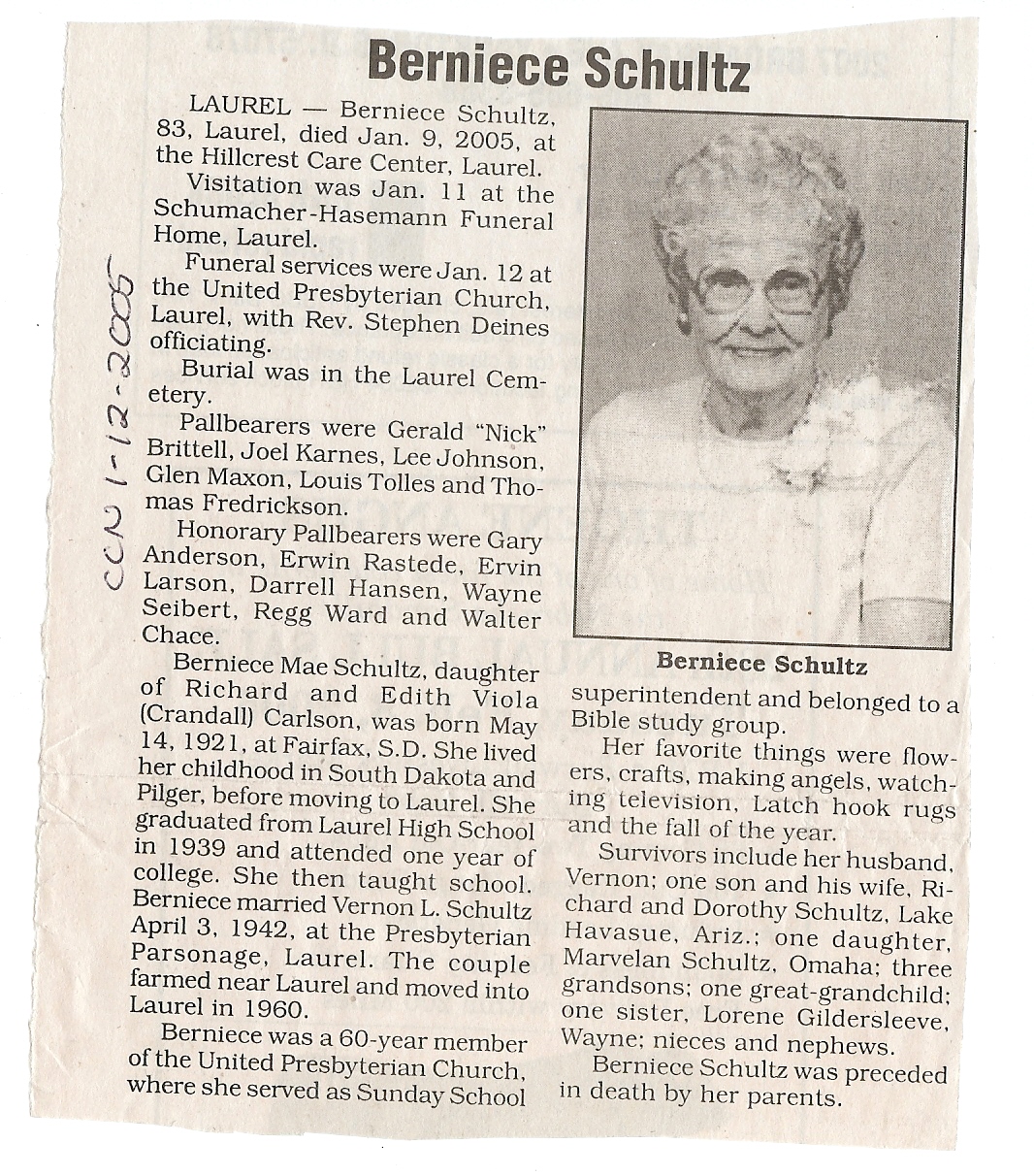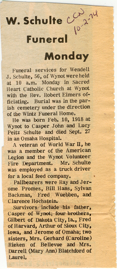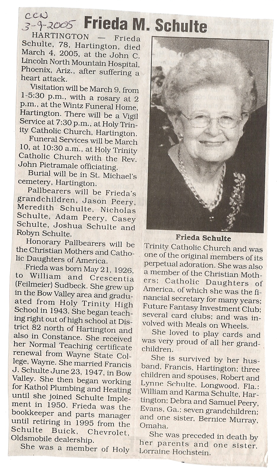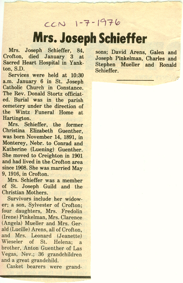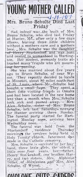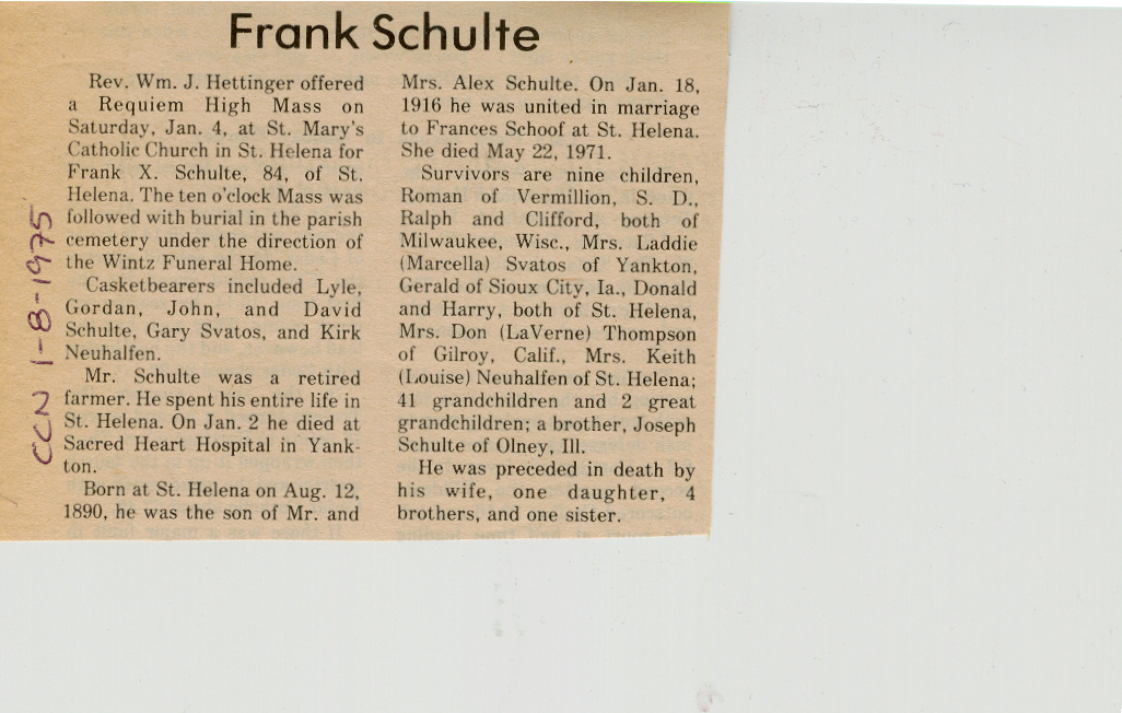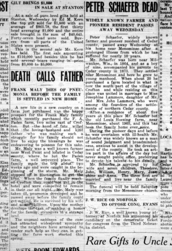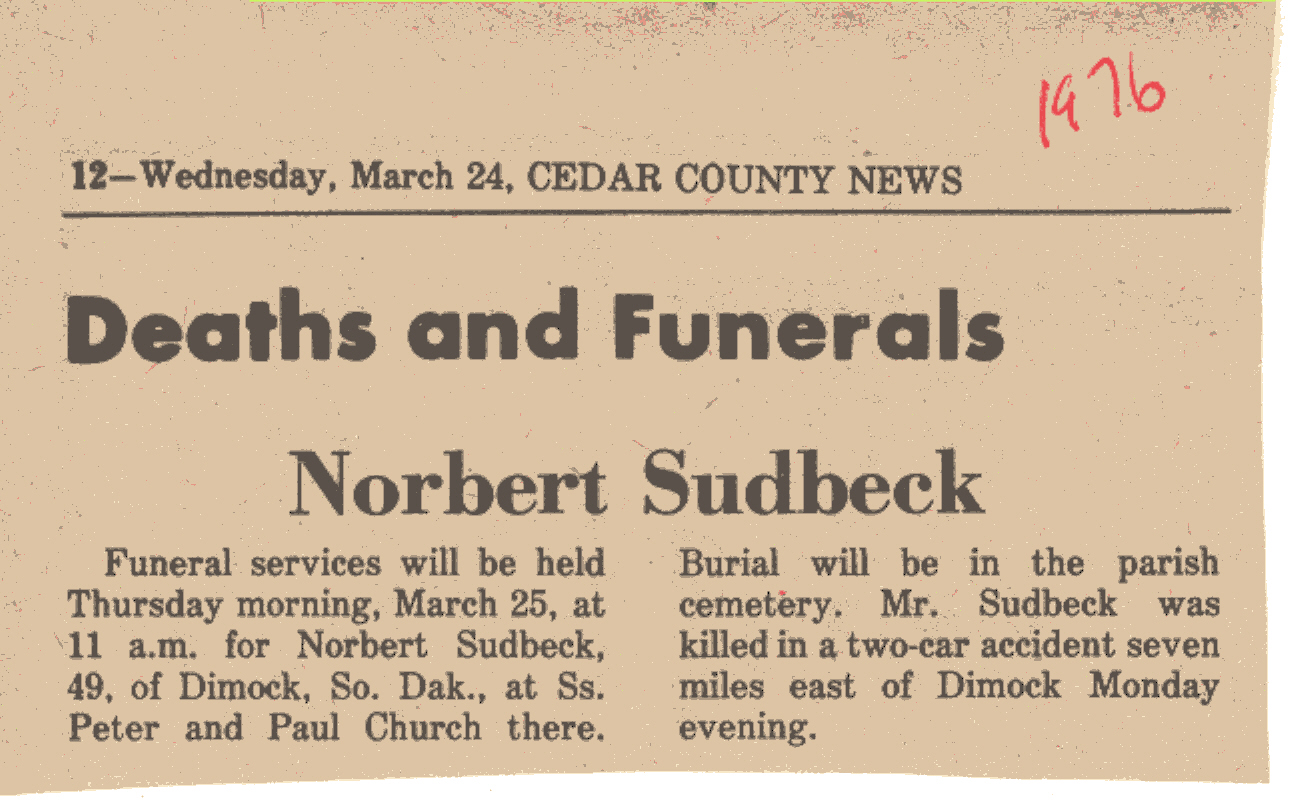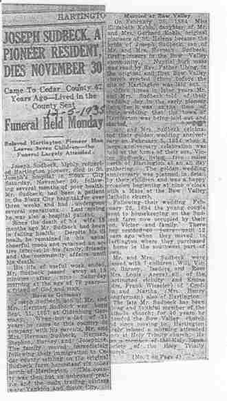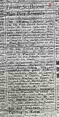 Cedar County, Nebraska Jump ahead to surnames: SAGE Betty J. Hill Published in: Cedar County News on October 13, 2004 SAGE Doris E. Trombley Published in: Cedar County News on April 17, 1999 SAGE George "June" Published in: Cedar County News on September 29, 1999 SAGE Lawrence Wilfred Published in: Cedar County News on September 29, 1999 SAHS Warren W., Dr. Published in: Cedar County News on December 24, 2003 SALA Eva Pearl Hintz Published in: Cedar County News on March 2, 2005 SALOMA Sister M. Eickleman Published in: Wynot Tribune on March 9, 1939 SALVATORI Theresa M. Schroeder Published in: Cedar County News on January 5, 2000 SAMELSON Jack W. Published in: Cedar County News on March 23, 2003 SAMELSON Lola N. Nelson Published in: Cedar County News on October 1, 1975 SANDBERG Baby Published in: The Magnet Cemetery Directory by T. Korth SANDIDGE Louis L. Published in: Cedar County News on August 31, 2005 SASSAMAN Kathryn Marie Tower Published in: Cedar County News in July 2002 SASSEN William K. Published in: Cedar County News on February 25, 2004 SATORIUS Christian Published in: Cedar County News in January 1944 SATORIUS Katherine Bergman Obit Image Published in: Cedar County News on May 13, 1954 Published in Sioux City Journal on May 9, 1954 SAWATZKE Elizabeth Eggers Published in: Cedar County News on November 10, 1975 SAYLOR Ann Marie Bracht Published in: Cedar County News on December 6, 2000 SCHAECHER Terrance Arthur "Terry" Published in: Cedar County News on April 20, 2005 SCHAEFER Mary Published in: Cedar County News on May 25, 1922 SCHAEFER Mrs. Peter Published in: Wynot Tribune on April 27, 1911 SCHAEFER Peter Published in: Cedar County News on March 4, 1920 SCHAEGER Henry "Bob" Published in: Cedar County News on February 25, 1960 SCHAGER Mrs. Christine Published in: Cedar County News on July 5, 1922 SCHAGER Larry D. Published in: Cedar County News on March 7, 2001 SCHAGER Lloyd Published in: Cedar County News on November 28, 1940 SCHALLER Harry Published in: Wynot Tribune on February 28, 1952 SCHALLERT William L. Sr. Published in: Cedar County News on March 14, 2001 SCHIEFFER Christina Elizabeth Guenther Published in: Cedar County News on January 7, 1976 SCHIEFFER Dorothy M. Published in: Cedar County News on February 11, 2004 SCHIEFFER J. Jacob Published in: Cedar County News on January 18, 1951 SCHIEFFER John Published in: Cedar County News on February 1, 1923 SCHIEFFER Joseph W. Published in: Cedar County News on December 21, 2000 SCHIEFFER Joseph W. Published in: Cedar County News on December 21, 2000 SCHIEFFER Mrs. Jacob Published in: Cedar County News on January 24, 1924 SCHIEFFER Peter J. Jr. Published in: Cedar County News on January 24, 2001 SCHINDLER Elda E. Published in: Cedar County News on January 2003 SCHINDLER Pearl Iva Carpenter Published in: Cedar County News on November 6, 1974 SCHINK Edward A. Published in: Cedar County News on December 10, 1975 SCHMECKPEPER Garron L. Published in: Cedar County News on December 20, 2000 SCHMIDT Agnes Betz Published in: Yankton Daily Press & Dakotan in October 1990 SCHMIDT Anna Hoese Published in: Wynot Tribune on November 12, 1914 SCHMIDT Anthony Published in: Cedar County News on October 13, 1955 SCHMIDT Frank Published in: Cedar County News on February 18, 1925 SCHMIDT Gerald Jr. Published in: Cedar County News on June 21, 1923 SCHMIDT Irene M. Lechner Published in: Cedar County News on May 9, 2001 SCHMIDT Kenneth Leonard Published in: Cedar County News on February 12, 2003 SCHMIDT Laurence Howard Published in: Wynot Tribune on October 9, 1913 SCHMIDT Lewis Published in: Yankton Press & Dakotan on February 15, 2001 SCHMIDT Sharon K. Mann Published in: Cedar County News on January 30, 2002 SCHMIDT Stanley N. Published in: Cedar County News on November 3, 1999 SCHMIDT Verna E. Hoesing Published in: Cedar County News in July 2000 SCHMIDT William N. Published in: Cedar County News on February 5, 1931 SCHMIT Jamie Published in: Cedar County News on October 15, 2003 SCHNEIDER Muriel Vivian Gowery Kelley Published in: Cedar County News in April 2003 SCHNEIDER Theresa Wuebben Published in: Cedar County News on July 18, 1979 SCHNEIDER Mrs. John [nee Kunz] Published in: Cedar County News on November 2, 1950 SCHNIEDERS Herman Bernard Published in: Cedar County News on July 16, 2003 SCHNIEDERS John C. Obit Image Published in: Cedar County News. SCHNIEDERS Ralph Published in: Cedar County News in December 2005 SCHOENBERNER Iven L. Published in: Cedar County News on July 26, 2000 SCHOLL Elizabeth Alvina Published in: Cedar County News on January 2?, 1951 SCHRIEBER Henry Published in: Cedar County News on April 16, 1969 SCHREINER John Published in: Cedar County News on March 1, 2000 SCHREMPP Carl Published in: Cedar County News on October 22, 1975 SCHREMPP Fred Published in: Cedar County News on October 1, 1975 SCHREMPP Mrs. Joseph (nee PETERS) Published in: Cedar County News on Oct. 22, 1915 SCHREMPP Joseph Published in: Cedar County News on March 12, 1921 SCHRIBER Dorothy Marie Kalin Published in: Cedar County News on November 29, 2000 SCHROEDER Dina Published in: Cedar County News on October 16, 1908 SCHROEDER Elizabeth Feldhacker/a> Published in: Cedar County News on February 16, 2005 SCHROEDER John Published in: Cedar County News. Date of Publication/Death: Mar. 8, 1931 SCHROEDER LeRoy F. Published in: Cedar County News on October 20, 2004 SCHULTE Mrs. Bruno (nee Stuckenhoff) Published in: Cedar County News on April 19, 1917 SCHULTE Annie Cunningham Published in: Cedar County News on September 15, 1935 SCHULTE Christine Teresa Published in: Cedar County News on January 7, 2004 SCHULTE Elizabeth Bruening "Lizzie" Published in: Hartington Herald Obit Image Published in: Wynot Tribune on April 20, 1911 SCHULTE Frank X. Published in: Cedar County News on January 8, 1975 SCHULTE Fred Henry Published in: Cedar County News. Date of Publication/Death: Sept. 21, 1951 SCHULTE Frieda M. Sudbeck Published in: Cedar County News on January 8, 1975Ma
