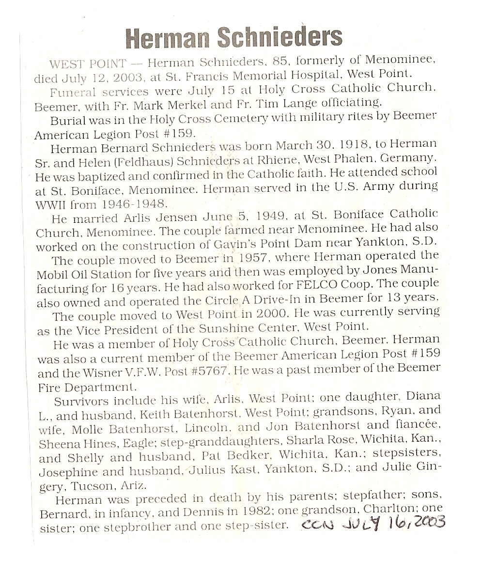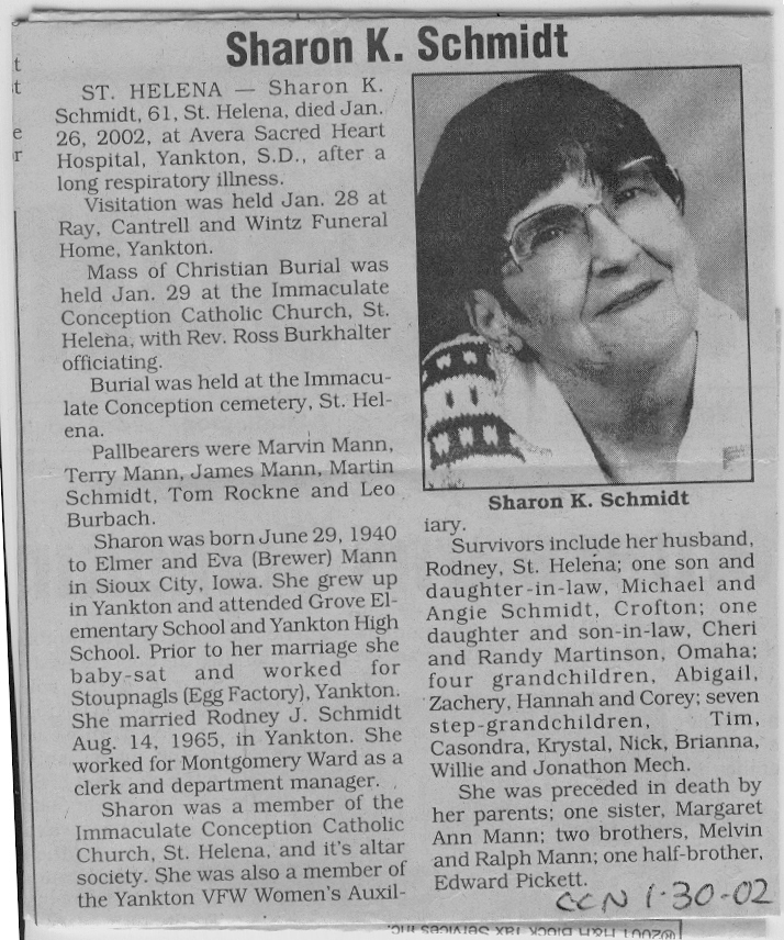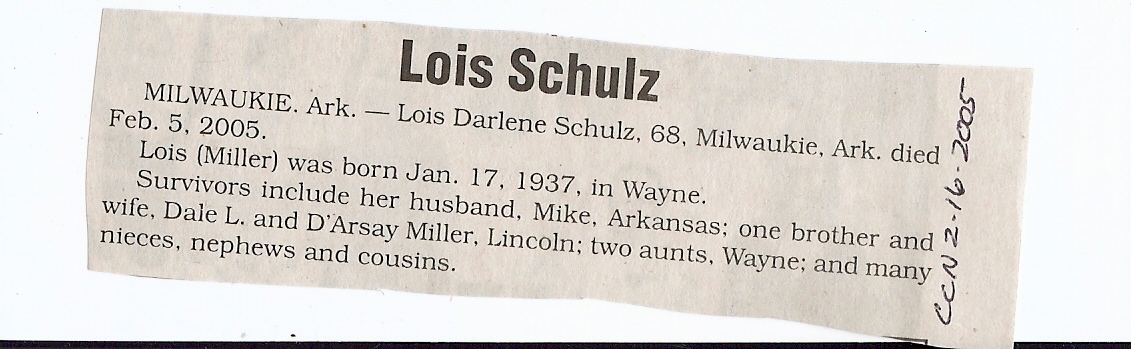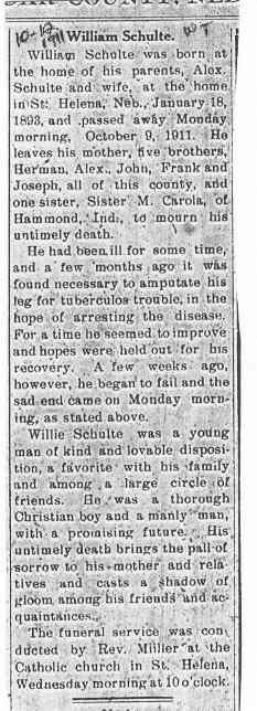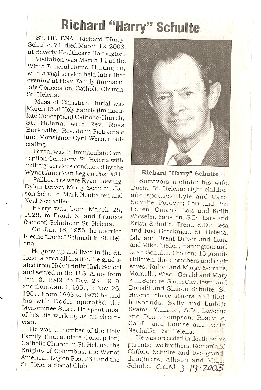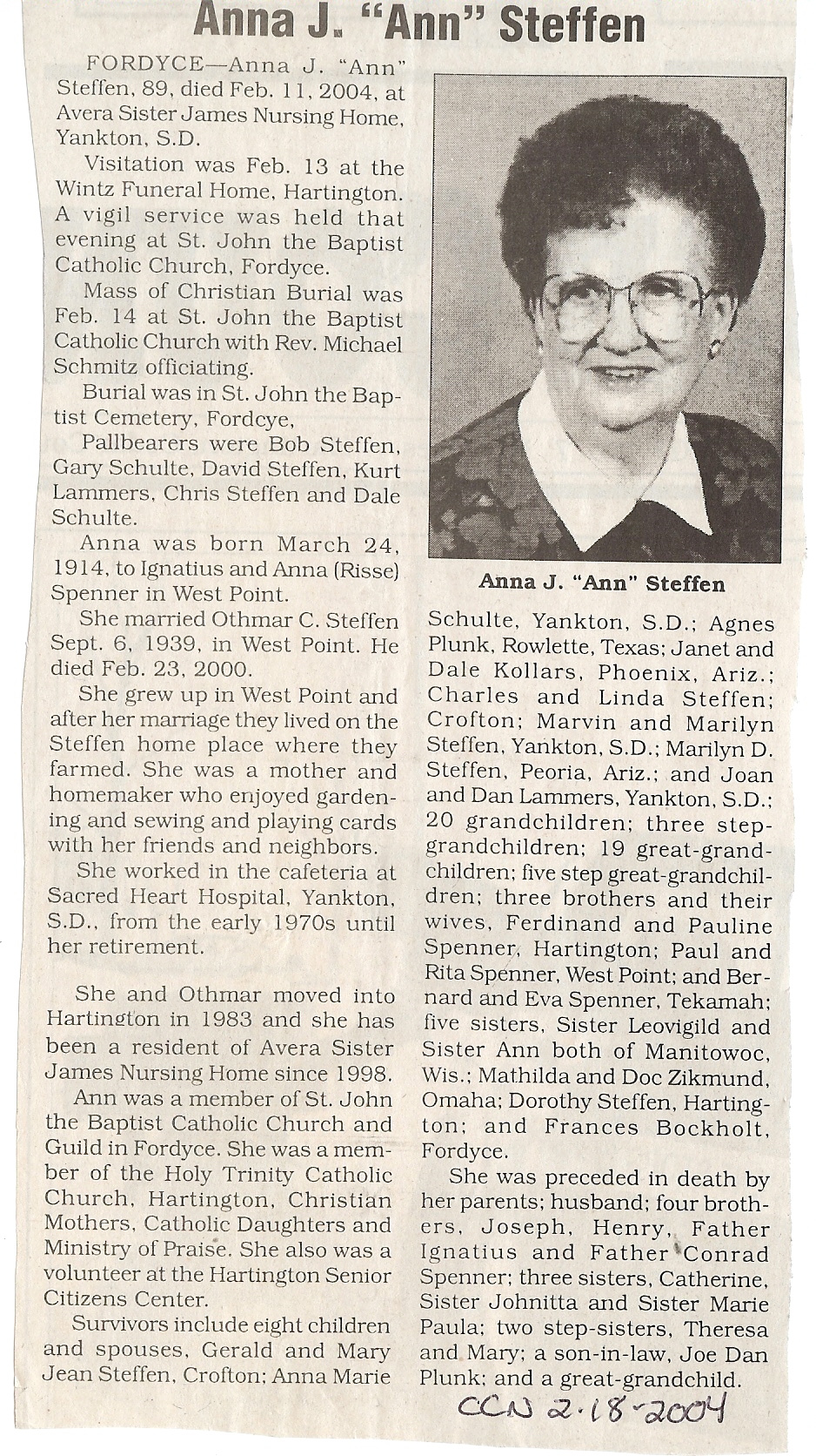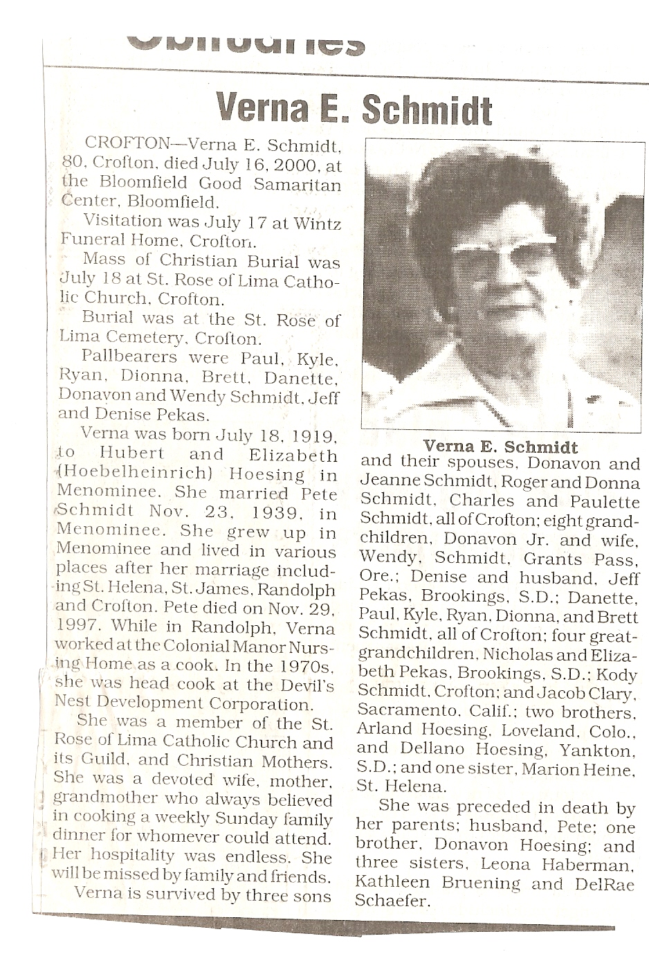 Cedar County, Nebraska Jump ahead to surnames: SAGE Betty J. Hill Published in: Cedar County News on October 13, 2004 SAGE Doris E. Trombley Published in: Cedar County News on April 17, 1999 SAGE George "June" Published in: Cedar County News on September 29, 1999 SAGE Lawrence Wilfred Published in: Cedar County News on September 29, 1999 SAHS Warren W., Dr. Published in: Cedar County News on December 24, 2003 SALA Eva Pearl Hintz Published in: Cedar County News on March 2, 2005 SALOMA Sister M. Eickleman Published in: Wynot Tribune on March 9, 1939 SALVATORI Theresa M. Schroeder Published in: Cedar County News on January 5, 2000 SAMELSON Jack W. Published in: Cedar County News on March 23, 2003 SAMELSON Lola N. Nelson Published in: Cedar County News on October 1, 1975 SANDBERG Baby Published in: The Magnet Cemetery Directory by T. Korth SANDIDGE Louis L. Published in: Cedar County News on August 31, 2005 SASSAMAN Kathryn Marie Tower Published in: Cedar County News in July 2002 SASSEN William K. Published in: Cedar County News on February 25, 2004 SATORIUS Christian Published in: Cedar County News in January 1944 SATORIUS Katherine Bergman Obit Image Published in: Cedar County News on May 13, 1954 Published in Sioux City Journal on May 9, 1954 SAWATZKE Elizabeth Eggers Published in: Cedar County News on November 10, 1975 SAYLOR Ann Marie Bracht Published in: Cedar County News on December 6, 2000 SCHAECHER Terrance Arthur "Terry" Published in: Cedar County News on April 20, 2005 SCHAEFER Mary Published in: Cedar County News on May 25, 1922 SCHAEFER Mrs. Peter Published in: Wynot Tribune on April 27, 1911 SCHAEFER Peter Published in: Cedar County News on March 4, 1920 SCHAEGER Henry "Bob" Published in: Cedar County News on February 25, 1960 SCHAGER Mrs. Christine Published in: Cedar County News on July 5, 1922 SCHAGER Larry D. Published in: Cedar County News on March 7, 2001 SCHAGER Lloyd Published in: Cedar County News on November 28, 1940 SCHALLER Harry Published in: Wynot Tribune on February 28, 1952 SCHALLERT William L. Sr. Published in: Cedar County News on March 14, 2001 SCHIEFFER Christina Elizabeth Guenther Published in: Cedar County News on January 7, 1976 SCHIEFFER Dorothy M. Published in: Cedar County News on February 11, 2004 SCHIEFFER J. Jacob Published in: Cedar County News on January 18, 1951 SCHIEFFER John Published in: Cedar County News on February 1, 1923 SCHIEFFER Joseph W. Published in: Cedar County News on December 21, 2000 SCHIEFFER Joseph W. Published in: Cedar County News on December 21, 2000 SCHIEFFER Mrs. Jacob Published in: Cedar County News on January 24, 1924 SCHIEFFER Peter J. Jr. Published in: Cedar County News on January 24, 2001 SCHINDLER Elda E. Published in: Cedar County News on January 2003 SCHINDLER Pearl Iva Carpenter Published in: Cedar County News on November 6, 1974 SCHINK Edward A. Published in: Cedar County News on December 10, 1975 SCHMECKPEPER Garron L. Published in: Cedar County News on December 20, 2000 SCHMIDT Agnes Betz Published in: Yankton Daily Press & Dakotan in October 1990 SCHMIDT Anna Hoese Published in: Wynot Tribune on November 12, 1914 SCHMIDT Anthony Published in: Cedar County News on October 13, 1955 SCHMIDT Frank Published in: Cedar County News on February 18, 1925 SCHMIDT Gerald Jr. Published in: Cedar County News on June 21, 1923 SCHMIDT Irene M. Lechner Published in: Cedar County News on May 9, 2001 SCHMIDT Kenneth Leonard Published in: Cedar County News on February 12, 2003 SCHMIDT Laurence Howard Published in: Wynot Tribune on October 9, 1913 SCHMIDT Lewis Published in: Yankton Press & Dakotan on February 15, 2001 SCHMIDT Sharon K. Mann Published in: Cedar County News on January 30, 2002 SCHMIDT Stanley N. Published in: Cedar County News on November 3, 1999 SCHMIDT Verna E. Hoesing Published in: Cedar County News in July 2000 SCHMIDT William N. Published in: Cedar County News on February 5, 1931 SCHMIT Jamie Published in: Cedar County News on October 15, 2003 SCHNEIDER Muriel Vivian Gowery Kelley Published in: Cedar County News in April 2003 SCHNEIDER Theresa Wuebben Published in: Cedar County News on July 18, 1979 SCHNEIDER Mrs. John [nee Kunz] Published in: Cedar County News on November 2, 1950 SCHNIEDERS Herman Bernard Published in: Cedar County News on July 16, 2003 SCHNIEDERS John C. Obit Image Published in: Cedar County News. SCHNIEDERS Ralph Published in: Cedar County News in December 2005 SCHOENBERNER Iven L. Published in: Cedar County News on July 26, 2000 SCHOLL Elizabeth Alvina Published in: Cedar County News on January 2?, 1951 SCHRIEBER Henry Published in: Cedar County News on April 16, 1969 SCHREINER John Published in: Cedar County News on March 1, 2000 SCHREMPP Carl Published in: Cedar County News on October 22, 1975 SCHREMPP Fred Published in: Cedar County News on October 1, 1975 SCHREMPP Mrs. Joseph (nee PETERS) Published in: Cedar County News on Oct. 22, 1915 SCHREMPP Joseph Published in: Cedar County News on March 12, 1921 SCHRIBER Dorothy Marie Kalin Published in: Cedar County News on November 29, 2000 SCHROEDER Dina Published in: Cedar County News on October 16, 1908 SCHROEDER Elizabeth Feldhacker/a> Published in: Cedar County News on February 16, 2005 SCHROEDER John Published in: Cedar County News. Date of Publication/Death: Mar. 8, 1931 SCHROEDER LeRoy F. Published in: Cedar County News on October 20, 2004 SCHULTE Mrs. Bruno (nee Stuckenhoff) Published in: Cedar County News on April 19, 1917 SCHULTE Annie Cunningham Published in: Cedar County News on September 15, 1935 SCHULTE Christine Teresa Published in: Cedar County News on January 7, 2004 SCHULTE Elizabeth Bruening "Lizzie" Published in: Hartington Herald Obit Image Published in: Wynot Tribune on April 20, 1911 SCHULTE Frank X. Published in: Cedar County News on January 8, 1975 SCHULTE Fred Henry Published in: Cedar County News. Date of Publication/Death: Sept. 21, 1951 SCHULTE Frieda M. Sudbeck Published in: Cedar County News on January 8, 1975Ma