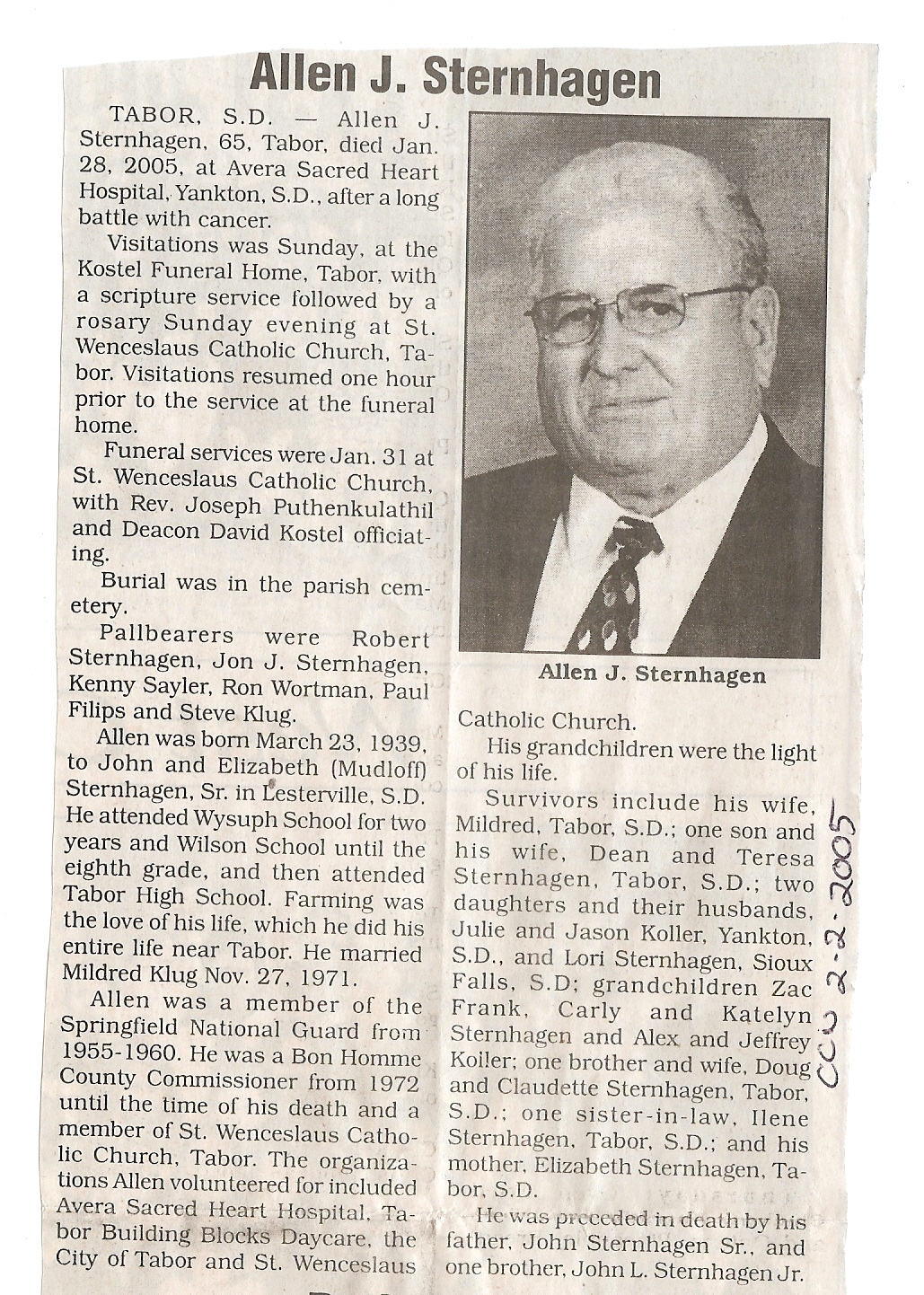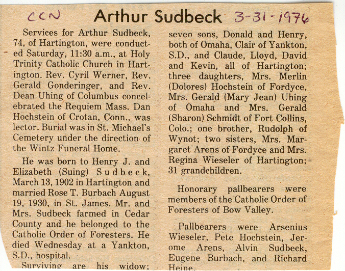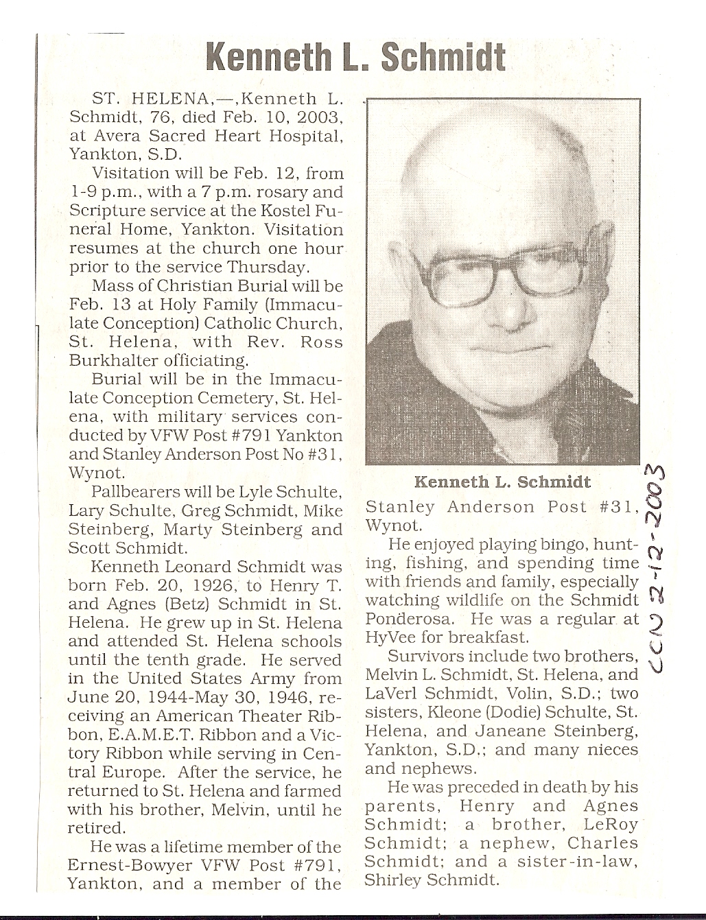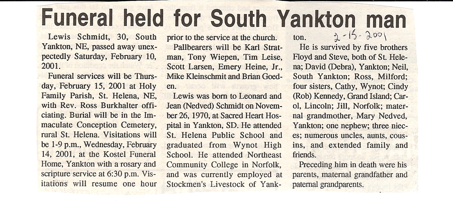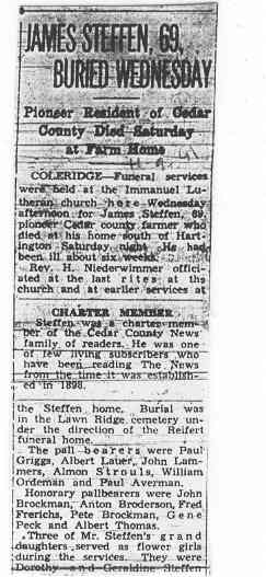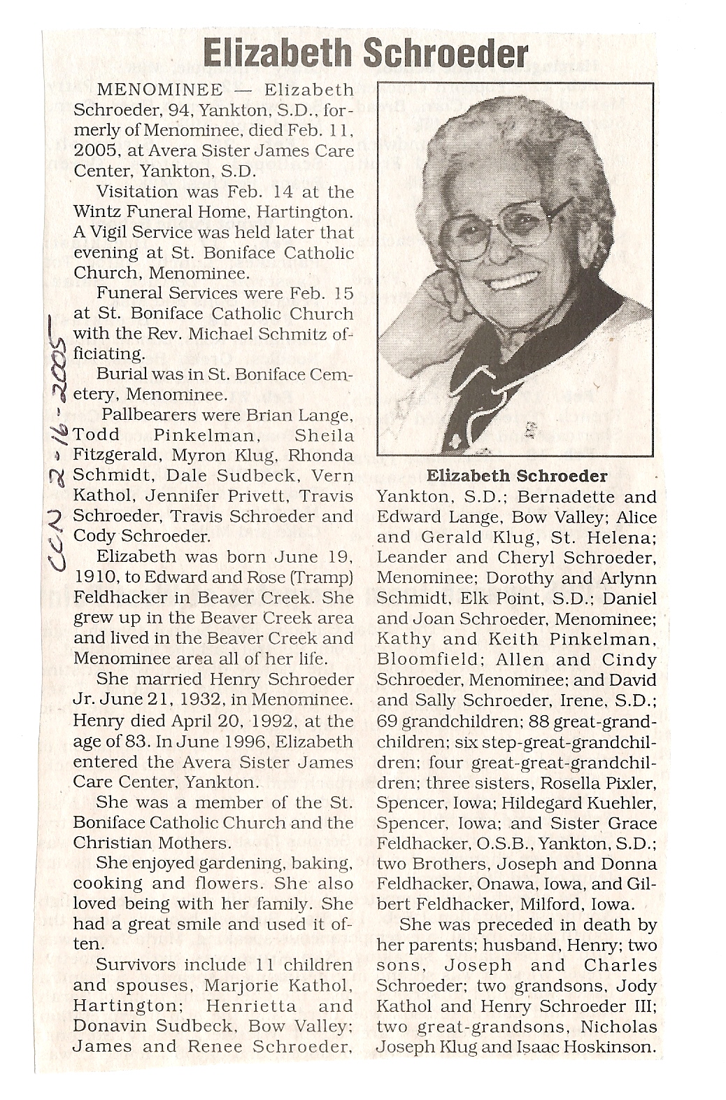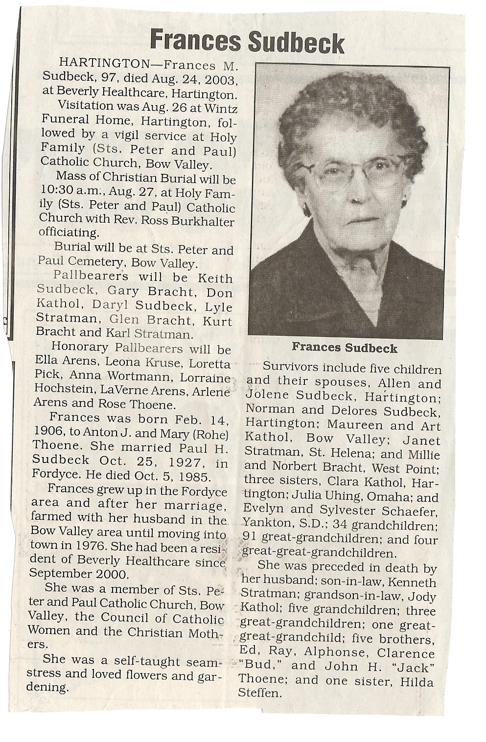 Cedar County, Nebraska Jump ahead to surnames: SAGE Betty J. Hill Published in: Cedar County News on October 13, 2004 SAGE Doris E. Trombley Published in: Cedar County News on April 17, 1999 SAGE George "June" Published in: Cedar County News on September 29, 1999 SAGE Lawrence Wilfred Published in: Cedar County News on September 29, 1999 SAHS Warren W., Dr. Published in: Cedar County News on December 24, 2003 SALA Eva Pearl Hintz Published in: Cedar County News on March 2, 2005 SALOMA Sister M. Eickleman Published in: Wynot Tribune on March 9, 1939 SALVATORI Theresa M. Schroeder Published in: Cedar County News on January 5, 2000 SAMELSON Jack W. Published in: Cedar County News on March 23, 2003 SAMELSON Lola N. Nelson Published in: Cedar County News on October 1, 1975 SANDBERG Baby Published in: The Magnet Cemetery Directory by T. Korth SANDIDGE Louis L. Published in: Cedar County News on August 31, 2005 SASSAMAN Kathryn Marie Tower Published in: Cedar County News in July 2002 SASSEN William K. Published in: Cedar County News on February 25, 2004 SATORIUS Christian Published in: Cedar County News in January 1944 SATORIUS Katherine Bergman Obit Image Published in: Cedar County News on May 13, 1954 Published in Sioux City Journal on May 9, 1954 SAWATZKE Elizabeth Eggers Published in: Cedar County News on November 10, 1975 SAYLOR Ann Marie Bracht Published in: Cedar County News on December 6, 2000 SCHAECHER Terrance Arthur "Terry" Published in: Cedar County News on April 20, 2005 SCHAEFER Mary Published in: Cedar County News on May 25, 1922 SCHAEFER Mrs. Peter Published in: Wynot Tribune on April 27, 1911 SCHAEFER Peter Published in: Cedar County News on March 4, 1920 SCHAEGER Henry "Bob" Published in: Cedar County News on February 25, 1960 SCHAGER Mrs. Christine Published in: Cedar County News on July 5, 1922 SCHAGER Larry D. Published in: Cedar County News on March 7, 2001 SCHAGER Lloyd Published in: Cedar County News on November 28, 1940 SCHALLER Harry Published in: Wynot Tribune on February 28, 1952 SCHALLERT William L. Sr. Published in: Cedar County News on March 14, 2001 SCHIEFFER Christina Elizabeth Guenther Published in: Cedar County News on January 7, 1976 SCHIEFFER Dorothy M. Published in: Cedar County News on February 11, 2004 SCHIEFFER J. Jacob Published in: Cedar County News on January 18, 1951 SCHIEFFER John Published in: Cedar County News on February 1, 1923 SCHIEFFER Joseph W. Published in: Cedar County News on December 21, 2000 SCHIEFFER Joseph W. Published in: Cedar County News on December 21, 2000 SCHIEFFER Mrs. Jacob Published in: Cedar County News on January 24, 1924 SCHIEFFER Peter J. Jr. Published in: Cedar County News on January 24, 2001 SCHINDLER Elda E. Published in: Cedar County News on January 2003 SCHINDLER Pearl Iva Carpenter Published in: Cedar County News on November 6, 1974 SCHINK Edward A. Published in: Cedar County News on December 10, 1975 SCHMECKPEPER Garron L. Published in: Cedar County News on December 20, 2000 SCHMIDT Agnes Betz Published in: Yankton Daily Press & Dakotan in October 1990 SCHMIDT Anna Hoese Published in: Wynot Tribune on November 12, 1914 SCHMIDT Anthony Published in: Cedar County News on October 13, 1955 SCHMIDT Frank Published in: Cedar County News on February 18, 1925 SCHMIDT Gerald Jr. Published in: Cedar County News on June 21, 1923 SCHMIDT Irene M. Lechner Published in: Cedar County News on May 9, 2001 SCHMIDT Kenneth Leonard Published in: Cedar County News on February 12, 2003 SCHMIDT Laurence Howard Published in: Wynot Tribune on October 9, 1913 SCHMIDT Lewis Published in: Yankton Press & Dakotan on February 15, 2001 SCHMIDT Sharon K. Mann Published in: Cedar County News on January 30, 2002 SCHMIDT Stanley N. Published in: Cedar County News on November 3, 1999 SCHMIDT Verna E. Hoesing Published in: Cedar County News in July 2000 SCHMIDT William N. Published in: Cedar County News on February 5, 1931 SCHMIT Jamie Published in: Cedar County News on October 15, 2003 SCHNEIDER Muriel Vivian Gowery Kelley Published in: Cedar County News in April 2003 SCHNEIDER Theresa Wuebben Published in: Cedar County News on July 18, 1979 SCHNEIDER Mrs. John [nee Kunz] Published in: Cedar County News on November 2, 1950 SCHNIEDERS Herman Bernard Published in: Cedar County News on July 16, 2003 SCHNIEDERS John C. Obit Image Published in: Cedar County News. SCHNIEDERS Ralph Published in: Cedar County News in December 2005 SCHOENBERNER Iven L. Published in: Cedar County News on July 26, 2000 SCHOLL Elizabeth Alvina Published in: Cedar County News on January 2?, 1951 SCHRIEBER Henry Published in: Cedar County News on April 16, 1969 SCHREINER John Published in: Cedar County News on March 1, 2000 SCHREMPP Carl Published in: Cedar County News on October 22, 1975 SCHREMPP Fred Published in: Cedar County News on October 1, 1975 SCHREMPP Mrs. Joseph (nee PETERS) Published in: Cedar County News on Oct. 22, 1915 SCHREMPP Joseph Published in: Cedar County News on March 12, 1921 SCHRIBER Dorothy Marie Kalin Published in: Cedar County News on November 29, 2000 SCHROEDER Dina Published in: Cedar County News on October 16, 1908 SCHROEDER Elizabeth Feldhacker/a> Published in: Cedar County News on February 16, 2005 SCHROEDER John Published in: Cedar County News. Date of Publication/Death: Mar. 8, 1931 SCHROEDER LeRoy F. Published in: Cedar County News on October 20, 2004 SCHULTE Mrs. Bruno (nee Stuckenhoff) Published in: Cedar County News on April 19, 1917 SCHULTE Annie Cunningham Published in: Cedar County News on September 15, 1935 SCHULTE Christine Teresa Published in: Cedar County News on January 7, 2004 SCHULTE Elizabeth Bruening "Lizzie" Published in: Hartington Herald Obit Image Published in: Wynot Tribune on April 20, 1911 SCHULTE Frank X. Published in: Cedar County News on January 8, 1975 SCHULTE Fred Henry Published in: Cedar County News. Date of Publication/Death: Sept. 21, 1951 SCHULTE Frieda M. Sudbeck Published in: Cedar County News on January 8, 1975Ma