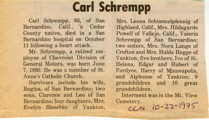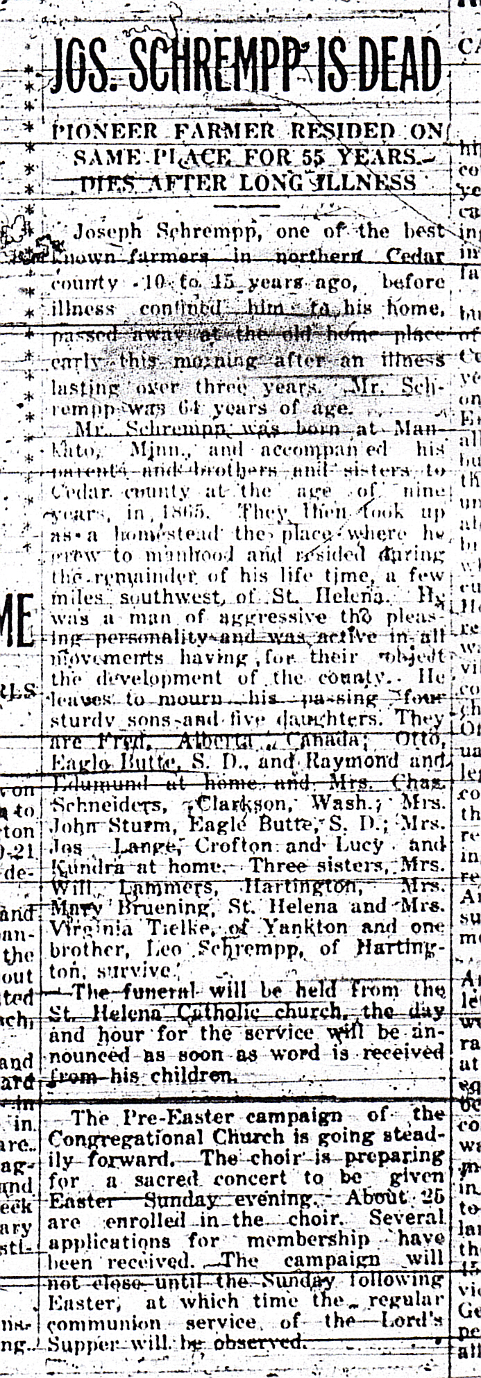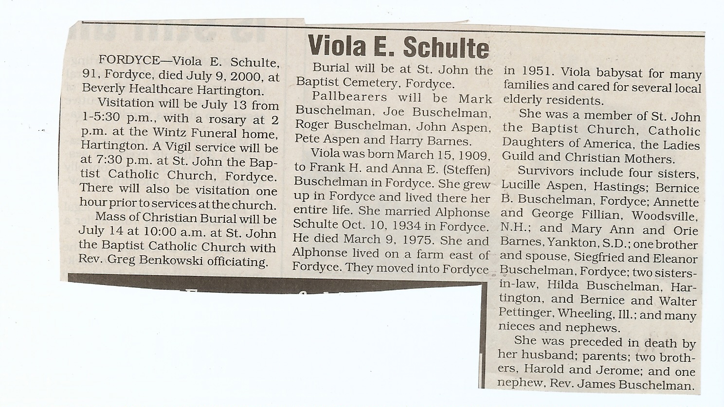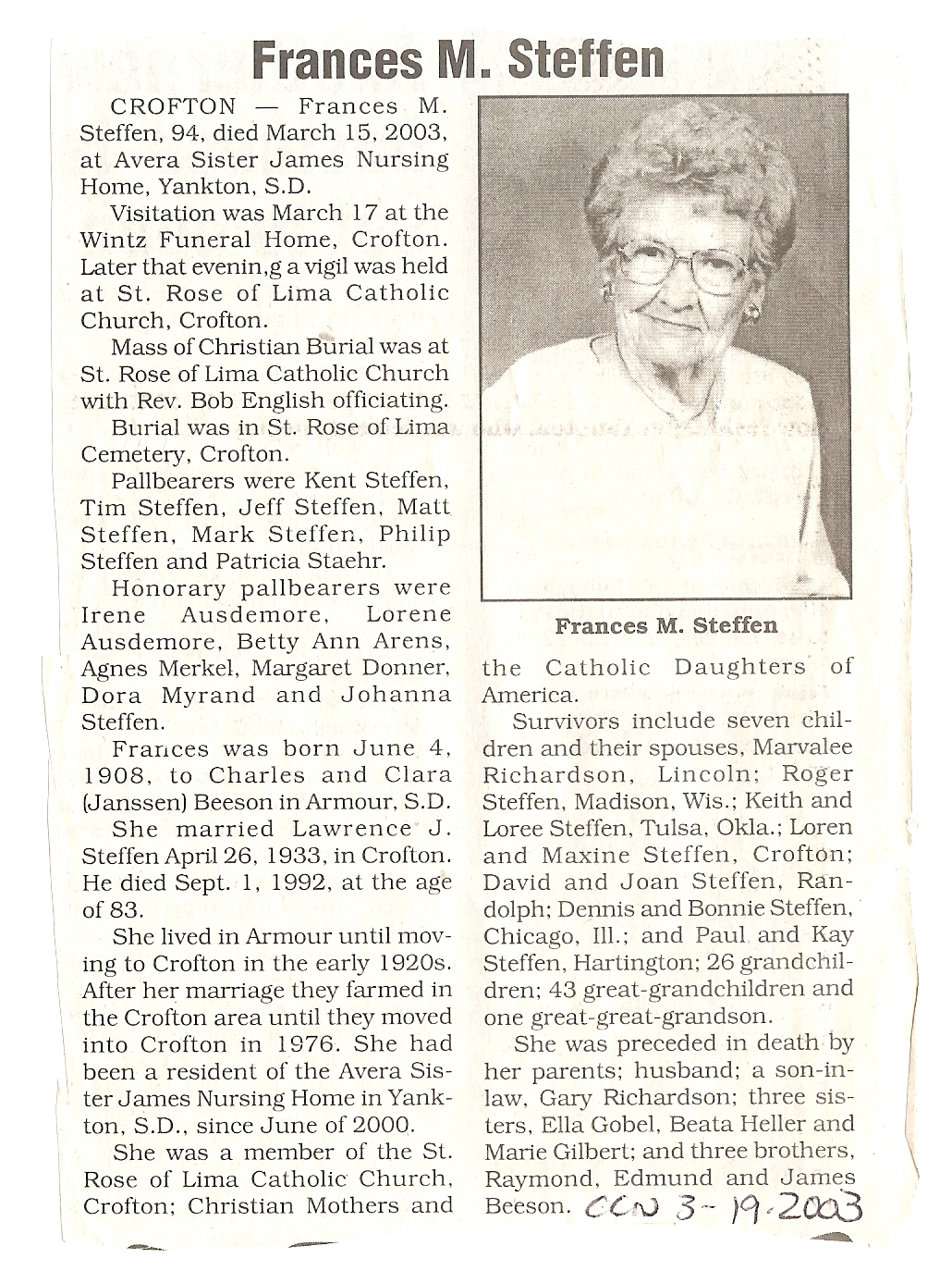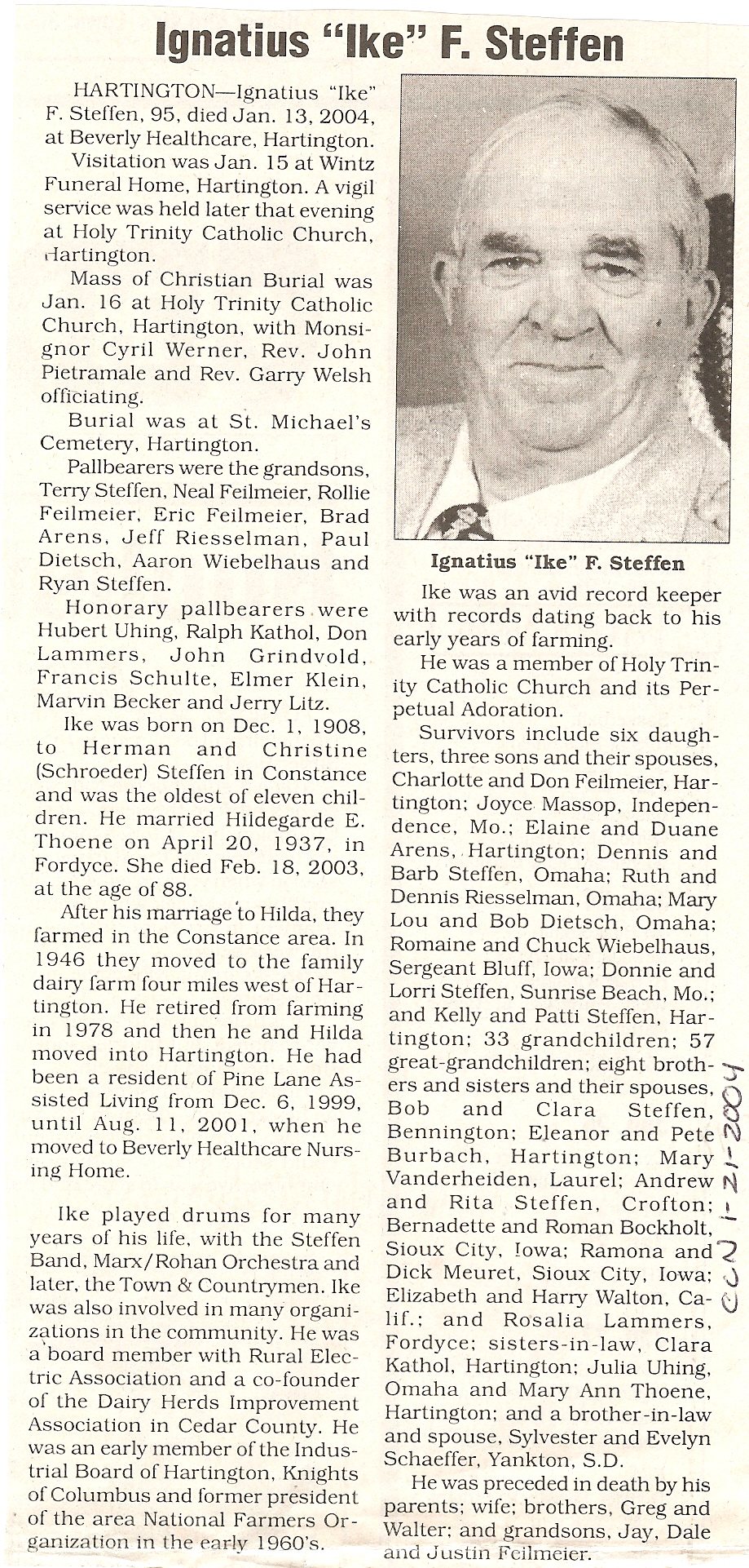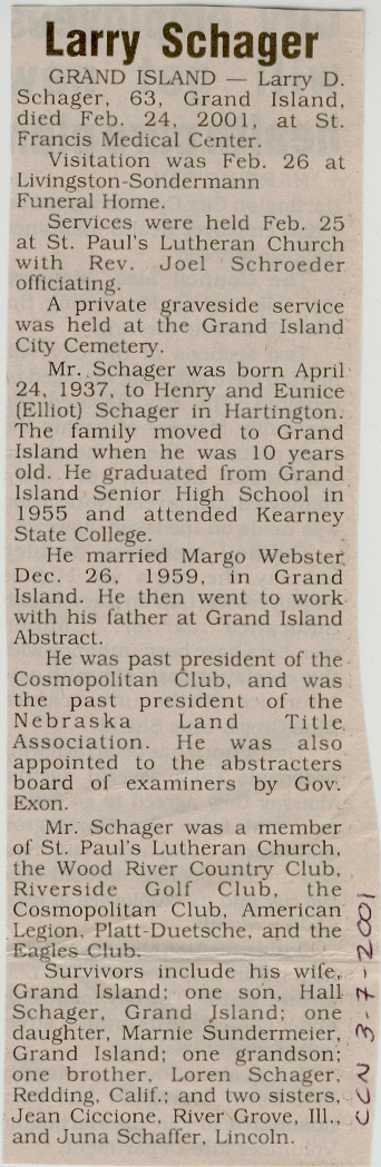Cedar County, Nebraska Jump ahead to surnames: SAGE Betty J. Hill Published in: Cedar County News on October 13, 2004 SAGE Doris E. Trombley Published in: Cedar County News on April 17, 1999 SAGE George "June" Published in: Cedar County News on September 29, 1999 SAGE Lawrence Wilfred Published in: Cedar County News on September 29, 1999 SAHS Warren W., Dr. Published in: Cedar County News on December 24, 2003 SALA Eva Pearl Hintz Published in: Cedar County News on March 2, 2005 SALOMA Sister M. Eickleman Published in: Wynot Tribune on March 9, 1939 SALVATORI Theresa M. Schroeder Published in: Cedar County News on January 5, 2000 SAMELSON Jack W. Published in: Cedar County News on March 23, 2003 SAMELSON Lola N. Nelson Published in: Cedar County News on October 1, 1975 SANDBERG Baby Published in: The Magnet Cemetery Directory by T. Korth SANDIDGE Louis L. Published in: Cedar County News on August 31, 2005 SASSAMAN Kathryn Marie Tower Published in: Cedar County News in July 2002 SASSEN William K. Published in: Cedar County News on February 25, 2004 SATORIUS Christian Published in: Cedar County News in January 1944 SATORIUS Katherine Bergman Obit Image Published in: Cedar County News on May 13, 1954 Published in Sioux City Journal on May 9, 1954 SAWATZKE Elizabeth Eggers Published in: Cedar County News on November 10, 1975 SAYLOR Ann Marie Bracht Published in: Cedar County News on December 6, 2000 SCHAECHER Terrance Arthur "Terry" Published in: Cedar County News on April 20, 2005 SCHAEFER Mary Published in: Cedar County News on May 25, 1922 SCHAEFER Mrs. Peter Published in: Wynot Tribune on April 27, 1911 SCHAEFER Peter Published in: Cedar County News on March 4, 1920 SCHAEGER Henry "Bob" Published in: Cedar County News on February 25, 1960 SCHAGER Mrs. Christine Published in: Cedar County News on July 5, 1922 SCHAGER Larry D. Published in: Cedar County News on March 7, 2001 SCHAGER Lloyd Published in: Cedar County News on November 28, 1940 SCHALLER Harry Published in: Wynot Tribune on February 28, 1952 SCHALLERT William L. Sr. Published in: Cedar County News on March 14, 2001 SCHIEFFER Christina Elizabeth Guenther Published in: Cedar County News on January 7, 1976 SCHIEFFER Dorothy M. Published in: Cedar County News on February 11, 2004 SCHIEFFER J. Jacob Published in: Cedar County News on January 18, 1951 SCHIEFFER John Published in: Cedar County News on February 1, 1923 SCHIEFFER Joseph W. Published in: Cedar County News on December 21, 2000 SCHIEFFER Joseph W. Published in: Cedar County News on December 21, 2000 SCHIEFFER Mrs. Jacob Published in: Cedar County News on January 24, 1924 SCHIEFFER Peter J. Jr. Published in: Cedar County News on January 24, 2001 SCHINDLER Elda E. Published in: Cedar County News on January 2003 SCHINDLER Pearl Iva Carpenter Published in: Cedar County News on November 6, 1974 SCHINK Edward A. Published in: Cedar County News on December 10, 1975 SCHMECKPEPER Garron L. Published in: Cedar County News on December 20, 2000 SCHMIDT Agnes Betz Published in: Yankton Daily Press & Dakotan in October 1990 SCHMIDT Anna Hoese Published in: Wynot Tribune on November 12, 1914 SCHMIDT Anthony Published in: Cedar County News on October 13, 1955 SCHMIDT Frank Published in: Cedar County News on February 18, 1925 SCHMIDT Gerald Jr. Published in: Cedar County News on June 21, 1923 SCHMIDT Irene M. Lechner Published in: Cedar County News on May 9, 2001 SCHMIDT Kenneth Leonard Published in: Cedar County News on February 12, 2003 SCHMIDT Laurence Howard Published in: Wynot Tribune on October 9, 1913 SCHMIDT Lewis Published in: Yankton Press & Dakotan on February 15, 2001 SCHMIDT Sharon K. Mann Published in: Cedar County News on January 30, 2002 SCHMIDT Stanley N. Published in: Cedar County News on November 3, 1999 SCHMIDT Verna E. Hoesing Published in: Cedar County News in July 2000 SCHMIDT William N. Published in: Cedar County News on February 5, 1931 SCHMIT Jamie Published in: Cedar County News on October 15, 2003 SCHNEIDER Muriel Vivian Gowery Kelley Published in: Cedar County News in April 2003 SCHNEIDER Theresa Wuebben Published in: Cedar County News on July 18, 1979 SCHNEIDER Mrs. John [nee Kunz] Published in: Cedar County News on November 2, 1950 SCHNIEDERS Herman Bernard Published in: Cedar County News on July 16, 2003 SCHNIEDERS John C. Obit Image Published in: Cedar County News. SCHNIEDERS Ralph Published in: Cedar County News in December 2005 SCHOENBERNER Iven L. Published in: Cedar County News on July 26, 2000 SCHOLL Elizabeth Alvina Published in: Cedar County News on January 2?, 1951 SCHRIEBER Henry Published in: Cedar County News on April 16, 1969 SCHREINER John Published in: Cedar County News on March 1, 2000 SCHREMPP Carl Published in: Cedar County News on October 22, 1975 SCHREMPP Fred Published in: Cedar County News on October 1, 1975 SCHREMPP Mrs. Joseph (nee PETERS) Published in: Cedar County News on Oct. 22, 1915 SCHREMPP Joseph Published in: Cedar County News on March 12, 1921 SCHRIBER Dorothy Marie Kalin Published in: Cedar County News on November 29, 2000 SCHROEDER Dina Published in: Cedar County News on October 16, 1908 SCHROEDER Elizabeth Feldhacker/a> Published in: Cedar County News on February 16, 2005 SCHROEDER John Published in: Cedar County News. Date of Publication/Death: Mar. 8, 1931 SCHROEDER LeRoy F. Published in: Cedar County News on October 20, 2004 SCHULTE Mrs. Bruno (nee Stuckenhoff) Published in: Cedar County News on April 19, 1917 SCHULTE Annie Cunningham Published in: Cedar County News on September 15, 1935 SCHULTE Christine Teresa Published in: Cedar County News on January 7, 2004 SCHULTE Elizabeth Bruening "Lizzie" Published in: Hartington Herald Obit Image Published in: Wynot Tribune on April 20, 1911 SCHULTE Frank X. Published in: Cedar County News on January 8, 1975 SCHULTE Fred Henry Published in: Cedar County News. Date of Publication/Death: Sept. 21, 1951 SCHULTE Frieda M. Sudbeck Published in: Cedar County News on January 8, 1975Ma