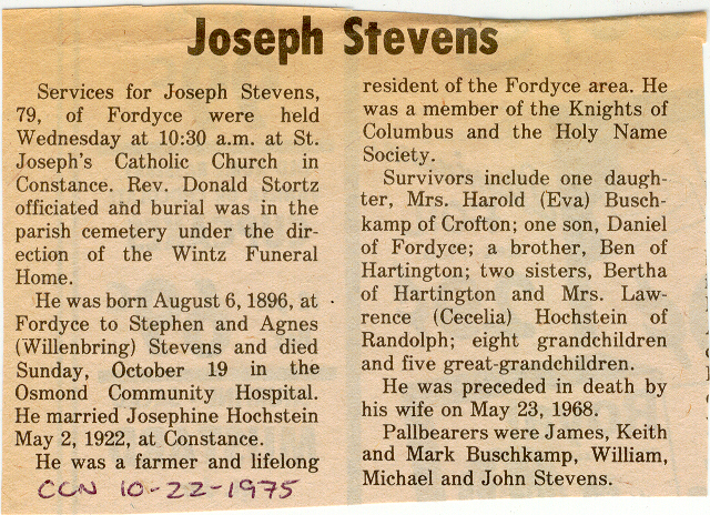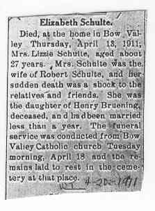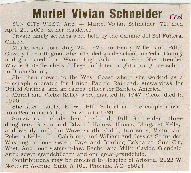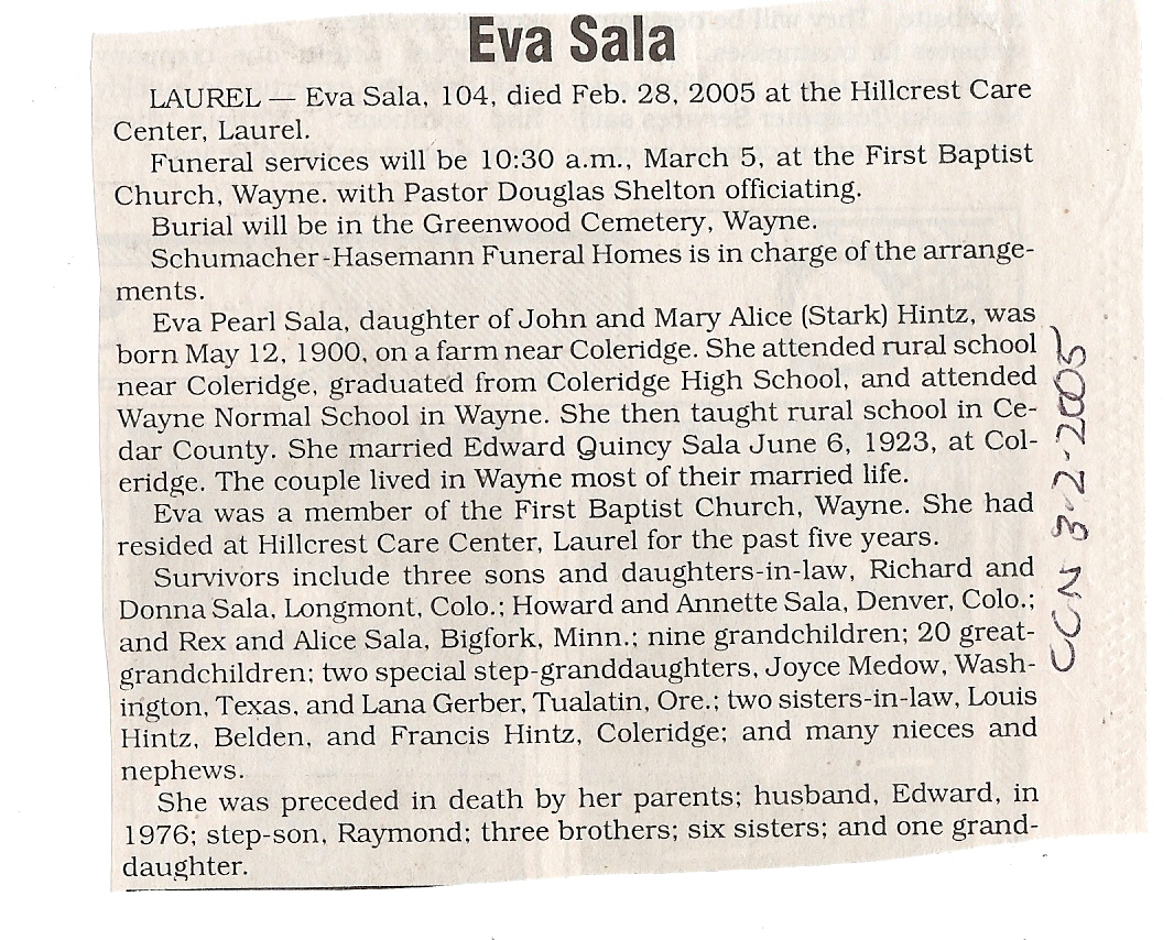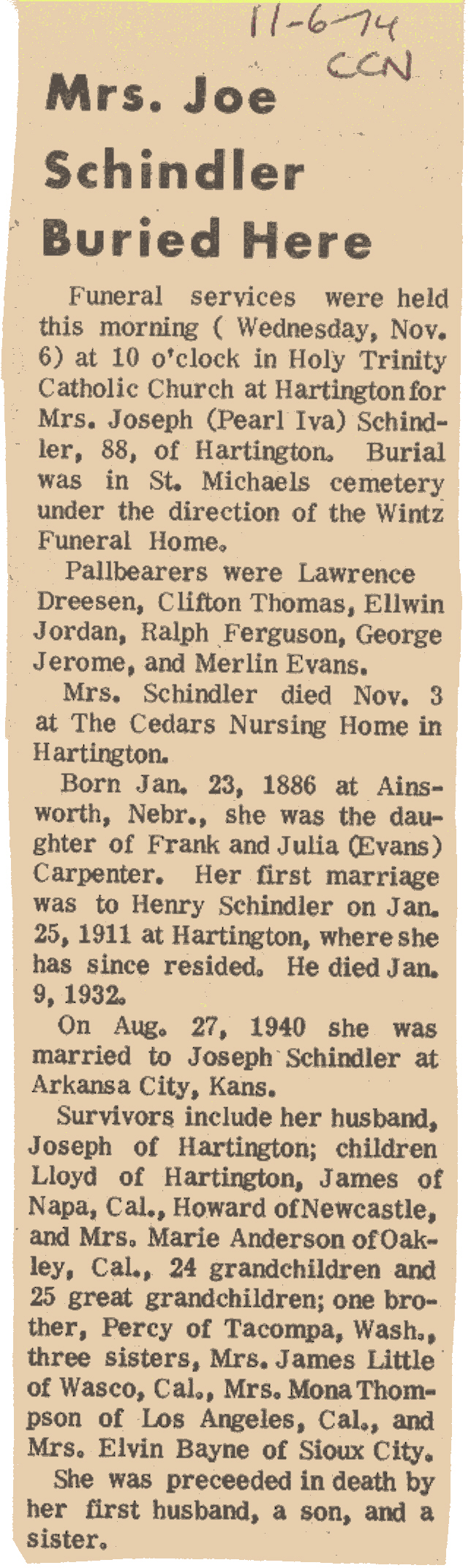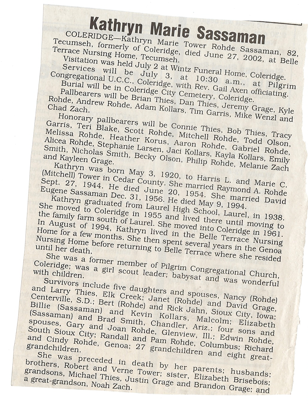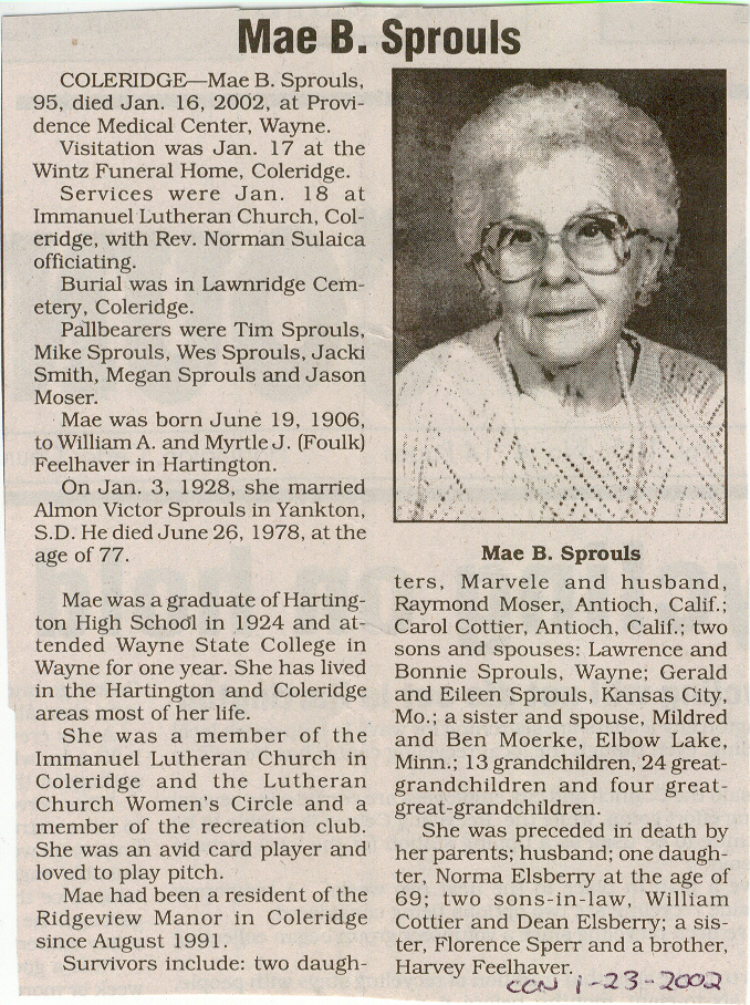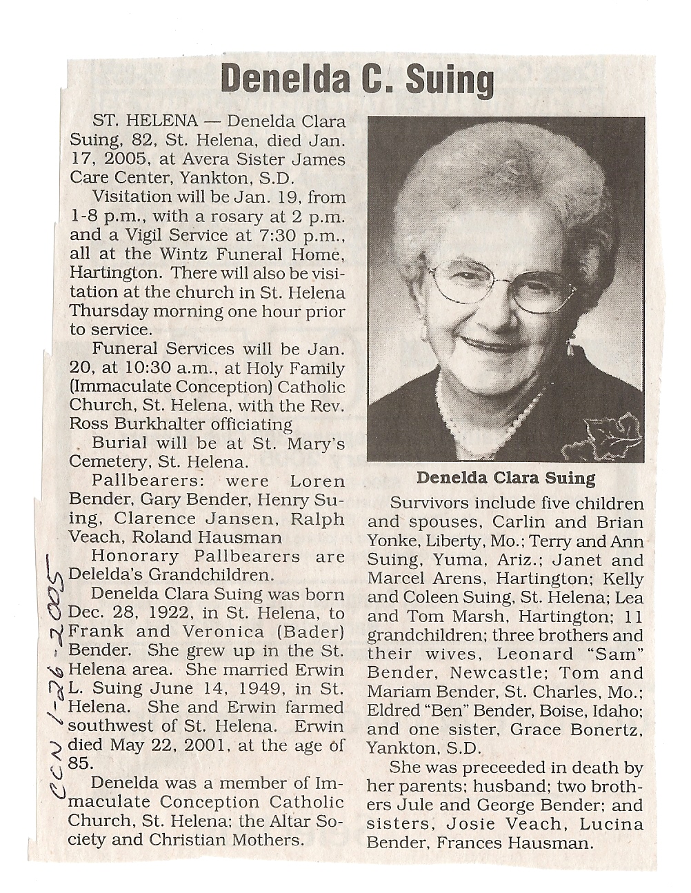 Cedar County, Nebraska Jump ahead to surnames: SAGE Betty J. Hill Published in: Cedar County News on October 13, 2004 SAGE Doris E. Trombley Published in: Cedar County News on April 17, 1999 SAGE George "June" Published in: Cedar County News on September 29, 1999 SAGE Lawrence Wilfred Published in: Cedar County News on September 29, 1999 SAHS Warren W., Dr. Published in: Cedar County News on December 24, 2003 SALA Eva Pearl Hintz Published in: Cedar County News on March 2, 2005 SALOMA Sister M. Eickleman Published in: Wynot Tribune on March 9, 1939 SALVATORI Theresa M. Schroeder Published in: Cedar County News on January 5, 2000 SAMELSON Jack W. Published in: Cedar County News on March 23, 2003 SAMELSON Lola N. Nelson Published in: Cedar County News on October 1, 1975 SANDBERG Baby Published in: The Magnet Cemetery Directory by T. Korth SANDIDGE Louis L. Published in: Cedar County News on August 31, 2005 SASSAMAN Kathryn Marie Tower Published in: Cedar County News in July 2002 SASSEN William K. Published in: Cedar County News on February 25, 2004 SATORIUS Christian Published in: Cedar County News in January 1944 SATORIUS Katherine Bergman Obit Image Published in: Cedar County News on May 13, 1954 Published in Sioux City Journal on May 9, 1954 SAWATZKE Elizabeth Eggers Published in: Cedar County News on November 10, 1975 SAYLOR Ann Marie Bracht Published in: Cedar County News on December 6, 2000 SCHAECHER Terrance Arthur "Terry" Published in: Cedar County News on April 20, 2005 SCHAEFER Mary Published in: Cedar County News on May 25, 1922 SCHAEFER Mrs. Peter Published in: Wynot Tribune on April 27, 1911 SCHAEFER Peter Published in: Cedar County News on March 4, 1920 SCHAEGER Henry "Bob" Published in: Cedar County News on February 25, 1960 SCHAGER Mrs. Christine Published in: Cedar County News on July 5, 1922 SCHAGER Larry D. Published in: Cedar County News on March 7, 2001 SCHAGER Lloyd Published in: Cedar County News on November 28, 1940 SCHALLER Harry Published in: Wynot Tribune on February 28, 1952 SCHALLERT William L. Sr. Published in: Cedar County News on March 14, 2001 SCHIEFFER Christina Elizabeth Guenther Published in: Cedar County News on January 7, 1976 SCHIEFFER Dorothy M. Published in: Cedar County News on February 11, 2004 SCHIEFFER J. Jacob Published in: Cedar County News on January 18, 1951 SCHIEFFER John Published in: Cedar County News on February 1, 1923 SCHIEFFER Joseph W. Published in: Cedar County News on December 21, 2000 SCHIEFFER Joseph W. Published in: Cedar County News on December 21, 2000 SCHIEFFER Mrs. Jacob Published in: Cedar County News on January 24, 1924 SCHIEFFER Peter J. Jr. Published in: Cedar County News on January 24, 2001 SCHINDLER Elda E. Published in: Cedar County News on January 2003 SCHINDLER Pearl Iva Carpenter Published in: Cedar County News on November 6, 1974 SCHINK Edward A. Published in: Cedar County News on December 10, 1975 SCHMECKPEPER Garron L. Published in: Cedar County News on December 20, 2000 SCHMIDT Agnes Betz Published in: Yankton Daily Press & Dakotan in October 1990 SCHMIDT Anna Hoese Published in: Wynot Tribune on November 12, 1914 SCHMIDT Anthony Published in: Cedar County News on October 13, 1955 SCHMIDT Frank Published in: Cedar County News on February 18, 1925 SCHMIDT Gerald Jr. Published in: Cedar County News on June 21, 1923 SCHMIDT Irene M. Lechner Published in: Cedar County News on May 9, 2001 SCHMIDT Kenneth Leonard Published in: Cedar County News on February 12, 2003 SCHMIDT Laurence Howard Published in: Wynot Tribune on October 9, 1913 SCHMIDT Lewis Published in: Yankton Press & Dakotan on February 15, 2001 SCHMIDT Sharon K. Mann Published in: Cedar County News on January 30, 2002 SCHMIDT Stanley N. Published in: Cedar County News on November 3, 1999 SCHMIDT Verna E. Hoesing Published in: Cedar County News in July 2000 SCHMIDT William N. Published in: Cedar County News on February 5, 1931 SCHMIT Jamie Published in: Cedar County News on October 15, 2003 SCHNEIDER Muriel Vivian Gowery Kelley Published in: Cedar County News in April 2003 SCHNEIDER Theresa Wuebben Published in: Cedar County News on July 18, 1979 SCHNEIDER Mrs. John [nee Kunz] Published in: Cedar County News on November 2, 1950 SCHNIEDERS Herman Bernard Published in: Cedar County News on July 16, 2003 SCHNIEDERS John C. Obit Image Published in: Cedar County News. SCHNIEDERS Ralph Published in: Cedar County News in December 2005 SCHOENBERNER Iven L. Published in: Cedar County News on July 26, 2000 SCHOLL Elizabeth Alvina Published in: Cedar County News on January 2?, 1951 SCHRIEBER Henry Published in: Cedar County News on April 16, 1969 SCHREINER John Published in: Cedar County News on March 1, 2000 SCHREMPP Carl Published in: Cedar County News on October 22, 1975 SCHREMPP Fred Published in: Cedar County News on October 1, 1975 SCHREMPP Mrs. Joseph (nee PETERS) Published in: Cedar County News on Oct. 22, 1915 SCHREMPP Joseph Published in: Cedar County News on March 12, 1921 SCHRIBER Dorothy Marie Kalin Published in: Cedar County News on November 29, 2000 SCHROEDER Dina Published in: Cedar County News on October 16, 1908 SCHROEDER Elizabeth Feldhacker/a> Published in: Cedar County News on February 16, 2005 SCHROEDER John Published in: Cedar County News. Date of Publication/Death: Mar. 8, 1931 SCHROEDER LeRoy F. Published in: Cedar County News on October 20, 2004 SCHULTE Mrs. Bruno (nee Stuckenhoff) Published in: Cedar County News on April 19, 1917 SCHULTE Annie Cunningham Published in: Cedar County News on September 15, 1935 SCHULTE Christine Teresa Published in: Cedar County News on January 7, 2004 SCHULTE Elizabeth Bruening "Lizzie" Published in: Hartington Herald Obit Image Published in: Wynot Tribune on April 20, 1911 SCHULTE Frank X. Published in: Cedar County News on January 8, 1975 SCHULTE Fred Henry Published in: Cedar County News. Date of Publication/Death: Sept. 21, 1951 SCHULTE Frieda M. Sudbeck Published in: Cedar County News on January 8, 1975Ma