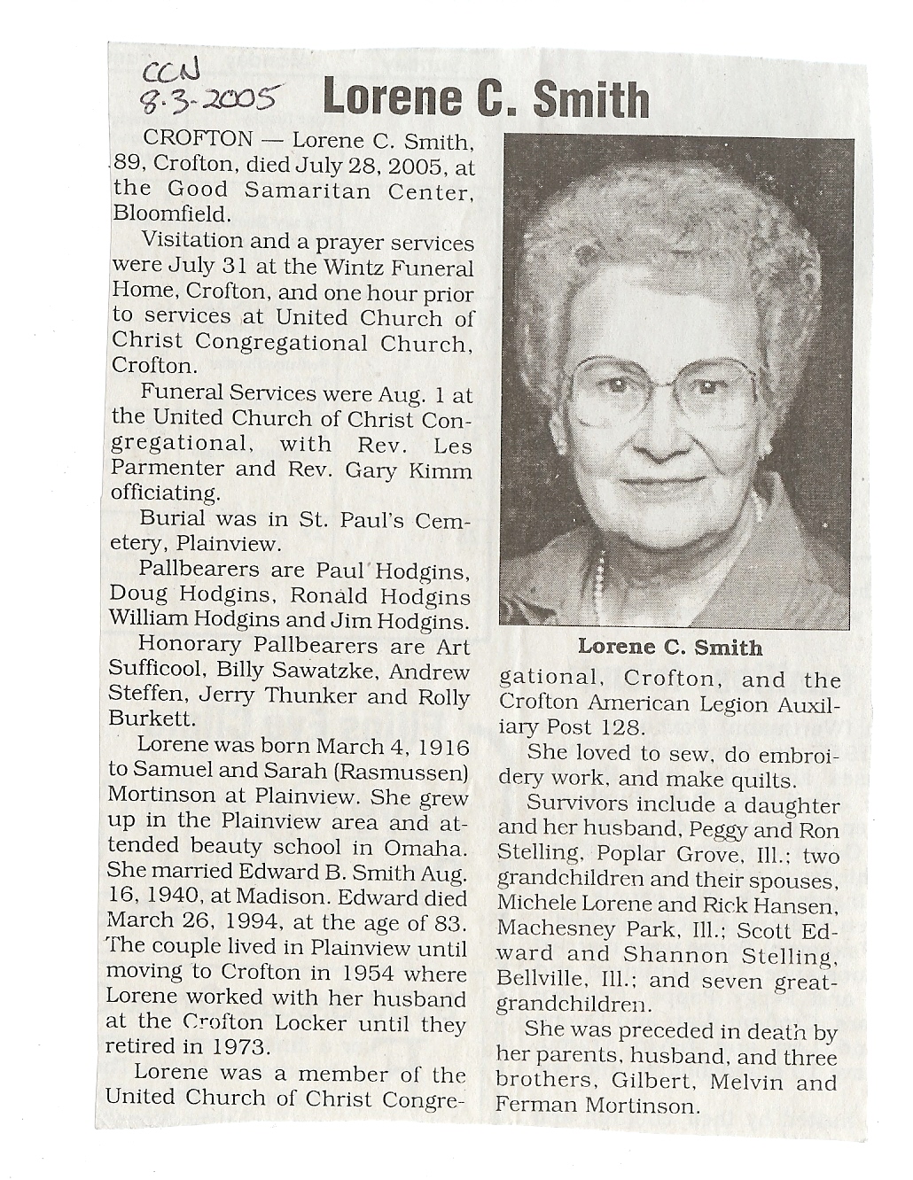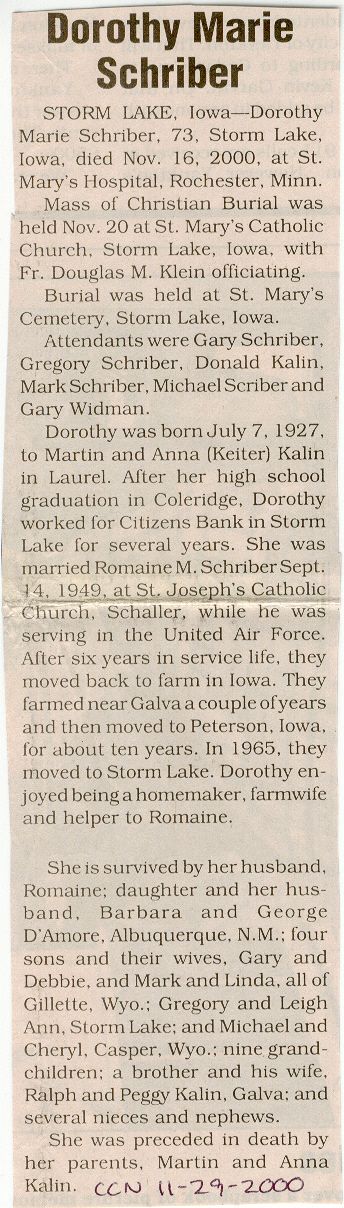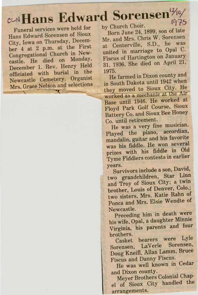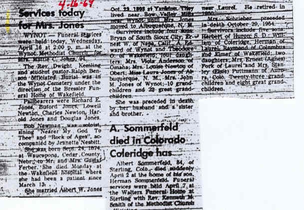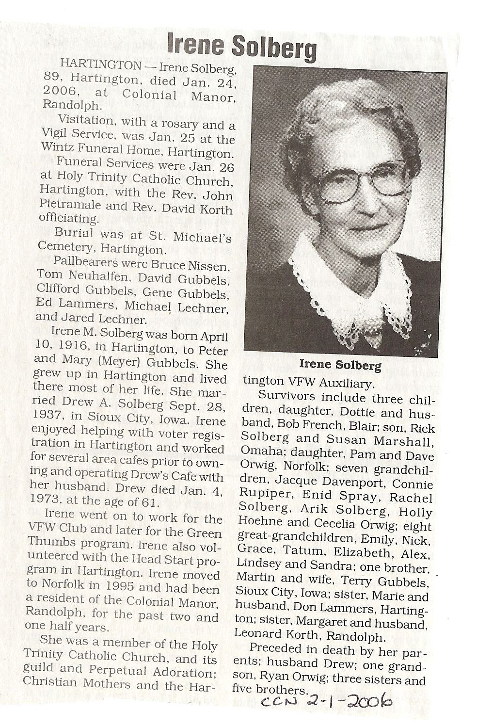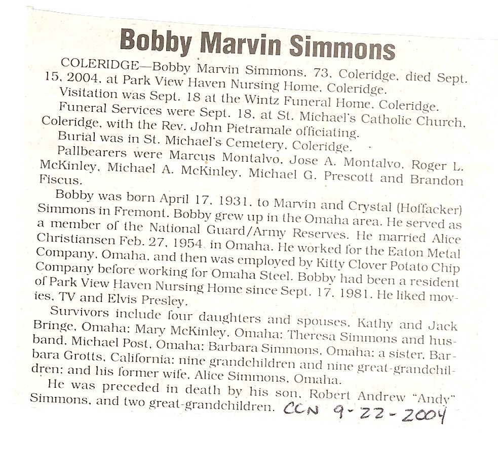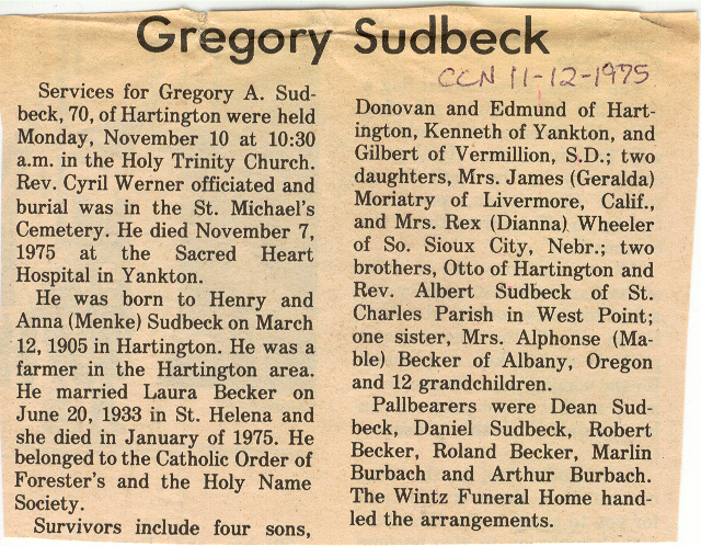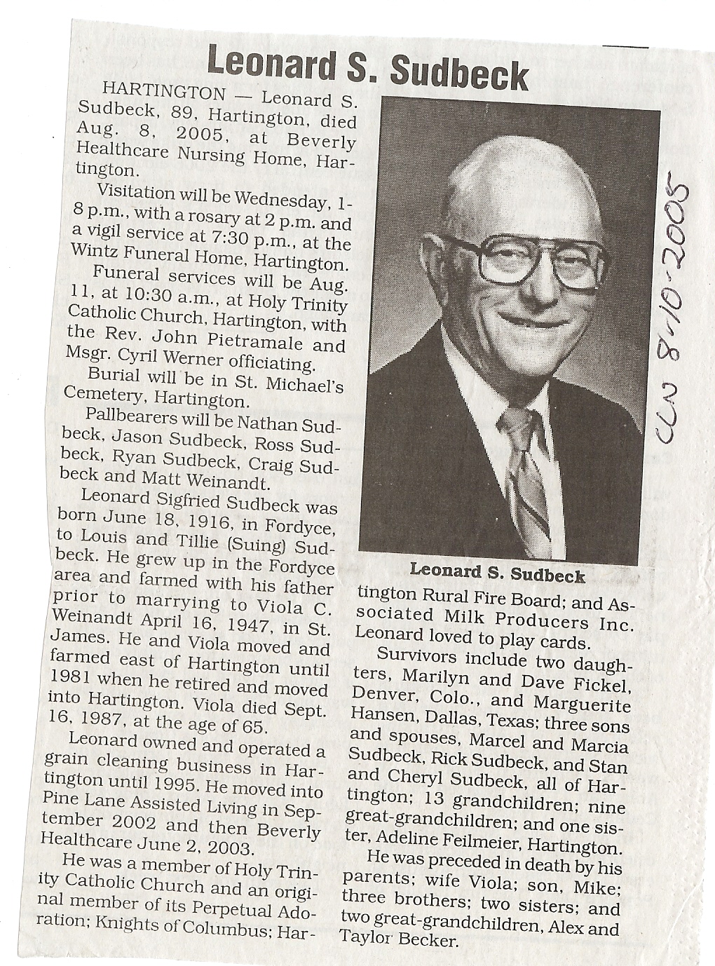 Cedar County, Nebraska Jump ahead to surnames: SAGE Betty J. Hill Published in: Cedar County News on October 13, 2004 SAGE Doris E. Trombley Published in: Cedar County News on April 17, 1999 SAGE George "June" Published in: Cedar County News on September 29, 1999 SAGE Lawrence Wilfred Published in: Cedar County News on September 29, 1999 SAHS Warren W., Dr. Published in: Cedar County News on December 24, 2003 SALA Eva Pearl Hintz Published in: Cedar County News on March 2, 2005 SALOMA Sister M. Eickleman Published in: Wynot Tribune on March 9, 1939 SALVATORI Theresa M. Schroeder Published in: Cedar County News on January 5, 2000 SAMELSON Jack W. Published in: Cedar County News on March 23, 2003 SAMELSON Lola N. Nelson Published in: Cedar County News on October 1, 1975 SANDBERG Baby Published in: The Magnet Cemetery Directory by T. Korth SANDIDGE Louis L. Published in: Cedar County News on August 31, 2005 SASSAMAN Kathryn Marie Tower Published in: Cedar County News in July 2002 SASSEN William K. Published in: Cedar County News on February 25, 2004 SATORIUS Christian Published in: Cedar County News in January 1944 SATORIUS Katherine Bergman Obit Image Published in: Cedar County News on May 13, 1954 Published in Sioux City Journal on May 9, 1954 SAWATZKE Elizabeth Eggers Published in: Cedar County News on November 10, 1975 SAYLOR Ann Marie Bracht Published in: Cedar County News on December 6, 2000 SCHAECHER Terrance Arthur "Terry" Published in: Cedar County News on April 20, 2005 SCHAEFER Mary Published in: Cedar County News on May 25, 1922 SCHAEFER Mrs. Peter Published in: Wynot Tribune on April 27, 1911 SCHAEFER Peter Published in: Cedar County News on March 4, 1920 SCHAEGER Henry "Bob" Published in: Cedar County News on February 25, 1960 SCHAGER Mrs. Christine Published in: Cedar County News on July 5, 1922 SCHAGER Larry D. Published in: Cedar County News on March 7, 2001 SCHAGER Lloyd Published in: Cedar County News on November 28, 1940 SCHALLER Harry Published in: Wynot Tribune on February 28, 1952 SCHALLERT William L. Sr. Published in: Cedar County News on March 14, 2001 SCHIEFFER Christina Elizabeth Guenther Published in: Cedar County News on January 7, 1976 SCHIEFFER Dorothy M. Published in: Cedar County News on February 11, 2004 SCHIEFFER J. Jacob Published in: Cedar County News on January 18, 1951 SCHIEFFER John Published in: Cedar County News on February 1, 1923 SCHIEFFER Joseph W. Published in: Cedar County News on December 21, 2000 SCHIEFFER Joseph W. Published in: Cedar County News on December 21, 2000 SCHIEFFER Mrs. Jacob Published in: Cedar County News on January 24, 1924 SCHIEFFER Peter J. Jr. Published in: Cedar County News on January 24, 2001 SCHINDLER Elda E. Published in: Cedar County News on January 2003 SCHINDLER Pearl Iva Carpenter Published in: Cedar County News on November 6, 1974 SCHINK Edward A. Published in: Cedar County News on December 10, 1975 SCHMECKPEPER Garron L. Published in: Cedar County News on December 20, 2000 SCHMIDT Agnes Betz Published in: Yankton Daily Press & Dakotan in October 1990 SCHMIDT Anna Hoese Published in: Wynot Tribune on November 12, 1914 SCHMIDT Anthony Published in: Cedar County News on October 13, 1955 SCHMIDT Frank Published in: Cedar County News on February 18, 1925 SCHMIDT Gerald Jr. Published in: Cedar County News on June 21, 1923 SCHMIDT Irene M. Lechner Published in: Cedar County News on May 9, 2001 SCHMIDT Kenneth Leonard Published in: Cedar County News on February 12, 2003 SCHMIDT Laurence Howard Published in: Wynot Tribune on October 9, 1913 SCHMIDT Lewis Published in: Yankton Press & Dakotan on February 15, 2001 SCHMIDT Sharon K. Mann Published in: Cedar County News on January 30, 2002 SCHMIDT Stanley N. Published in: Cedar County News on November 3, 1999 SCHMIDT Verna E. Hoesing Published in: Cedar County News in July 2000 SCHMIDT William N. Published in: Cedar County News on February 5, 1931 SCHMIT Jamie Published in: Cedar County News on October 15, 2003 SCHNEIDER Muriel Vivian Gowery Kelley Published in: Cedar County News in April 2003 SCHNEIDER Theresa Wuebben Published in: Cedar County News on July 18, 1979 SCHNEIDER Mrs. John [nee Kunz] Published in: Cedar County News on November 2, 1950 SCHNIEDERS Herman Bernard Published in: Cedar County News on July 16, 2003 SCHNIEDERS John C. Obit Image Published in: Cedar County News. SCHNIEDERS Ralph Published in: Cedar County News in December 2005 SCHOENBERNER Iven L. Published in: Cedar County News on July 26, 2000 SCHOLL Elizabeth Alvina Published in: Cedar County News on January 2?, 1951 SCHRIEBER Henry Published in: Cedar County News on April 16, 1969 SCHREINER John Published in: Cedar County News on March 1, 2000 SCHREMPP Carl Published in: Cedar County News on October 22, 1975 SCHREMPP Fred Published in: Cedar County News on October 1, 1975 SCHREMPP Mrs. Joseph (nee PETERS) Published in: Cedar County News on Oct. 22, 1915 SCHREMPP Joseph Published in: Cedar County News on March 12, 1921 SCHRIBER Dorothy Marie Kalin Published in: Cedar County News on November 29, 2000 SCHROEDER Dina Published in: Cedar County News on October 16, 1908 SCHROEDER Elizabeth Feldhacker/a> Published in: Cedar County News on February 16, 2005 SCHROEDER John Published in: Cedar County News. Date of Publication/Death: Mar. 8, 1931 SCHROEDER LeRoy F. Published in: Cedar County News on October 20, 2004 SCHULTE Mrs. Bruno (nee Stuckenhoff) Published in: Cedar County News on April 19, 1917 SCHULTE Annie Cunningham Published in: Cedar County News on September 15, 1935 SCHULTE Christine Teresa Published in: Cedar County News on January 7, 2004 SCHULTE Elizabeth Bruening "Lizzie" Published in: Hartington Herald Obit Image Published in: Wynot Tribune on April 20, 1911 SCHULTE Frank X. Published in: Cedar County News on January 8, 1975 SCHULTE Fred Henry Published in: Cedar County News. Date of Publication/Death: Sept. 21, 1951 SCHULTE Frieda M. Sudbeck Published in: Cedar County News on January 8, 1975Ma
