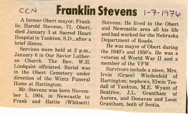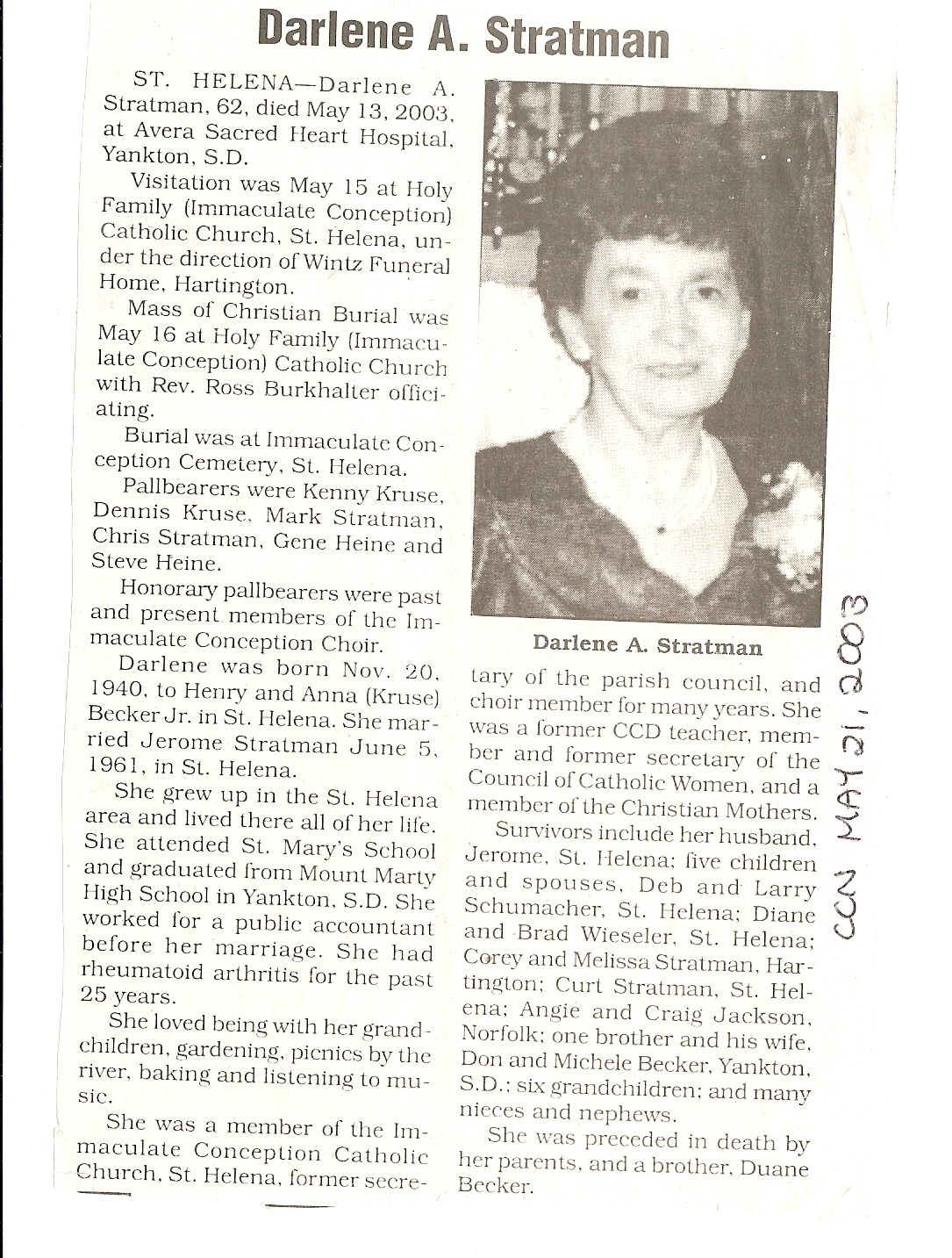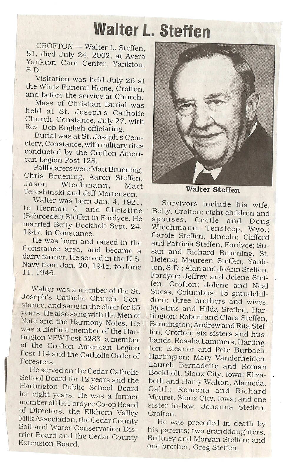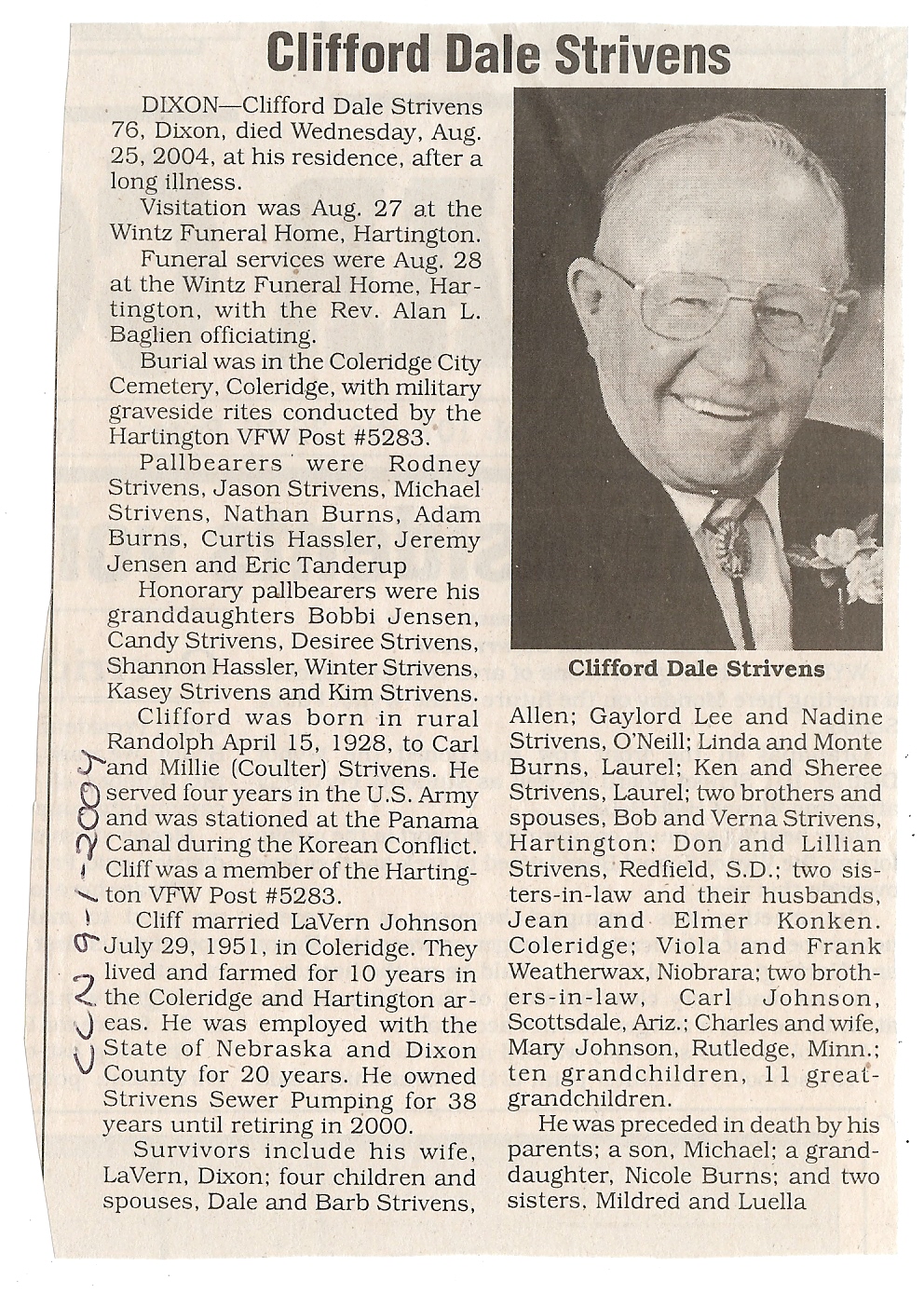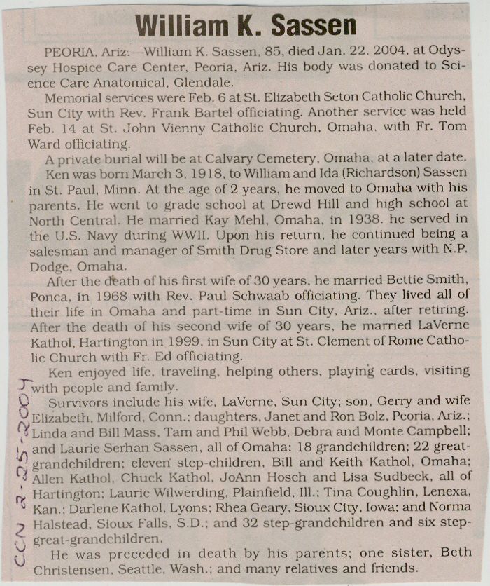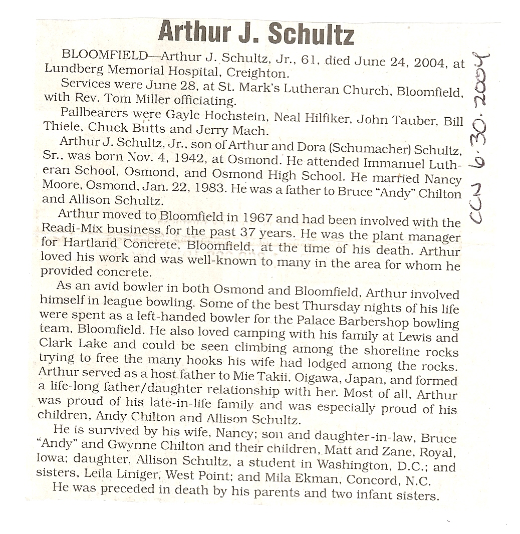 Cedar County, Nebraska Jump ahead to surnames: SAGE Betty J. Hill Published in: Cedar County News on October 13, 2004 SAGE Doris E. Trombley Published in: Cedar County News on April 17, 1999 SAGE George "June" Published in: Cedar County News on September 29, 1999 SAGE Lawrence Wilfred Published in: Cedar County News on September 29, 1999 SAHS Warren W., Dr. Published in: Cedar County News on December 24, 2003 SALA Eva Pearl Hintz Published in: Cedar County News on March 2, 2005 SALOMA Sister M. Eickleman Published in: Wynot Tribune on March 9, 1939 SALVATORI Theresa M. Schroeder Published in: Cedar County News on January 5, 2000 SAMELSON Jack W. Published in: Cedar County News on March 23, 2003 SAMELSON Lola N. Nelson Published in: Cedar County News on October 1, 1975 SANDBERG Baby Published in: The Magnet Cemetery Directory by T. Korth SANDIDGE Louis L. Published in: Cedar County News on August 31, 2005 SASSAMAN Kathryn Marie Tower Published in: Cedar County News in July 2002 SASSEN William K. Published in: Cedar County News on February 25, 2004 SATORIUS Christian Published in: Cedar County News in January 1944 SATORIUS Katherine Bergman Obit Image Published in: Cedar County News on May 13, 1954 Published in Sioux City Journal on May 9, 1954 SAWATZKE Elizabeth Eggers Published in: Cedar County News on November 10, 1975 SAYLOR Ann Marie Bracht Published in: Cedar County News on December 6, 2000 SCHAECHER Terrance Arthur "Terry" Published in: Cedar County News on April 20, 2005 SCHAEFER Mary Published in: Cedar County News on May 25, 1922 SCHAEFER Mrs. Peter Published in: Wynot Tribune on April 27, 1911 SCHAEFER Peter Published in: Cedar County News on March 4, 1920 SCHAEGER Henry "Bob" Published in: Cedar County News on February 25, 1960 SCHAGER Mrs. Christine Published in: Cedar County News on July 5, 1922 SCHAGER Larry D. Published in: Cedar County News on March 7, 2001 SCHAGER Lloyd Published in: Cedar County News on November 28, 1940 SCHALLER Harry Published in: Wynot Tribune on February 28, 1952 SCHALLERT William L. Sr. Published in: Cedar County News on March 14, 2001 SCHIEFFER Christina Elizabeth Guenther Published in: Cedar County News on January 7, 1976 SCHIEFFER Dorothy M. Published in: Cedar County News on February 11, 2004 SCHIEFFER J. Jacob Published in: Cedar County News on January 18, 1951 SCHIEFFER John Published in: Cedar County News on February 1, 1923 SCHIEFFER Joseph W. Published in: Cedar County News on December 21, 2000 SCHIEFFER Joseph W. Published in: Cedar County News on December 21, 2000 SCHIEFFER Mrs. Jacob Published in: Cedar County News on January 24, 1924 SCHIEFFER Peter J. Jr. Published in: Cedar County News on January 24, 2001 SCHINDLER Elda E. Published in: Cedar County News on January 2003 SCHINDLER Pearl Iva Carpenter Published in: Cedar County News on November 6, 1974 SCHINK Edward A. Published in: Cedar County News on December 10, 1975 SCHMECKPEPER Garron L. Published in: Cedar County News on December 20, 2000 SCHMIDT Agnes Betz Published in: Yankton Daily Press & Dakotan in October 1990 SCHMIDT Anna Hoese Published in: Wynot Tribune on November 12, 1914 SCHMIDT Anthony Published in: Cedar County News on October 13, 1955 SCHMIDT Frank Published in: Cedar County News on February 18, 1925 SCHMIDT Gerald Jr. Published in: Cedar County News on June 21, 1923 SCHMIDT Irene M. Lechner Published in: Cedar County News on May 9, 2001 SCHMIDT Kenneth Leonard Published in: Cedar County News on February 12, 2003 SCHMIDT Laurence Howard Published in: Wynot Tribune on October 9, 1913 SCHMIDT Lewis Published in: Yankton Press & Dakotan on February 15, 2001 SCHMIDT Sharon K. Mann Published in: Cedar County News on January 30, 2002 SCHMIDT Stanley N. Published in: Cedar County News on November 3, 1999 SCHMIDT Verna E. Hoesing Published in: Cedar County News in July 2000 SCHMIDT William N. Published in: Cedar County News on February 5, 1931 SCHMIT Jamie Published in: Cedar County News on October 15, 2003 SCHNEIDER Muriel Vivian Gowery Kelley Published in: Cedar County News in April 2003 SCHNEIDER Theresa Wuebben Published in: Cedar County News on July 18, 1979 SCHNEIDER Mrs. John [nee Kunz] Published in: Cedar County News on November 2, 1950 SCHNIEDERS Herman Bernard Published in: Cedar County News on July 16, 2003 SCHNIEDERS John C. Obit Image Published in: Cedar County News. SCHNIEDERS Ralph Published in: Cedar County News in December 2005 SCHOENBERNER Iven L. Published in: Cedar County News on July 26, 2000 SCHOLL Elizabeth Alvina Published in: Cedar County News on January 2?, 1951 SCHRIEBER Henry Published in: Cedar County News on April 16, 1969 SCHREINER John Published in: Cedar County News on March 1, 2000 SCHREMPP Carl Published in: Cedar County News on October 22, 1975 SCHREMPP Fred Published in: Cedar County News on October 1, 1975 SCHREMPP Mrs. Joseph (nee PETERS) Published in: Cedar County News on Oct. 22, 1915 SCHREMPP Joseph Published in: Cedar County News on March 12, 1921 SCHRIBER Dorothy Marie Kalin Published in: Cedar County News on November 29, 2000 SCHROEDER Dina Published in: Cedar County News on October 16, 1908 SCHROEDER Elizabeth Feldhacker/a> Published in: Cedar County News on February 16, 2005 SCHROEDER John Published in: Cedar County News. Date of Publication/Death: Mar. 8, 1931 SCHROEDER LeRoy F. Published in: Cedar County News on October 20, 2004 SCHULTE Mrs. Bruno (nee Stuckenhoff) Published in: Cedar County News on April 19, 1917 SCHULTE Annie Cunningham Published in: Cedar County News on September 15, 1935 SCHULTE Christine Teresa Published in: Cedar County News on January 7, 2004 SCHULTE Elizabeth Bruening "Lizzie" Published in: Hartington Herald Obit Image Published in: Wynot Tribune on April 20, 1911 SCHULTE Frank X. Published in: Cedar County News on January 8, 1975 SCHULTE Fred Henry Published in: Cedar County News. Date of Publication/Death: Sept. 21, 1951 SCHULTE Frieda M. Sudbeck Published in: Cedar County News on January 8, 1975Ma