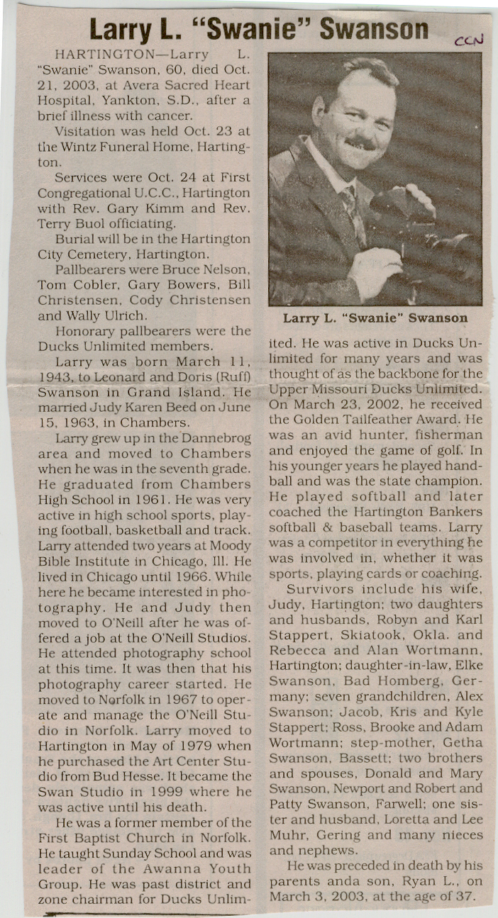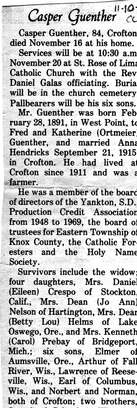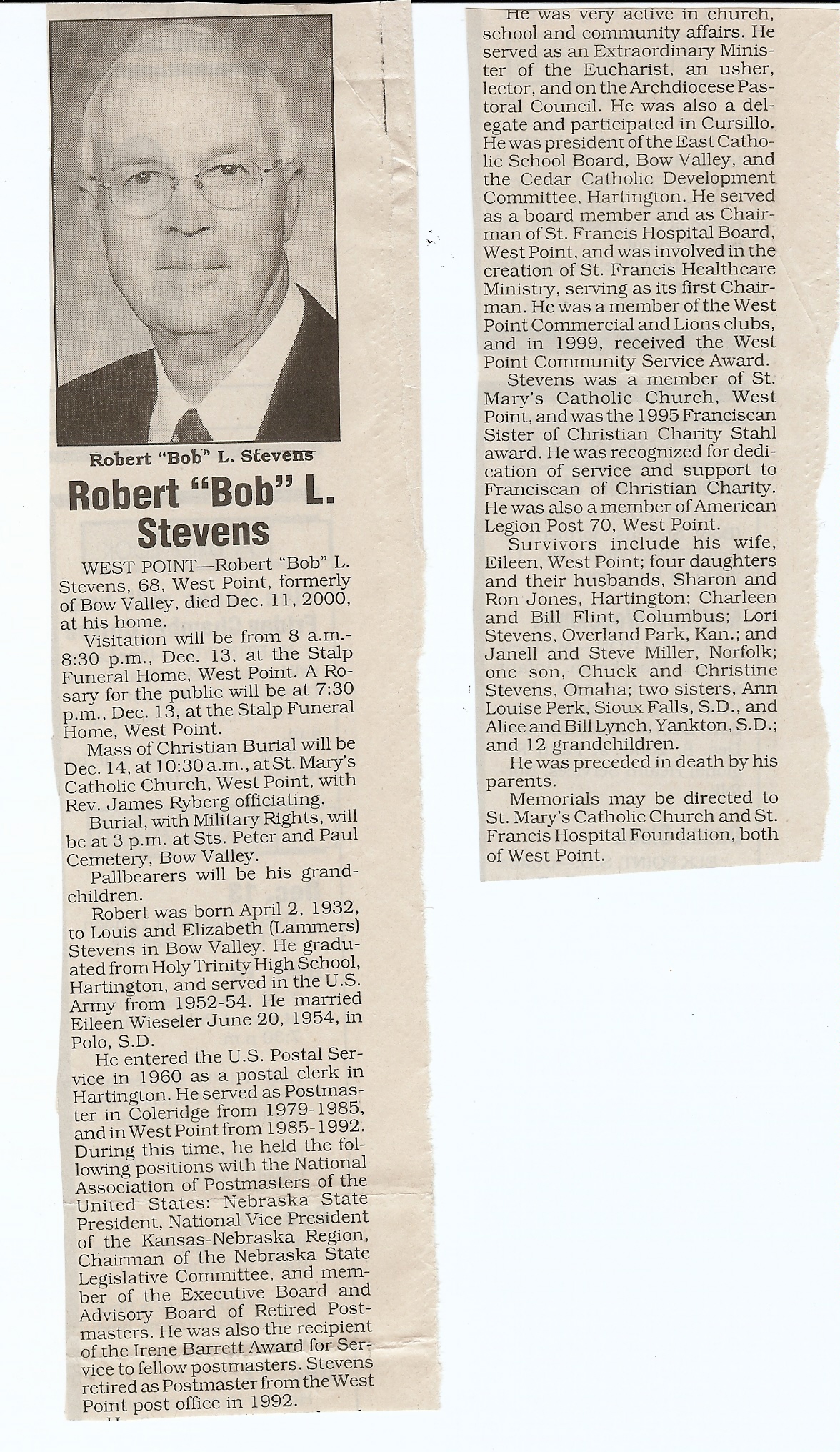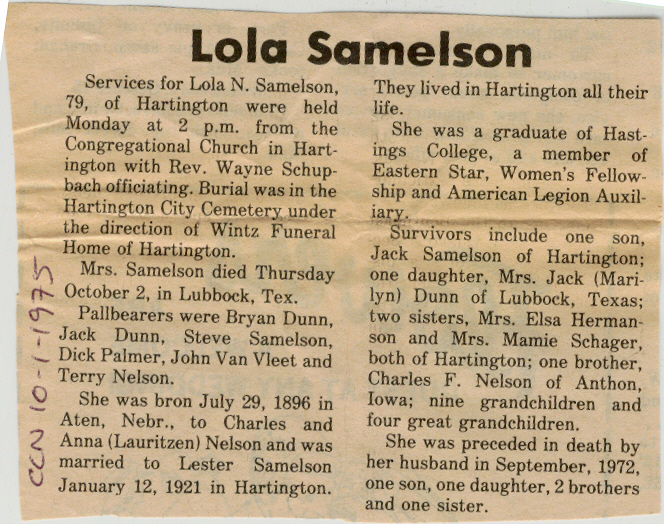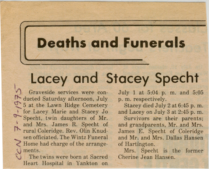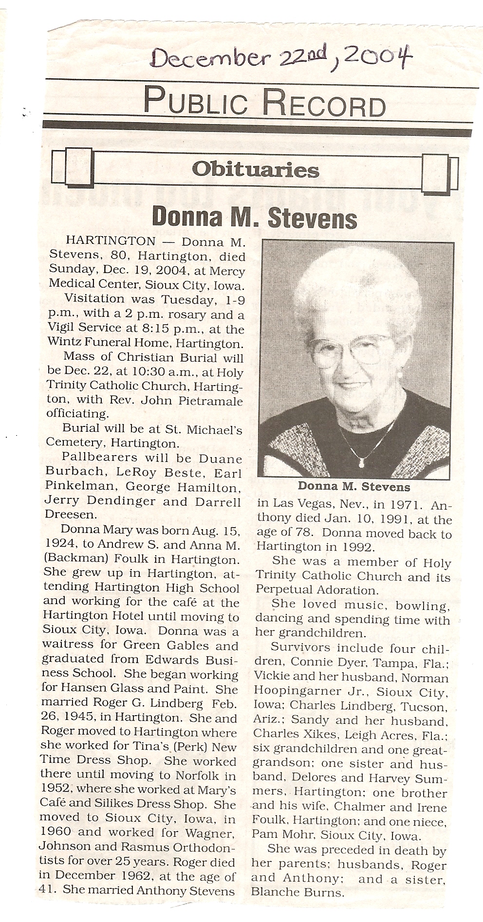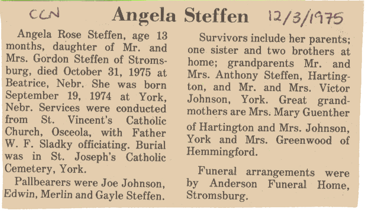 Cedar County, Nebraska Jump ahead to surnames: SAGE Betty J. Hill Published in: Cedar County News on October 13, 2004 SAGE Doris E. Trombley Published in: Cedar County News on April 17, 1999 SAGE George "June" Published in: Cedar County News on September 29, 1999 SAGE Lawrence Wilfred Published in: Cedar County News on September 29, 1999 SAHS Warren W., Dr. Published in: Cedar County News on December 24, 2003 SALA Eva Pearl Hintz Published in: Cedar County News on March 2, 2005 SALOMA Sister M. Eickleman Published in: Wynot Tribune on March 9, 1939 SALVATORI Theresa M. Schroeder Published in: Cedar County News on January 5, 2000 SAMELSON Jack W. Published in: Cedar County News on March 23, 2003 SAMELSON Lola N. Nelson Published in: Cedar County News on October 1, 1975 SANDBERG Baby Published in: The Magnet Cemetery Directory by T. Korth SANDIDGE Louis L. Published in: Cedar County News on August 31, 2005 SASSAMAN Kathryn Marie Tower Published in: Cedar County News in July 2002 SASSEN William K. Published in: Cedar County News on February 25, 2004 SATORIUS Christian Published in: Cedar County News in January 1944 SATORIUS Katherine Bergman Obit Image Published in: Cedar County News on May 13, 1954 Published in Sioux City Journal on May 9, 1954 SAWATZKE Elizabeth Eggers Published in: Cedar County News on November 10, 1975 SAYLOR Ann Marie Bracht Published in: Cedar County News on December 6, 2000 SCHAECHER Terrance Arthur "Terry" Published in: Cedar County News on April 20, 2005 SCHAEFER Mary Published in: Cedar County News on May 25, 1922 SCHAEFER Mrs. Peter Published in: Wynot Tribune on April 27, 1911 SCHAEFER Peter Published in: Cedar County News on March 4, 1920 SCHAEGER Henry "Bob" Published in: Cedar County News on February 25, 1960 SCHAGER Mrs. Christine Published in: Cedar County News on July 5, 1922 SCHAGER Larry D. Published in: Cedar County News on March 7, 2001 SCHAGER Lloyd Published in: Cedar County News on November 28, 1940 SCHALLER Harry Published in: Wynot Tribune on February 28, 1952 SCHALLERT William L. Sr. Published in: Cedar County News on March 14, 2001 SCHIEFFER Christina Elizabeth Guenther Published in: Cedar County News on January 7, 1976 SCHIEFFER Dorothy M. Published in: Cedar County News on February 11, 2004 SCHIEFFER J. Jacob Published in: Cedar County News on January 18, 1951 SCHIEFFER John Published in: Cedar County News on February 1, 1923 SCHIEFFER Joseph W. Published in: Cedar County News on December 21, 2000 SCHIEFFER Joseph W. Published in: Cedar County News on December 21, 2000 SCHIEFFER Mrs. Jacob Published in: Cedar County News on January 24, 1924 SCHIEFFER Peter J. Jr. Published in: Cedar County News on January 24, 2001 SCHINDLER Elda E. Published in: Cedar County News on January 2003 SCHINDLER Pearl Iva Carpenter Published in: Cedar County News on November 6, 1974 SCHINK Edward A. Published in: Cedar County News on December 10, 1975 SCHMECKPEPER Garron L. Published in: Cedar County News on December 20, 2000 SCHMIDT Agnes Betz Published in: Yankton Daily Press & Dakotan in October 1990 SCHMIDT Anna Hoese Published in: Wynot Tribune on November 12, 1914 SCHMIDT Anthony Published in: Cedar County News on October 13, 1955 SCHMIDT Frank Published in: Cedar County News on February 18, 1925 SCHMIDT Gerald Jr. Published in: Cedar County News on June 21, 1923 SCHMIDT Irene M. Lechner Published in: Cedar County News on May 9, 2001 SCHMIDT Kenneth Leonard Published in: Cedar County News on February 12, 2003 SCHMIDT Laurence Howard Published in: Wynot Tribune on October 9, 1913 SCHMIDT Lewis Published in: Yankton Press & Dakotan on February 15, 2001 SCHMIDT Sharon K. Mann Published in: Cedar County News on January 30, 2002 SCHMIDT Stanley N. Published in: Cedar County News on November 3, 1999 SCHMIDT Verna E. Hoesing Published in: Cedar County News in July 2000 SCHMIDT William N. Published in: Cedar County News on February 5, 1931 SCHMIT Jamie Published in: Cedar County News on October 15, 2003 SCHNEIDER Muriel Vivian Gowery Kelley Published in: Cedar County News in April 2003 SCHNEIDER Theresa Wuebben Published in: Cedar County News on July 18, 1979 SCHNEIDER Mrs. John [nee Kunz] Published in: Cedar County News on November 2, 1950 SCHNIEDERS Herman Bernard Published in: Cedar County News on July 16, 2003 SCHNIEDERS John C. Obit Image Published in: Cedar County News. SCHNIEDERS Ralph Published in: Cedar County News in December 2005 SCHOENBERNER Iven L. Published in: Cedar County News on July 26, 2000 SCHOLL Elizabeth Alvina Published in: Cedar County News on January 2?, 1951 SCHRIEBER Henry Published in: Cedar County News on April 16, 1969 SCHREINER John Published in: Cedar County News on March 1, 2000 SCHREMPP Carl Published in: Cedar County News on October 22, 1975 SCHREMPP Fred Published in: Cedar County News on October 1, 1975 SCHREMPP Mrs. Joseph (nee PETERS) Published in: Cedar County News on Oct. 22, 1915 SCHREMPP Joseph Published in: Cedar County News on March 12, 1921 SCHRIBER Dorothy Marie Kalin Published in: Cedar County News on November 29, 2000 SCHROEDER Dina Published in: Cedar County News on October 16, 1908 SCHROEDER Elizabeth Feldhacker/a> Published in: Cedar County News on February 16, 2005 SCHROEDER John Published in: Cedar County News. Date of Publication/Death: Mar. 8, 1931 SCHROEDER LeRoy F. Published in: Cedar County News on October 20, 2004 SCHULTE Mrs. Bruno (nee Stuckenhoff) Published in: Cedar County News on April 19, 1917 SCHULTE Annie Cunningham Published in: Cedar County News on September 15, 1935 SCHULTE Christine Teresa Published in: Cedar County News on January 7, 2004 SCHULTE Elizabeth Bruening "Lizzie" Published in: Hartington Herald Obit Image Published in: Wynot Tribune on April 20, 1911 SCHULTE Frank X. Published in: Cedar County News on January 8, 1975 SCHULTE Fred Henry Published in: Cedar County News. Date of Publication/Death: Sept. 21, 1951 SCHULTE Frieda M. Sudbeck Published in: Cedar County News on January 8, 1975Ma