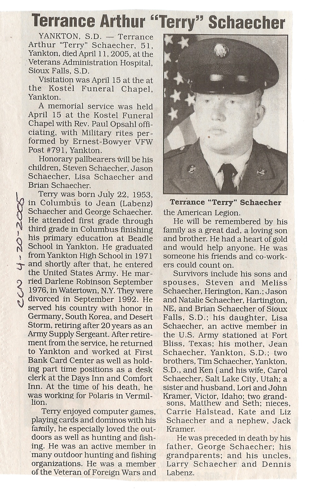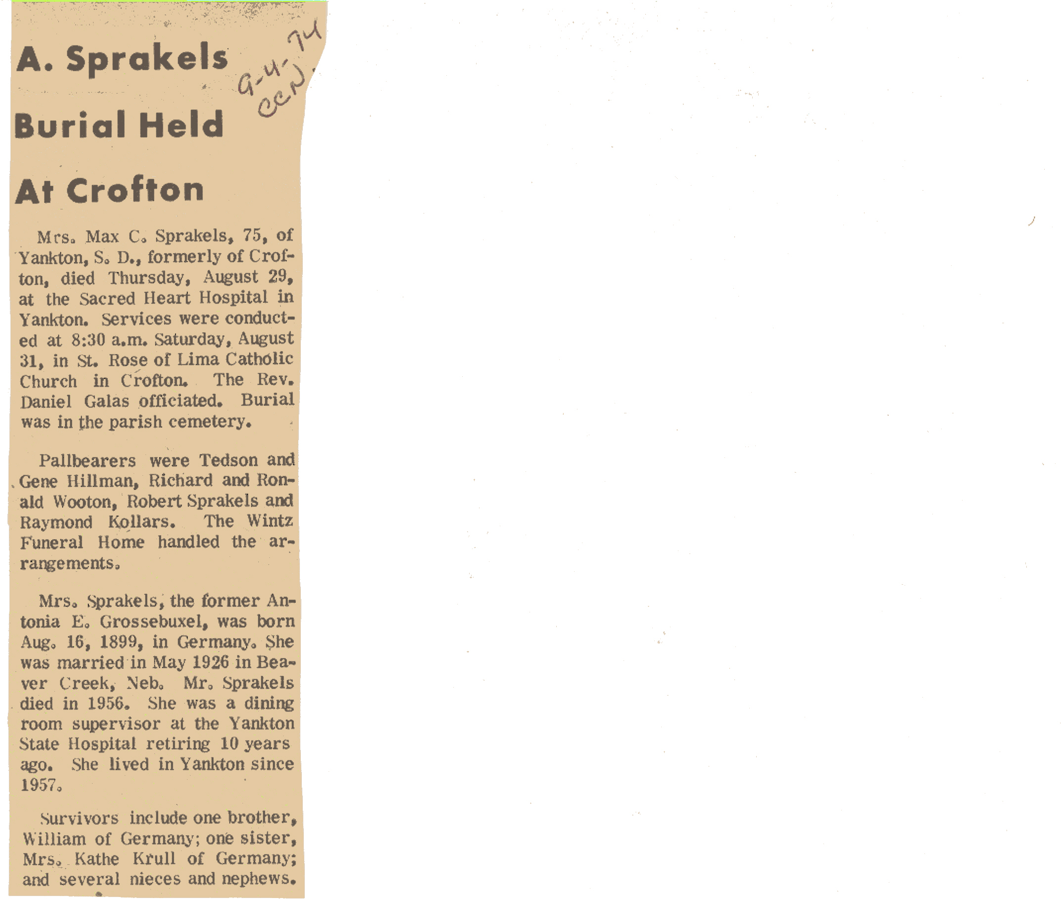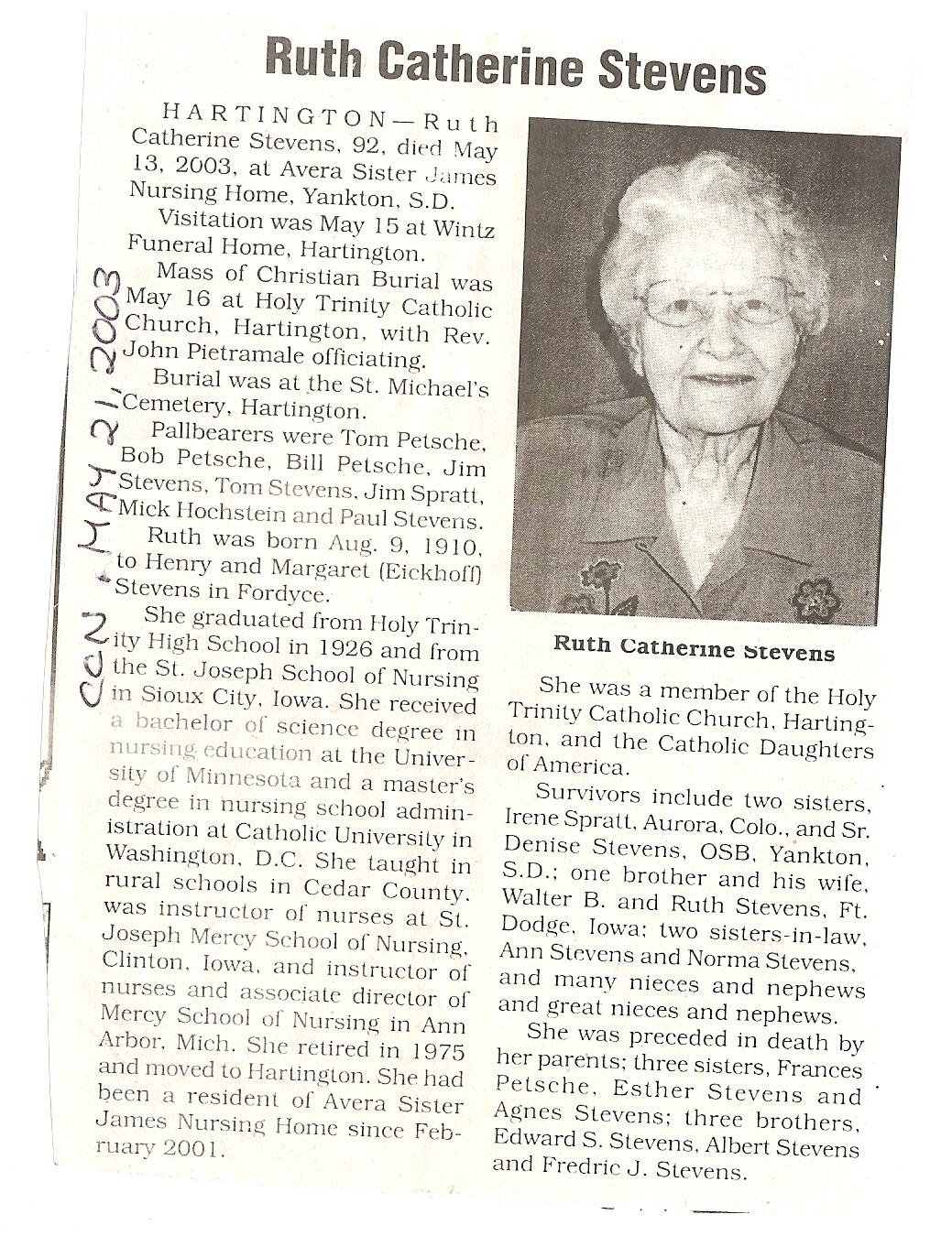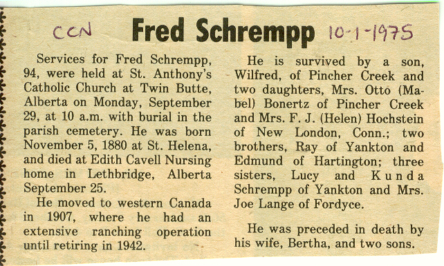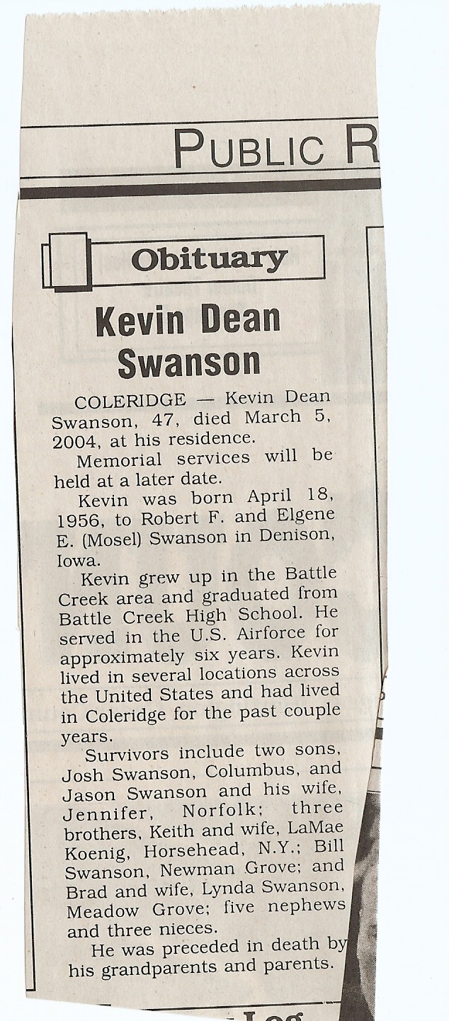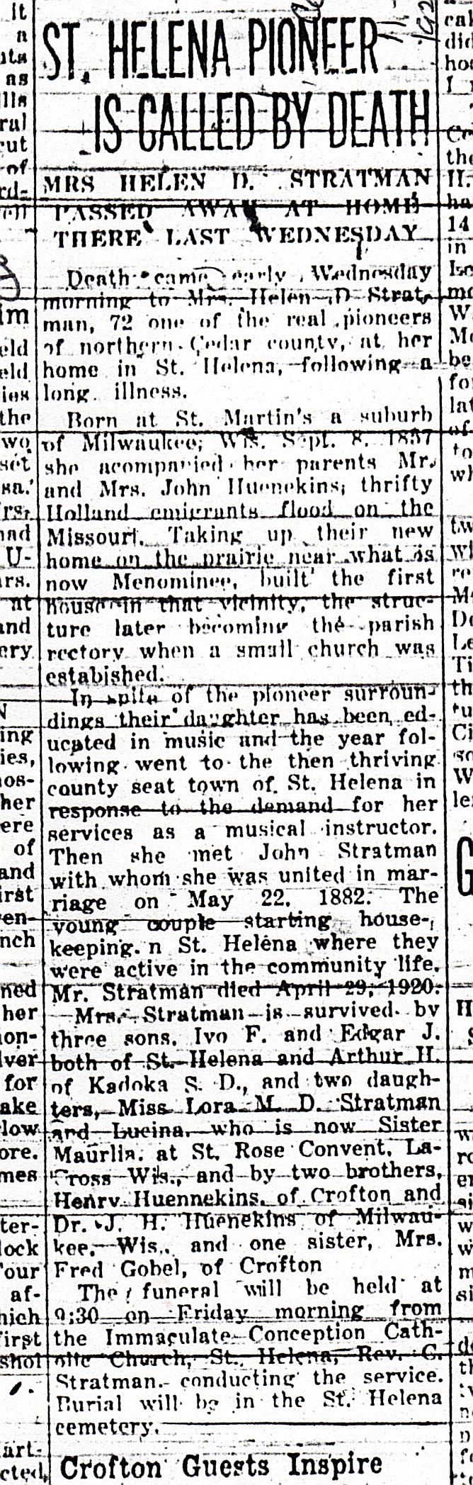 Cedar County, Nebraska Jump ahead to surnames: SAGE Betty J. Hill Published in: Cedar County News on October 13, 2004 SAGE Doris E. Trombley Published in: Cedar County News on April 17, 1999 SAGE George "June" Published in: Cedar County News on September 29, 1999 SAGE Lawrence Wilfred Published in: Cedar County News on September 29, 1999 SAHS Warren W., Dr. Published in: Cedar County News on December 24, 2003 SALA Eva Pearl Hintz Published in: Cedar County News on March 2, 2005 SALOMA Sister M. Eickleman Published in: Wynot Tribune on March 9, 1939 SALVATORI Theresa M. Schroeder Published in: Cedar County News on January 5, 2000 SAMELSON Jack W. Published in: Cedar County News on March 23, 2003 SAMELSON Lola N. Nelson Published in: Cedar County News on October 1, 1975 SANDBERG Baby Published in: The Magnet Cemetery Directory by T. Korth SANDIDGE Louis L. Published in: Cedar County News on August 31, 2005 SASSAMAN Kathryn Marie Tower Published in: Cedar County News in July 2002 SASSEN William K. Published in: Cedar County News on February 25, 2004 SATORIUS Christian Published in: Cedar County News in January 1944 SATORIUS Katherine Bergman Obit Image Published in: Cedar County News on May 13, 1954 Published in Sioux City Journal on May 9, 1954 SAWATZKE Elizabeth Eggers Published in: Cedar County News on November 10, 1975 SAYLOR Ann Marie Bracht Published in: Cedar County News on December 6, 2000 SCHAECHER Terrance Arthur "Terry" Published in: Cedar County News on April 20, 2005 SCHAEFER Mary Published in: Cedar County News on May 25, 1922 SCHAEFER Mrs. Peter Published in: Wynot Tribune on April 27, 1911 SCHAEFER Peter Published in: Cedar County News on March 4, 1920 SCHAEGER Henry "Bob" Published in: Cedar County News on February 25, 1960 SCHAGER Mrs. Christine Published in: Cedar County News on July 5, 1922 SCHAGER Larry D. Published in: Cedar County News on March 7, 2001 SCHAGER Lloyd Published in: Cedar County News on November 28, 1940 SCHALLER Harry Published in: Wynot Tribune on February 28, 1952 SCHALLERT William L. Sr. Published in: Cedar County News on March 14, 2001 SCHIEFFER Christina Elizabeth Guenther Published in: Cedar County News on January 7, 1976 SCHIEFFER Dorothy M. Published in: Cedar County News on February 11, 2004 SCHIEFFER J. Jacob Published in: Cedar County News on January 18, 1951 SCHIEFFER John Published in: Cedar County News on February 1, 1923 SCHIEFFER Joseph W. Published in: Cedar County News on December 21, 2000 SCHIEFFER Joseph W. Published in: Cedar County News on December 21, 2000 SCHIEFFER Mrs. Jacob Published in: Cedar County News on January 24, 1924 SCHIEFFER Peter J. Jr. Published in: Cedar County News on January 24, 2001 SCHINDLER Elda E. Published in: Cedar County News on January 2003 SCHINDLER Pearl Iva Carpenter Published in: Cedar County News on November 6, 1974 SCHINK Edward A. Published in: Cedar County News on December 10, 1975 SCHMECKPEPER Garron L. Published in: Cedar County News on December 20, 2000 SCHMIDT Agnes Betz Published in: Yankton Daily Press & Dakotan in October 1990 SCHMIDT Anna Hoese Published in: Wynot Tribune on November 12, 1914 SCHMIDT Anthony Published in: Cedar County News on October 13, 1955 SCHMIDT Frank Published in: Cedar County News on February 18, 1925 SCHMIDT Gerald Jr. Published in: Cedar County News on June 21, 1923 SCHMIDT Irene M. Lechner Published in: Cedar County News on May 9, 2001 SCHMIDT Kenneth Leonard Published in: Cedar County News on February 12, 2003 SCHMIDT Laurence Howard Published in: Wynot Tribune on October 9, 1913 SCHMIDT Lewis Published in: Yankton Press & Dakotan on February 15, 2001 SCHMIDT Sharon K. Mann Published in: Cedar County News on January 30, 2002 SCHMIDT Stanley N. Published in: Cedar County News on November 3, 1999 SCHMIDT Verna E. Hoesing Published in: Cedar County News in July 2000 SCHMIDT William N. Published in: Cedar County News on February 5, 1931 SCHMIT Jamie Published in: Cedar County News on October 15, 2003 SCHNEIDER Muriel Vivian Gowery Kelley Published in: Cedar County News in April 2003 SCHNEIDER Theresa Wuebben Published in: Cedar County News on July 18, 1979 SCHNEIDER Mrs. John [nee Kunz] Published in: Cedar County News on November 2, 1950 SCHNIEDERS Herman Bernard Published in: Cedar County News on July 16, 2003 SCHNIEDERS John C. Obit Image Published in: Cedar County News. SCHNIEDERS Ralph Published in: Cedar County News in December 2005 SCHOENBERNER Iven L. Published in: Cedar County News on July 26, 2000 SCHOLL Elizabeth Alvina Published in: Cedar County News on January 2?, 1951 SCHRIEBER Henry Published in: Cedar County News on April 16, 1969 SCHREINER John Published in: Cedar County News on March 1, 2000 SCHREMPP Carl Published in: Cedar County News on October 22, 1975 SCHREMPP Fred Published in: Cedar County News on October 1, 1975 SCHREMPP Mrs. Joseph (nee PETERS) Published in: Cedar County News on Oct. 22, 1915 SCHREMPP Joseph Published in: Cedar County News on March 12, 1921 SCHRIBER Dorothy Marie Kalin Published in: Cedar County News on November 29, 2000 SCHROEDER Dina Published in: Cedar County News on October 16, 1908 SCHROEDER Elizabeth Feldhacker/a> Published in: Cedar County News on February 16, 2005 SCHROEDER John Published in: Cedar County News. Date of Publication/Death: Mar. 8, 1931 SCHROEDER LeRoy F. Published in: Cedar County News on October 20, 2004 SCHULTE Mrs. Bruno (nee Stuckenhoff) Published in: Cedar County News on April 19, 1917 SCHULTE Annie Cunningham Published in: Cedar County News on September 15, 1935 SCHULTE Christine Teresa Published in: Cedar County News on January 7, 2004 SCHULTE Elizabeth Bruening "Lizzie" Published in: Hartington Herald Obit Image Published in: Wynot Tribune on April 20, 1911 SCHULTE Frank X. Published in: Cedar County News on January 8, 1975 SCHULTE Fred Henry Published in: Cedar County News. Date of Publication/Death: Sept. 21, 1951 SCHULTE Frieda M. Sudbeck Published in: Cedar County News on January 8, 1975Ma
