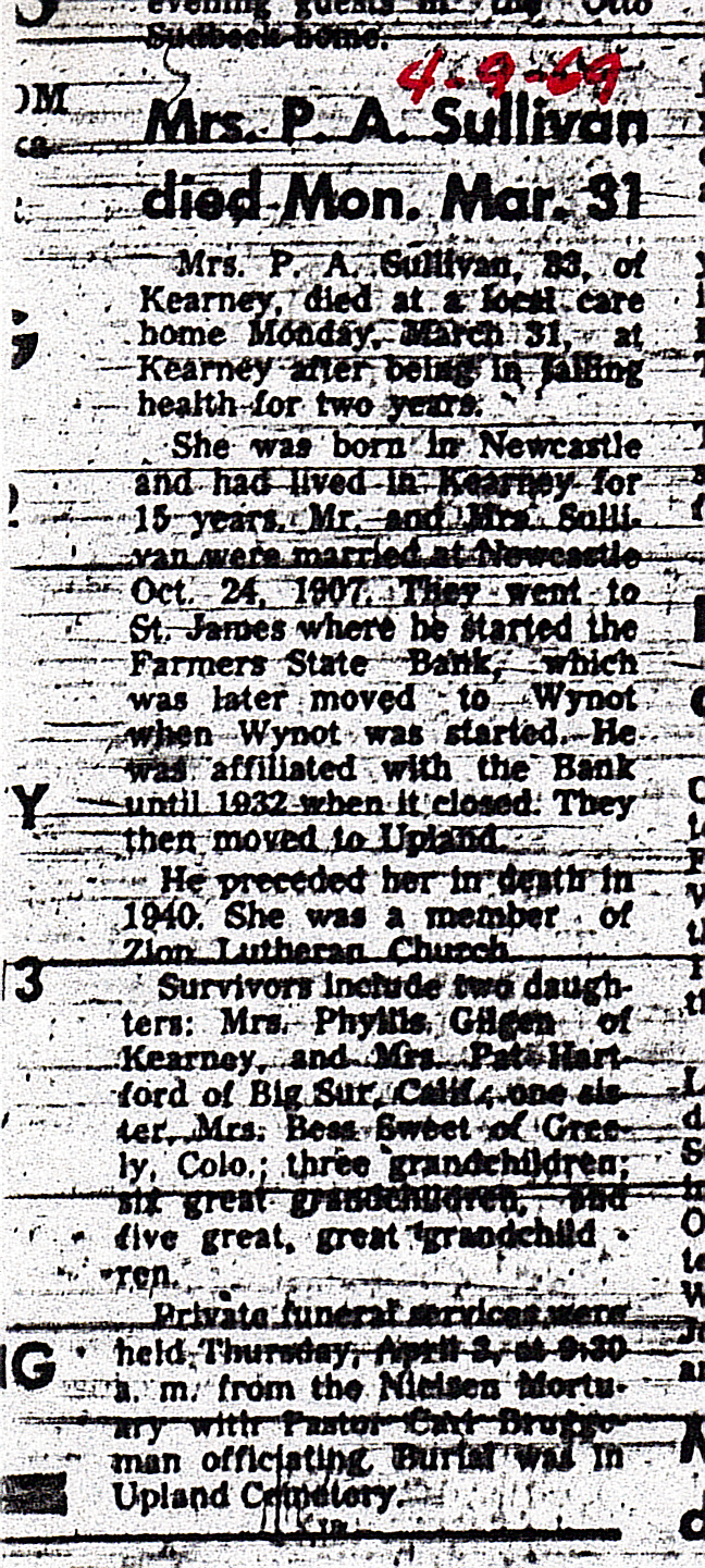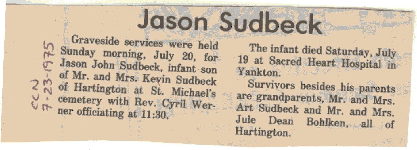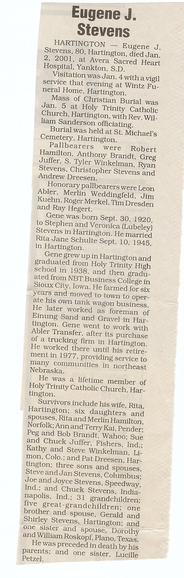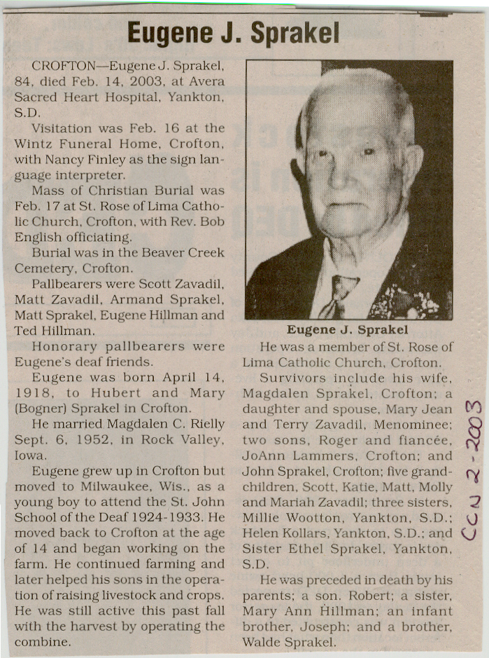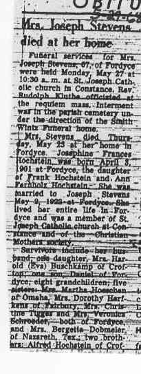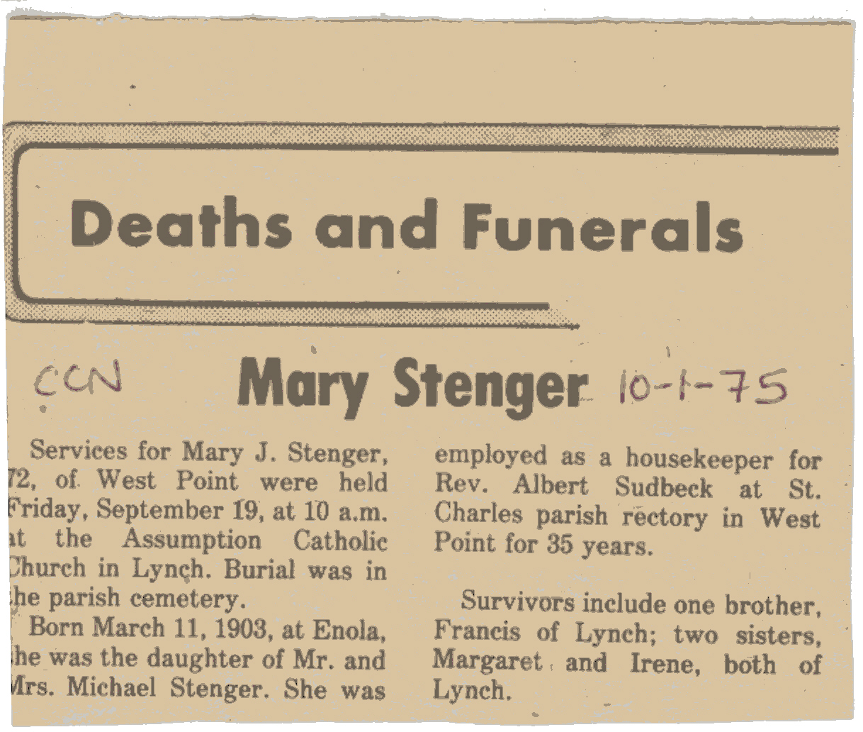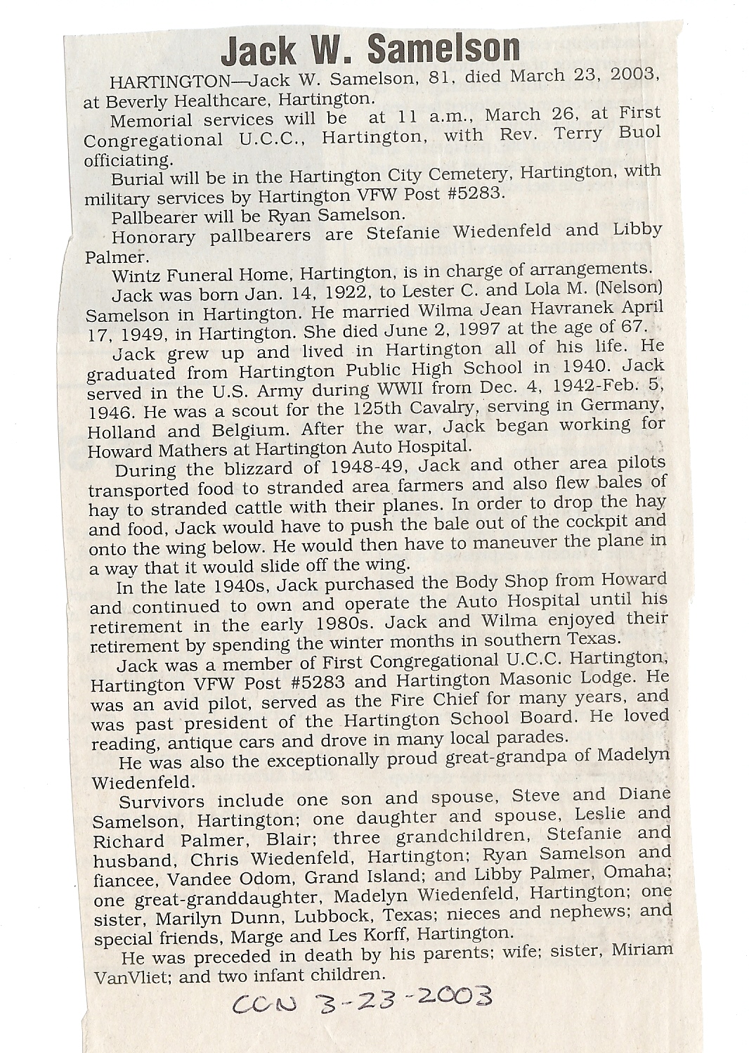 Cedar County, Nebraska Jump ahead to surnames: SAGE Betty J. Hill Published in: Cedar County News on October 13, 2004 SAGE Doris E. Trombley Published in: Cedar County News on April 17, 1999 SAGE George "June" Published in: Cedar County News on September 29, 1999 SAGE Lawrence Wilfred Published in: Cedar County News on September 29, 1999 SAHS Warren W., Dr. Published in: Cedar County News on December 24, 2003 SALA Eva Pearl Hintz Published in: Cedar County News on March 2, 2005 SALOMA Sister M. Eickleman Published in: Wynot Tribune on March 9, 1939 SALVATORI Theresa M. Schroeder Published in: Cedar County News on January 5, 2000 SAMELSON Jack W. Published in: Cedar County News on March 23, 2003 SAMELSON Lola N. Nelson Published in: Cedar County News on October 1, 1975 SANDBERG Baby Published in: The Magnet Cemetery Directory by T. Korth SANDIDGE Louis L. Published in: Cedar County News on August 31, 2005 SASSAMAN Kathryn Marie Tower Published in: Cedar County News in July 2002 SASSEN William K. Published in: Cedar County News on February 25, 2004 SATORIUS Christian Published in: Cedar County News in January 1944 SATORIUS Katherine Bergman Obit Image Published in: Cedar County News on May 13, 1954 Published in Sioux City Journal on May 9, 1954 SAWATZKE Elizabeth Eggers Published in: Cedar County News on November 10, 1975 SAYLOR Ann Marie Bracht Published in: Cedar County News on December 6, 2000 SCHAECHER Terrance Arthur "Terry" Published in: Cedar County News on April 20, 2005 SCHAEFER Mary Published in: Cedar County News on May 25, 1922 SCHAEFER Mrs. Peter Published in: Wynot Tribune on April 27, 1911 SCHAEFER Peter Published in: Cedar County News on March 4, 1920 SCHAEGER Henry "Bob" Published in: Cedar County News on February 25, 1960 SCHAGER Mrs. Christine Published in: Cedar County News on July 5, 1922 SCHAGER Larry D. Published in: Cedar County News on March 7, 2001 SCHAGER Lloyd Published in: Cedar County News on November 28, 1940 SCHALLER Harry Published in: Wynot Tribune on February 28, 1952 SCHALLERT William L. Sr. Published in: Cedar County News on March 14, 2001 SCHIEFFER Christina Elizabeth Guenther Published in: Cedar County News on January 7, 1976 SCHIEFFER Dorothy M. Published in: Cedar County News on February 11, 2004 SCHIEFFER J. Jacob Published in: Cedar County News on January 18, 1951 SCHIEFFER John Published in: Cedar County News on February 1, 1923 SCHIEFFER Joseph W. Published in: Cedar County News on December 21, 2000 SCHIEFFER Joseph W. Published in: Cedar County News on December 21, 2000 SCHIEFFER Mrs. Jacob Published in: Cedar County News on January 24, 1924 SCHIEFFER Peter J. Jr. Published in: Cedar County News on January 24, 2001 SCHINDLER Elda E. Published in: Cedar County News on January 2003 SCHINDLER Pearl Iva Carpenter Published in: Cedar County News on November 6, 1974 SCHINK Edward A. Published in: Cedar County News on December 10, 1975 SCHMECKPEPER Garron L. Published in: Cedar County News on December 20, 2000 SCHMIDT Agnes Betz Published in: Yankton Daily Press & Dakotan in October 1990 SCHMIDT Anna Hoese Published in: Wynot Tribune on November 12, 1914 SCHMIDT Anthony Published in: Cedar County News on October 13, 1955 SCHMIDT Frank Published in: Cedar County News on February 18, 1925 SCHMIDT Gerald Jr. Published in: Cedar County News on June 21, 1923 SCHMIDT Irene M. Lechner Published in: Cedar County News on May 9, 2001 SCHMIDT Kenneth Leonard Published in: Cedar County News on February 12, 2003 SCHMIDT Laurence Howard Published in: Wynot Tribune on October 9, 1913 SCHMIDT Lewis Published in: Yankton Press & Dakotan on February 15, 2001 SCHMIDT Sharon K. Mann Published in: Cedar County News on January 30, 2002 SCHMIDT Stanley N. Published in: Cedar County News on November 3, 1999 SCHMIDT Verna E. Hoesing Published in: Cedar County News in July 2000 SCHMIDT William N. Published in: Cedar County News on February 5, 1931 SCHMIT Jamie Published in: Cedar County News on October 15, 2003 SCHNEIDER Muriel Vivian Gowery Kelley Published in: Cedar County News in April 2003 SCHNEIDER Theresa Wuebben Published in: Cedar County News on July 18, 1979 SCHNEIDER Mrs. John [nee Kunz] Published in: Cedar County News on November 2, 1950 SCHNIEDERS Herman Bernard Published in: Cedar County News on July 16, 2003 SCHNIEDERS John C. Obit Image Published in: Cedar County News. SCHNIEDERS Ralph Published in: Cedar County News in December 2005 SCHOENBERNER Iven L. Published in: Cedar County News on July 26, 2000 SCHOLL Elizabeth Alvina Published in: Cedar County News on January 2?, 1951 SCHRIEBER Henry Published in: Cedar County News on April 16, 1969 SCHREINER John Published in: Cedar County News on March 1, 2000 SCHREMPP Carl Published in: Cedar County News on October 22, 1975 SCHREMPP Fred Published in: Cedar County News on October 1, 1975 SCHREMPP Mrs. Joseph (nee PETERS) Published in: Cedar County News on Oct. 22, 1915 SCHREMPP Joseph Published in: Cedar County News on March 12, 1921 SCHRIBER Dorothy Marie Kalin Published in: Cedar County News on November 29, 2000 SCHROEDER Dina Published in: Cedar County News on October 16, 1908 SCHROEDER Elizabeth Feldhacker/a> Published in: Cedar County News on February 16, 2005 SCHROEDER John Published in: Cedar County News. Date of Publication/Death: Mar. 8, 1931 SCHROEDER LeRoy F. Published in: Cedar County News on October 20, 2004 SCHULTE Mrs. Bruno (nee Stuckenhoff) Published in: Cedar County News on April 19, 1917 SCHULTE Annie Cunningham Published in: Cedar County News on September 15, 1935 SCHULTE Christine Teresa Published in: Cedar County News on January 7, 2004 SCHULTE Elizabeth Bruening "Lizzie" Published in: Hartington Herald Obit Image Published in: Wynot Tribune on April 20, 1911 SCHULTE Frank X. Published in: Cedar County News on January 8, 1975 SCHULTE Fred Henry Published in: Cedar County News. Date of Publication/Death: Sept. 21, 1951 SCHULTE Frieda M. Sudbeck Published in: Cedar County News on January 8, 1975Ma