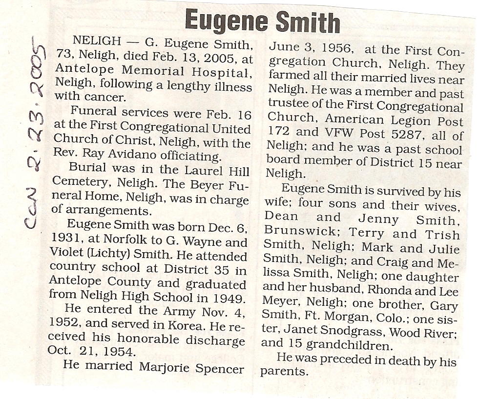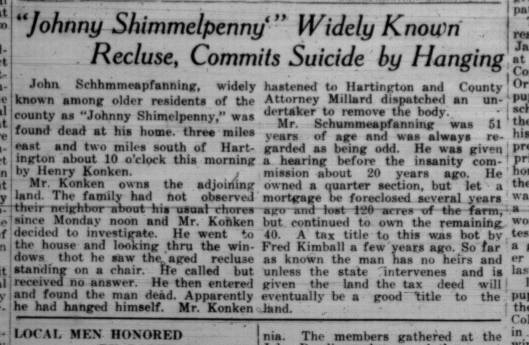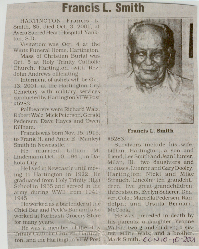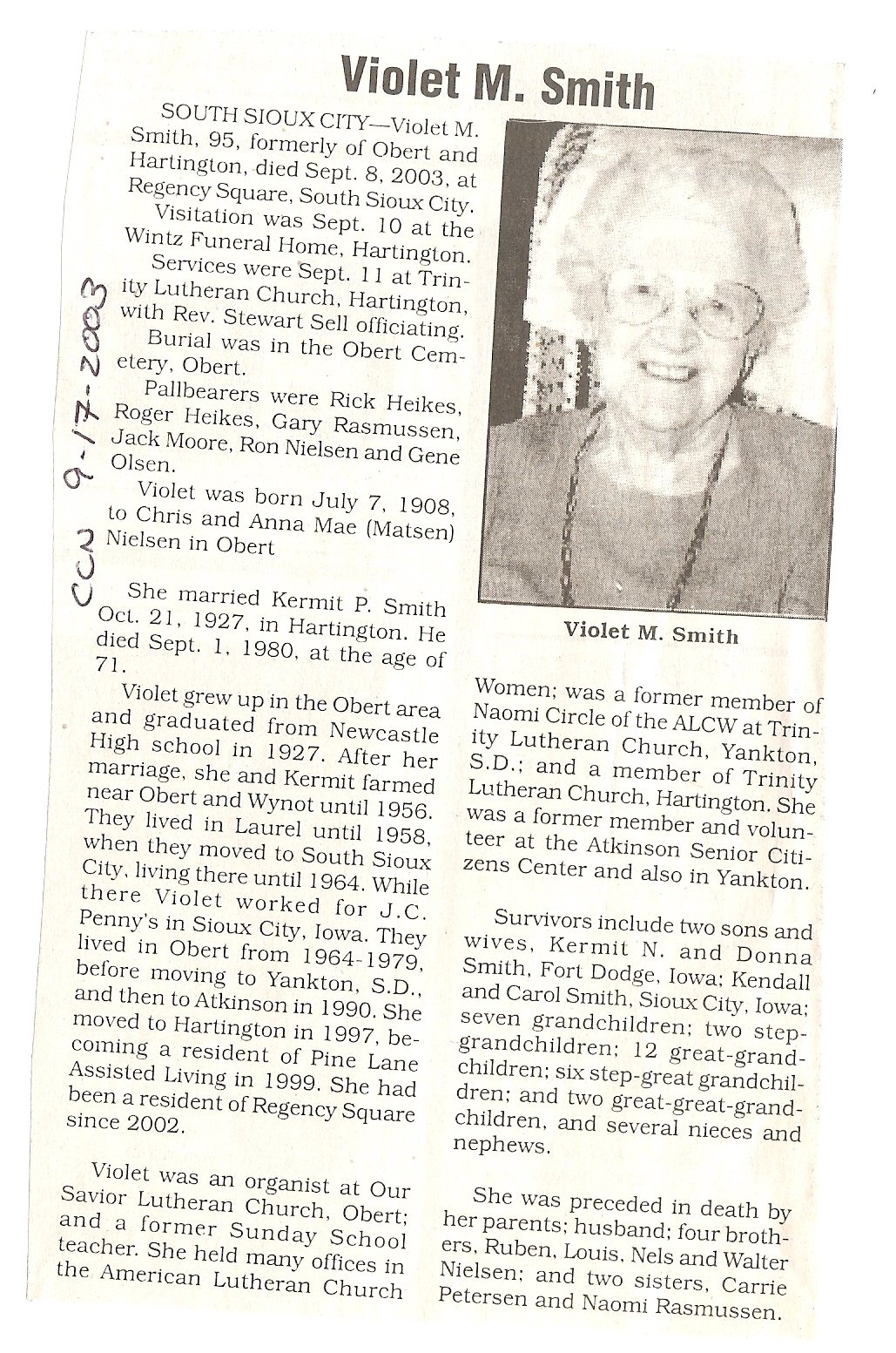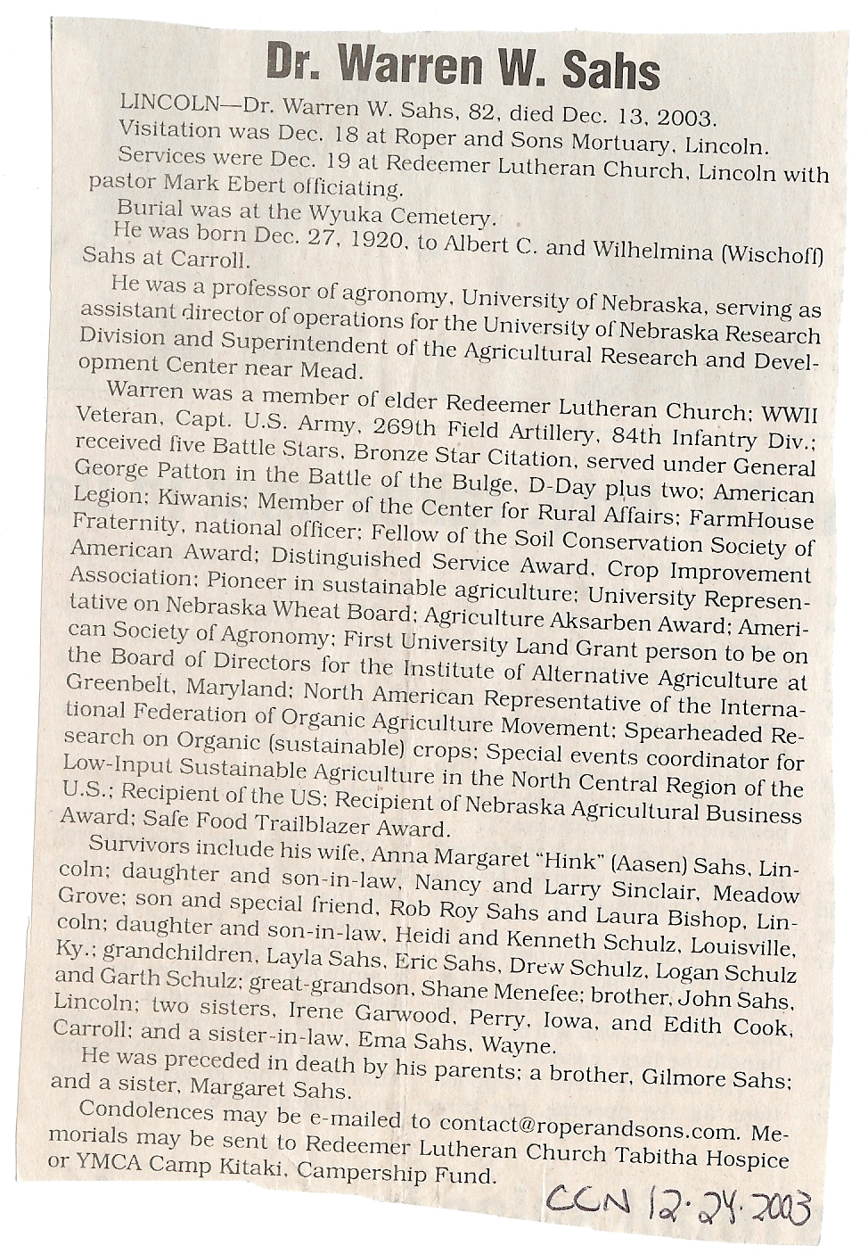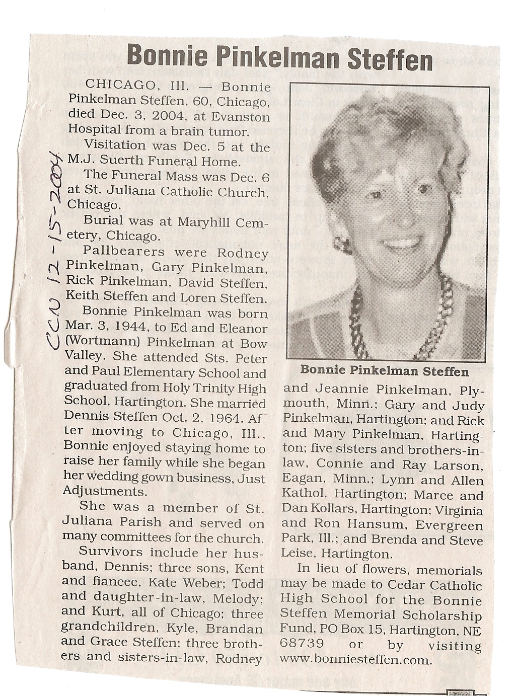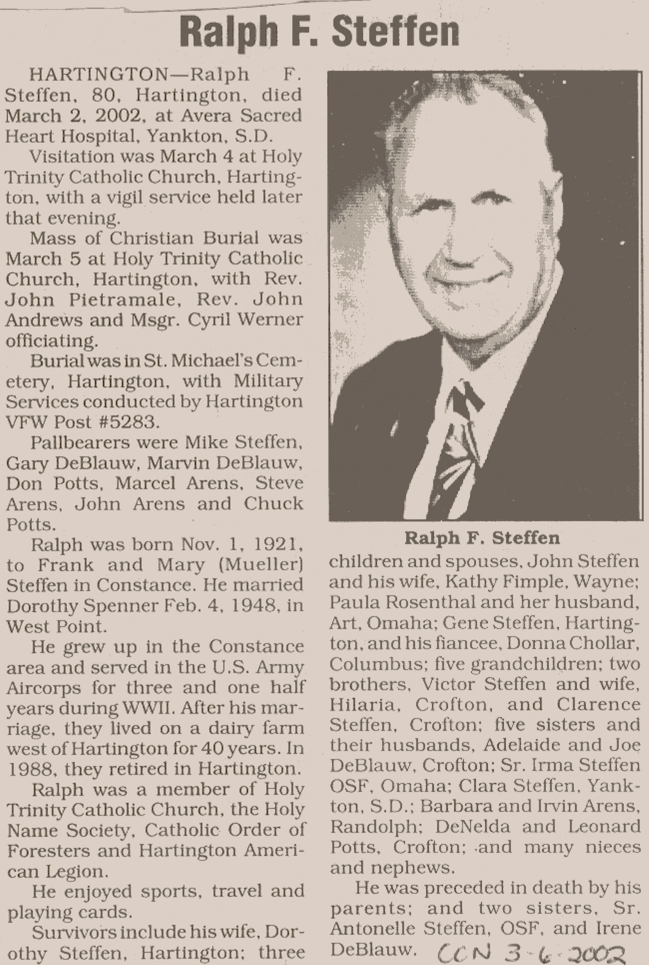 Cedar County, Nebraska Jump ahead to surnames: SAGE Betty J. Hill Published in: Cedar County News on October 13, 2004 SAGE Doris E. Trombley Published in: Cedar County News on April 17, 1999 SAGE George "June" Published in: Cedar County News on September 29, 1999 SAGE Lawrence Wilfred Published in: Cedar County News on September 29, 1999 SAHS Warren W., Dr. Published in: Cedar County News on December 24, 2003 SALA Eva Pearl Hintz Published in: Cedar County News on March 2, 2005 SALOMA Sister M. Eickleman Published in: Wynot Tribune on March 9, 1939 SALVATORI Theresa M. Schroeder Published in: Cedar County News on January 5, 2000 SAMELSON Jack W. Published in: Cedar County News on March 23, 2003 SAMELSON Lola N. Nelson Published in: Cedar County News on October 1, 1975 SANDBERG Baby Published in: The Magnet Cemetery Directory by T. Korth SANDIDGE Louis L. Published in: Cedar County News on August 31, 2005 SASSAMAN Kathryn Marie Tower Published in: Cedar County News in July 2002 SASSEN William K. Published in: Cedar County News on February 25, 2004 SATORIUS Christian Published in: Cedar County News in January 1944 SATORIUS Katherine Bergman Obit Image Published in: Cedar County News on May 13, 1954 Published in Sioux City Journal on May 9, 1954 SAWATZKE Elizabeth Eggers Published in: Cedar County News on November 10, 1975 SAYLOR Ann Marie Bracht Published in: Cedar County News on December 6, 2000 SCHAECHER Terrance Arthur "Terry" Published in: Cedar County News on April 20, 2005 SCHAEFER Mary Published in: Cedar County News on May 25, 1922 SCHAEFER Mrs. Peter Published in: Wynot Tribune on April 27, 1911 SCHAEFER Peter Published in: Cedar County News on March 4, 1920 SCHAEGER Henry "Bob" Published in: Cedar County News on February 25, 1960 SCHAGER Mrs. Christine Published in: Cedar County News on July 5, 1922 SCHAGER Larry D. Published in: Cedar County News on March 7, 2001 SCHAGER Lloyd Published in: Cedar County News on November 28, 1940 SCHALLER Harry Published in: Wynot Tribune on February 28, 1952 SCHALLERT William L. Sr. Published in: Cedar County News on March 14, 2001 SCHIEFFER Christina Elizabeth Guenther Published in: Cedar County News on January 7, 1976 SCHIEFFER Dorothy M. Published in: Cedar County News on February 11, 2004 SCHIEFFER J. Jacob Published in: Cedar County News on January 18, 1951 SCHIEFFER John Published in: Cedar County News on February 1, 1923 SCHIEFFER Joseph W. Published in: Cedar County News on December 21, 2000 SCHIEFFER Joseph W. Published in: Cedar County News on December 21, 2000 SCHIEFFER Mrs. Jacob Published in: Cedar County News on January 24, 1924 SCHIEFFER Peter J. Jr. Published in: Cedar County News on January 24, 2001 SCHINDLER Elda E. Published in: Cedar County News on January 2003 SCHINDLER Pearl Iva Carpenter Published in: Cedar County News on November 6, 1974 SCHINK Edward A. Published in: Cedar County News on December 10, 1975 SCHMECKPEPER Garron L. Published in: Cedar County News on December 20, 2000 SCHMIDT Agnes Betz Published in: Yankton Daily Press & Dakotan in October 1990 SCHMIDT Anna Hoese Published in: Wynot Tribune on November 12, 1914 SCHMIDT Anthony Published in: Cedar County News on October 13, 1955 SCHMIDT Frank Published in: Cedar County News on February 18, 1925 SCHMIDT Gerald Jr. Published in: Cedar County News on June 21, 1923 SCHMIDT Irene M. Lechner Published in: Cedar County News on May 9, 2001 SCHMIDT Kenneth Leonard Published in: Cedar County News on February 12, 2003 SCHMIDT Laurence Howard Published in: Wynot Tribune on October 9, 1913 SCHMIDT Lewis Published in: Yankton Press & Dakotan on February 15, 2001 SCHMIDT Sharon K. Mann Published in: Cedar County News on January 30, 2002 SCHMIDT Stanley N. Published in: Cedar County News on November 3, 1999 SCHMIDT Verna E. Hoesing Published in: Cedar County News in July 2000 SCHMIDT William N. Published in: Cedar County News on February 5, 1931 SCHMIT Jamie Published in: Cedar County News on October 15, 2003 SCHNEIDER Muriel Vivian Gowery Kelley Published in: Cedar County News in April 2003 SCHNEIDER Theresa Wuebben Published in: Cedar County News on July 18, 1979 SCHNEIDER Mrs. John [nee Kunz] Published in: Cedar County News on November 2, 1950 SCHNIEDERS Herman Bernard Published in: Cedar County News on July 16, 2003 SCHNIEDERS John C. Obit Image Published in: Cedar County News. SCHNIEDERS Ralph Published in: Cedar County News in December 2005 SCHOENBERNER Iven L. Published in: Cedar County News on July 26, 2000 SCHOLL Elizabeth Alvina Published in: Cedar County News on January 2?, 1951 SCHRIEBER Henry Published in: Cedar County News on April 16, 1969 SCHREINER John Published in: Cedar County News on March 1, 2000 SCHREMPP Carl Published in: Cedar County News on October 22, 1975 SCHREMPP Fred Published in: Cedar County News on October 1, 1975 SCHREMPP Mrs. Joseph (nee PETERS) Published in: Cedar County News on Oct. 22, 1915 SCHREMPP Joseph Published in: Cedar County News on March 12, 1921 SCHRIBER Dorothy Marie Kalin Published in: Cedar County News on November 29, 2000 SCHROEDER Dina Published in: Cedar County News on October 16, 1908 SCHROEDER Elizabeth Feldhacker/a> Published in: Cedar County News on February 16, 2005 SCHROEDER John Published in: Cedar County News. Date of Publication/Death: Mar. 8, 1931 SCHROEDER LeRoy F. Published in: Cedar County News on October 20, 2004 SCHULTE Mrs. Bruno (nee Stuckenhoff) Published in: Cedar County News on April 19, 1917 SCHULTE Annie Cunningham Published in: Cedar County News on September 15, 1935 SCHULTE Christine Teresa Published in: Cedar County News on January 7, 2004 SCHULTE Elizabeth Bruening "Lizzie" Published in: Hartington Herald Obit Image Published in: Wynot Tribune on April 20, 1911 SCHULTE Frank X. Published in: Cedar County News on January 8, 1975 SCHULTE Fred Henry Published in: Cedar County News. Date of Publication/Death: Sept. 21, 1951 SCHULTE Frieda M. Sudbeck Published in: Cedar County News on January 8, 1975Ma