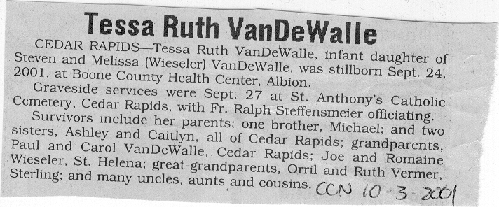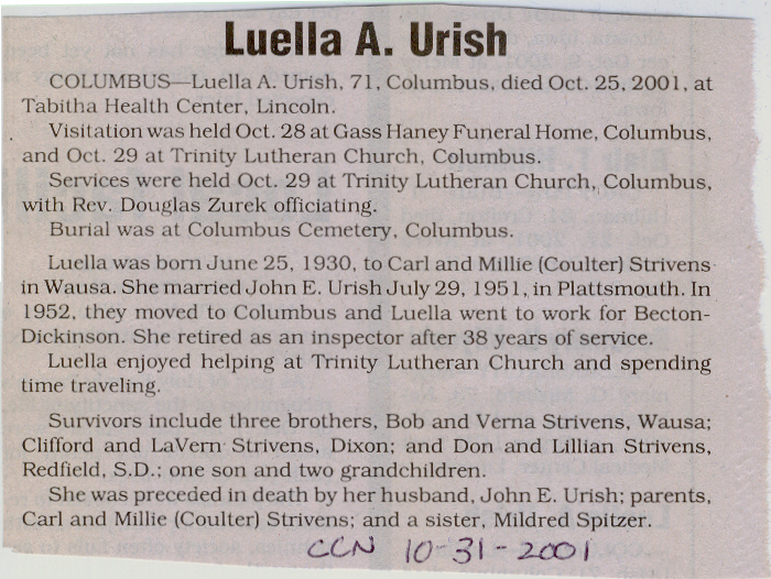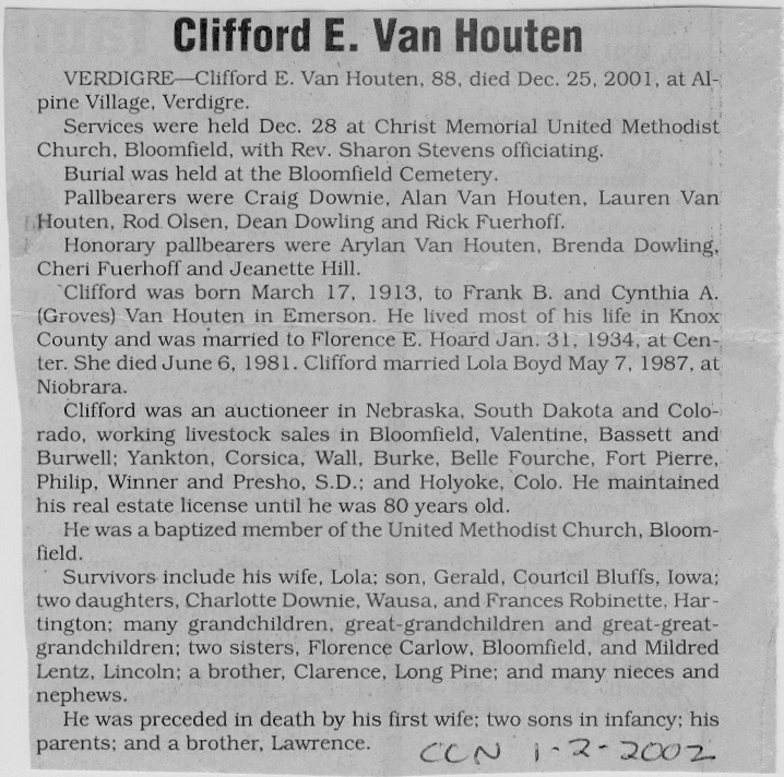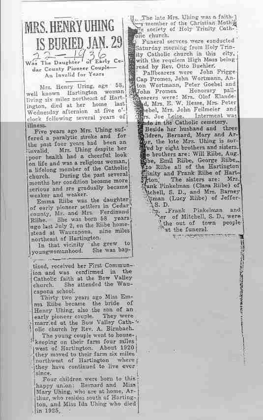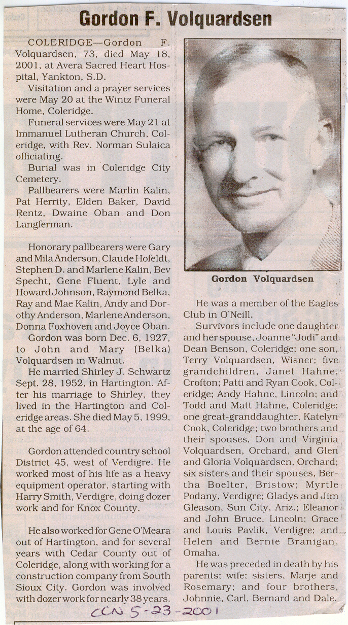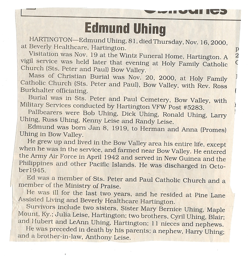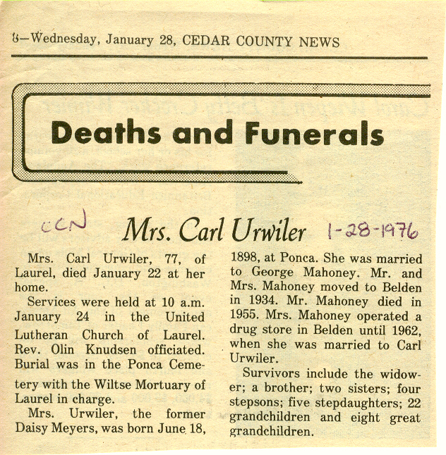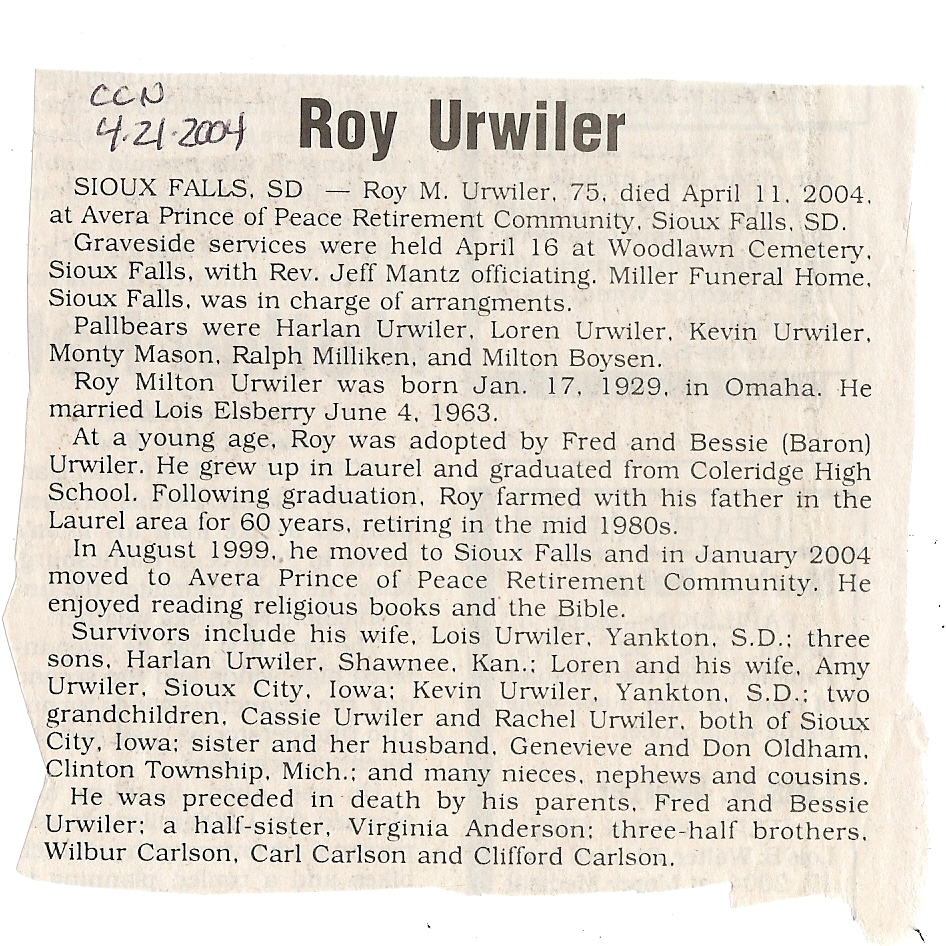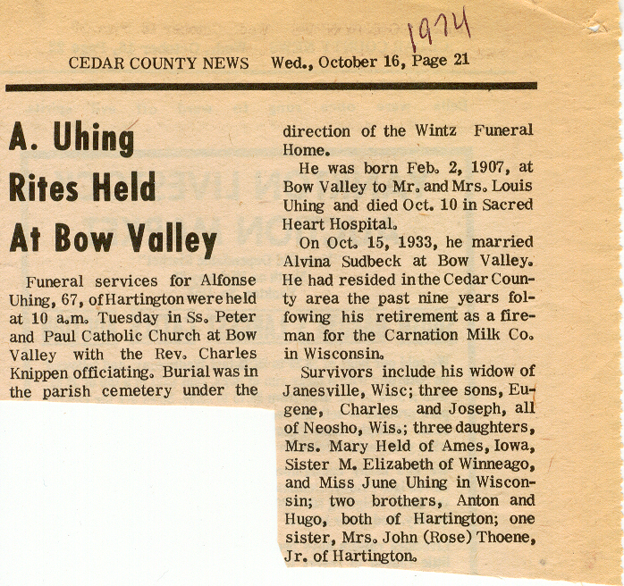 Cedar County, Nebraska Jump ahead to surnames: U UHING Alfonse Published in: Cedar County News on October 16, 1974 UHING Claudette M. Lentz Published in: Cedar County News on May 24, 2006 UHING Edmund Published in: Cedar County News in November 2000 UHING Emma Riibe Published in: Cedar County News. Date of Death: Jan 22, 1936 UHING Sister Mary Bernice Published in: Cedar County News on July 25, 2001 UHRICH Dale Ivan Published in: Cedar County News on August 31, 2005 ULRICH Marian Petersen Published in: Cedar County News on December 9, 1998 URISH Luella A. Strivens Published in: Cedar County News on October 31, 2001 URWILER Daisy Meyers Published in: Cedar County News on January 28, 1976 URWILER James Published in: August 1973 URWILER James Sr. Published in: Laurel Advocate in August 1973 URWILER Roy M. Published in: Cedar County News on April 21, 2004 UTESCH Arthur W. "Art" Published in: Cedar County News on December 24, 2003 UTESCH Elaine I. Hammatt Published in: Cedar County News on April 27, 2005 UTESCH Randall Scott Published in: Cedar County News on September 3, 2003 V VAN Mary F. Roan Published in: Wynot Tribune on May 14, 1914 Obituary Image VANCAMPEN Mary Cross (Cook)(Smith) Published in: Cedar County News on June 1927 VANDEWALLE Tessa Ruth Published in: Cedar County News on October 3, 2001 VANHAZEL James Henry Published in: Cedar County News on July 25, 2001 VANHOUTEN Clifford E. Published in: Cedar County News on January 2, 2002 VANVELSOR Marie Bell Published in: Cedar County News on April 14, 1941 VEAL Darrel Published in: Sioux City Journal on December 3, 1963 VEDDER Lorna L. Konken (Broers) Published in: Cedar County News on December 15, 1999 VETTEL Phyllis Marie Dreesen Published in: Cedar County News in July 2002 VIERGUTZ Vernon Published in: Cedar County News on December 23, 1998 VLACH Charles J., M.D. Published in: Cedar County News in August 2002 VOCK Helen I. Puntney Published in: Cedar County News on January 23, 1991 VOGLE John H. Published in: Cedar County News on December 12, 2001 VOLK Layne F. Died February 4, 2005 VOLQUARDSEN Gordon F. Published in: Cedar County News on May 23, 2001 VORNHAGEN Edward J. Published in: Cedar County News on September 1, 2004 VORNHAGEN Gerald "Jerry" Published in: Cedar County News on November 19, 2003 VORNHAGEN Marie Leise Published in: Cedar County News on March 26, 2003 VORNHAGEN Richard Todd Published in: Cedar County News on July 14, 1999 VOSS August Frank Published in: York News Times on September 13, 1958 VOSS Hilda M. Kuhl Published in: York News Times on August 12, 1976 To submit an obituary, e-mail Carol Tramp,