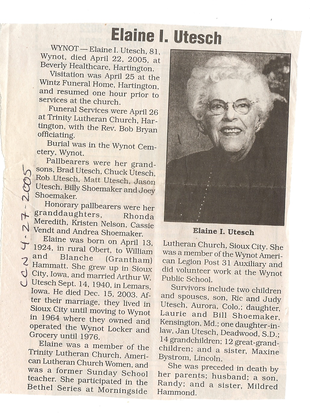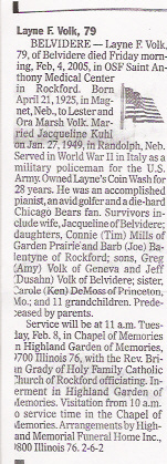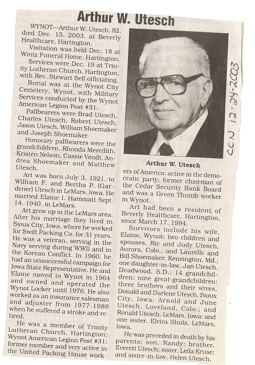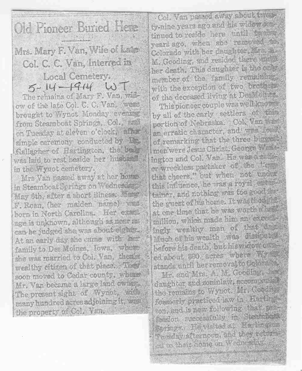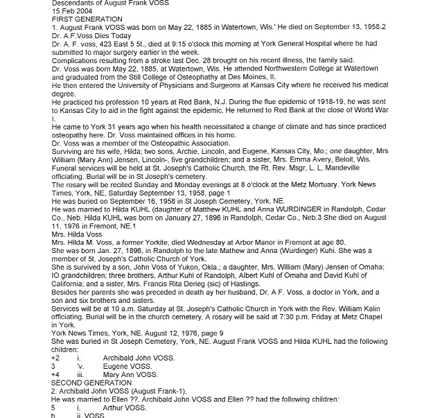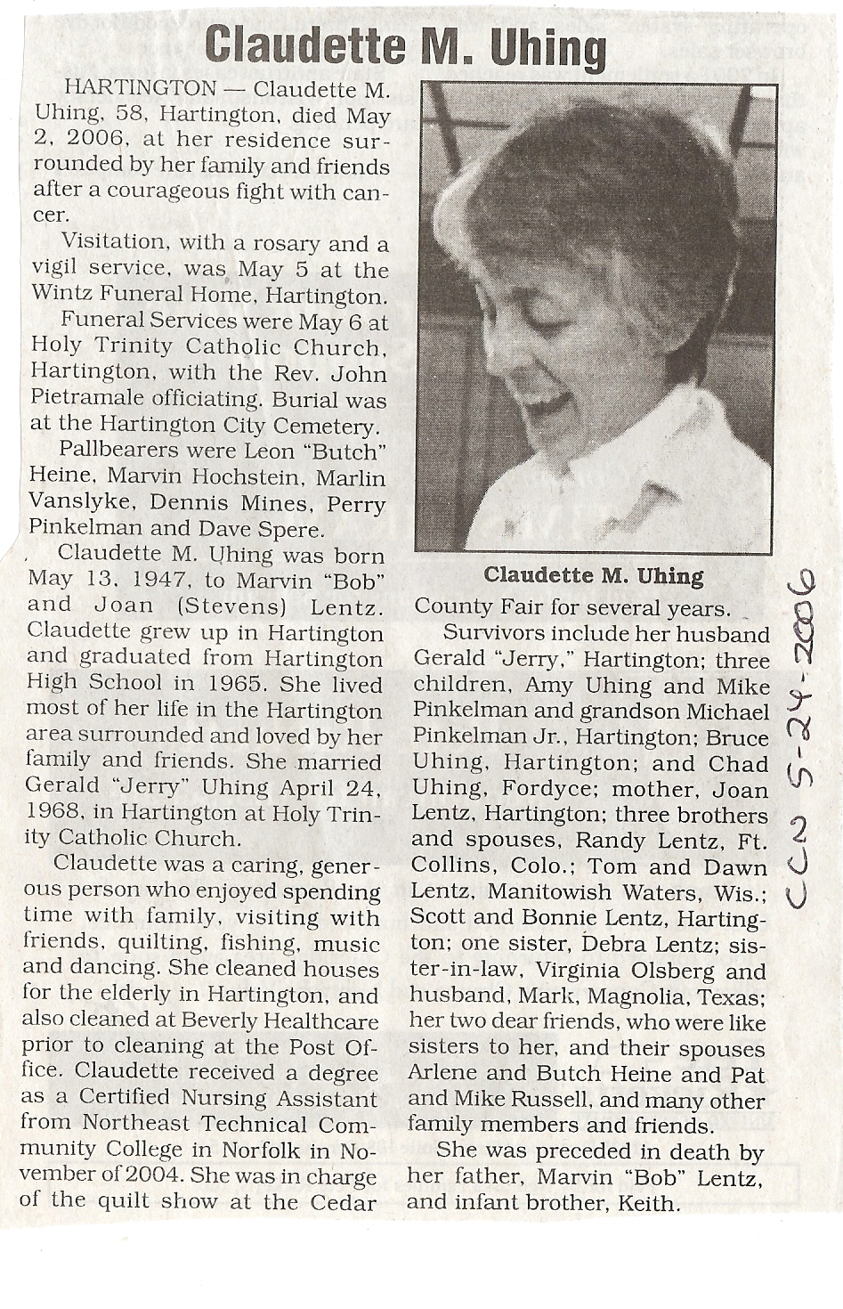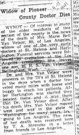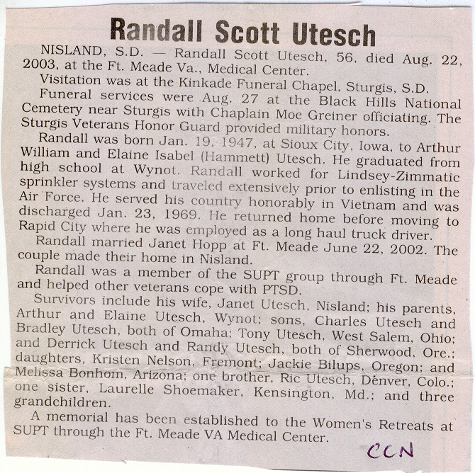 Cedar County, Nebraska Jump ahead to surnames: U UHING Alfonse Published in: Cedar County News on October 16, 1974 UHING Claudette M. Lentz Published in: Cedar County News on May 24, 2006 UHING Edmund Published in: Cedar County News in November 2000 UHING Emma Riibe Published in: Cedar County News. Date of Death: Jan 22, 1936 UHING Sister Mary Bernice Published in: Cedar County News on July 25, 2001 UHRICH Dale Ivan Published in: Cedar County News on August 31, 2005 ULRICH Marian Petersen Published in: Cedar County News on December 9, 1998 URISH Luella A. Strivens Published in: Cedar County News on October 31, 2001 URWILER Daisy Meyers Published in: Cedar County News on January 28, 1976 URWILER James Published in: August 1973 URWILER James Sr. Published in: Laurel Advocate in August 1973 URWILER Roy M. Published in: Cedar County News on April 21, 2004 UTESCH Arthur W. "Art" Published in: Cedar County News on December 24, 2003 UTESCH Elaine I. Hammatt Published in: Cedar County News on April 27, 2005 UTESCH Randall Scott Published in: Cedar County News on September 3, 2003 V VAN Mary F. Roan Published in: Wynot Tribune on May 14, 1914 Obituary Image VANCAMPEN Mary Cross (Cook)(Smith) Published in: Cedar County News on June 1927 VANDEWALLE Tessa Ruth Published in: Cedar County News on October 3, 2001 VANHAZEL James Henry Published in: Cedar County News on July 25, 2001 VANHOUTEN Clifford E. Published in: Cedar County News on January 2, 2002 VANVELSOR Marie Bell Published in: Cedar County News on April 14, 1941 VEAL Darrel Published in: Sioux City Journal on December 3, 1963 VEDDER Lorna L. Konken (Broers) Published in: Cedar County News on December 15, 1999 VETTEL Phyllis Marie Dreesen Published in: Cedar County News in July 2002 VIERGUTZ Vernon Published in: Cedar County News on December 23, 1998 VLACH Charles J., M.D. Published in: Cedar County News in August 2002 VOCK Helen I. Puntney Published in: Cedar County News on January 23, 1991 VOGLE John H. Published in: Cedar County News on December 12, 2001 VOLK Layne F. Died February 4, 2005 VOLQUARDSEN Gordon F. Published in: Cedar County News on May 23, 2001 VORNHAGEN Edward J. Published in: Cedar County News on September 1, 2004 VORNHAGEN Gerald "Jerry" Published in: Cedar County News on November 19, 2003 VORNHAGEN Marie Leise Published in: Cedar County News on March 26, 2003 VORNHAGEN Richard Todd Published in: Cedar County News on July 14, 1999 VOSS August Frank Published in: York News Times on September 13, 1958 VOSS Hilda M. Kuhl Published in: York News Times on August 12, 1976 To submit an obituary, e-mail Carol Tramp,