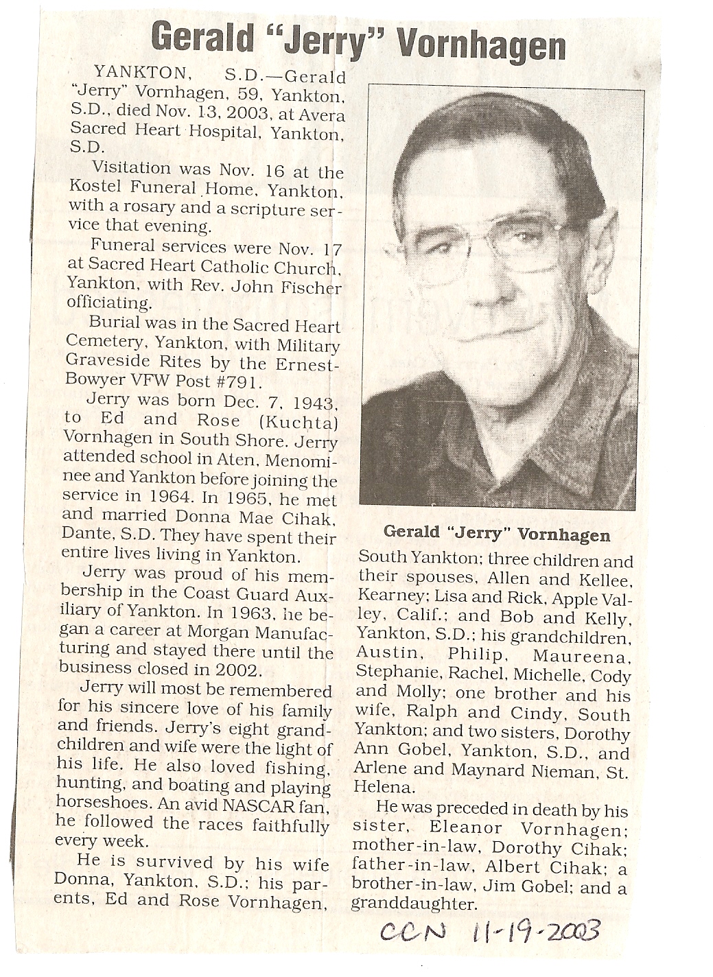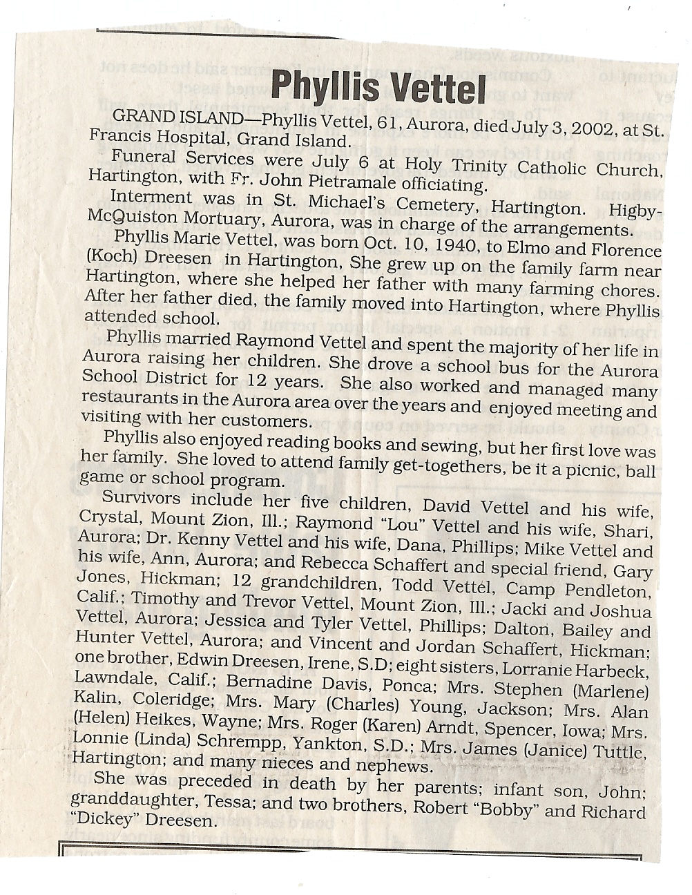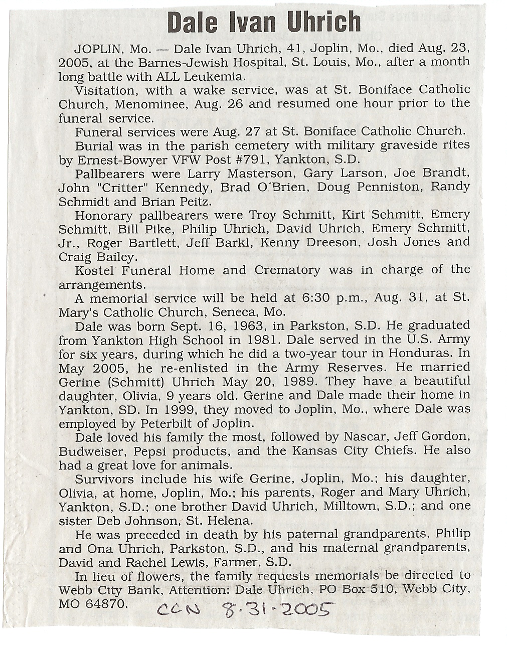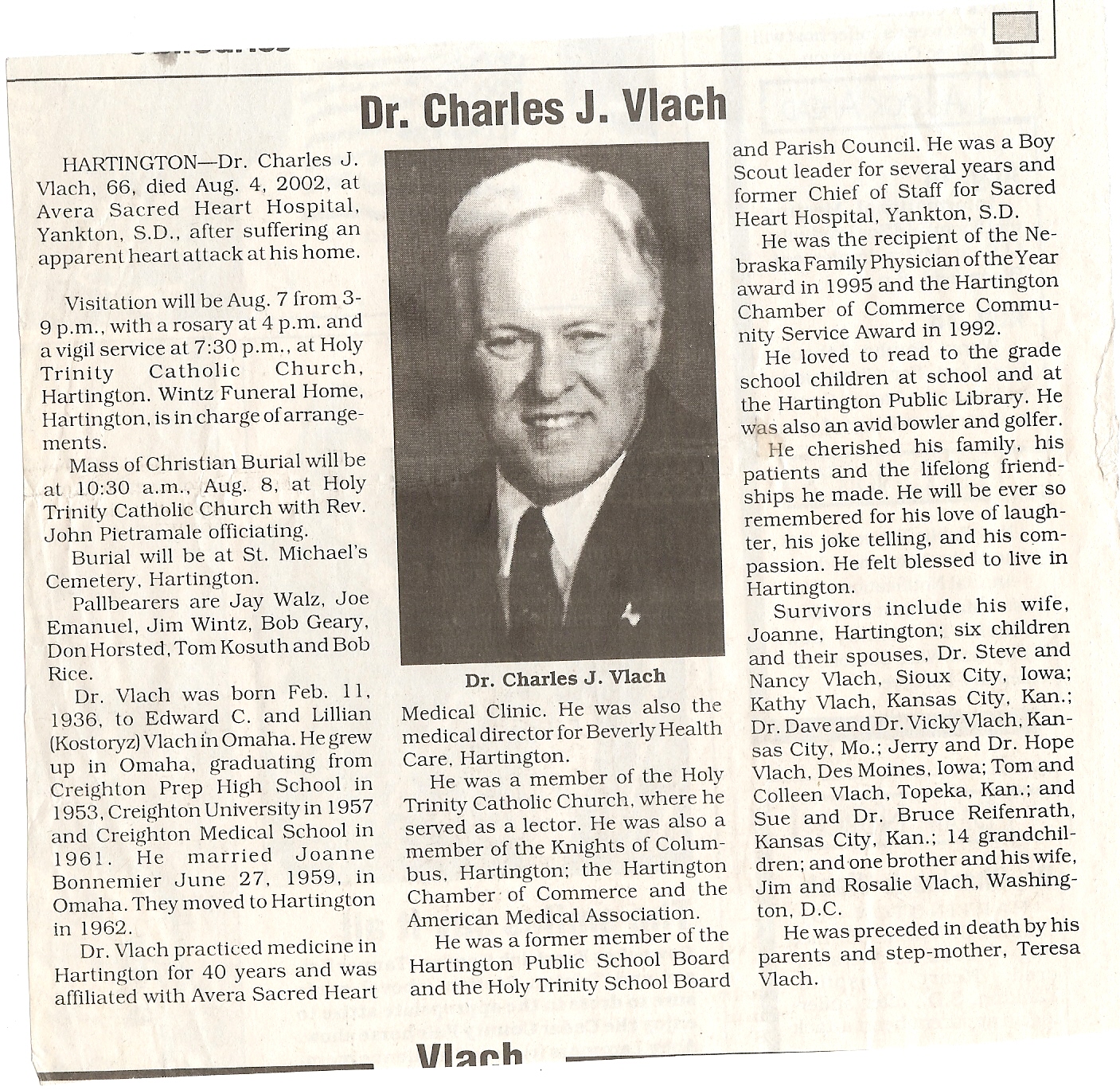 Cedar County, Nebraska Jump ahead to surnames: U UHING Alfonse Published in: Cedar County News on October 16, 1974 UHING Claudette M. Lentz Published in: Cedar County News on May 24, 2006 UHING Edmund Published in: Cedar County News in November 2000 UHING Emma Riibe Published in: Cedar County News. Date of Death: Jan 22, 1936 UHING Sister Mary Bernice Published in: Cedar County News on July 25, 2001 UHRICH Dale Ivan Published in: Cedar County News on August 31, 2005 ULRICH Marian Petersen Published in: Cedar County News on December 9, 1998 URISH Luella A. Strivens Published in: Cedar County News on October 31, 2001 URWILER Daisy Meyers Published in: Cedar County News on January 28, 1976 URWILER James Published in: August 1973 URWILER James Sr. Published in: Laurel Advocate in August 1973 URWILER Roy M. Published in: Cedar County News on April 21, 2004 UTESCH Arthur W. "Art" Published in: Cedar County News on December 24, 2003 UTESCH Elaine I. Hammatt Published in: Cedar County News on April 27, 2005 UTESCH Randall Scott Published in: Cedar County News on September 3, 2003 V VAN Mary F. Roan Published in: Wynot Tribune on May 14, 1914 Obituary Image VANCAMPEN Mary Cross (Cook)(Smith) Published in: Cedar County News on June 1927 VANDEWALLE Tessa Ruth Published in: Cedar County News on October 3, 2001 VANHAZEL James Henry Published in: Cedar County News on July 25, 2001 VANHOUTEN Clifford E. Published in: Cedar County News on January 2, 2002 VANVELSOR Marie Bell Published in: Cedar County News on April 14, 1941 VEAL Darrel Published in: Sioux City Journal on December 3, 1963 VEDDER Lorna L. Konken (Broers) Published in: Cedar County News on December 15, 1999 VETTEL Phyllis Marie Dreesen Published in: Cedar County News in July 2002 VIERGUTZ Vernon Published in: Cedar County News on December 23, 1998 VLACH Charles J., M.D. Published in: Cedar County News in August 2002 VOCK Helen I. Puntney Published in: Cedar County News on January 23, 1991 VOGLE John H. Published in: Cedar County News on December 12, 2001 VOLK Layne F. Died February 4, 2005 VOLQUARDSEN Gordon F. Published in: Cedar County News on May 23, 2001 VORNHAGEN Edward J. Published in: Cedar County News on September 1, 2004 VORNHAGEN Gerald "Jerry" Published in: Cedar County News on November 19, 2003 VORNHAGEN Marie Leise Published in: Cedar County News on March 26, 2003 VORNHAGEN Richard Todd Published in: Cedar County News on July 14, 1999 VOSS August Frank Published in: York News Times on September 13, 1958 VOSS Hilda M. Kuhl Published in: York News Times on August 12, 1976 To submit an obituary, e-mail Carol Tramp,
